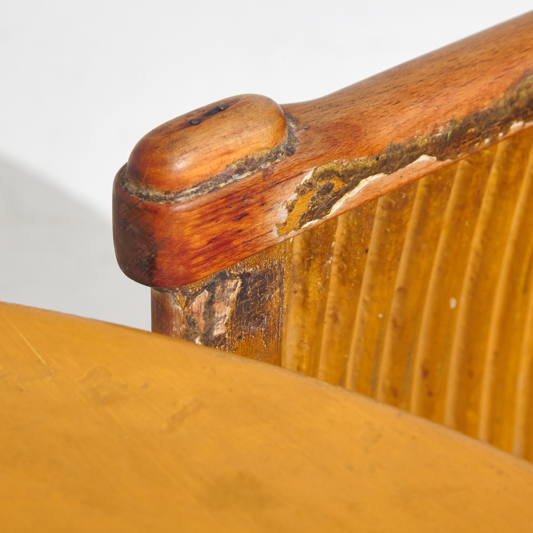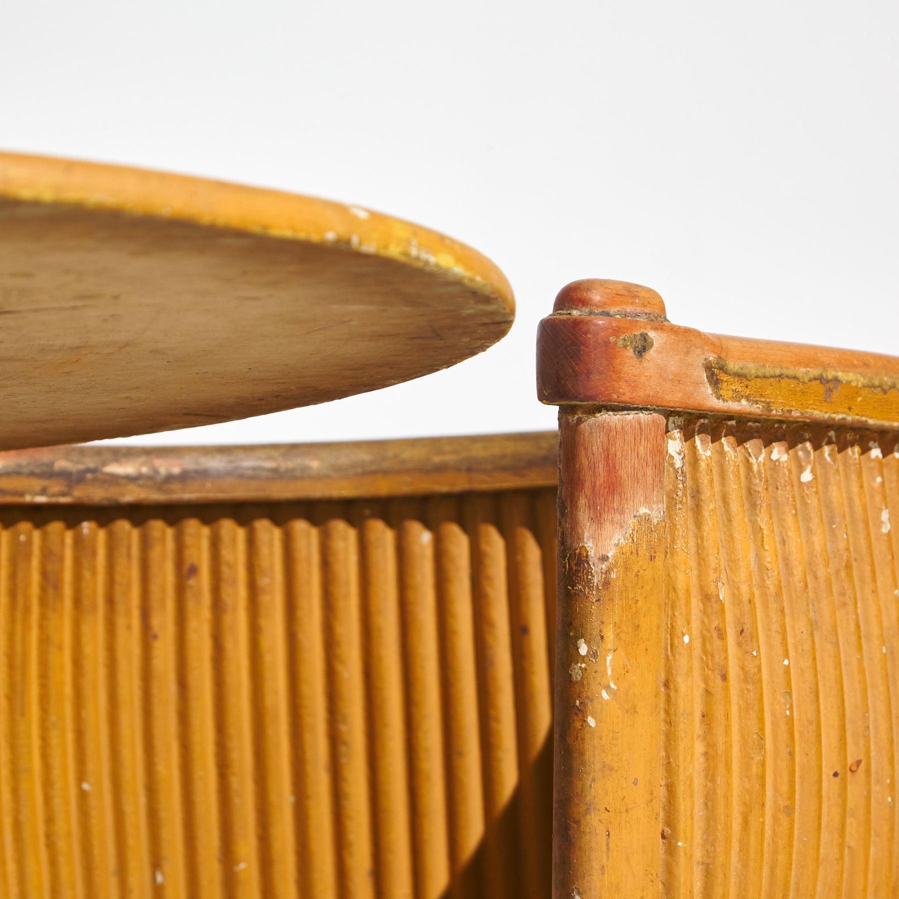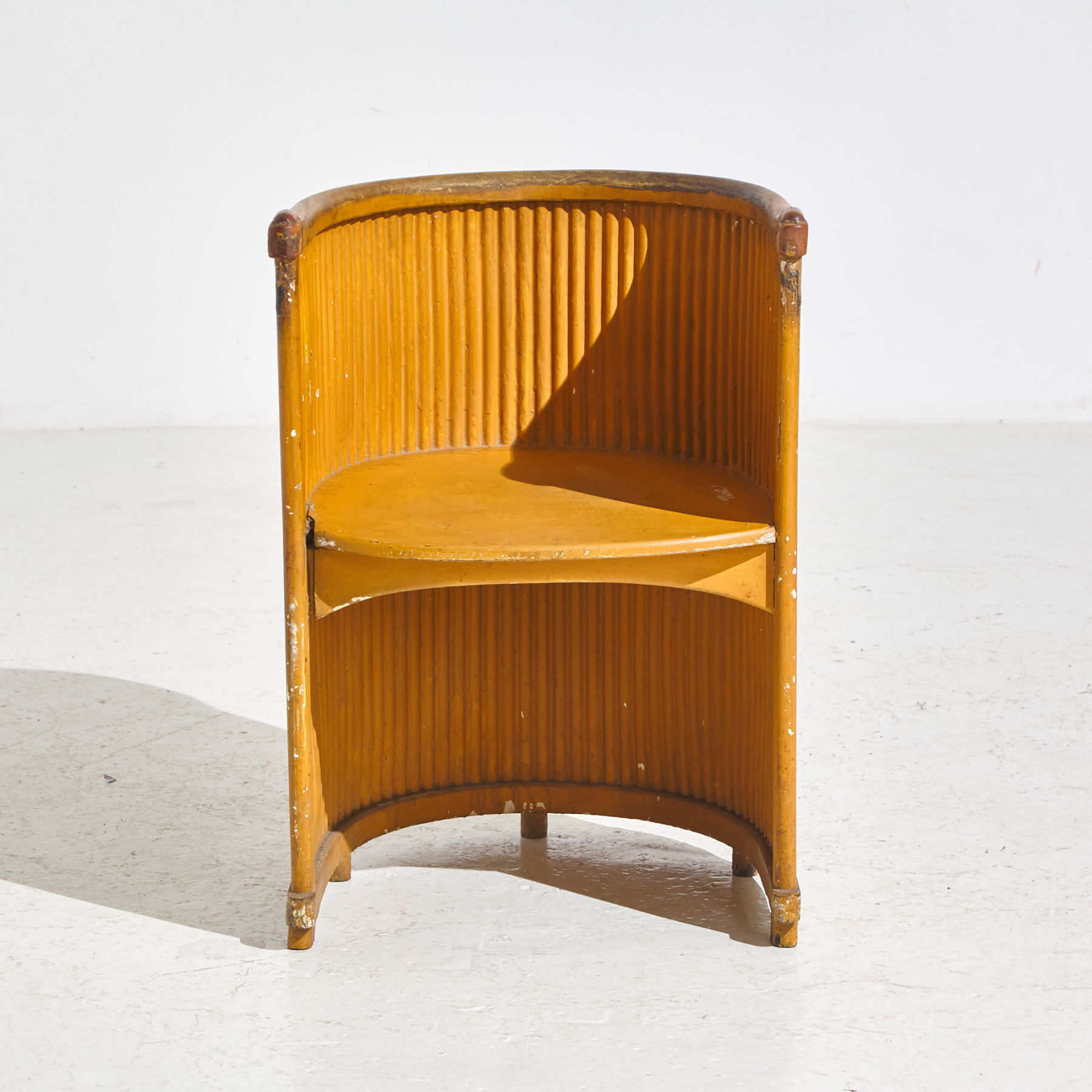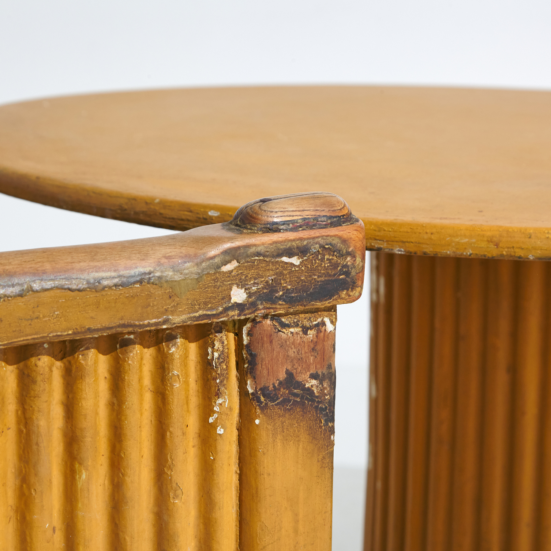 Art Nouveau set from the 1910s, designed by Hans Günther Reinstein. With several scratches, surface damage and paint wear on the beech and corrugated fiberboard parts. In vintage condition with some signs of use. Dimensions: Table: 85x75x85 cm /// Chair: 55x76x50 cm, Sh.: 44 cm