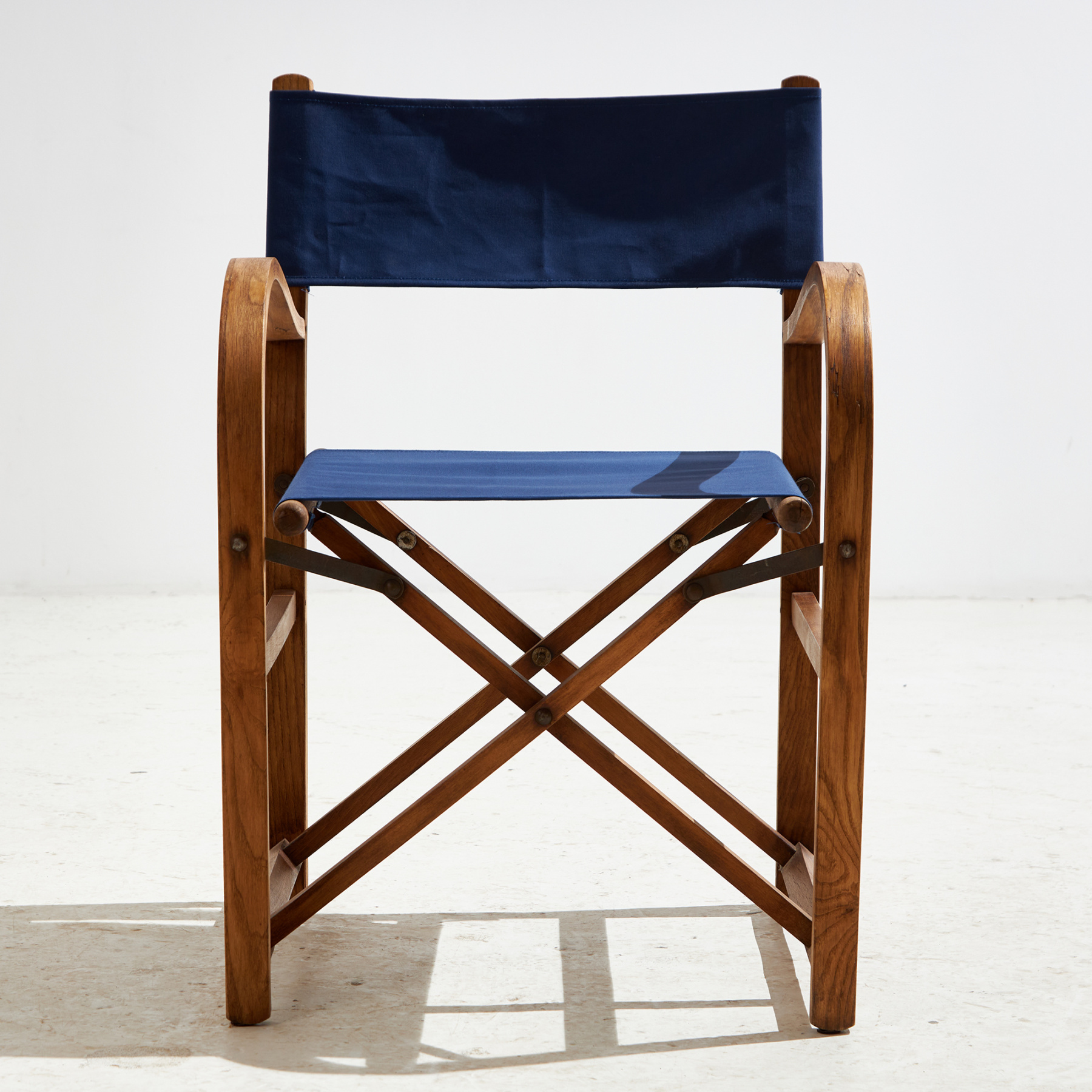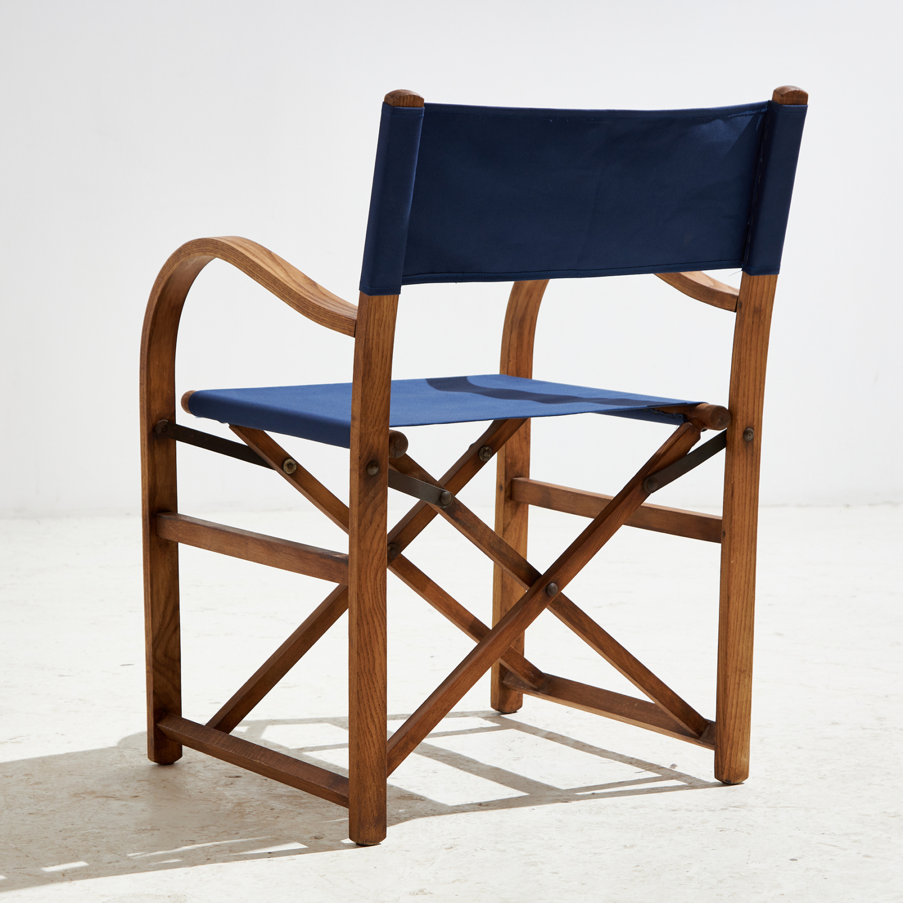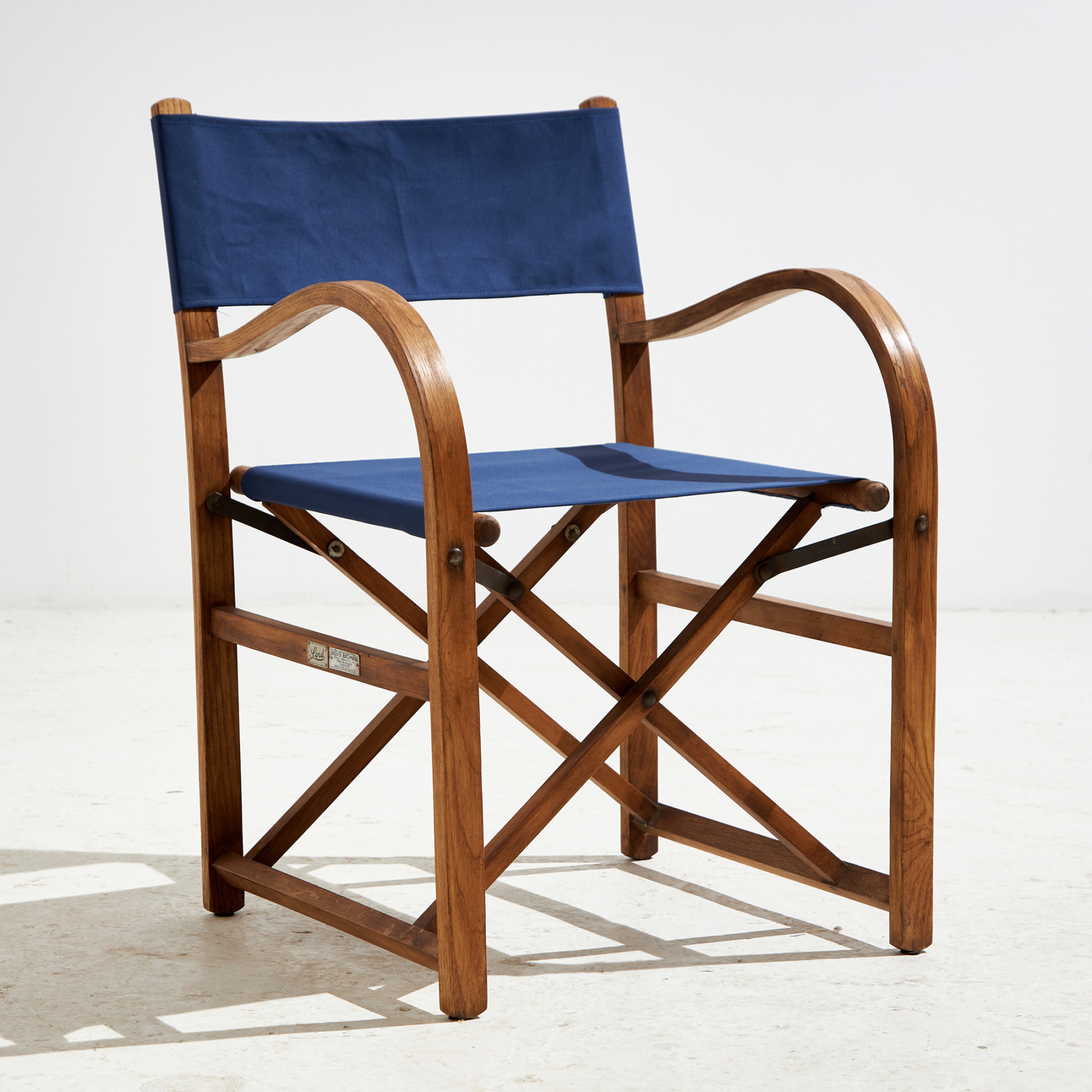 Austrian beech and oak foldable armchair from the 1920s with textile seat and backrest. With some surface scratches, stains and wear on the wooden and textile parts.
