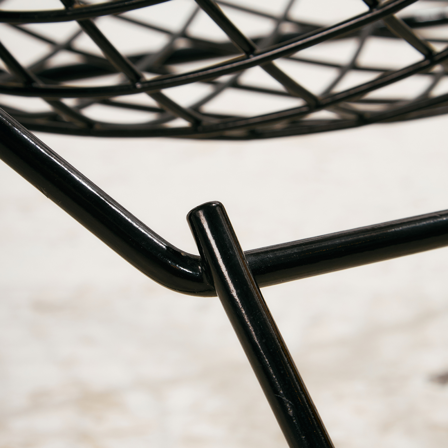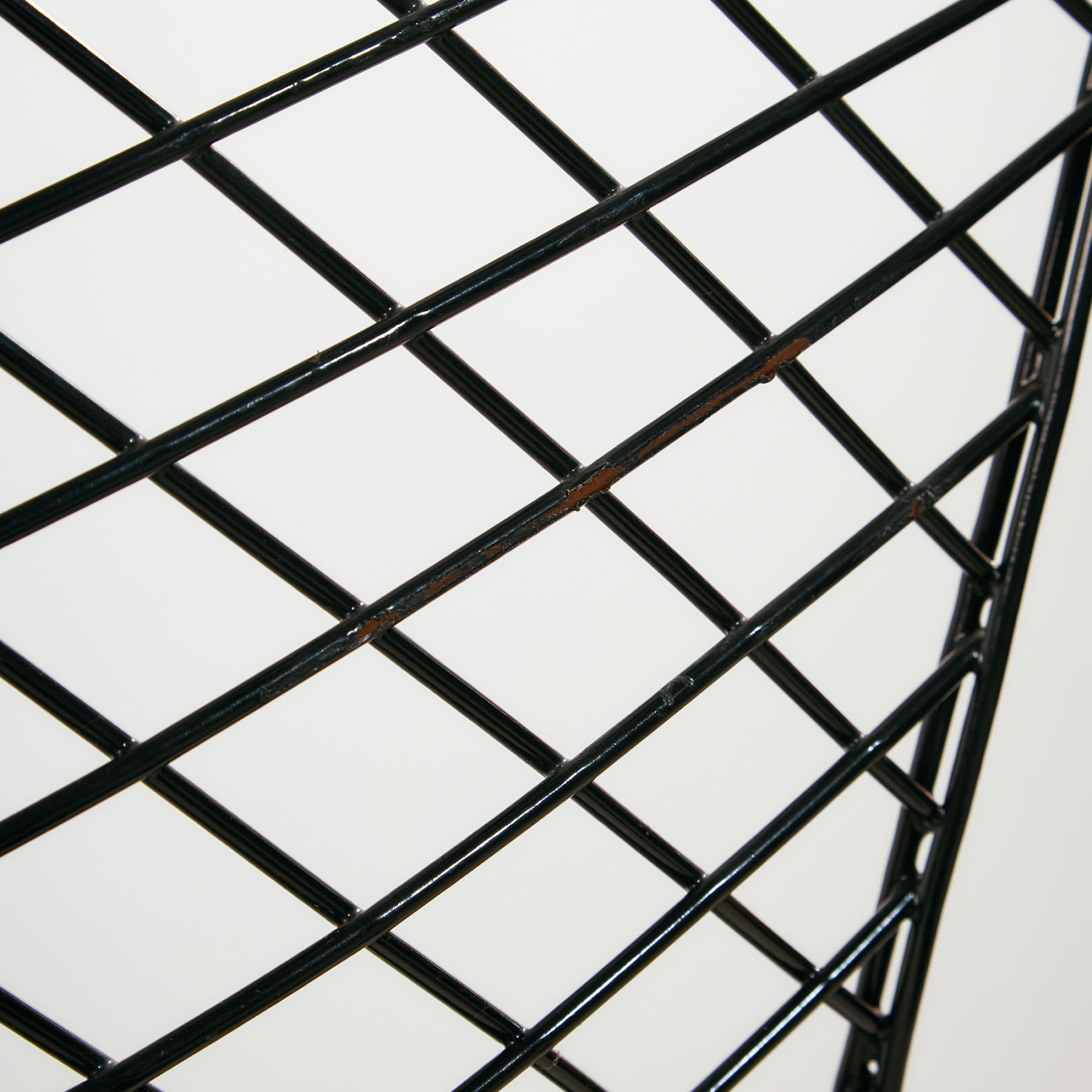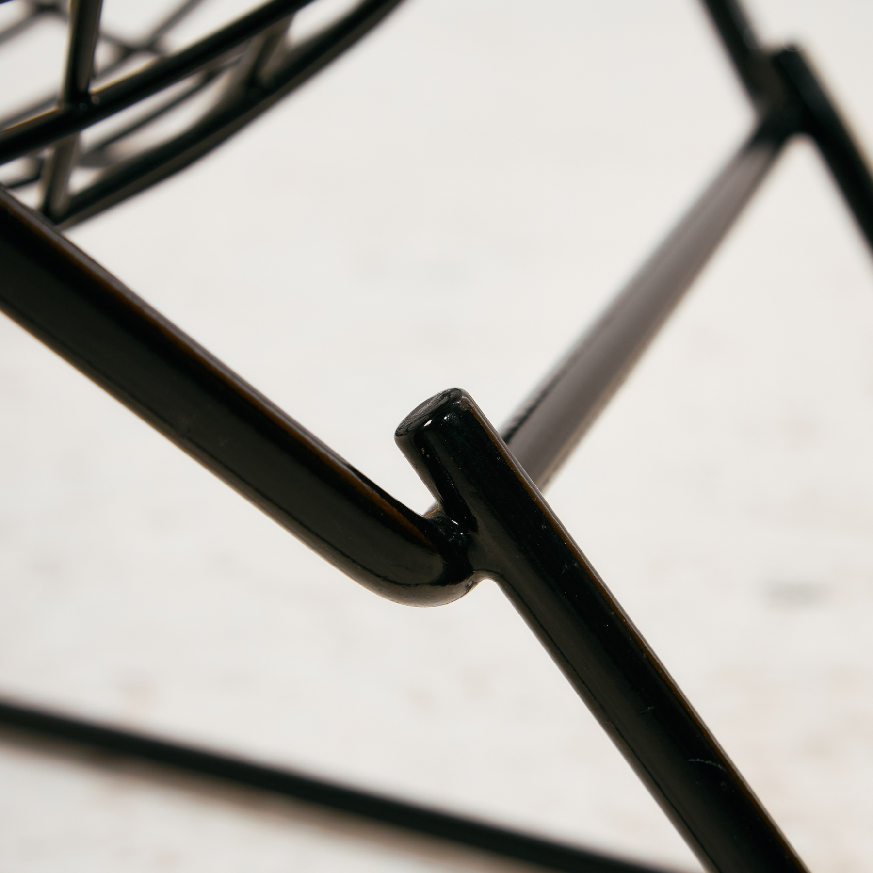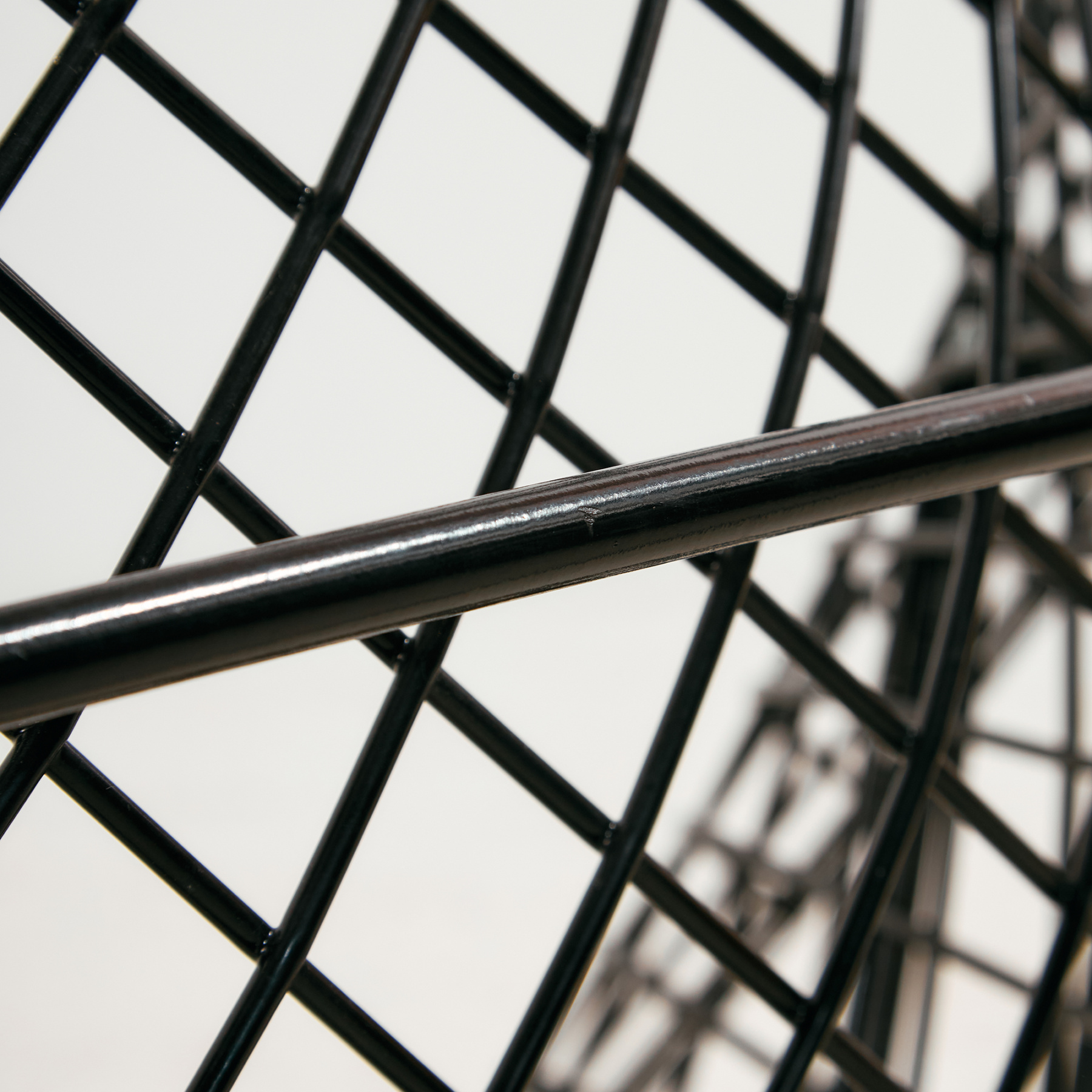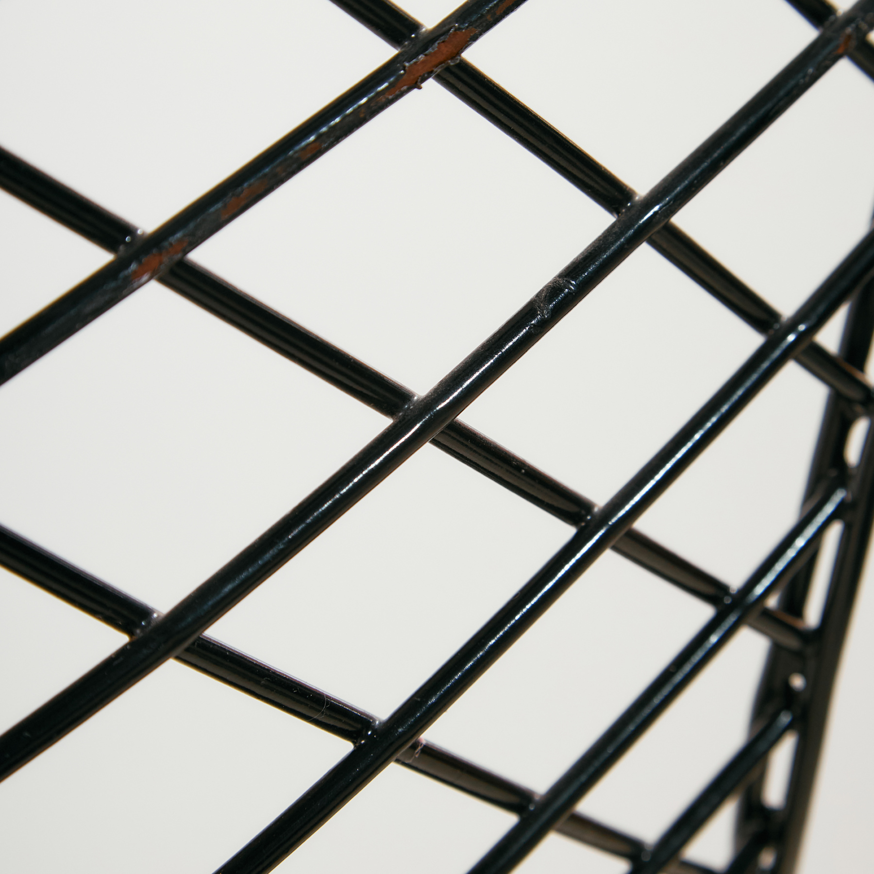 Harry Bertoia has created some of the most outstanding pieces of the 20th century. He has combined different media within the boundaries of fine art and design, revealing an interplay between two and three-dimensional works. In addition to function, he explored the relationship between space and form. In 1952, he designed his ‘Bird’ chair for Knoll, a sculptural work of vinyl-coated bent and welded steel rod construction. The chair’s trademark also indicates that it is an early edition, which is further confirmed by its details. The steel structure has several surface scratches, stains and rust. Dimensions: Chair: 96x102x80 cm, Sh.: 35 cm /// Ottoman: 59×34,5×41,5 cm