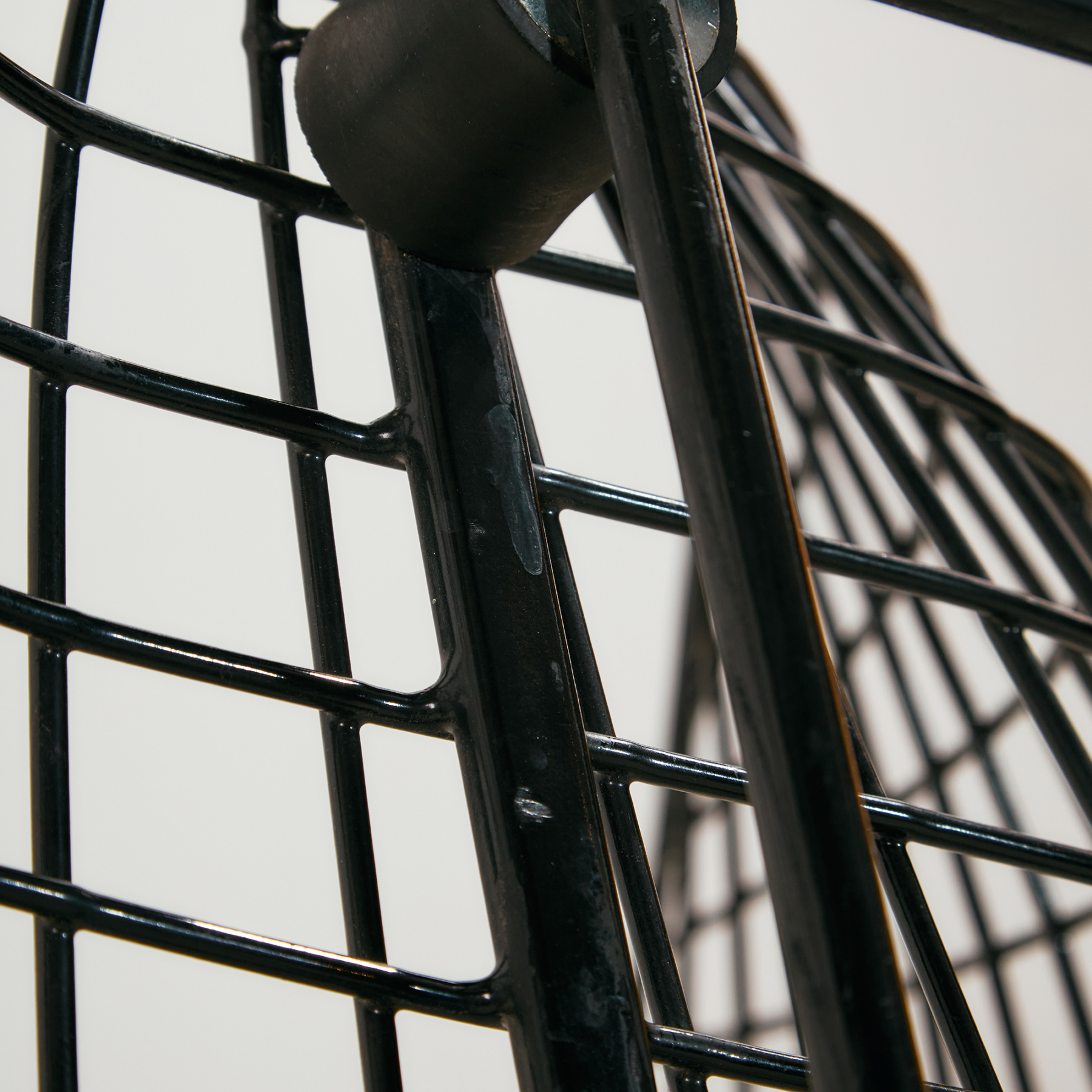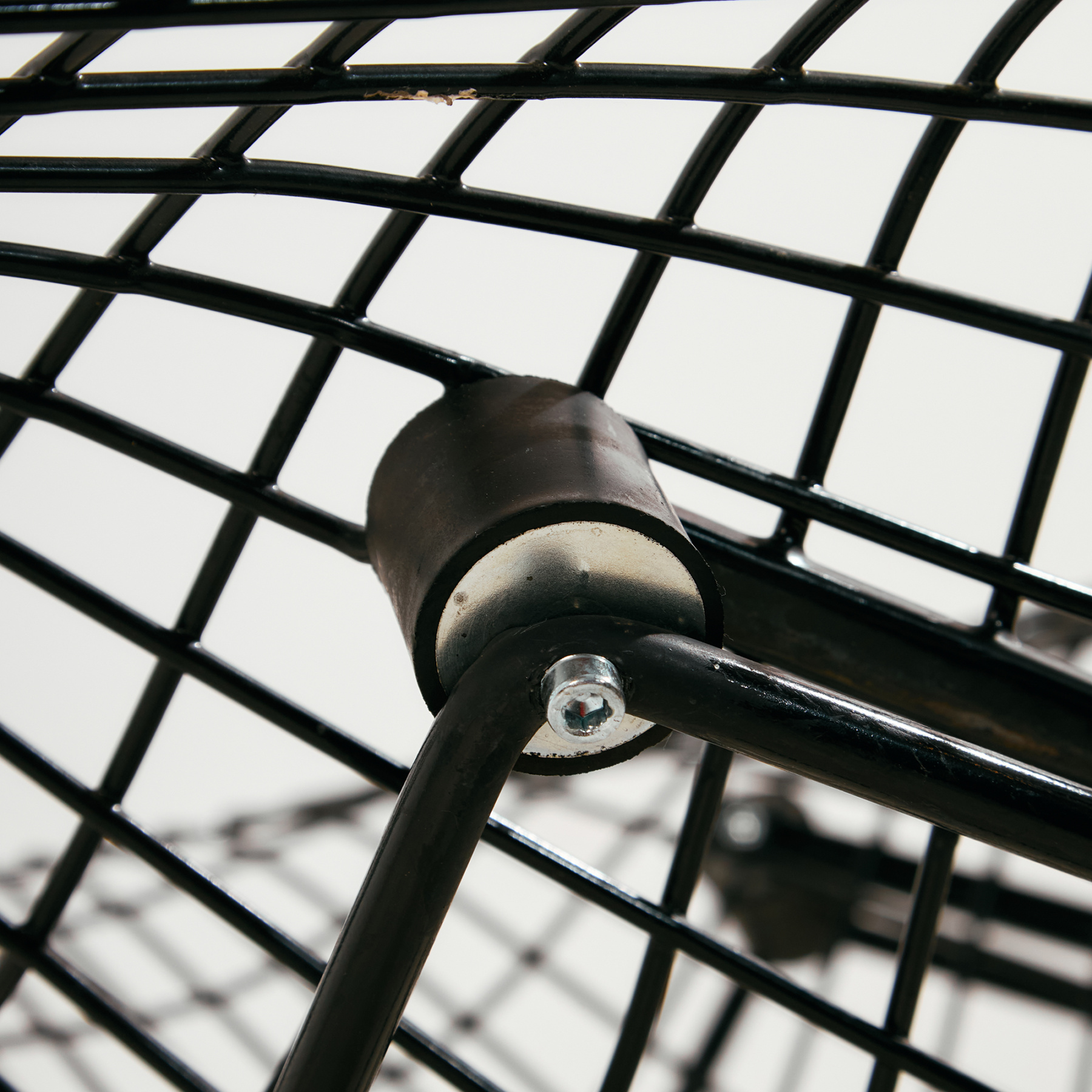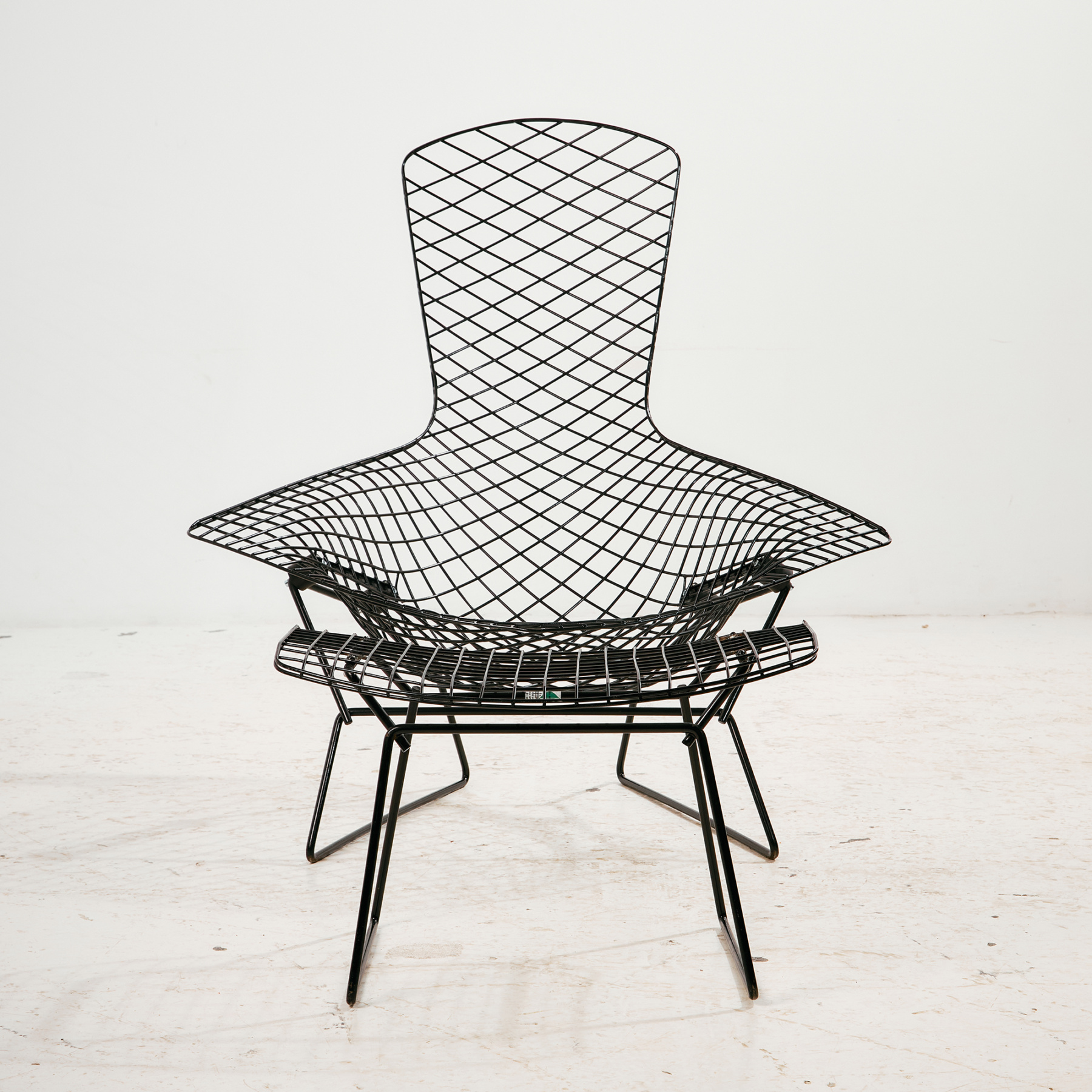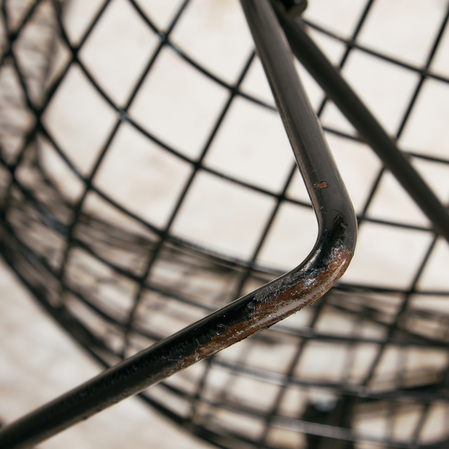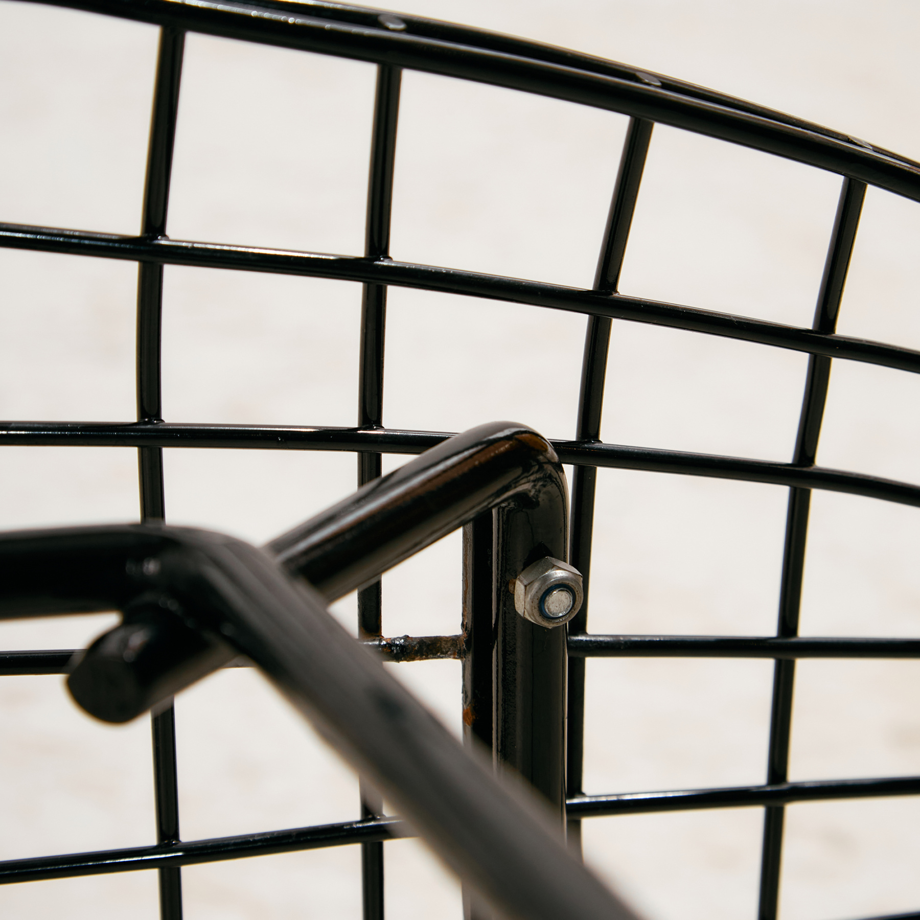 Harry Bertoia has created some of the most outstanding pieces of the 20th century. He has combined different media within the boundaries of fine art and design, revealing an interplay between two and three-dimensional works. In addition to function, he explored the relationship between space and form. In 1952, he designed his ‘Bird’ chair for Knoll, a sculptural work of vinyl-coated bent and welded steel rod construction. The chair’s trademark also indicates that it is an early edition, which is further confirmed by its details. The steel structure has several surface scratches, stains and rust. Dimensions: Chair: 96x102x80 cm, Sh.: 35 cm /// Ottoman: 59×34,5×41,5 cm