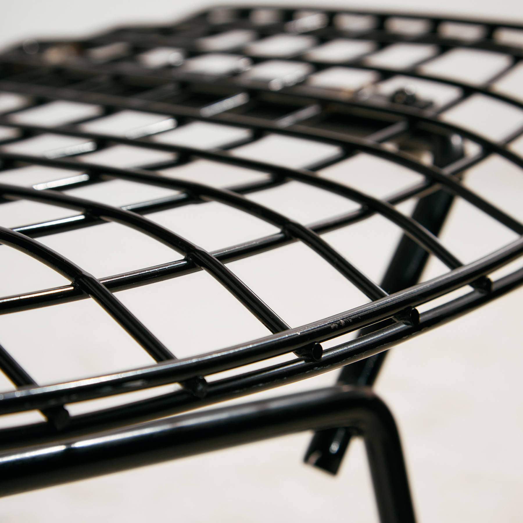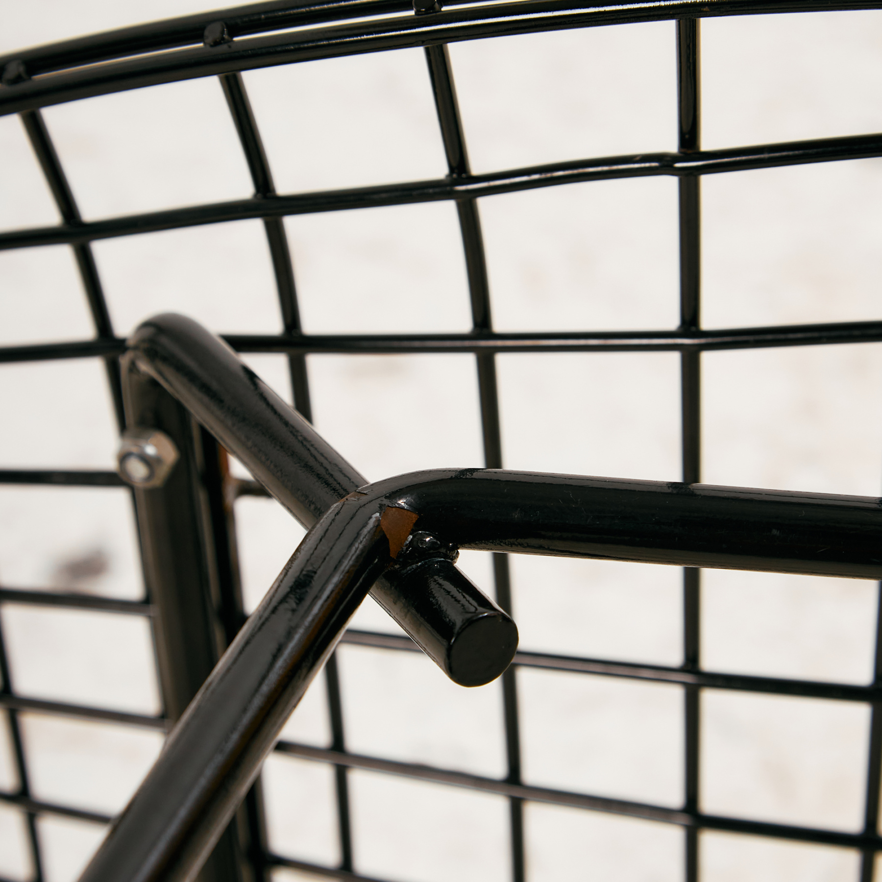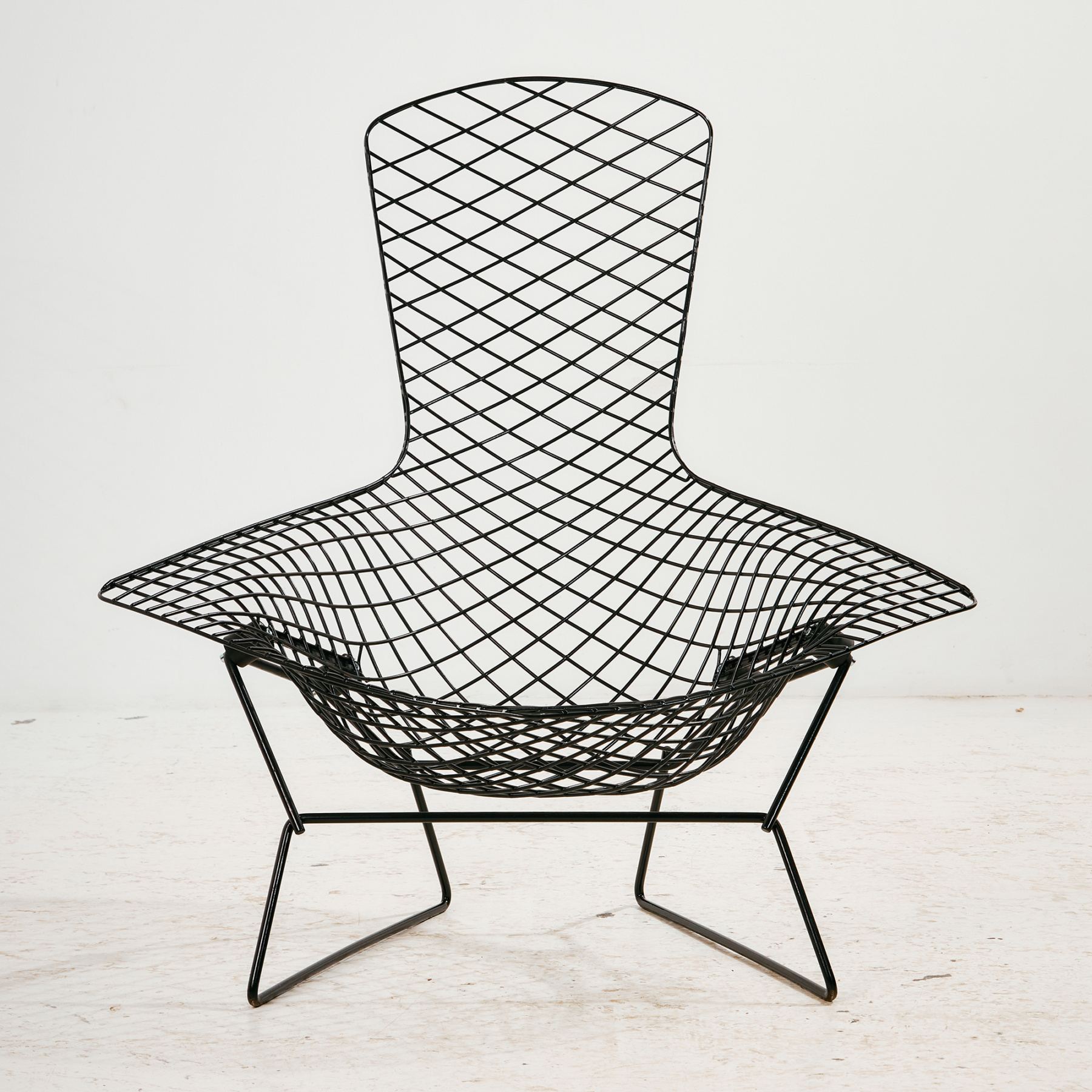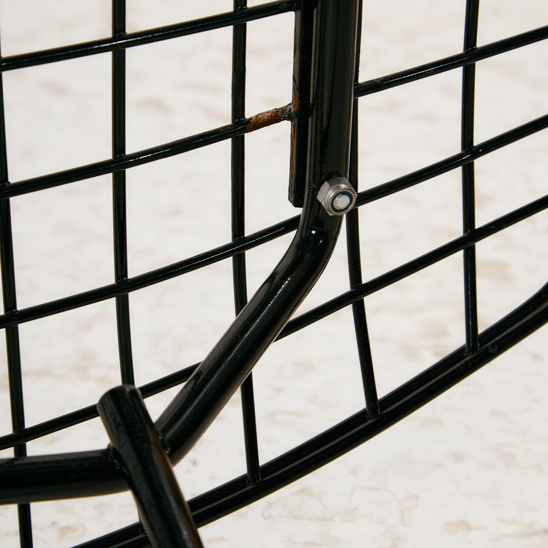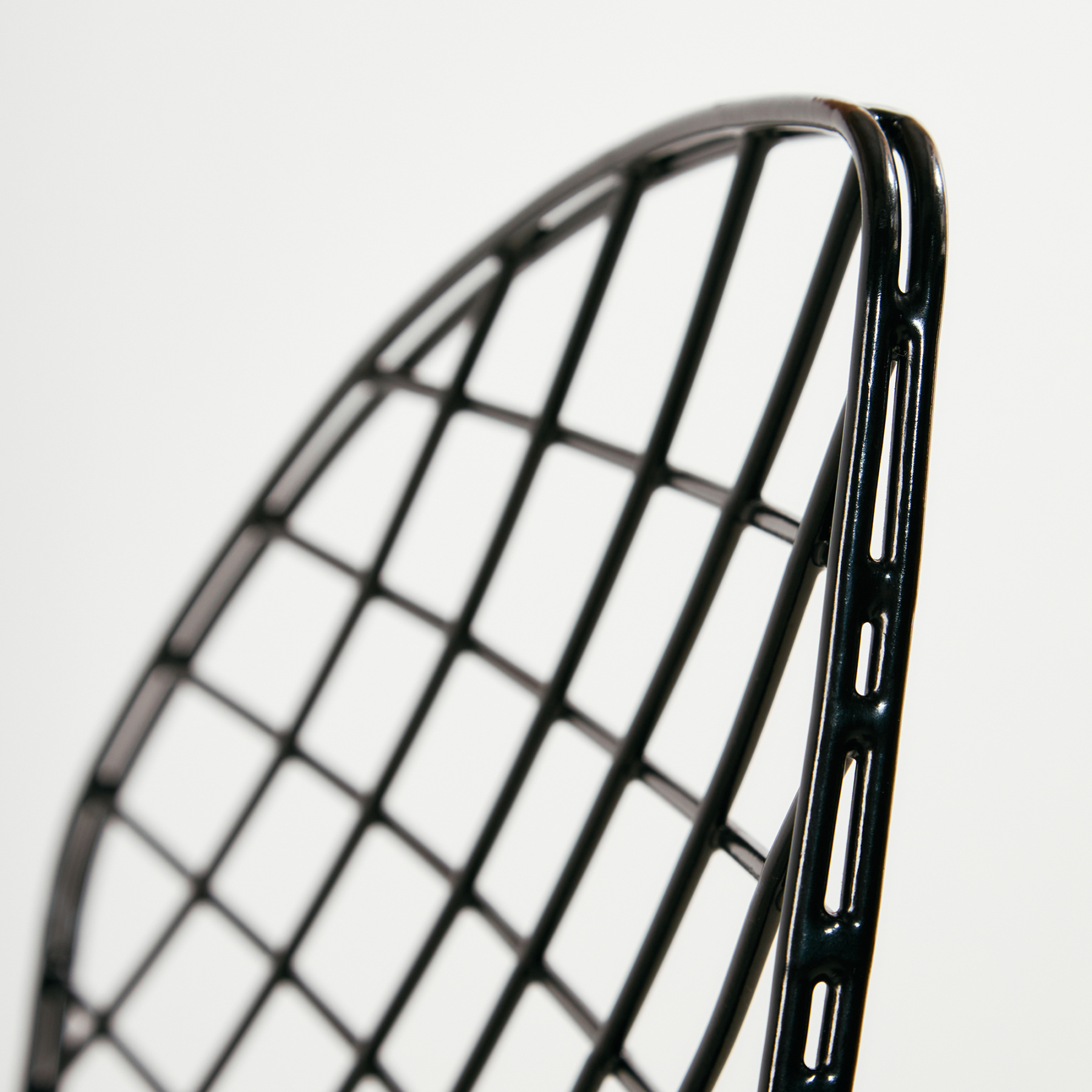 Harry Bertoia has created some of the most outstanding pieces of the 20th century. He has combined different media within the boundaries of fine art and design, revealing an interplay between two and three-dimensional works. In addition to function, he explored the relationship between space and form. In 1952, he designed his ‘Bird’ chair for Knoll, a sculptural work of vinyl-coated bent and welded steel rod construction. The chair’s trademark also indicates that it is an early edition, which is further confirmed by its details. The steel structure has several surface scratches, stains and rust. Dimensions: Chair: 96x102x80 cm, Sh.: 35 cm /// Ottoman: 59×34,5×41,5 cm