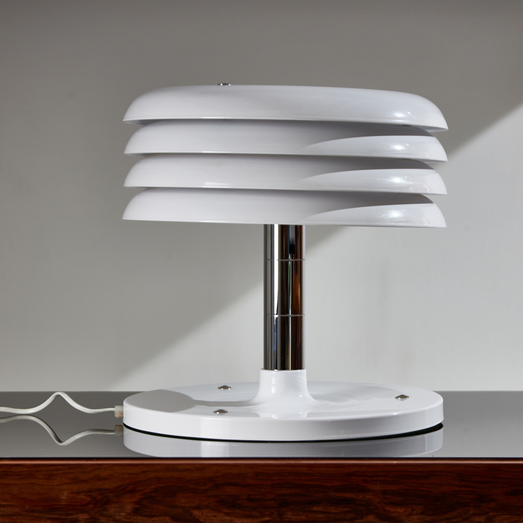 A Hungarian icon: chrome four-lamella metal table lamp from the 1970s designed by Borsfay Tamás. One of the most outstanding pieces of Hungarian design history. The metal and chrome parts of the lamp are in really nice condition.
