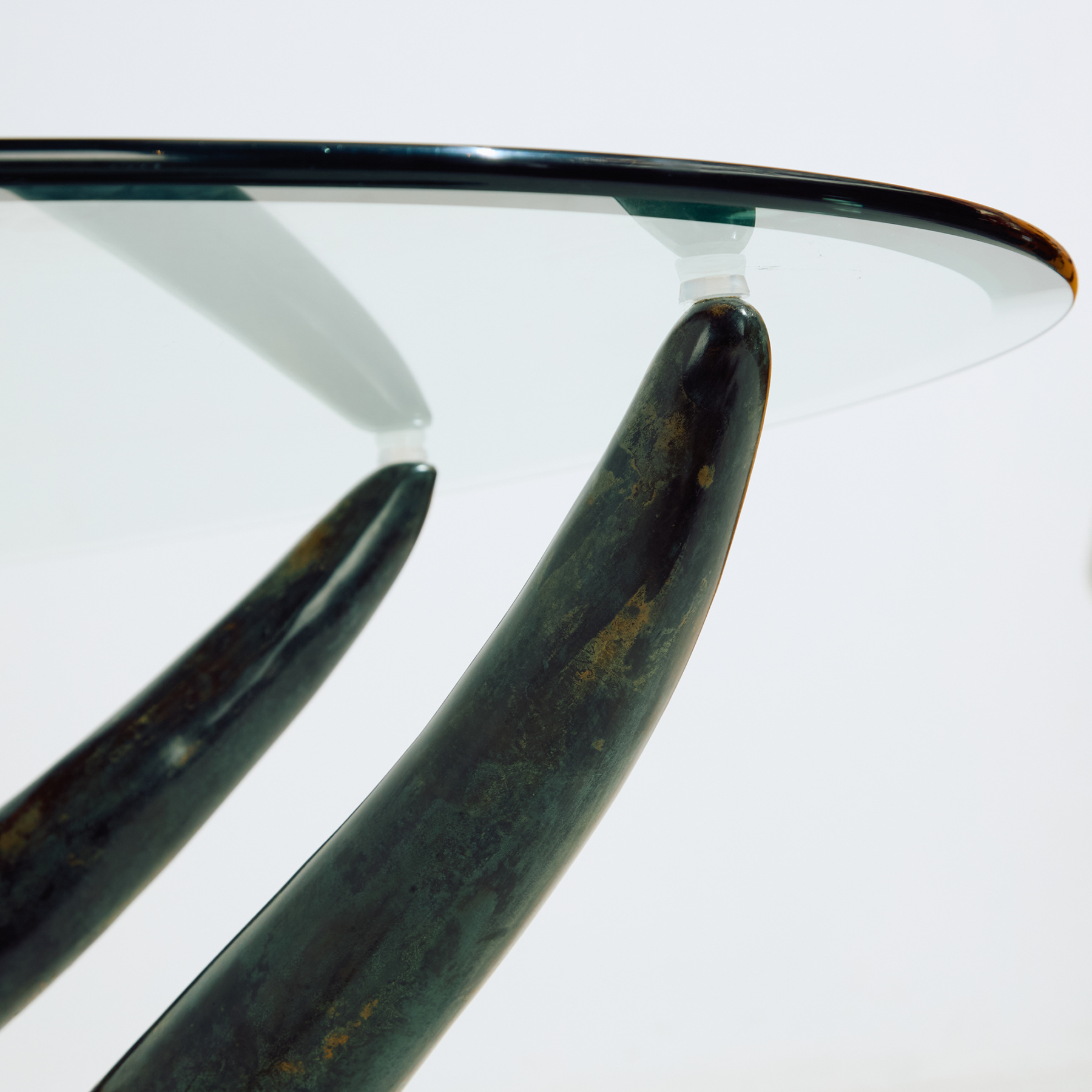 If you want a really unique piece in your home. Solid bronze coffee table designed by Italo Valenti for Valenti Spain in the 1970s. An exciting, almost sculptural piece of art that can be the accent and dominating element of any space. The bronze base of the table has organic lines with a tempered glass top. The glass has surface scratches in places, but in beautiful vintage condition.