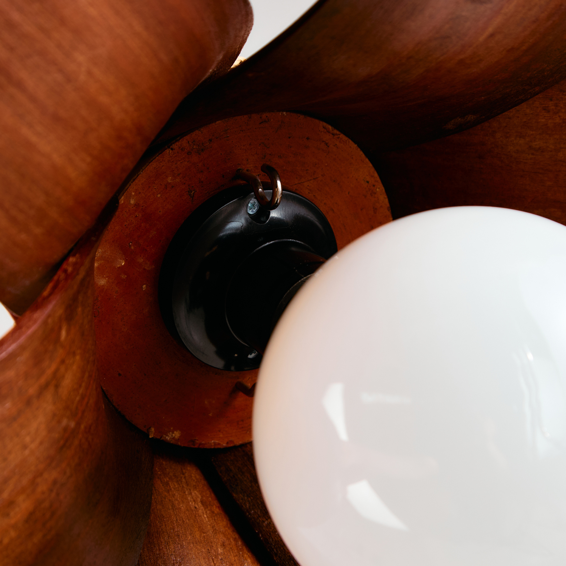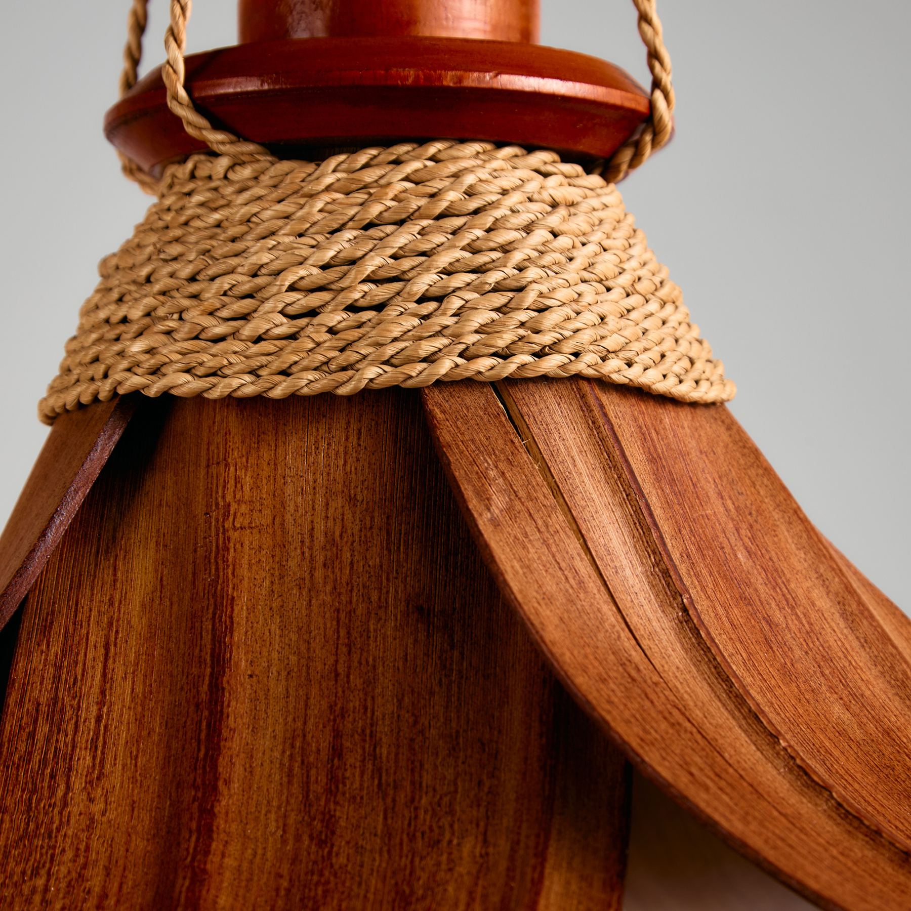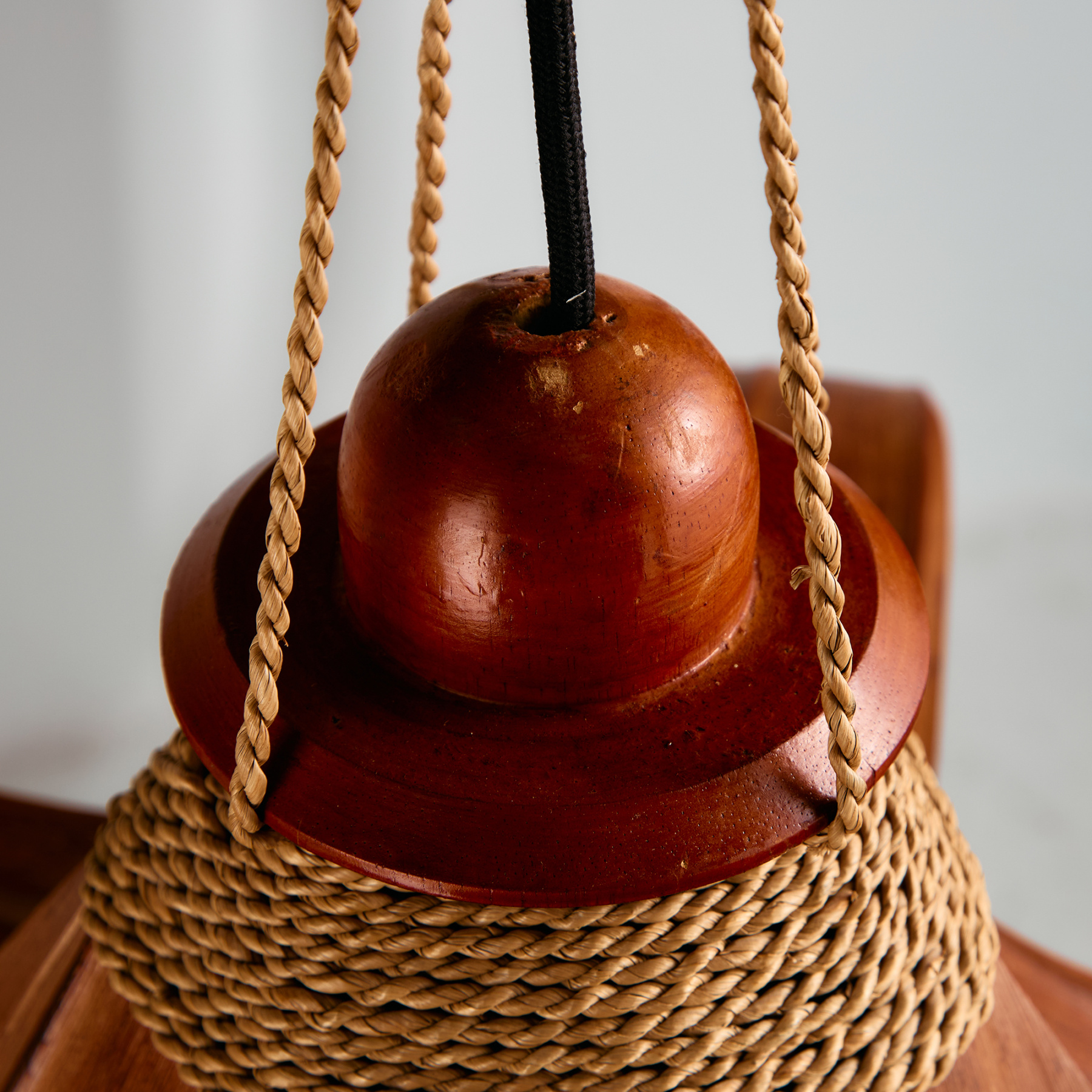 Exciting coconut leaves chandelier with wicker details. Thanks to its organic design and combination of natural materials, it can be an exciting element in any space. The surface of the lamp has scratches, wear and cracks in places.