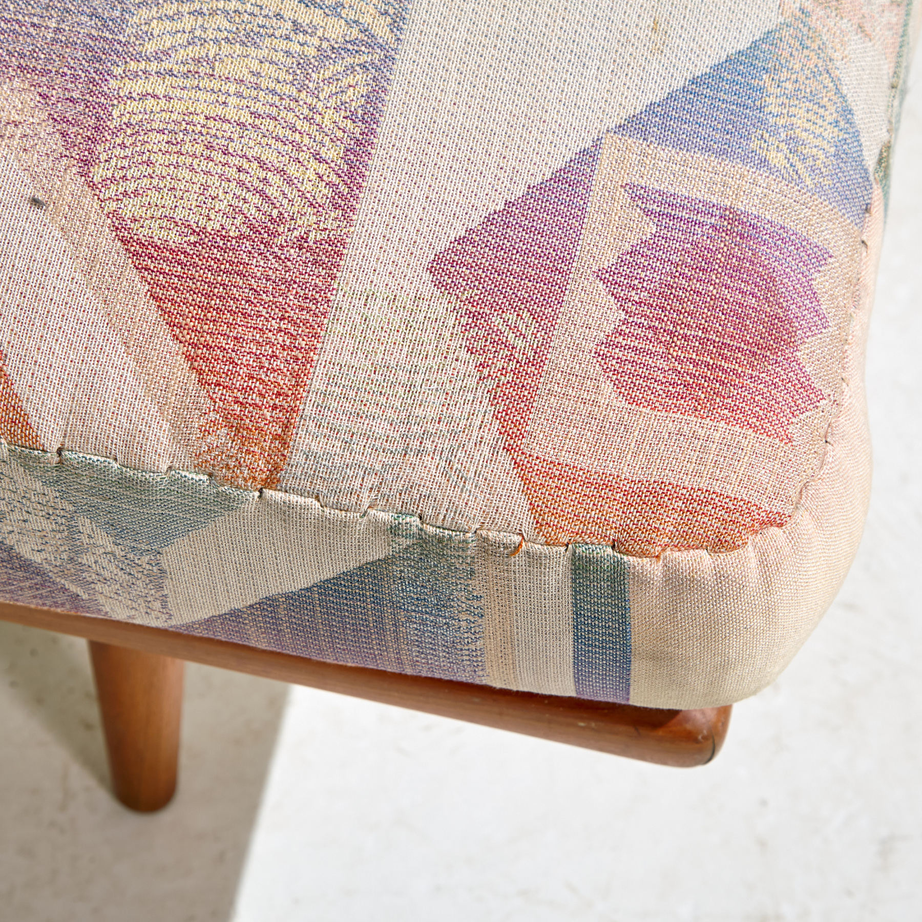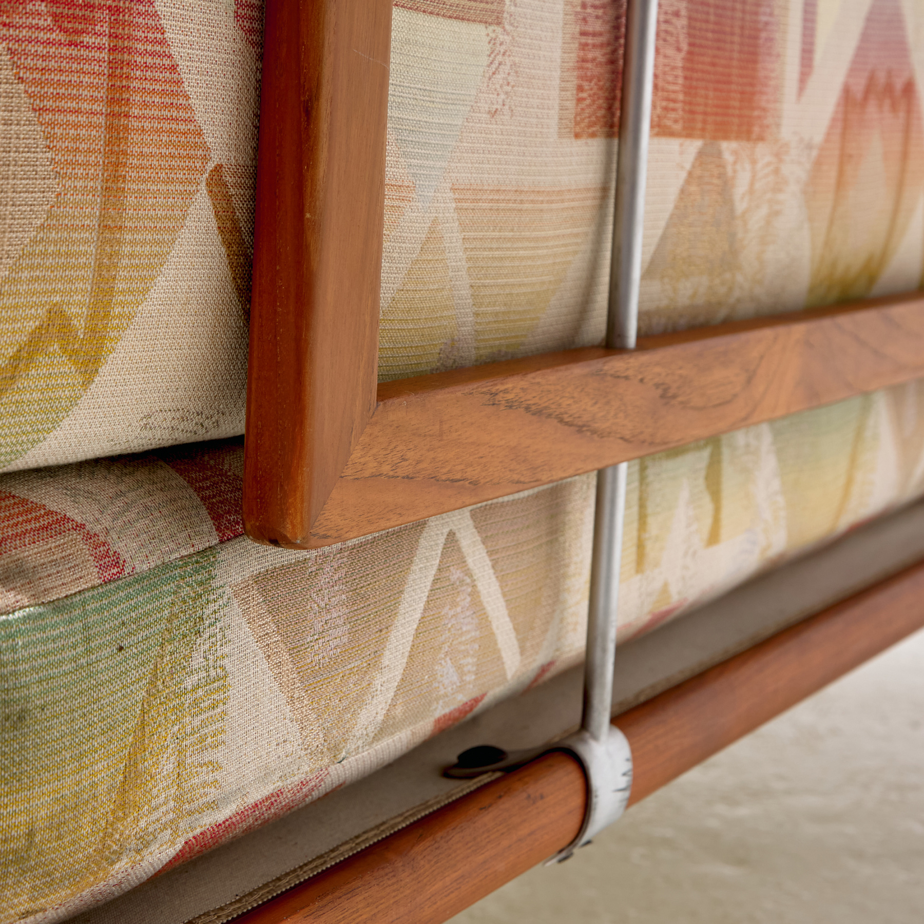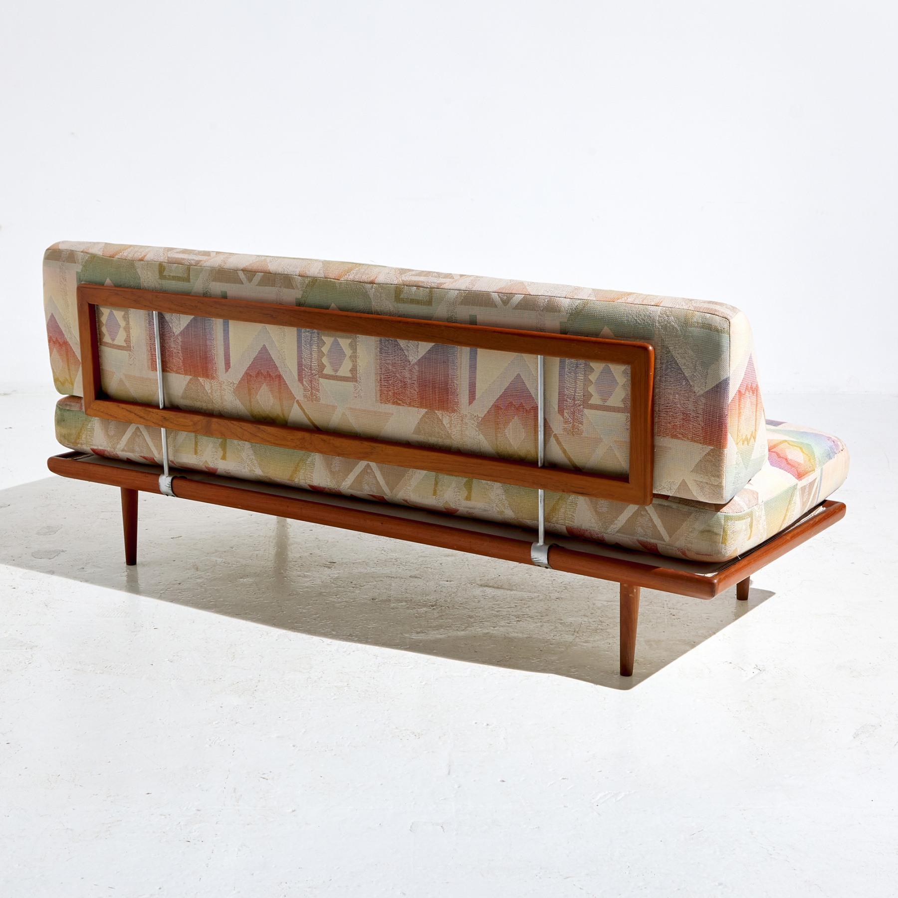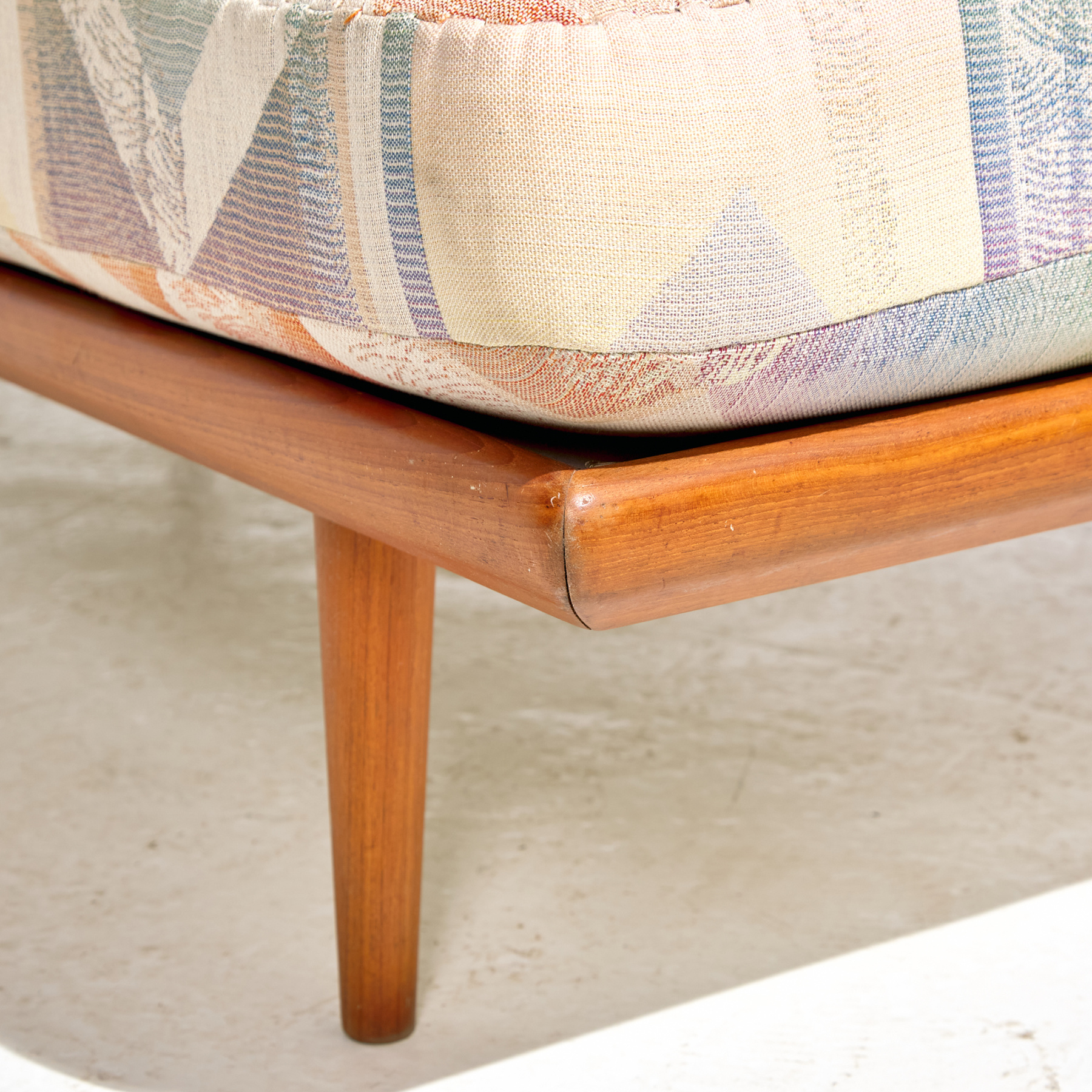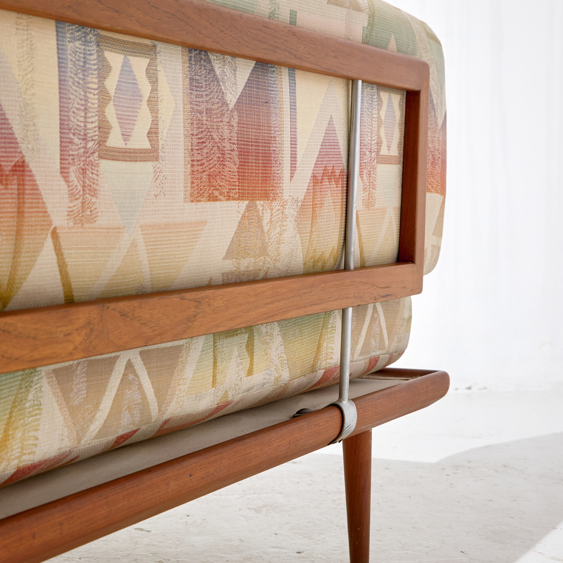 ‘FD-417 / Minerva’ daybed/sofa from the 1950s, designed by Peter Hvidt & Orla Mølgaard Nielsen for France & Son. The sofa has a comfortable upholstered seat and backrest on teak legs. With some scratches and wear on the wooden parts and stains on the upholstery, with some signs of use.
