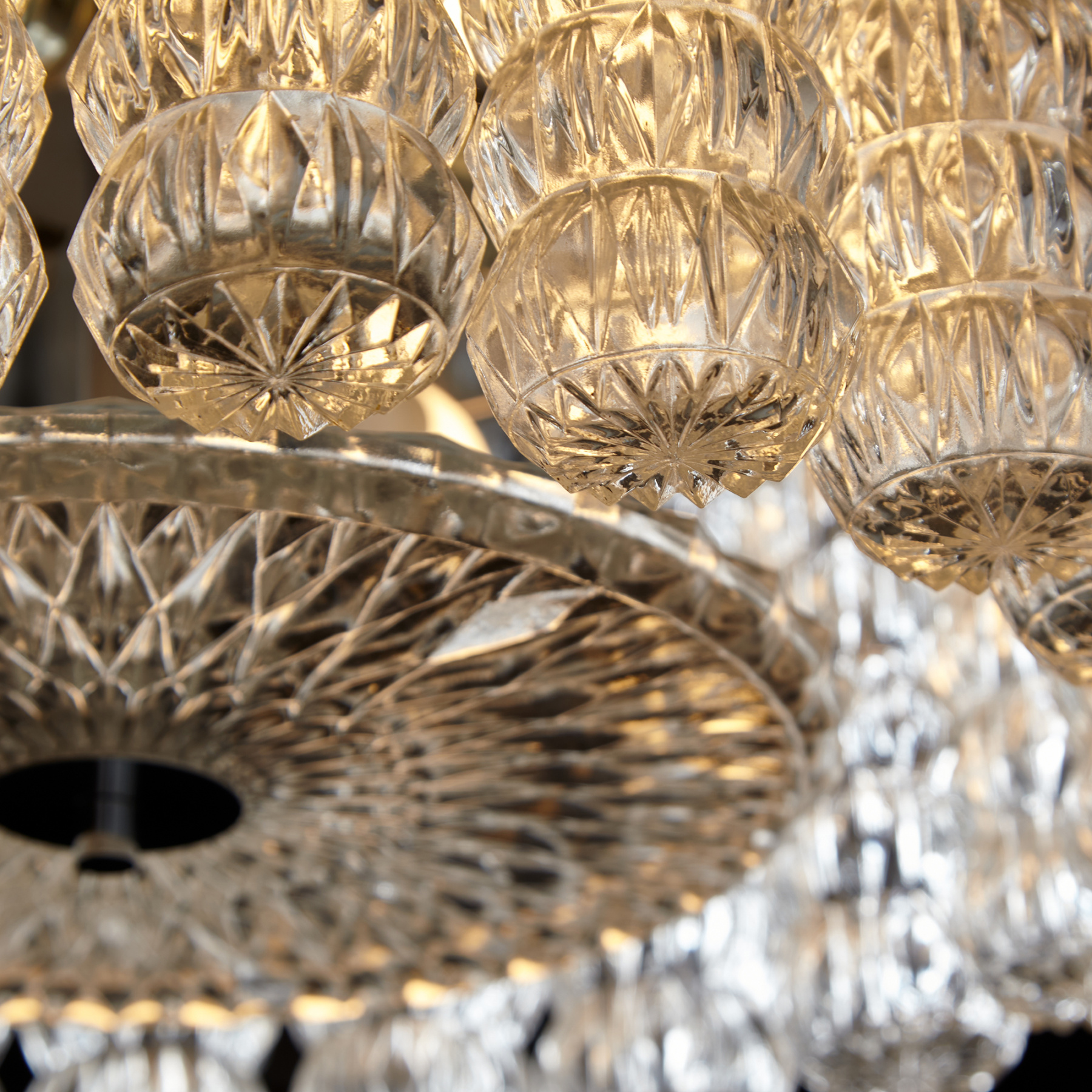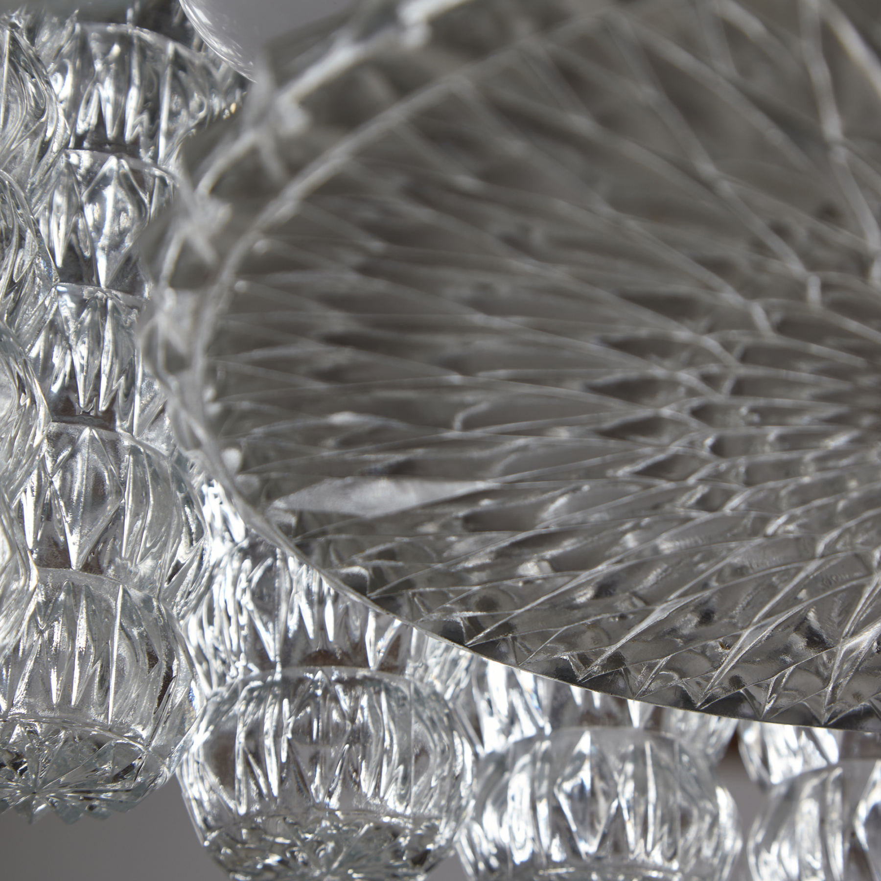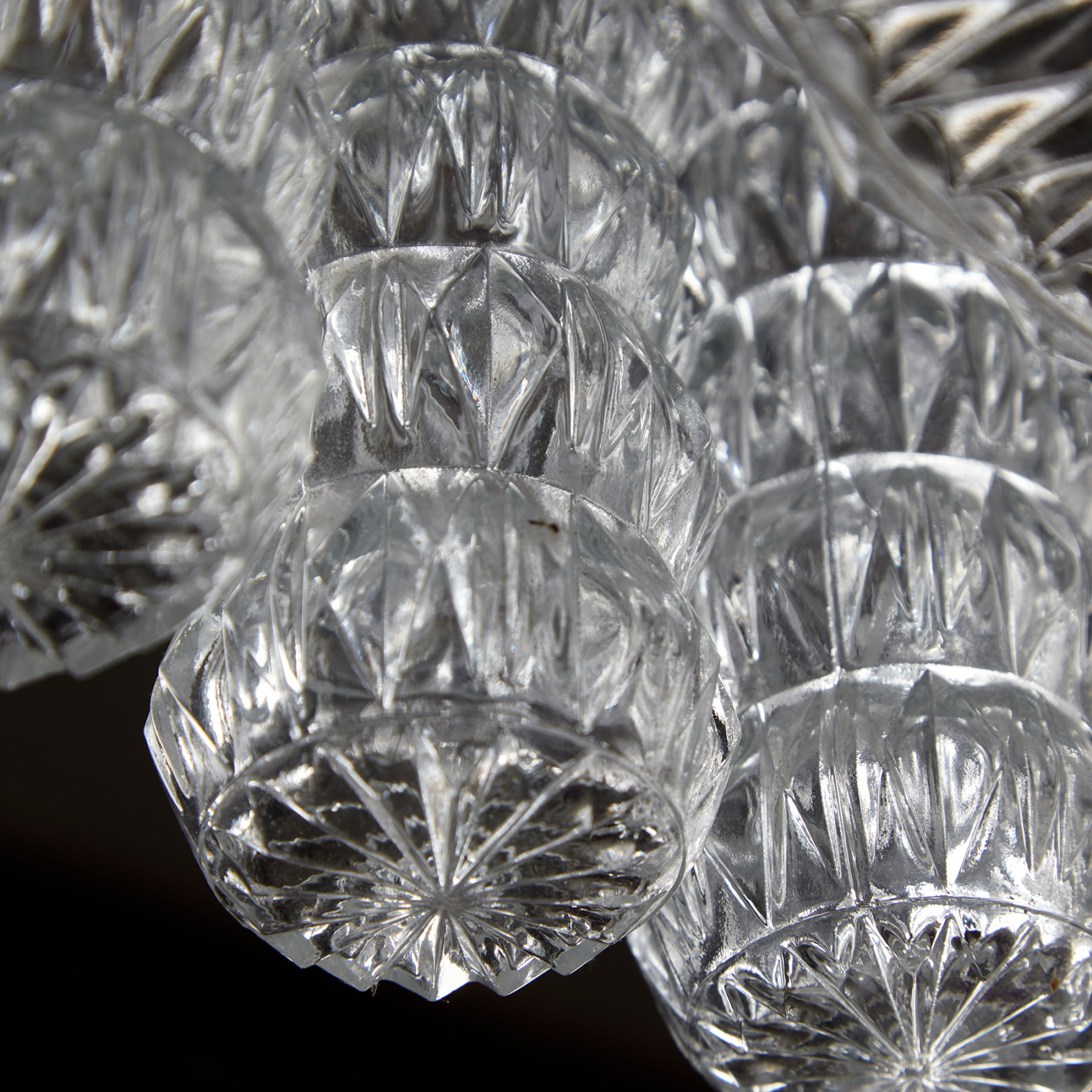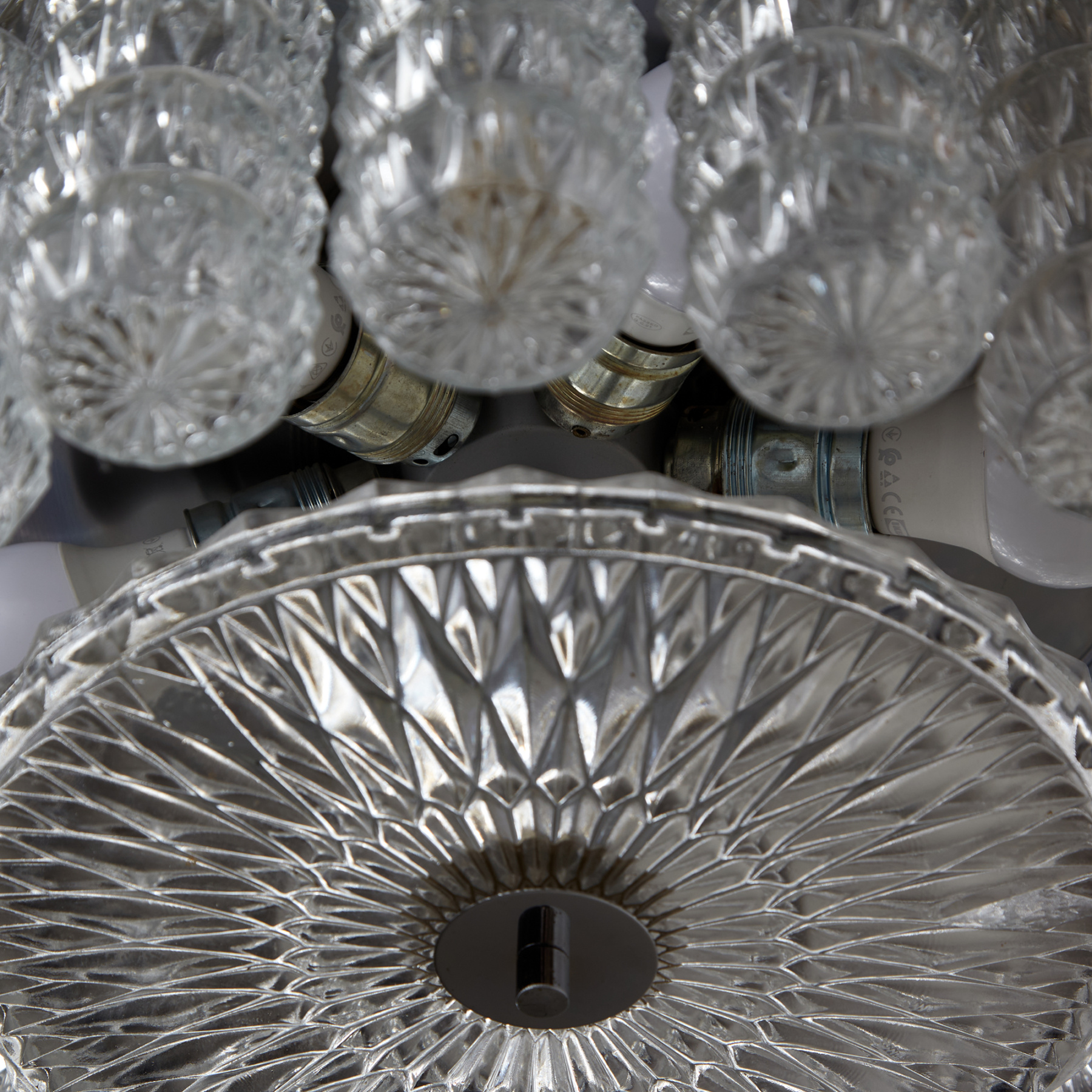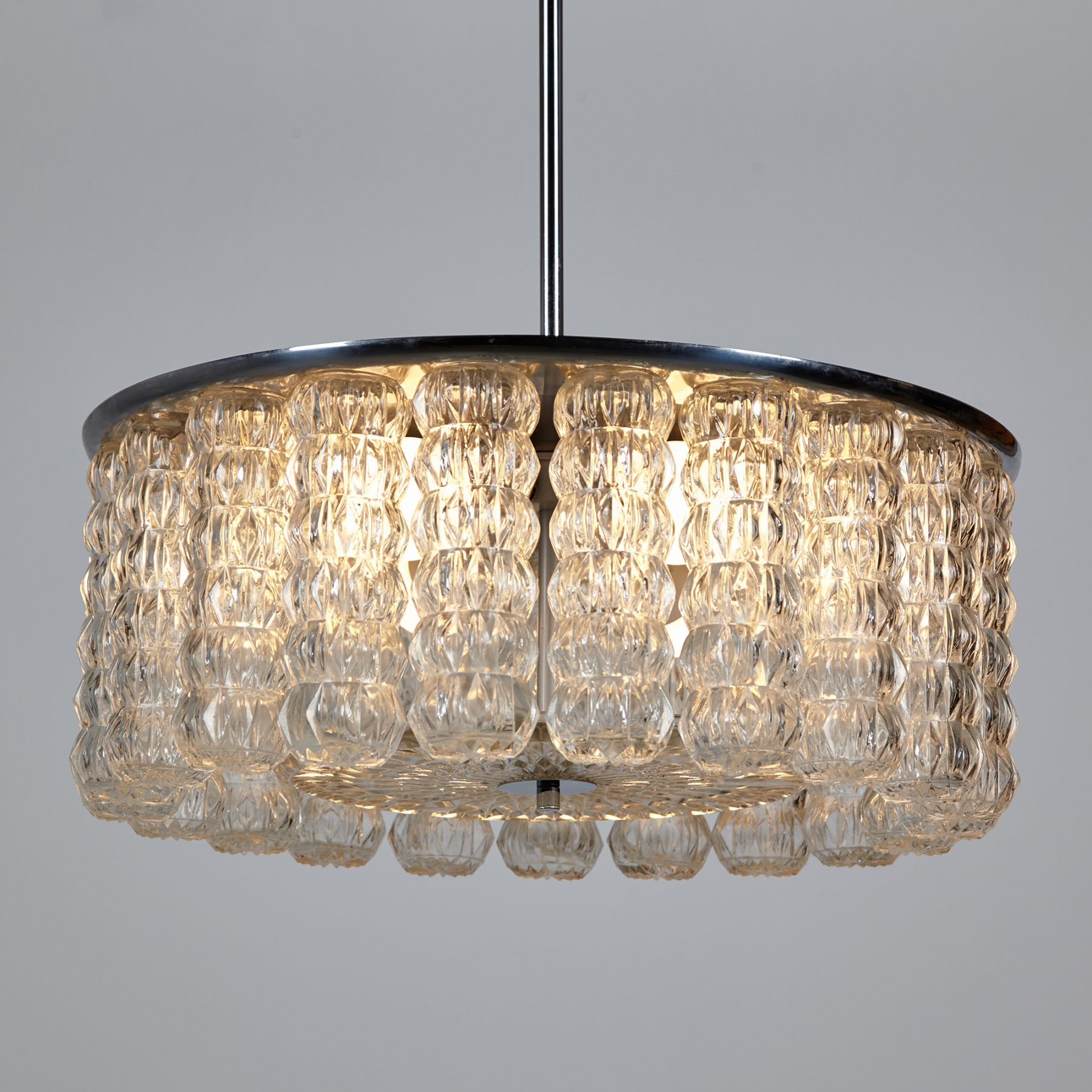 Larger drum-shaped glass and chrome chandelier from the 1970s. The chandelier consists of twenty-one glass cylinders, with six sockets inside the shade. There are small surface scratches in places, the metal parts have oxidised surfaces.