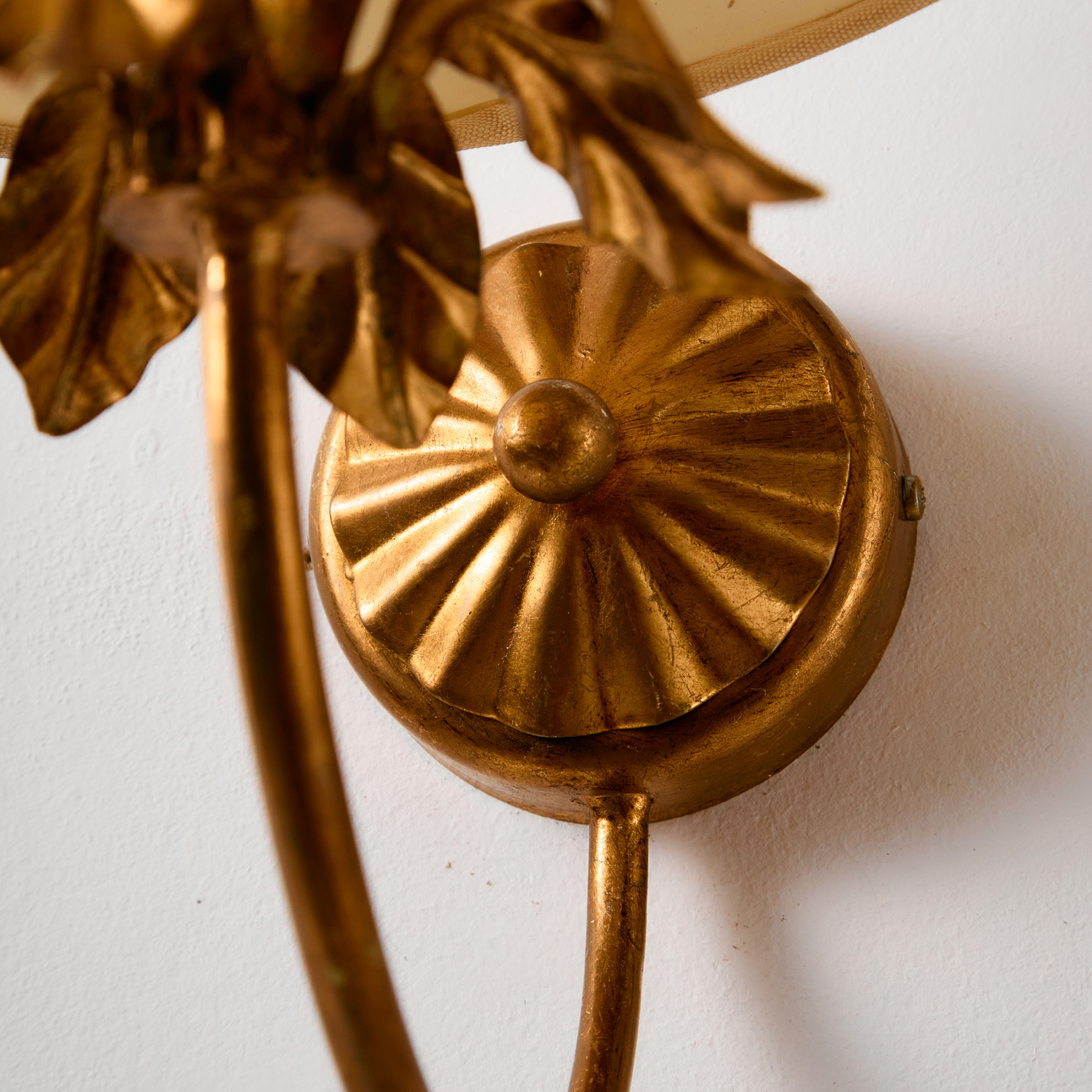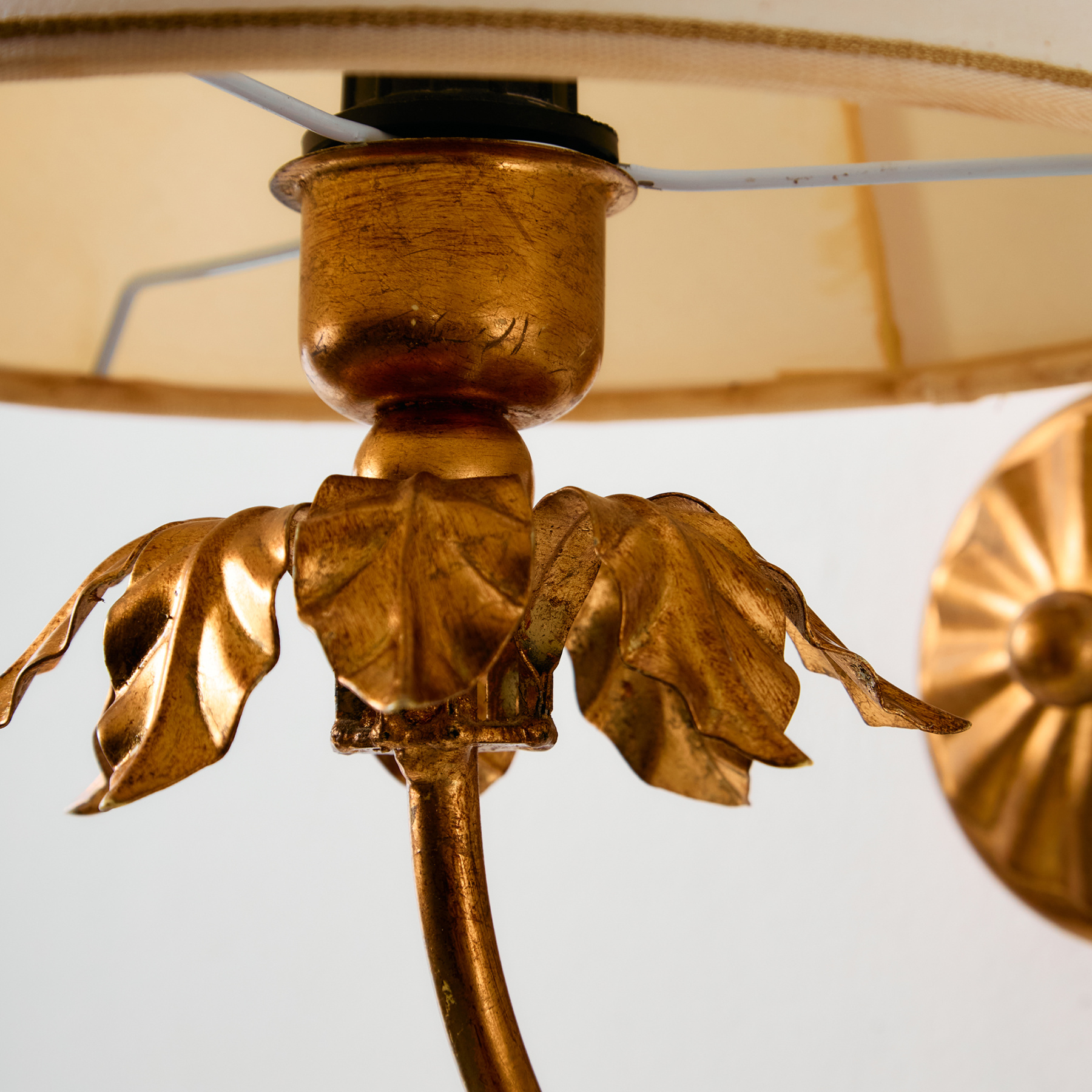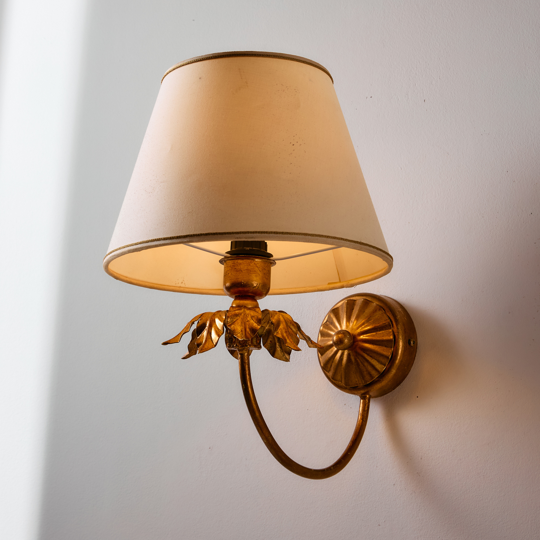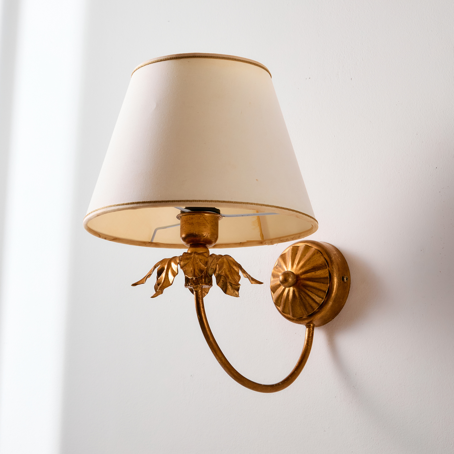 Gold-painted wall lamp with textile lampshade from the 1970s. The lamp stem features organic decorations which may be different in size. The surface of the lamp has scratches, stains, and wear with signs of use.