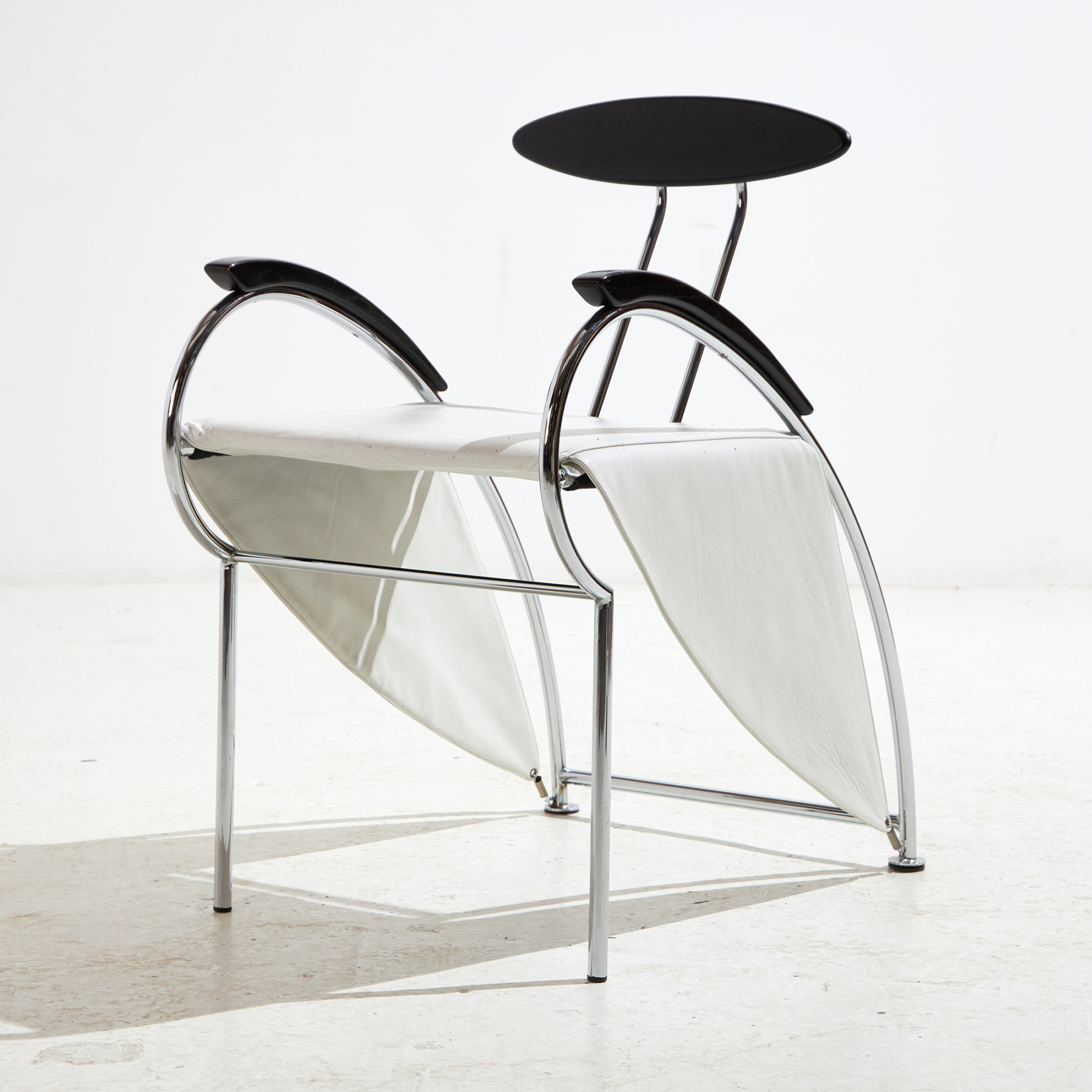 The perfect example for the sophisticated Italian design: ‘Notorious’ chair from the 1980s, designed by Massimo Iosa Ghini for Moroso. With some surface scratches and wear on the leather, chrome and wooden parts. In vintage condition with some signs of use.