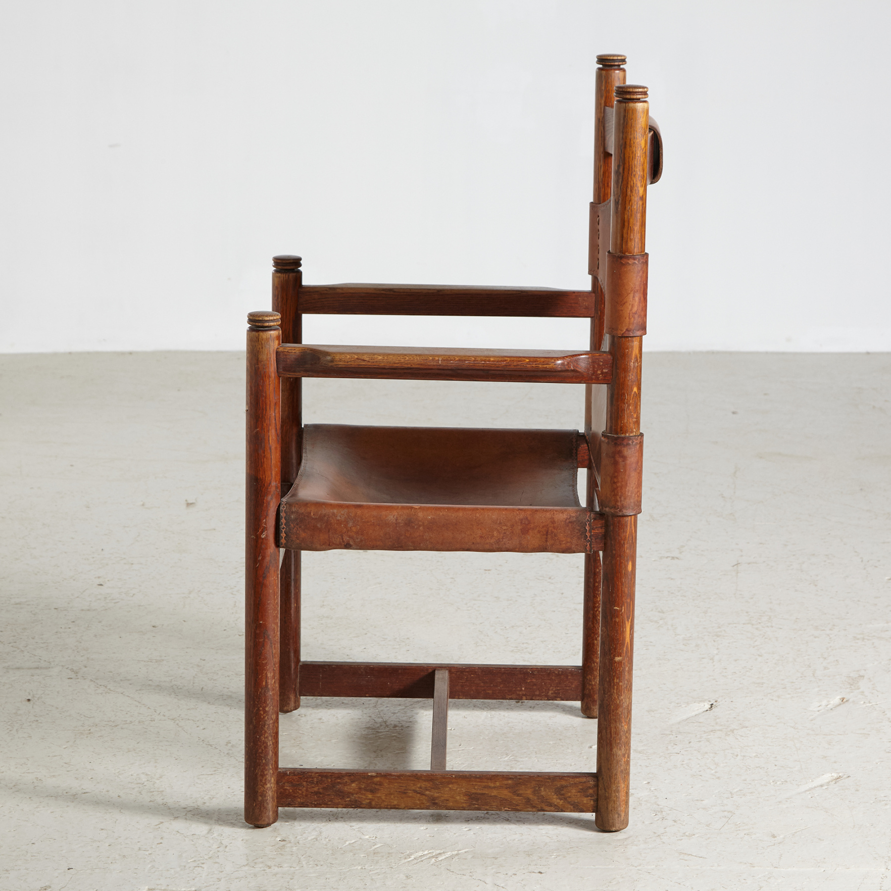 Dark oak framed lounge chair with genuine leather seat and backrest in nice vintage condition