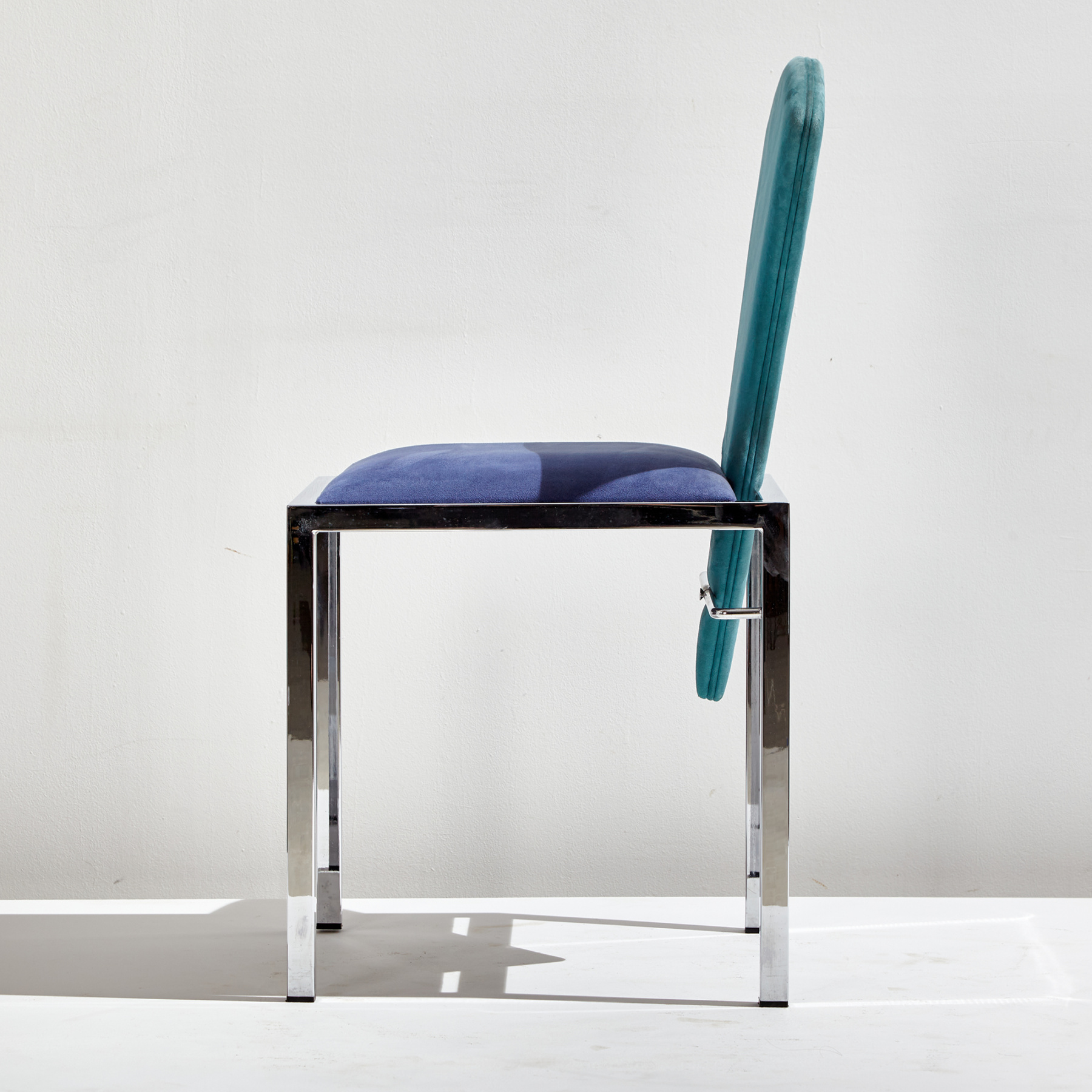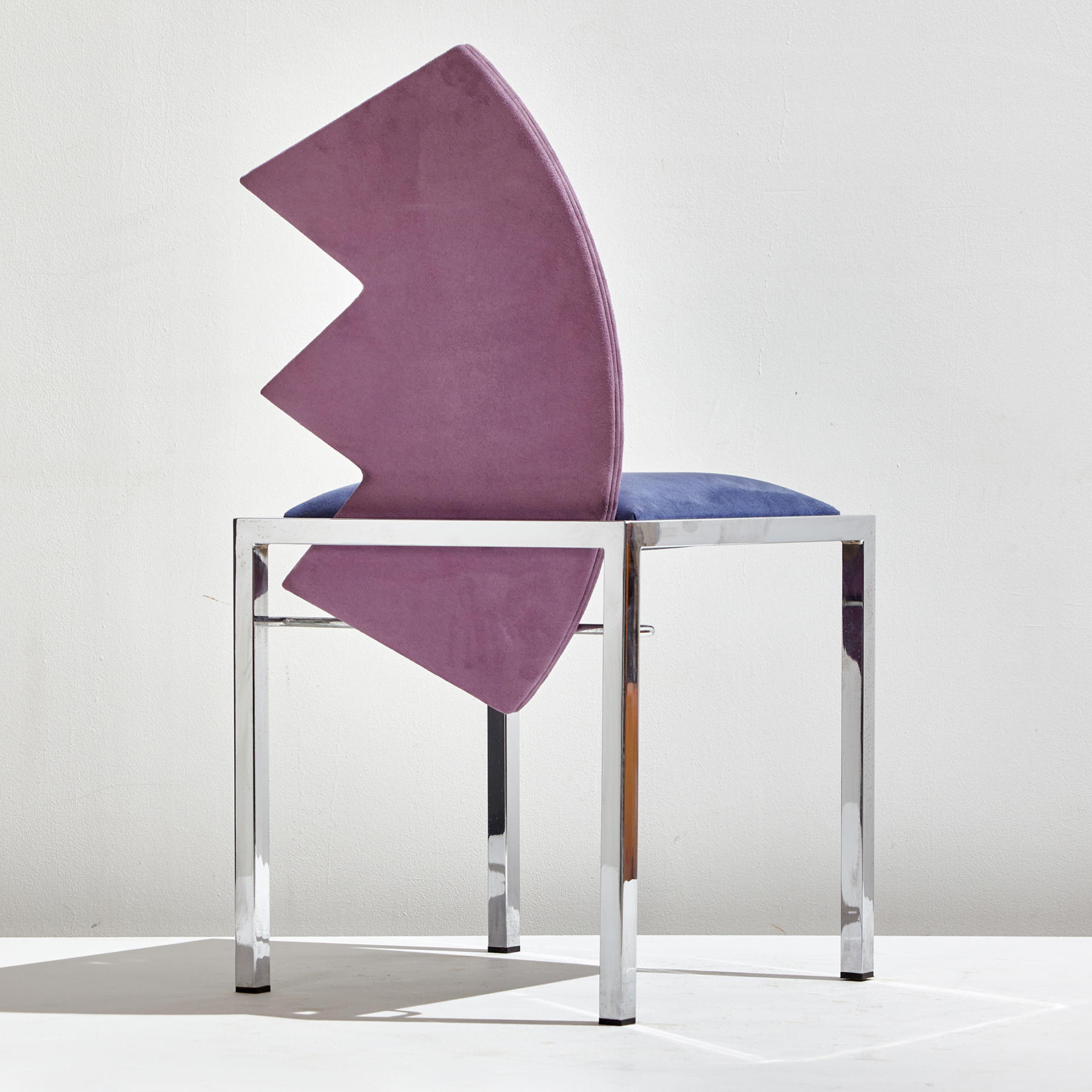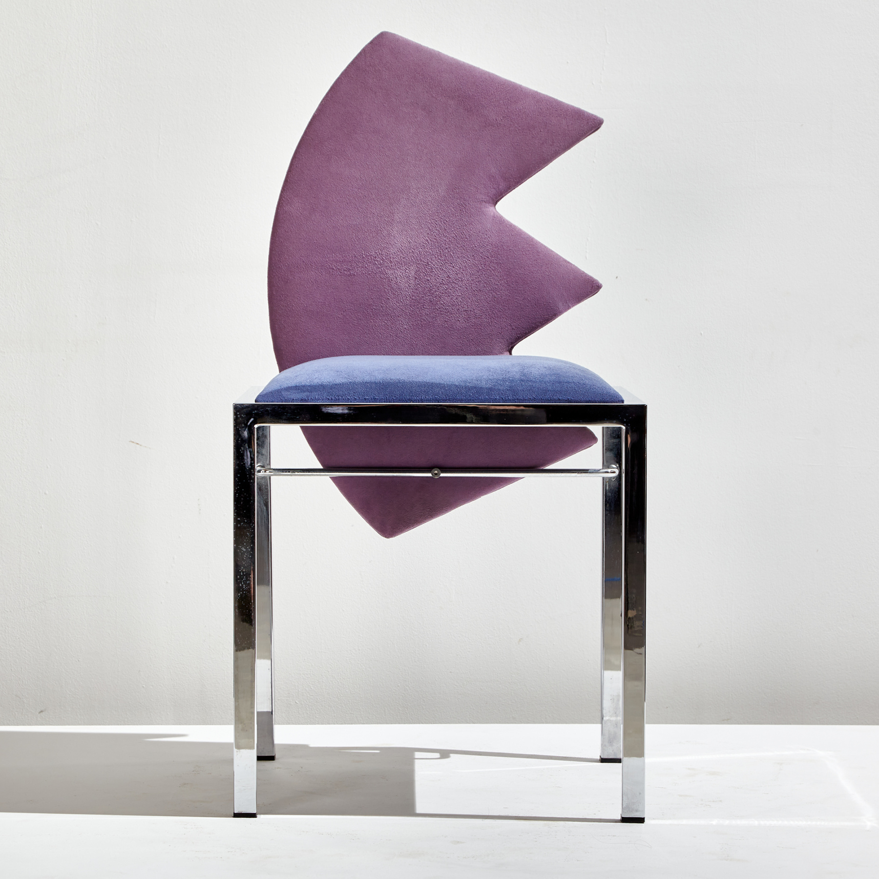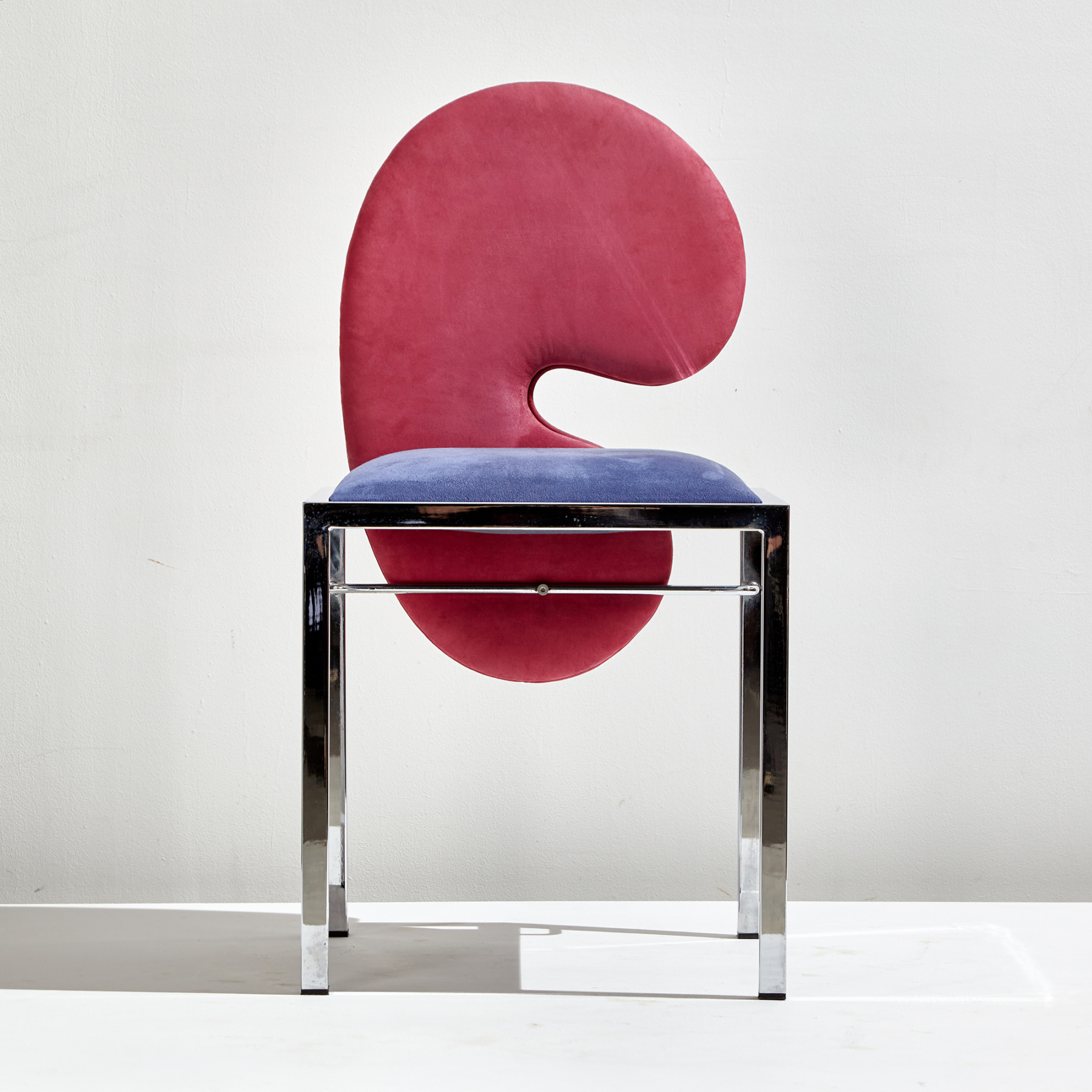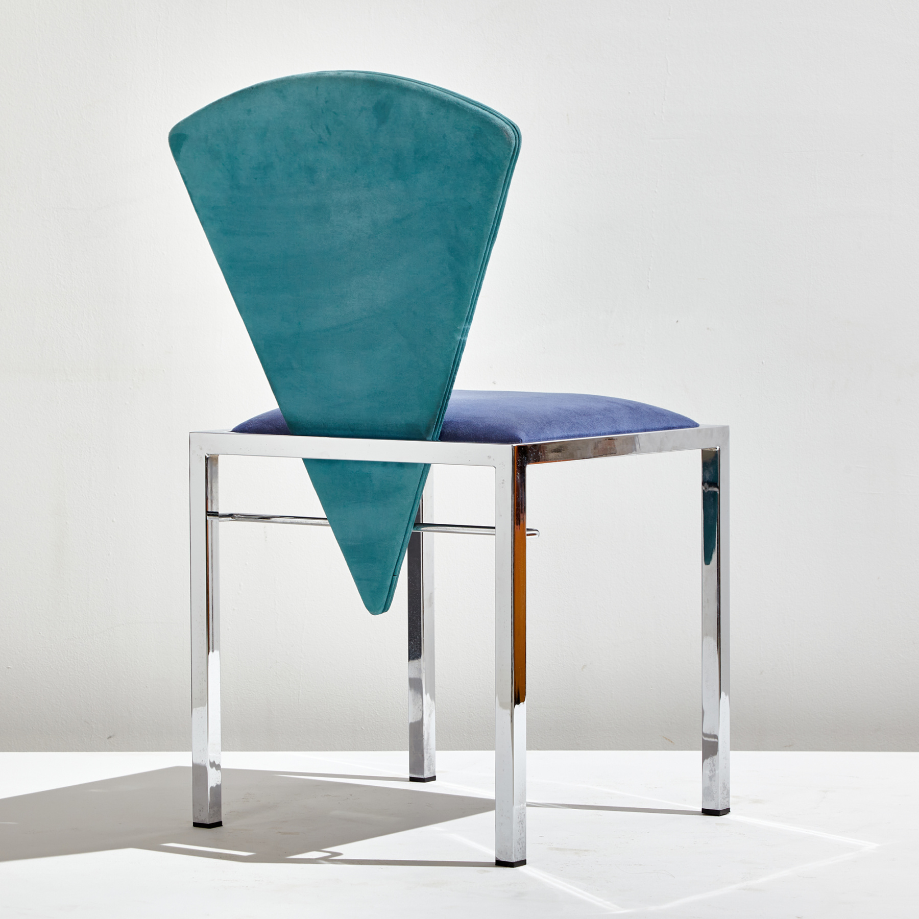 Rare and exciting treasures of iconic Italian postmodernism. The ‘Omaggi’ chairs designed by Salvati & Tresoldi for Saporiti Italia in the 1980s. The chairs are a cross between fine art and design, as the backrests are a homage to the four contemporary artists Arp, Balla, Malevich and Warhol. The playful design of the chairs and their clean, chrome-plated steel frame structure create a perfect harmony. The textile and chrome surfaces of the chairs have scratches, stains and wear in places.