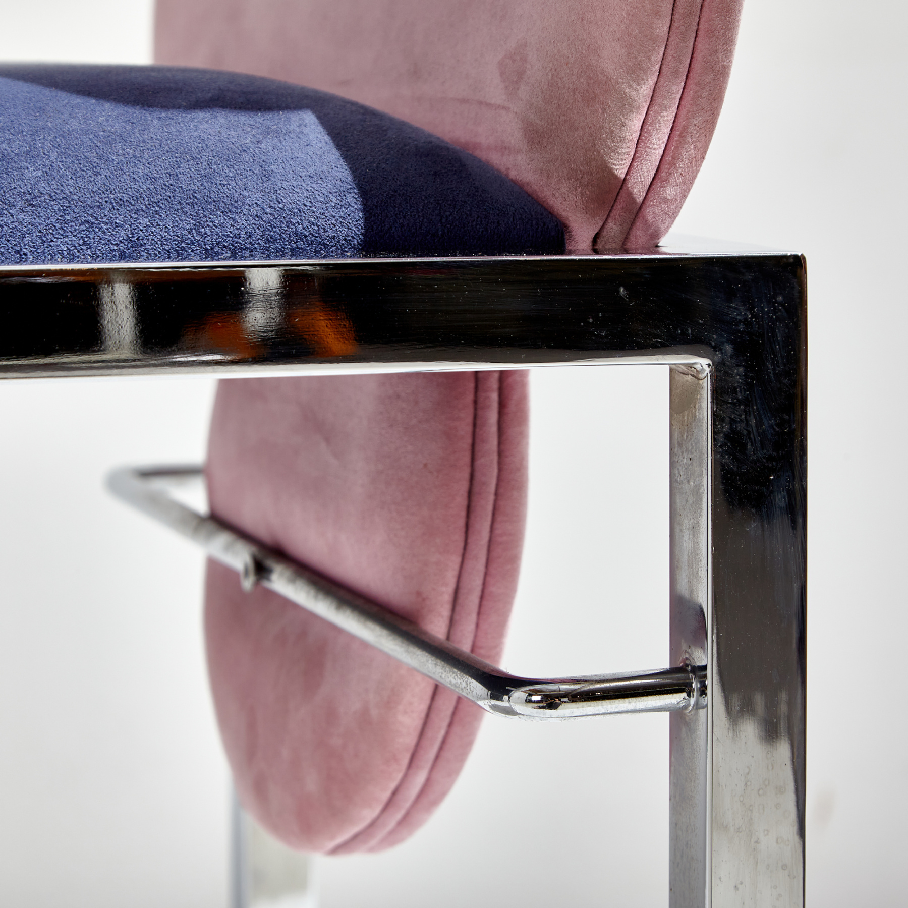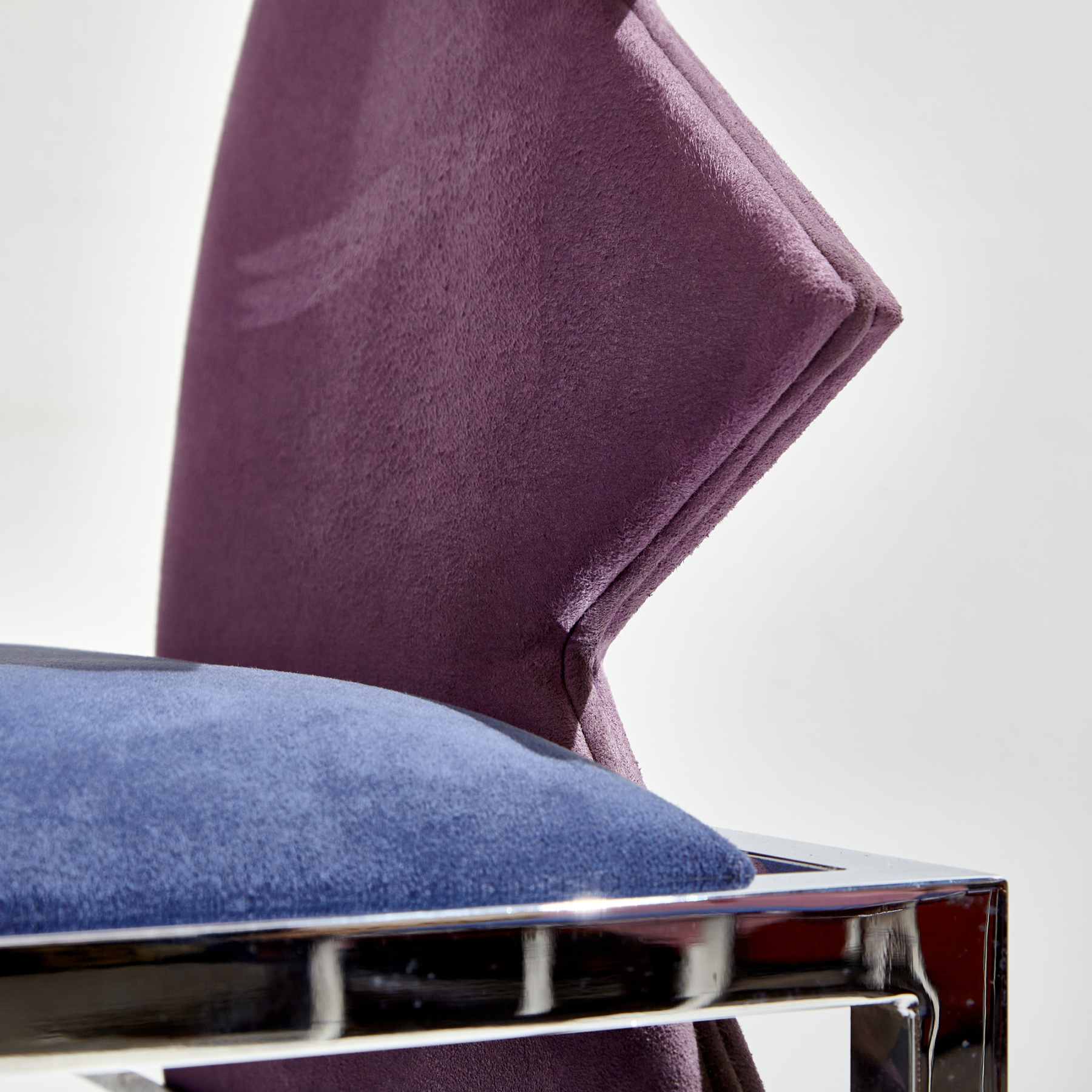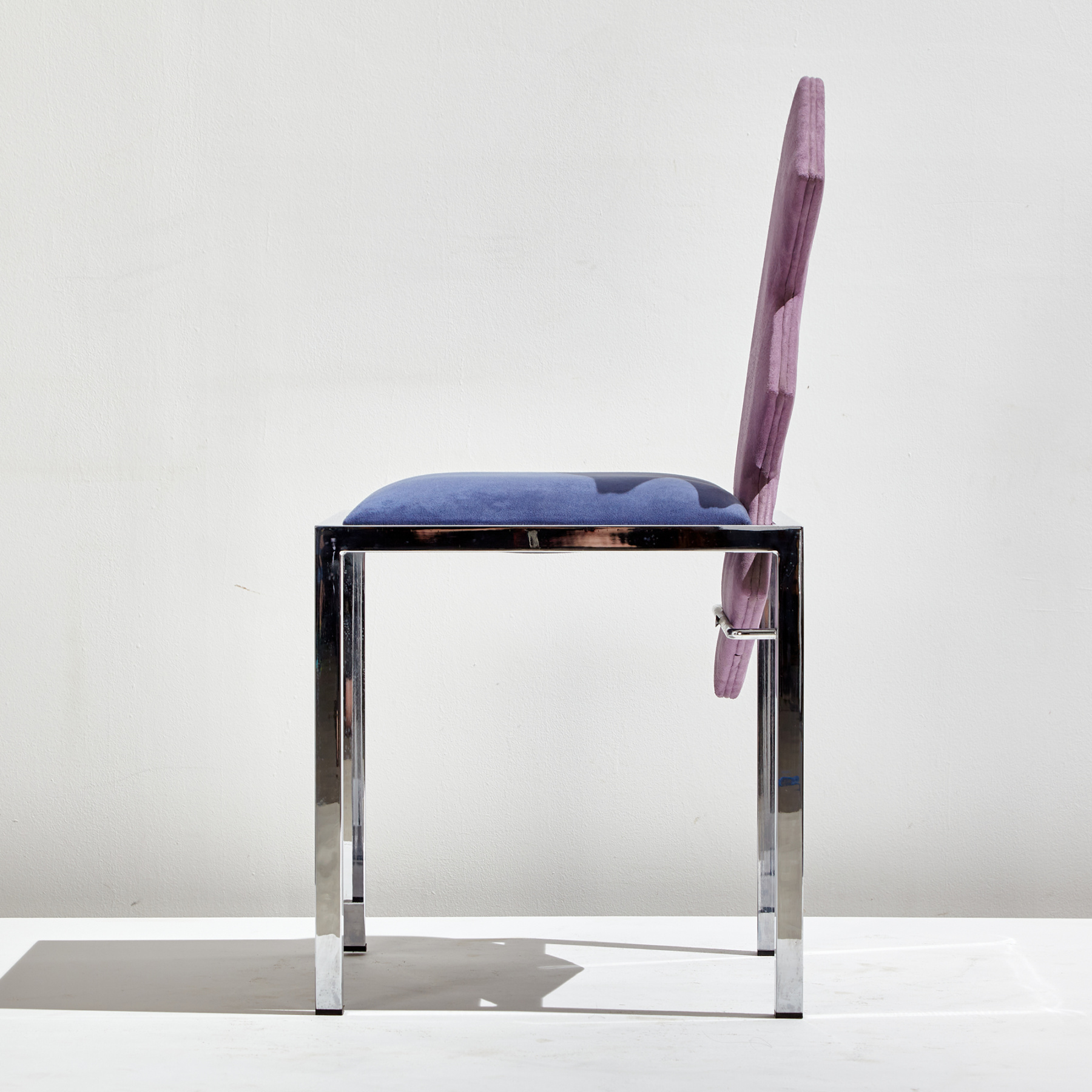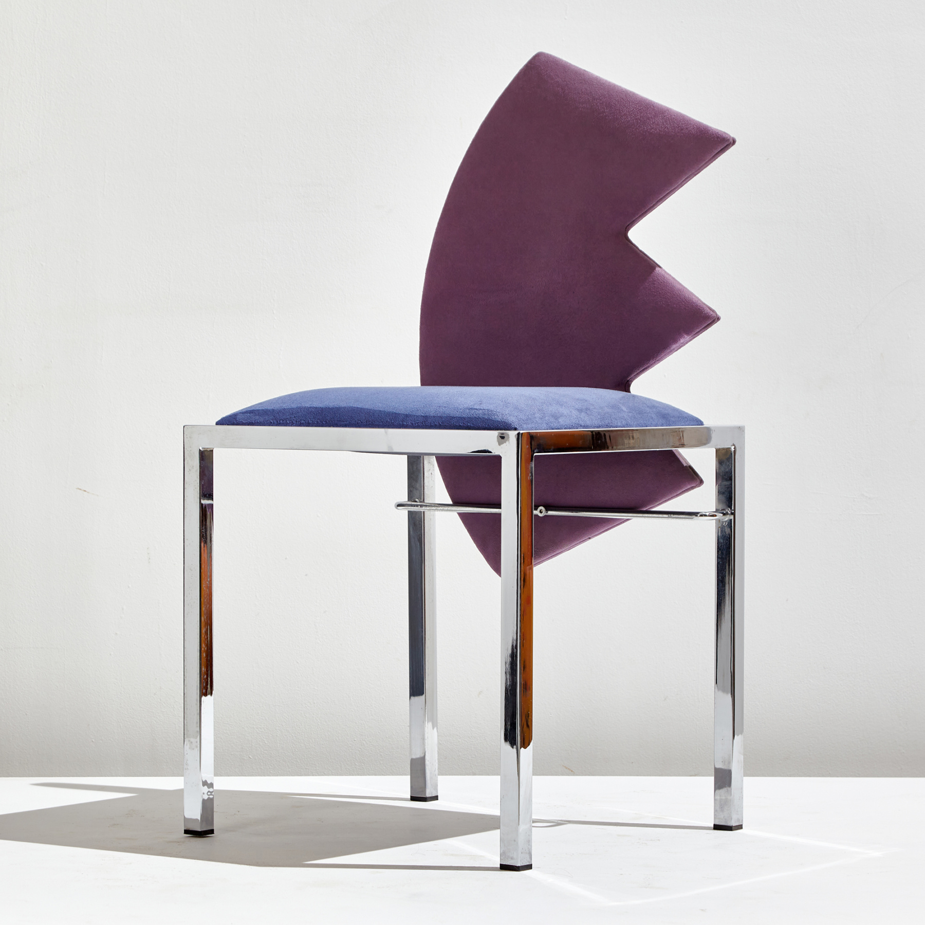 Rare and exciting treasures of iconic Italian postmodernism. The ‘Omaggi’ chairs designed by Salvati & Tresoldi for Saporiti Italia in the 1980s. The chairs are a cross between fine art and design, as the backrests are a homage to the four contemporary artists Arp, Balla, Malevich and Warhol. The playful design of the chairs and their clean, chrome-plated steel frame structure create a perfect harmony. The textile and chrome surfaces of the chairs have scratches, stains and wear in places.