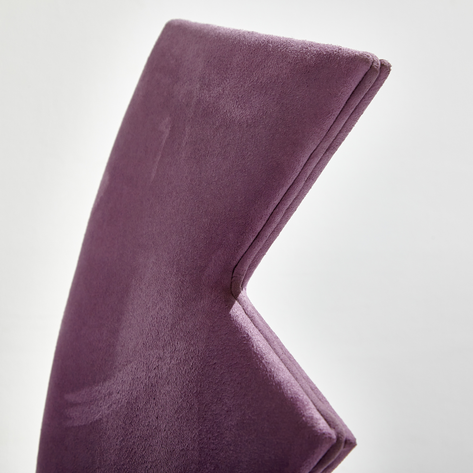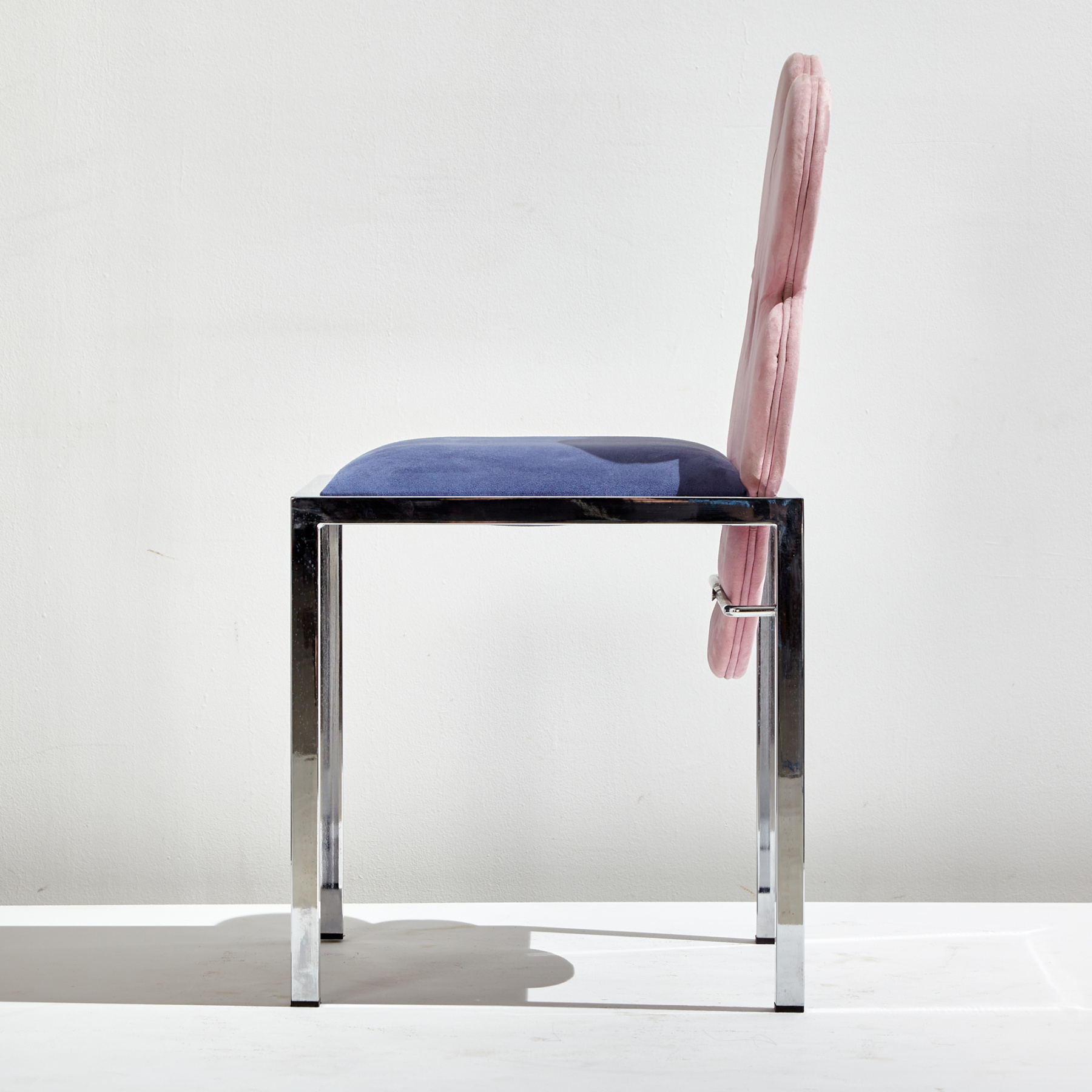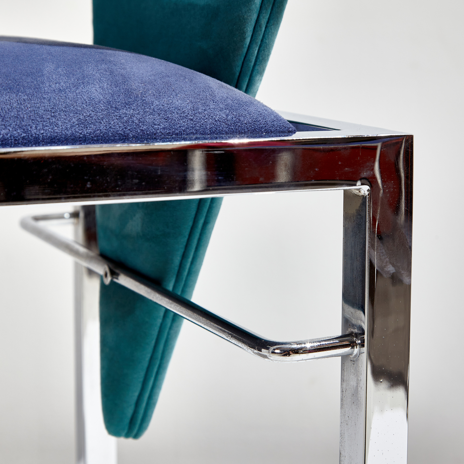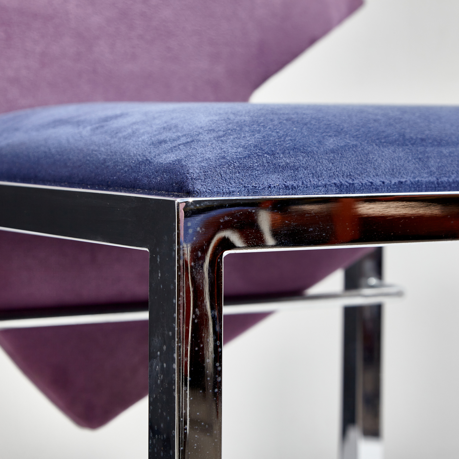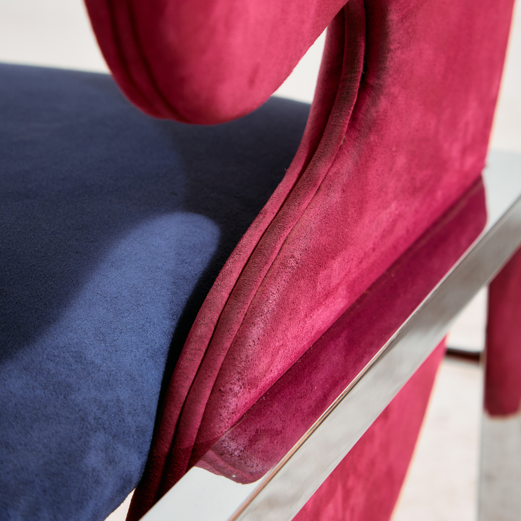 Rare and exciting treasures of iconic Italian postmodernism. The ‘Omaggi’ chairs designed by Salvati & Tresoldi for Saporiti Italia in the 1980s. The chairs are a cross between fine art and design, as the backrests are a homage to the four contemporary artists Arp, Balla, Malevich and Warhol. The playful design of the chairs and their clean, chrome-plated steel frame structure create a perfect harmony. The textile and chrome surfaces of the chairs have scratches, stains and wear in places.