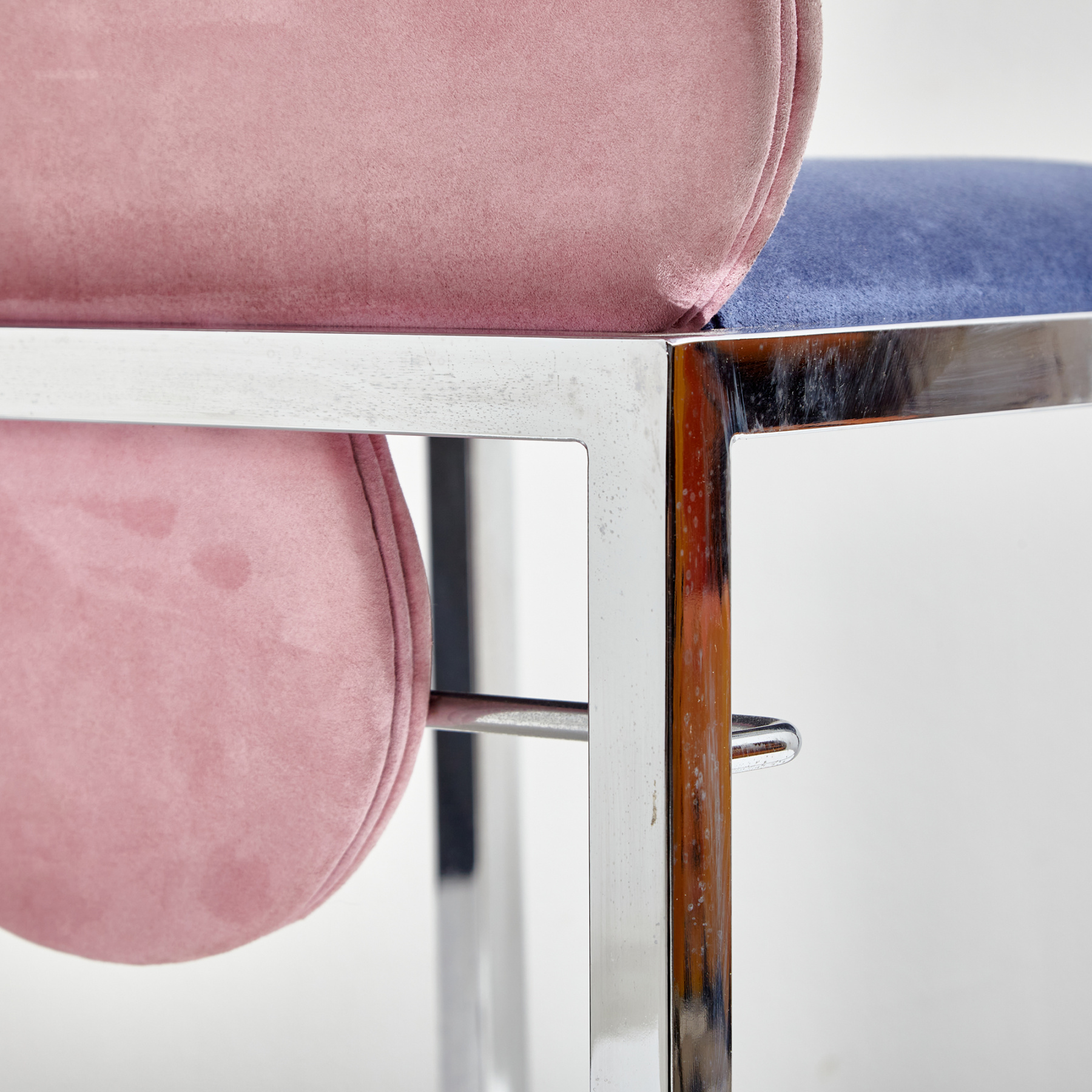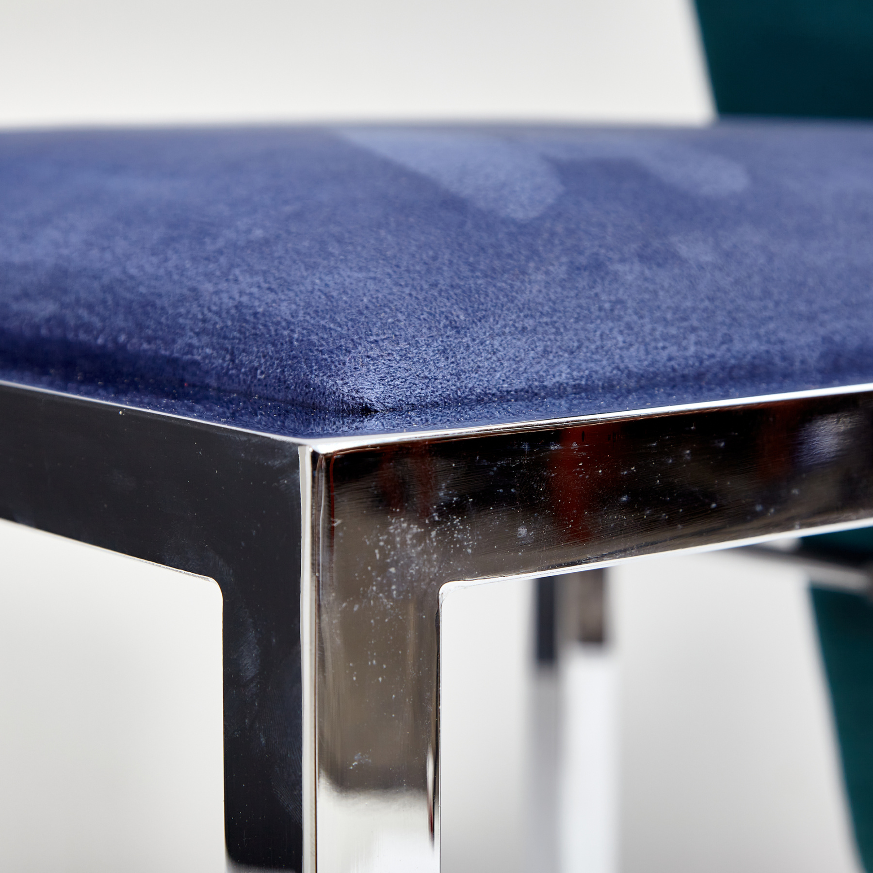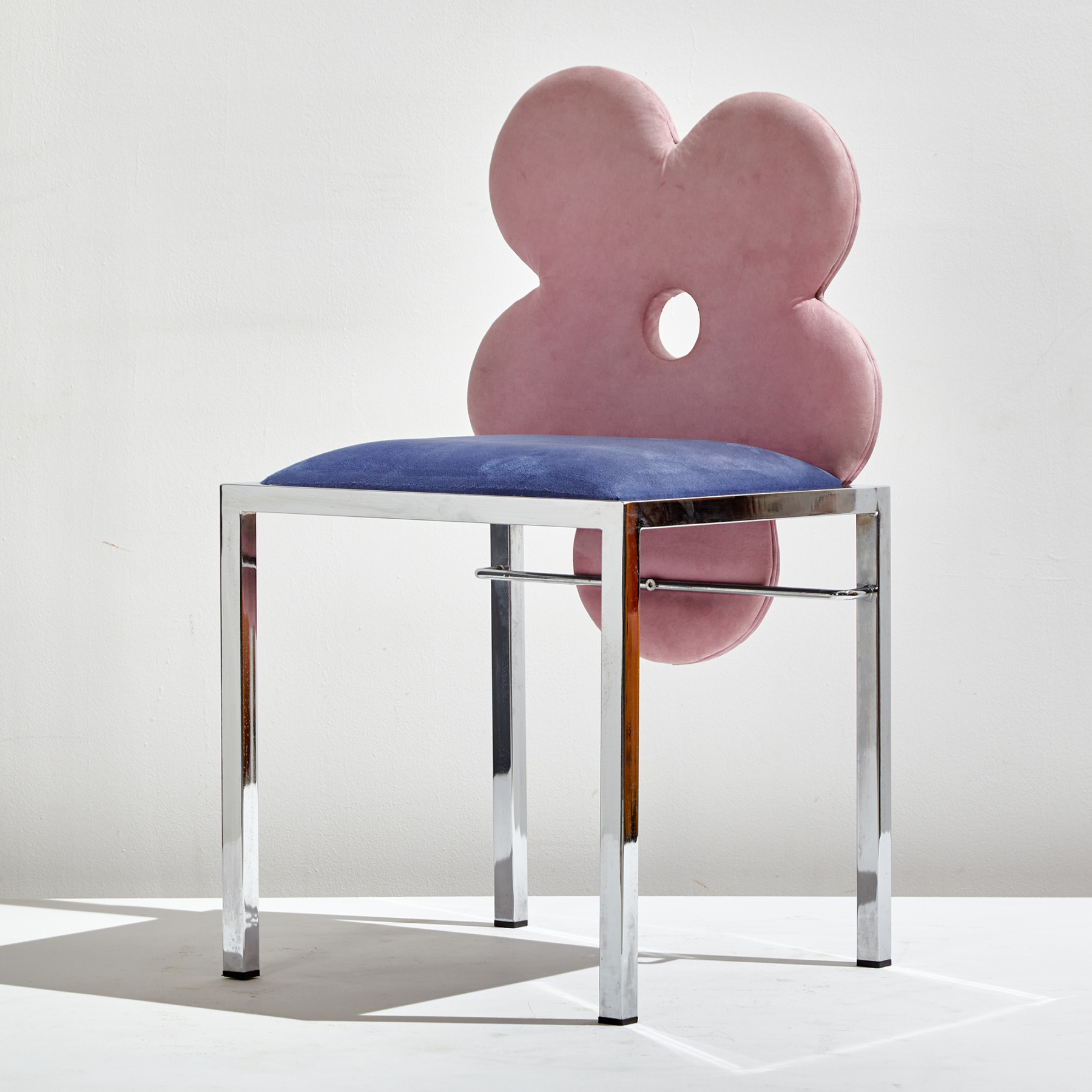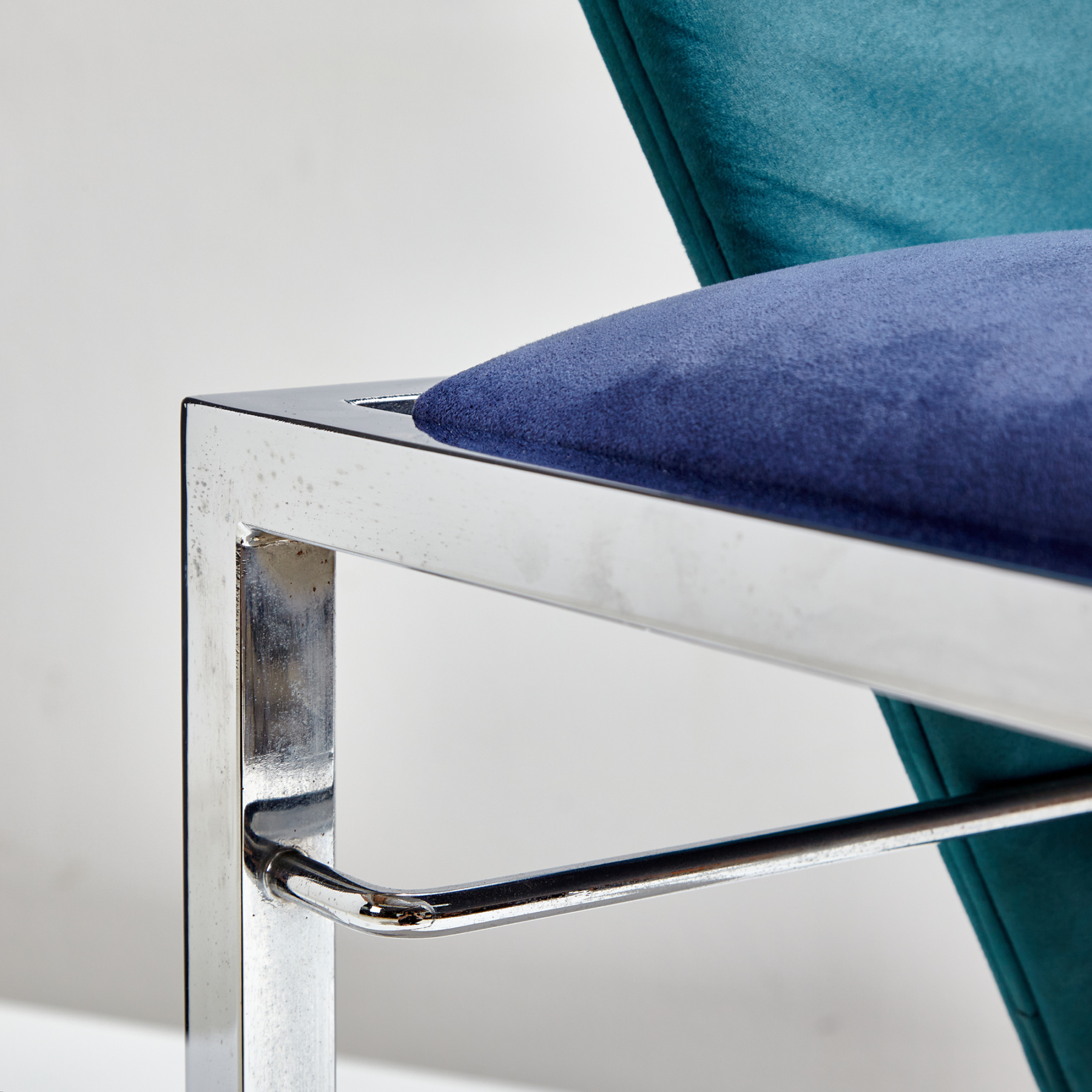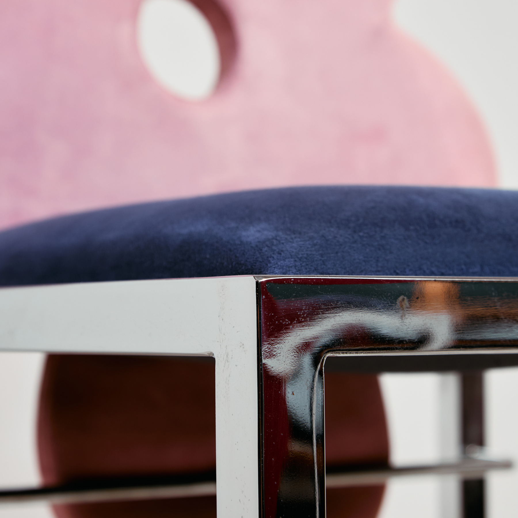 Rare and exciting treasures of iconic Italian postmodernism. The ‘Omaggi’ chairs designed by Salvati & Tresoldi for Saporiti Italia in the 1980s. The chairs are a cross between fine art and design, as the backrests are a homage to the four contemporary artists Arp, Balla, Malevich and Warhol. The playful design of the chairs and their clean, chrome-plated steel frame structure create a perfect harmony. The textile and chrome surfaces of the chairs have scratches, stains and wear in places.