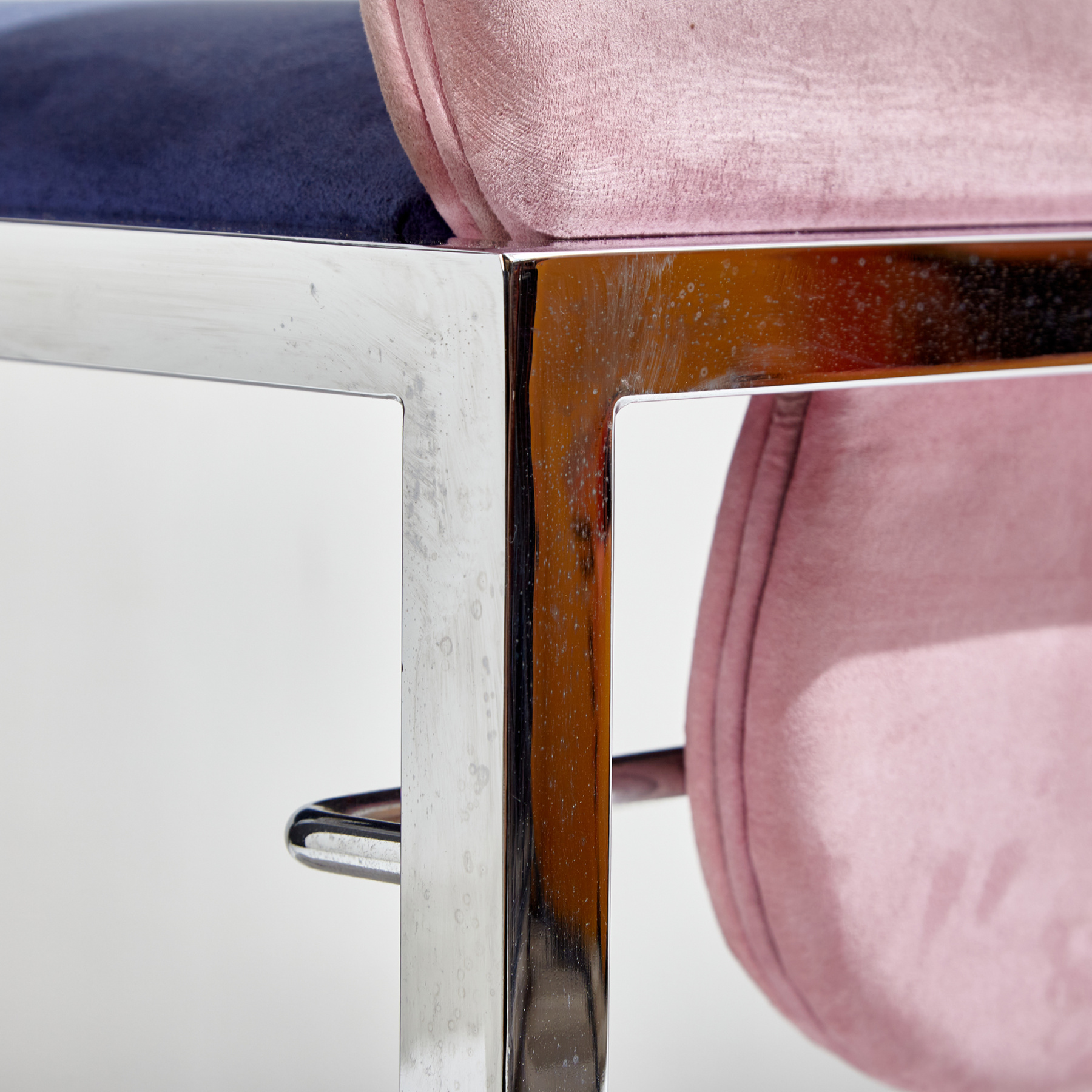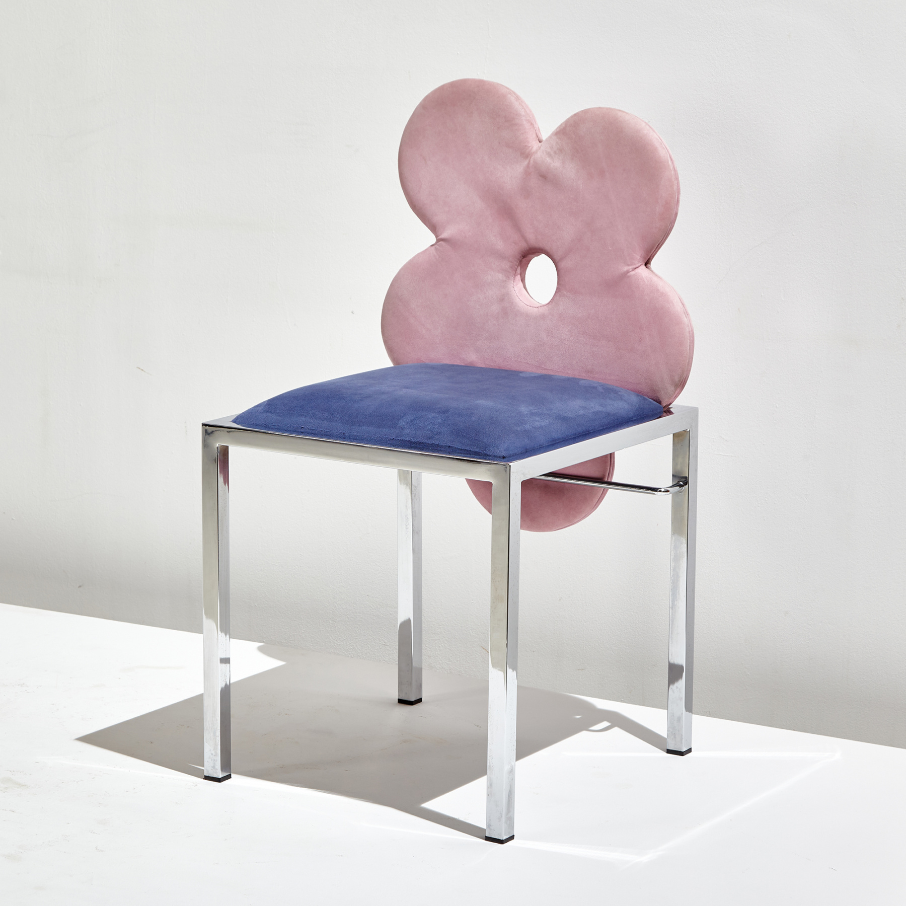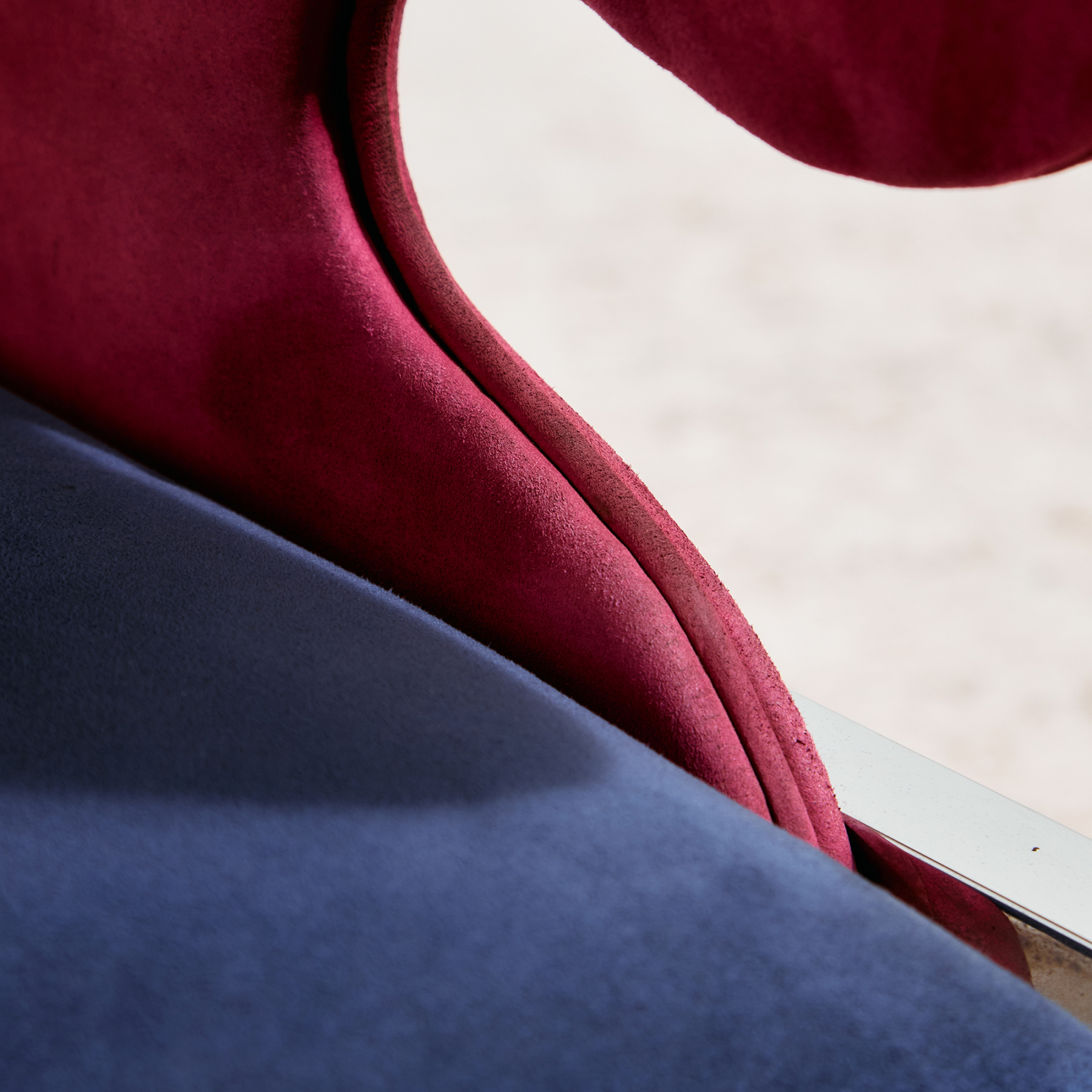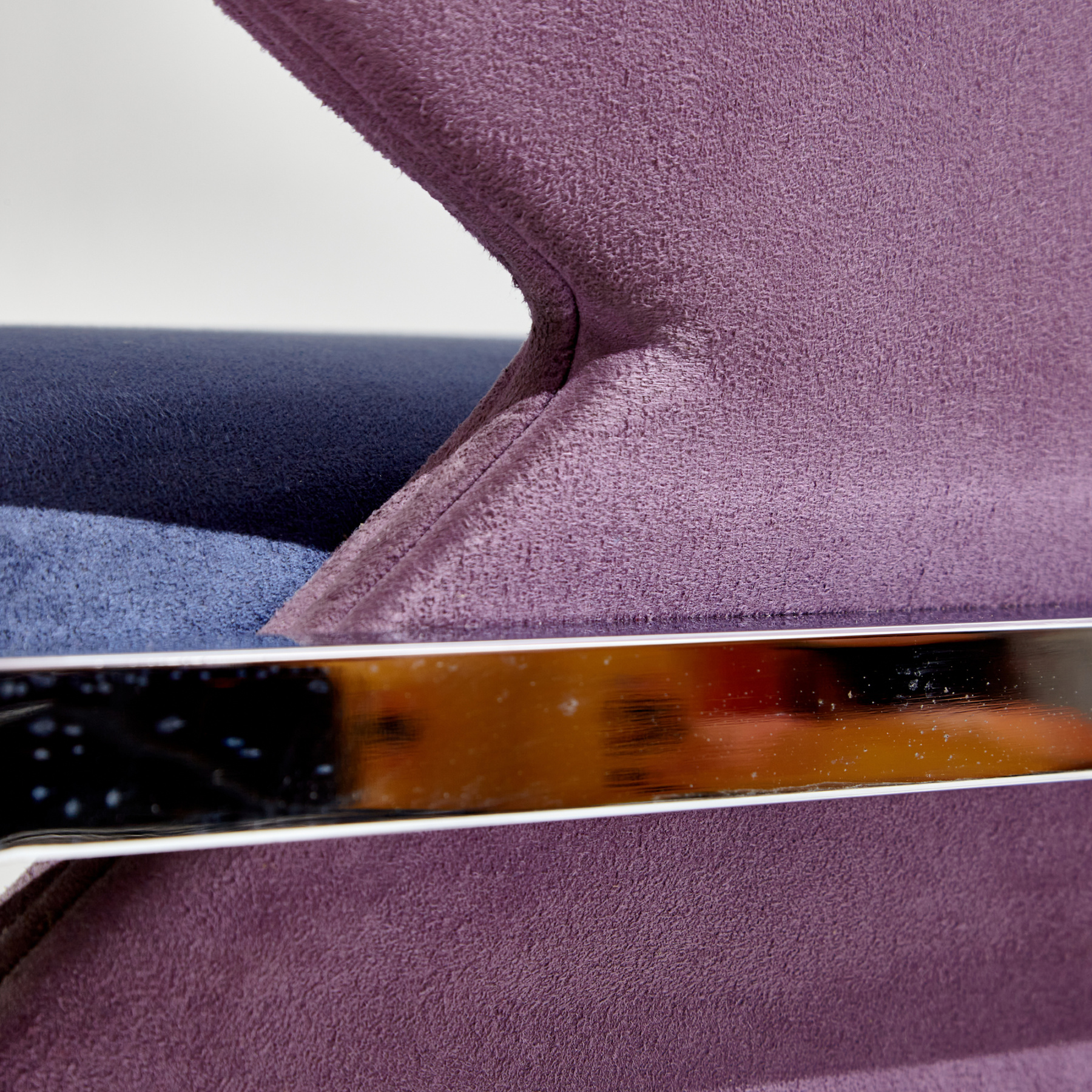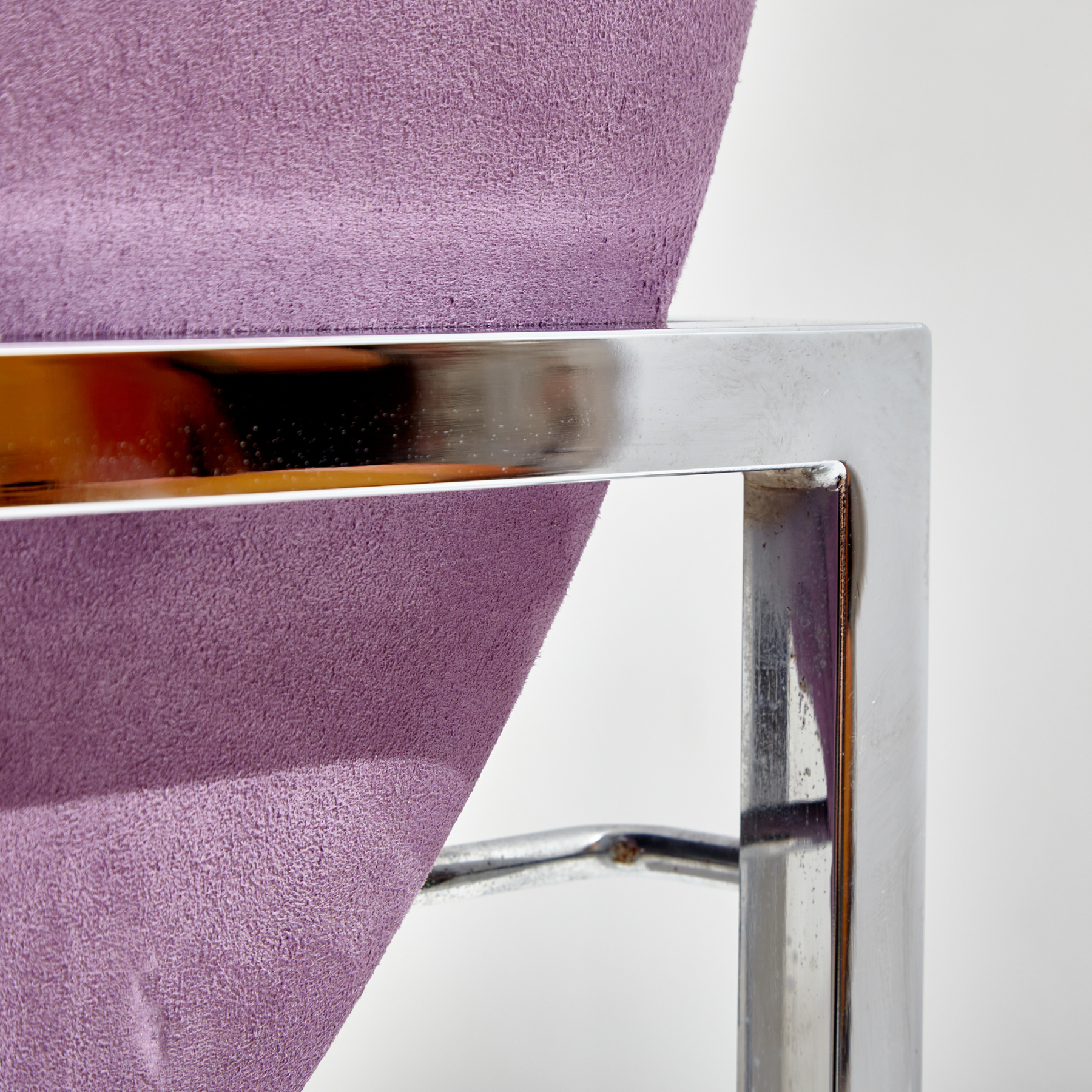 Rare and exciting treasures of iconic Italian postmodernism. The ‘Omaggi’ chairs designed by Salvati & Tresoldi for Saporiti Italia in the 1980s. The chairs are a cross between fine art and design, as the backrests are a homage to the four contemporary artists Arp, Balla, Malevich and Warhol. The playful design of the chairs and their clean, chrome-plated steel frame structure create a perfect harmony. The textile and chrome surfaces of the chairs have scratches, stains and wear in places.