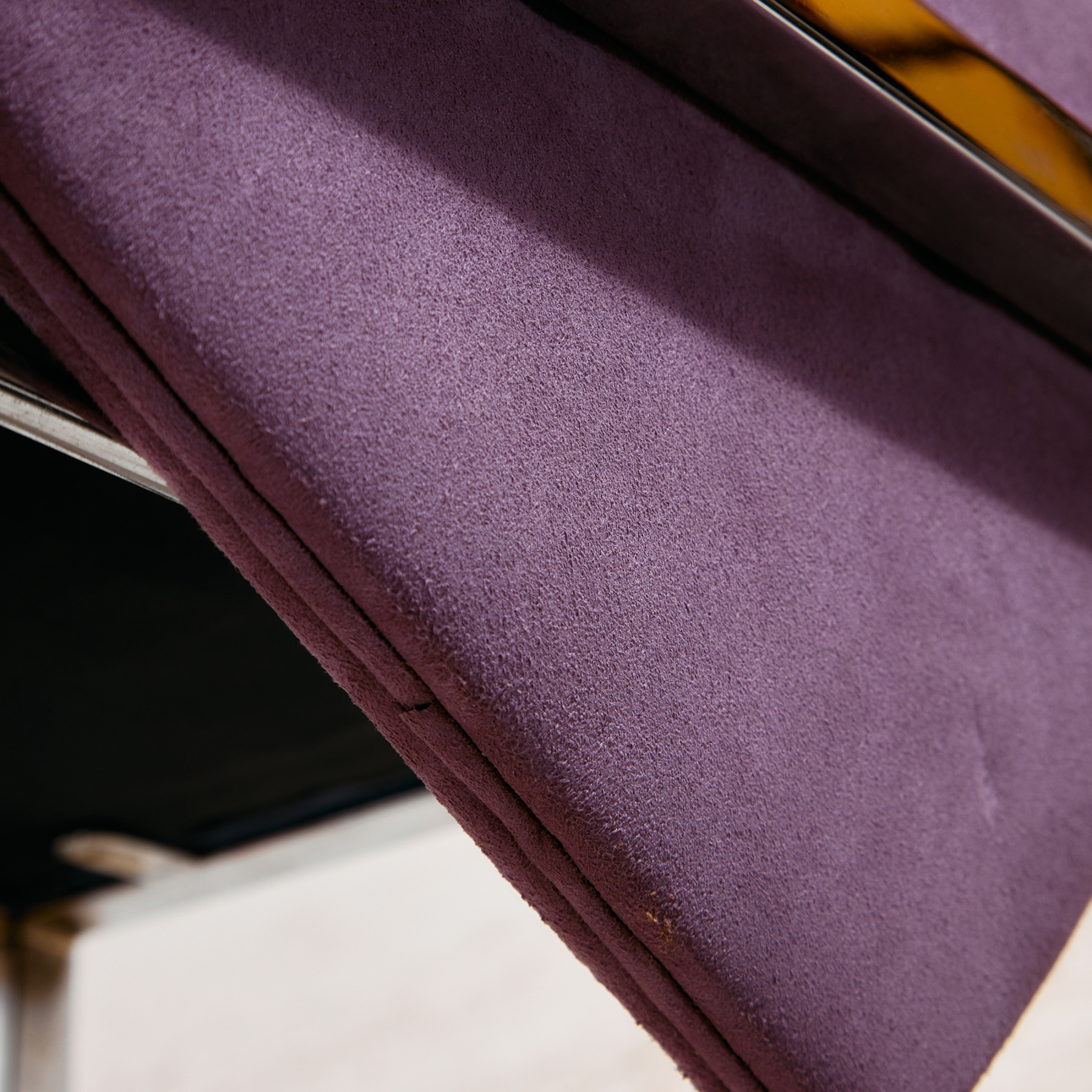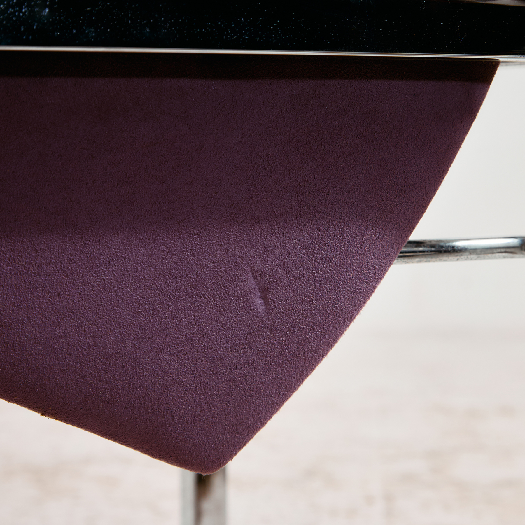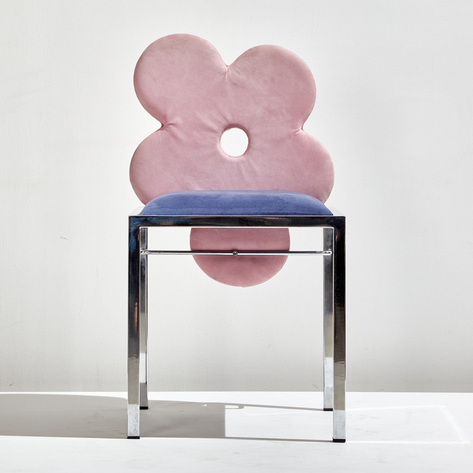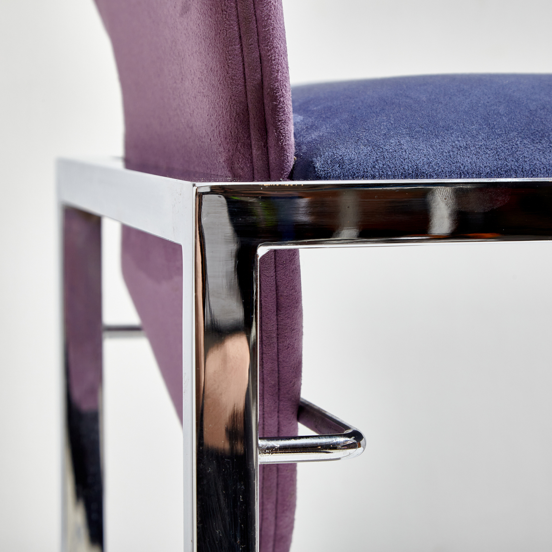 Rare and exciting treasures of iconic Italian postmodernism. The ‘Omaggi’ chairs designed by Salvati & Tresoldi for Saporiti Italia in the 1980s. The chairs are a cross between fine art and design, as the backrests are a homage to the four contemporary artists Arp, Balla, Malevich and Warhol. The playful design of the chairs and their clean, chrome-plated steel frame structure create a perfect harmony. The textile and chrome surfaces of the chairs have scratches, stains and wear in places.