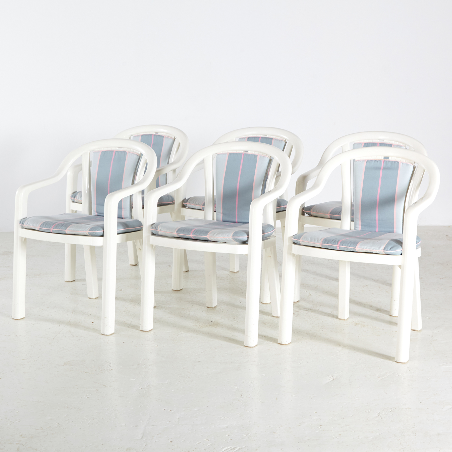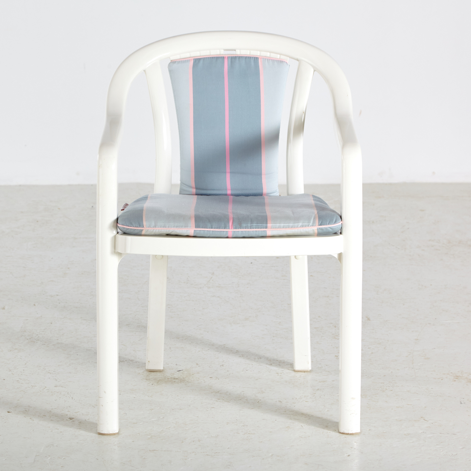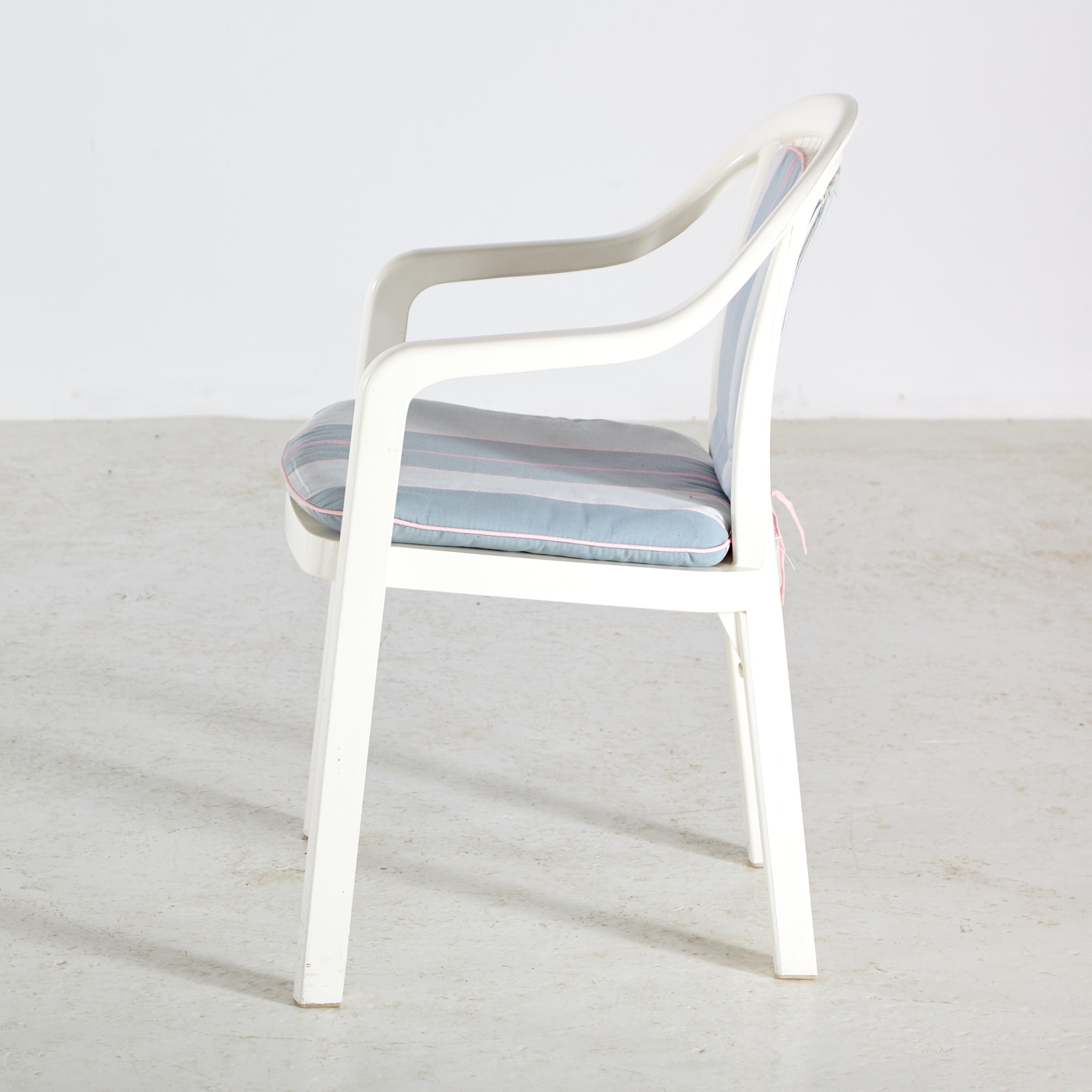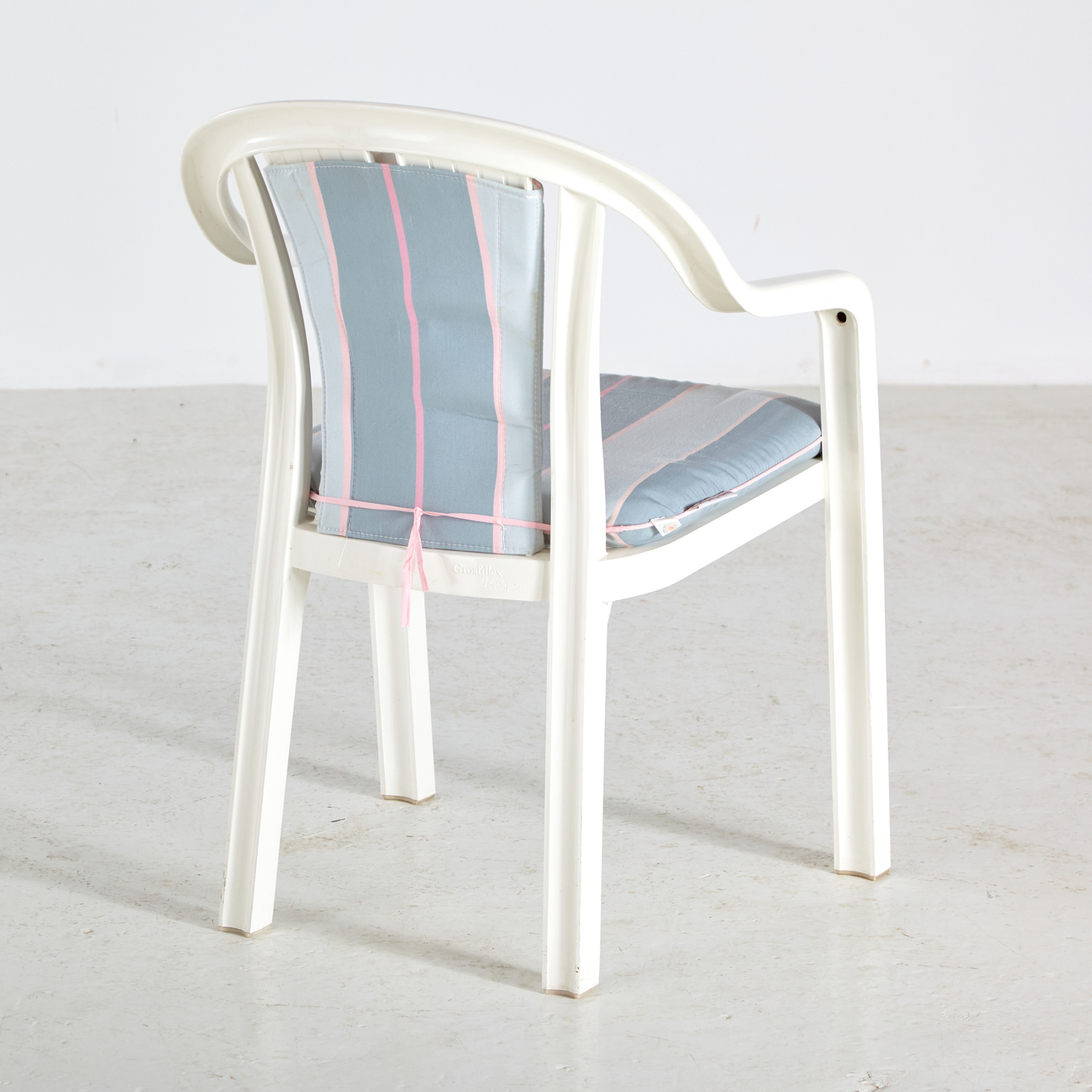 French plastic garden armchair from the 1980s, produced by Grosfillex. With Pierre Cardin textile seat and backrest cushions. With several surface scratches on the plastic parts, in nice vintage condition.