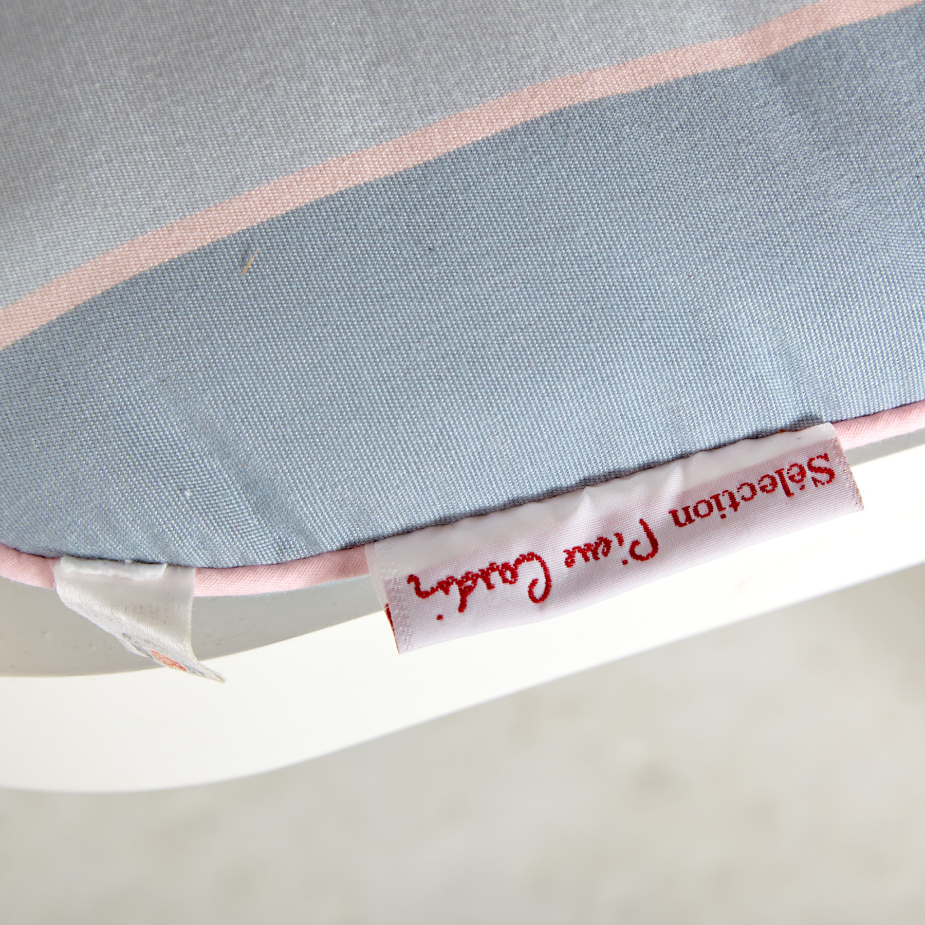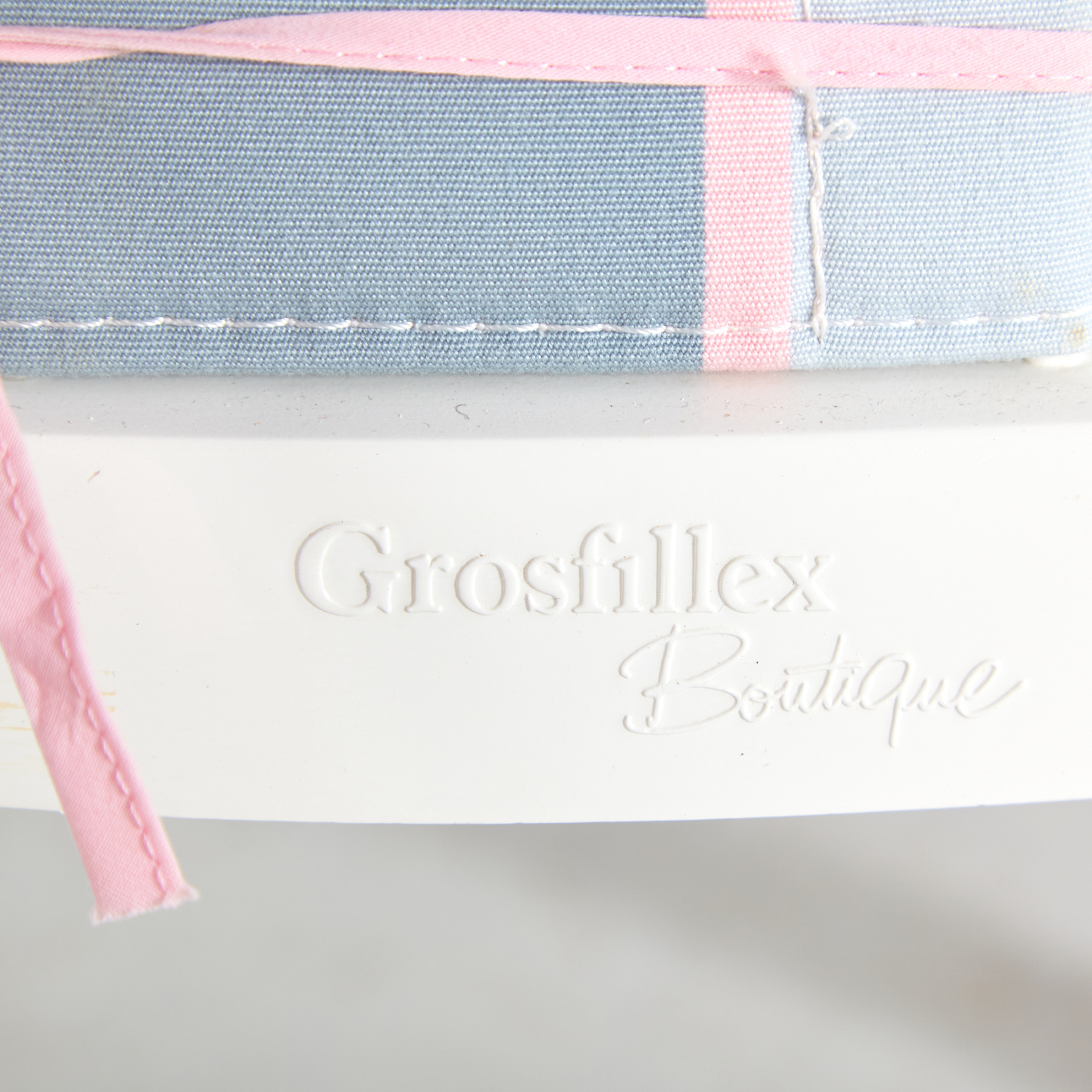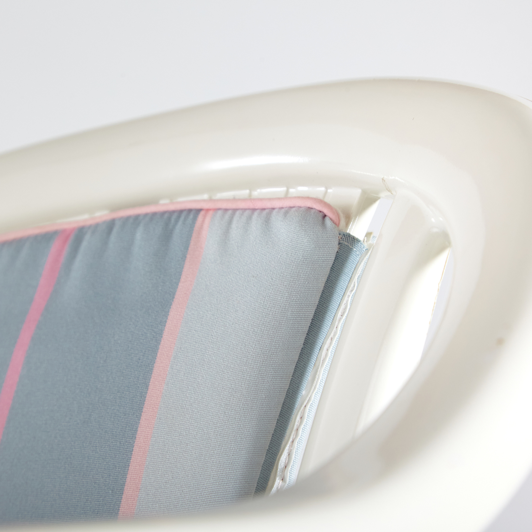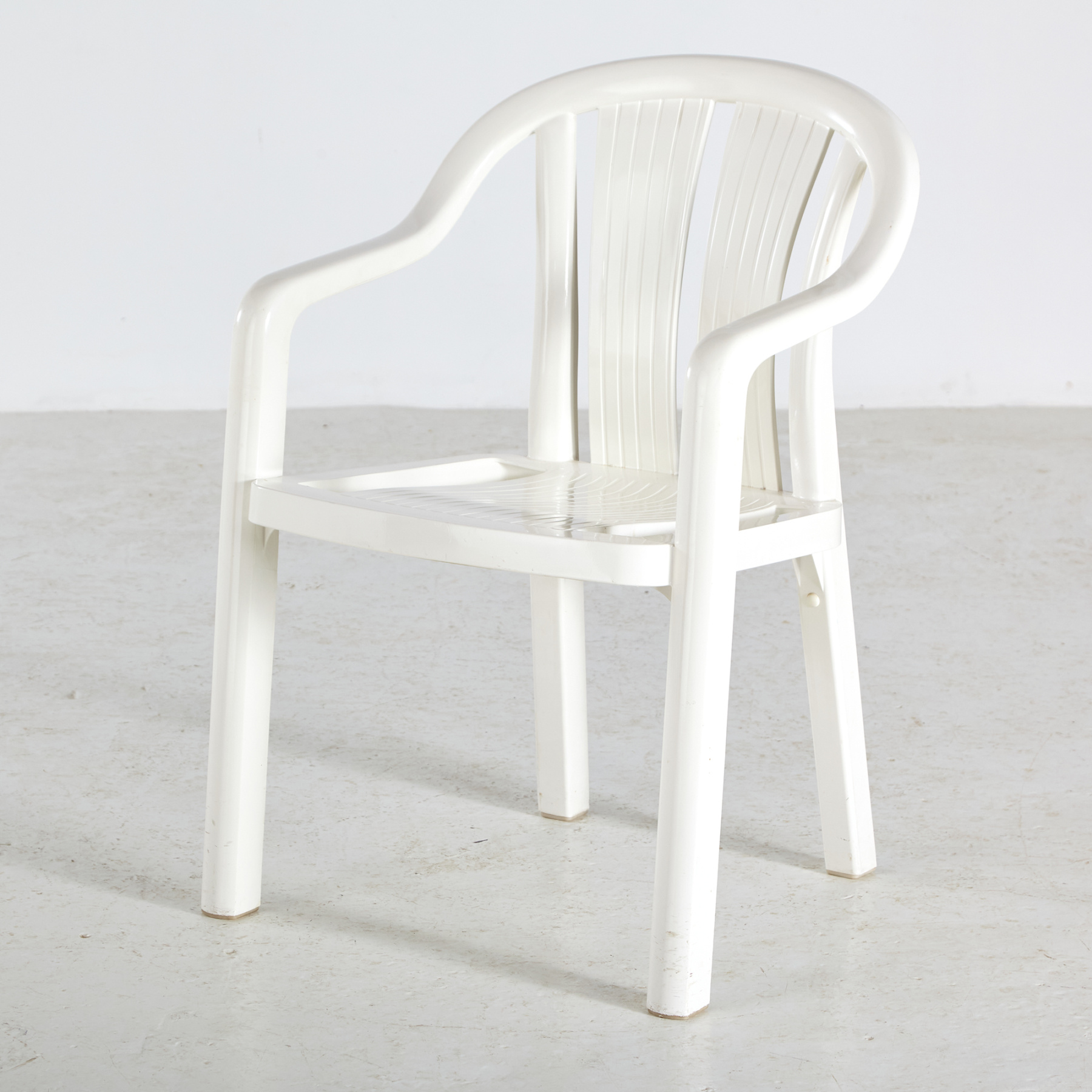 French plastic garden armchair from the 1980s, produced by Grosfillex. With Pierre Cardin textile seat and backrest cushions. With several surface scratches on the plastic parts, in nice vintage condition.