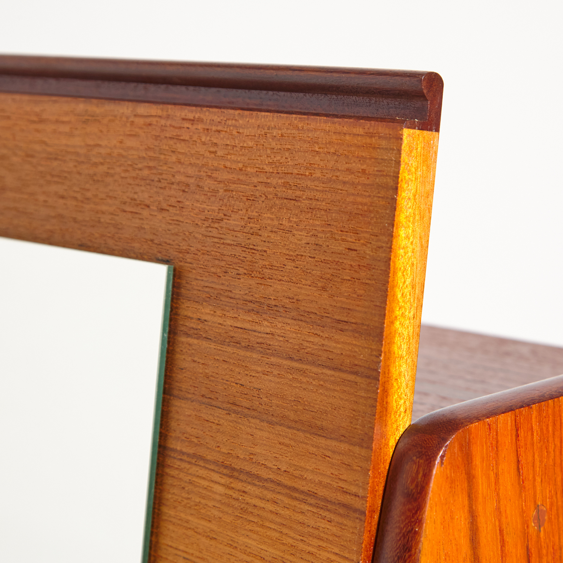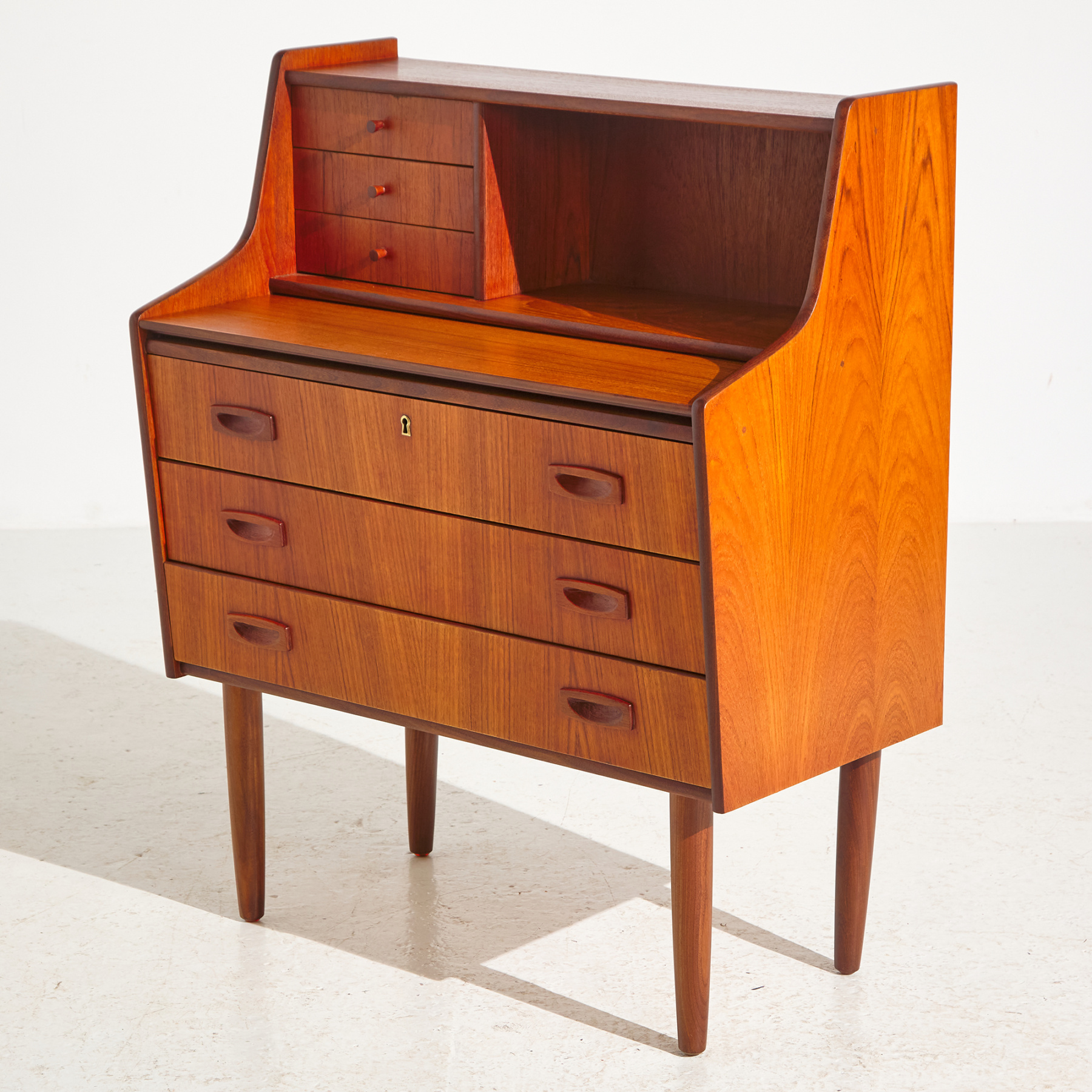 Danish teak six-drawer bureau desk in restored condition. With special shaped handles and extendable writing board with mirror. The key to the drawer is missing.