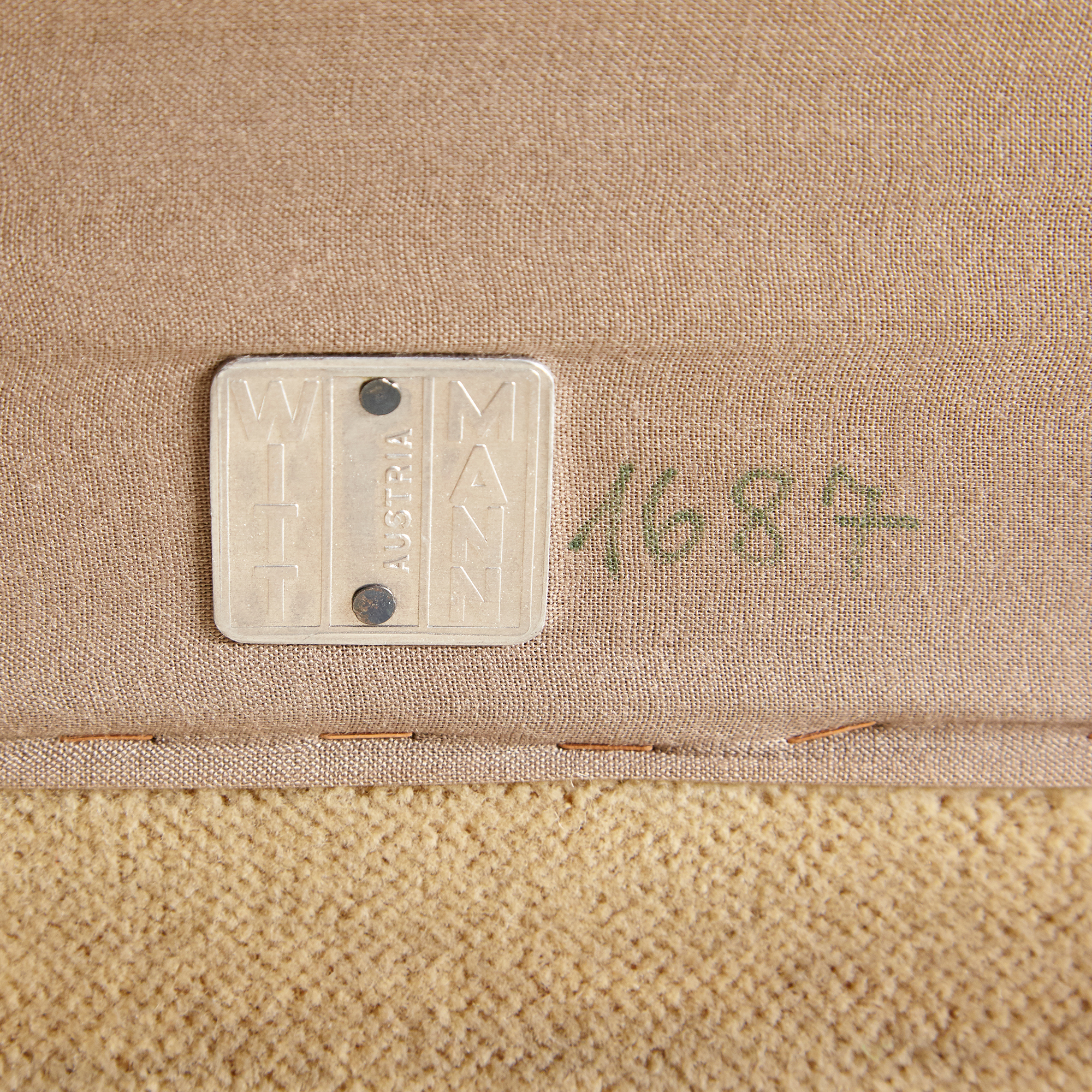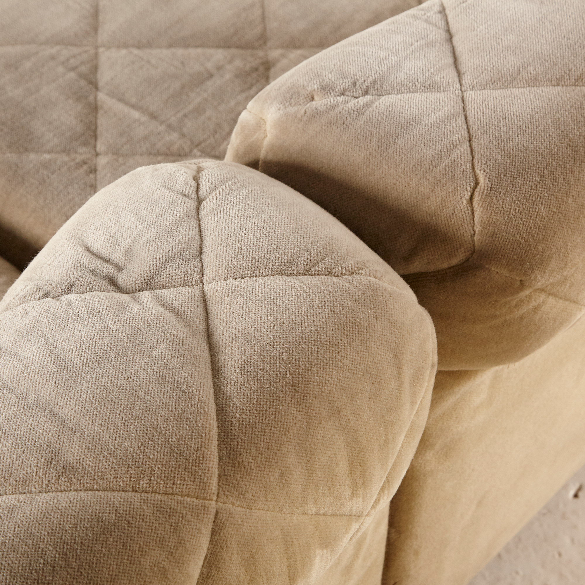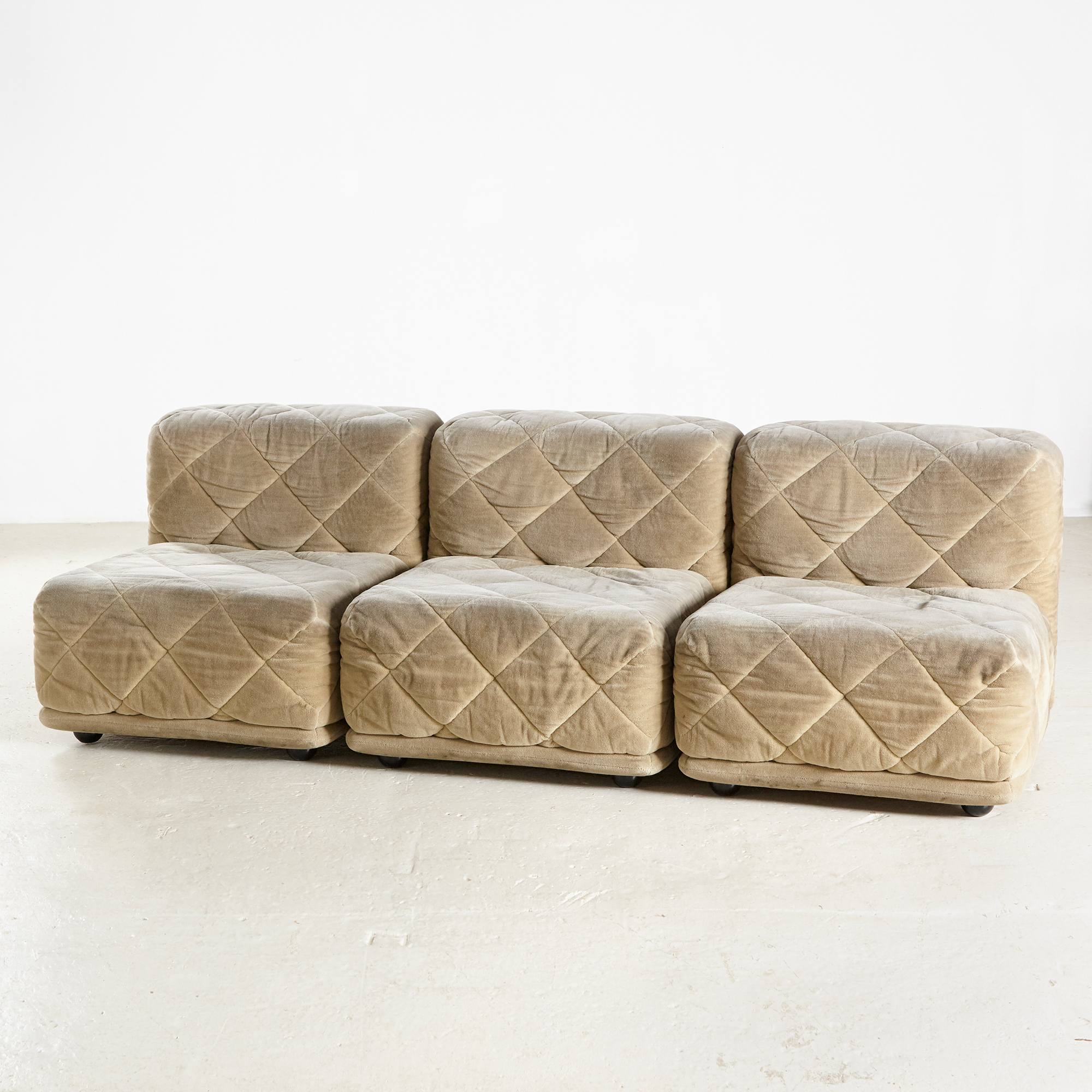 Three-seater ‘Rhombos’ modular sofa set with comfortable textile upholstery from the 1970s, designed by Karl Wittmann for Wittmann. The upholstery has surface scratches, stains, and wear in places with signs of use.