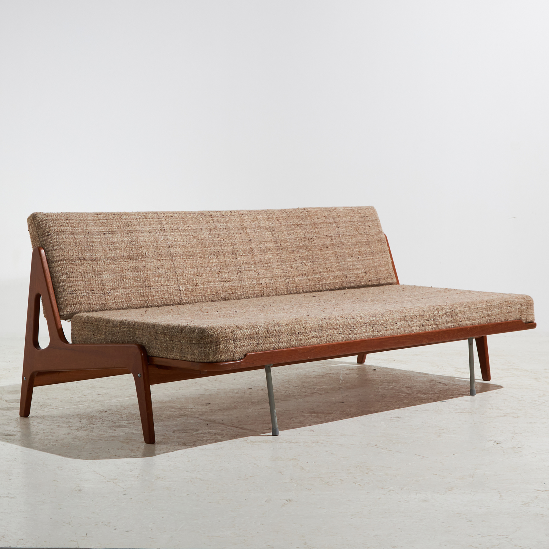 Upholstered Danish sofa on teak frame from the 1960s designed by Arne Wahl Iversen for Komfort. It can be used as a sofa or roll out for a comfortable daybed. With some surface scratches and wear on the wooden parts.