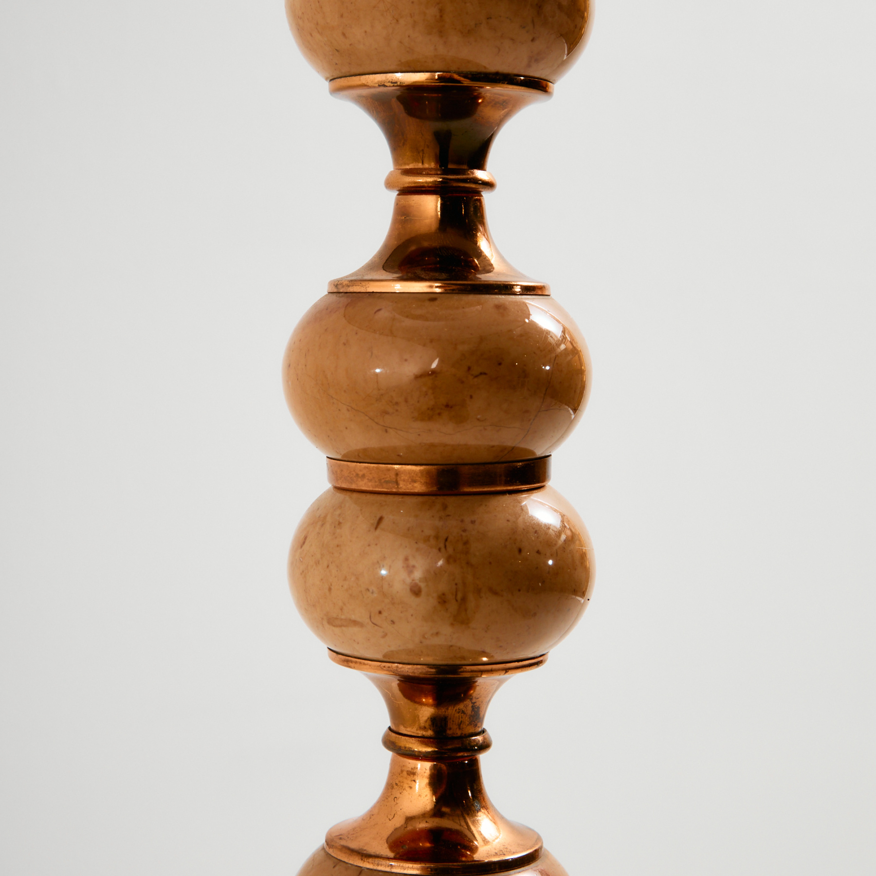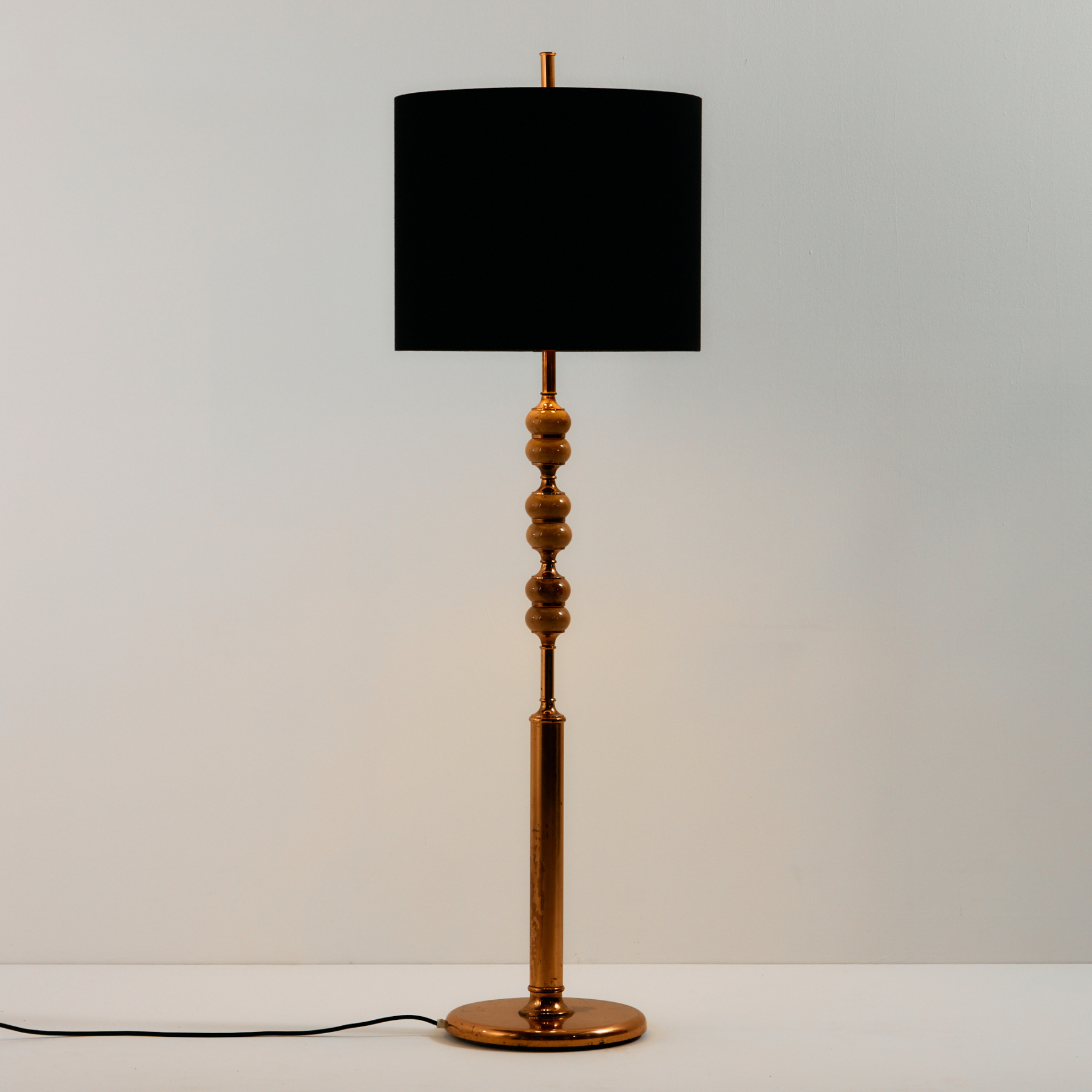 German floor lamp with fresh textile lampshade and stone inlay from the 1970s, produced by Veb Narva. The surface of the lamp has scratches, stains, and wear with signs of use. The metal surface is oxidized.