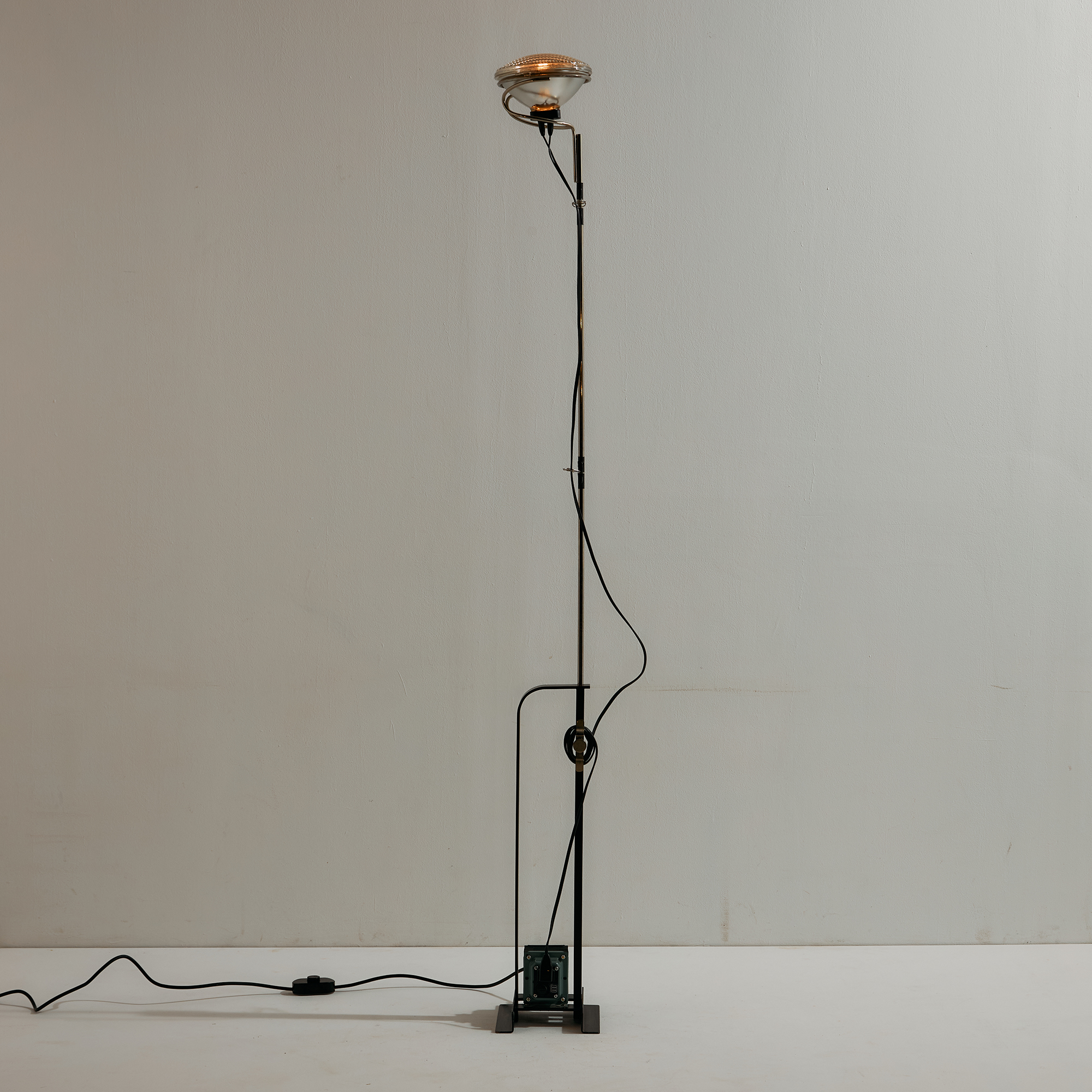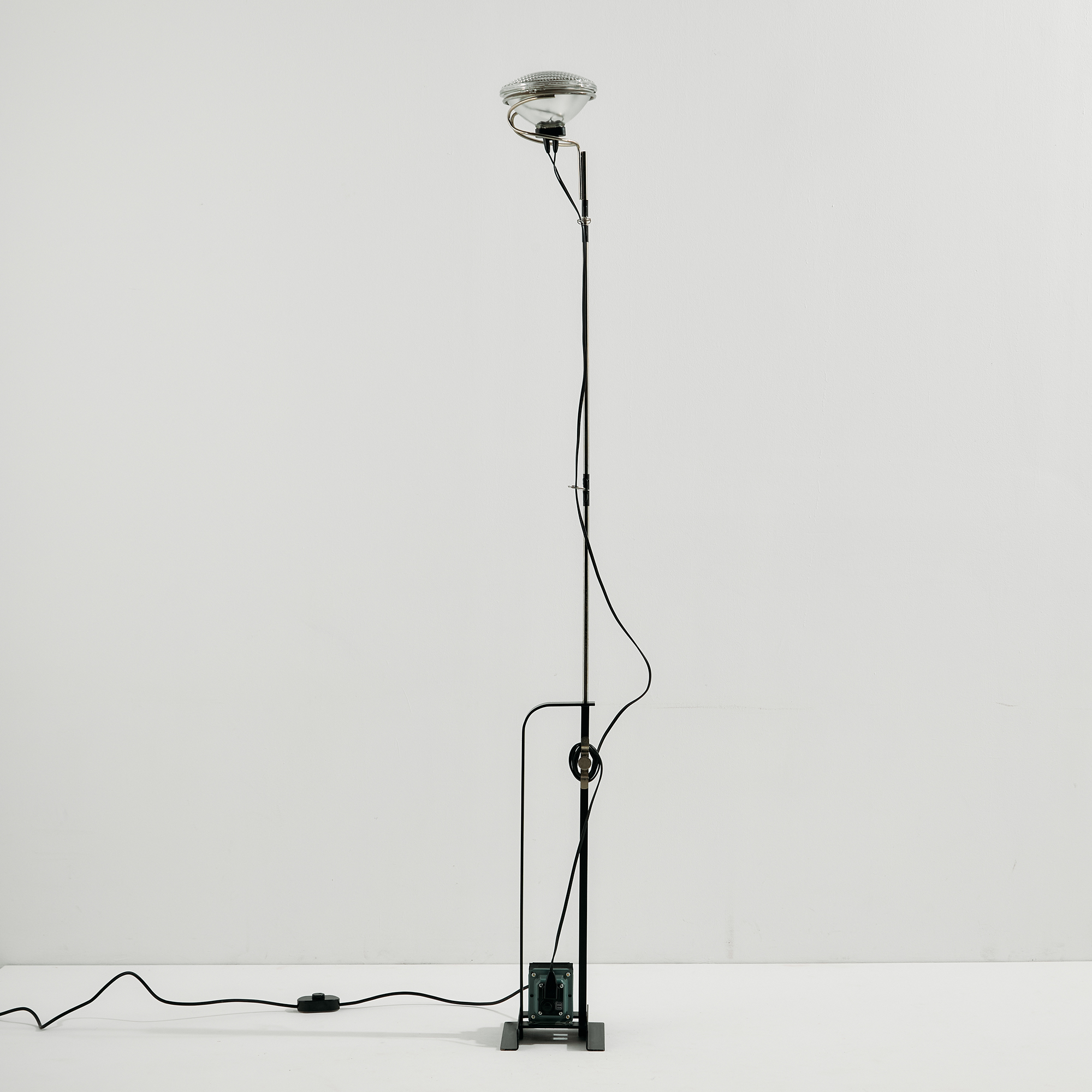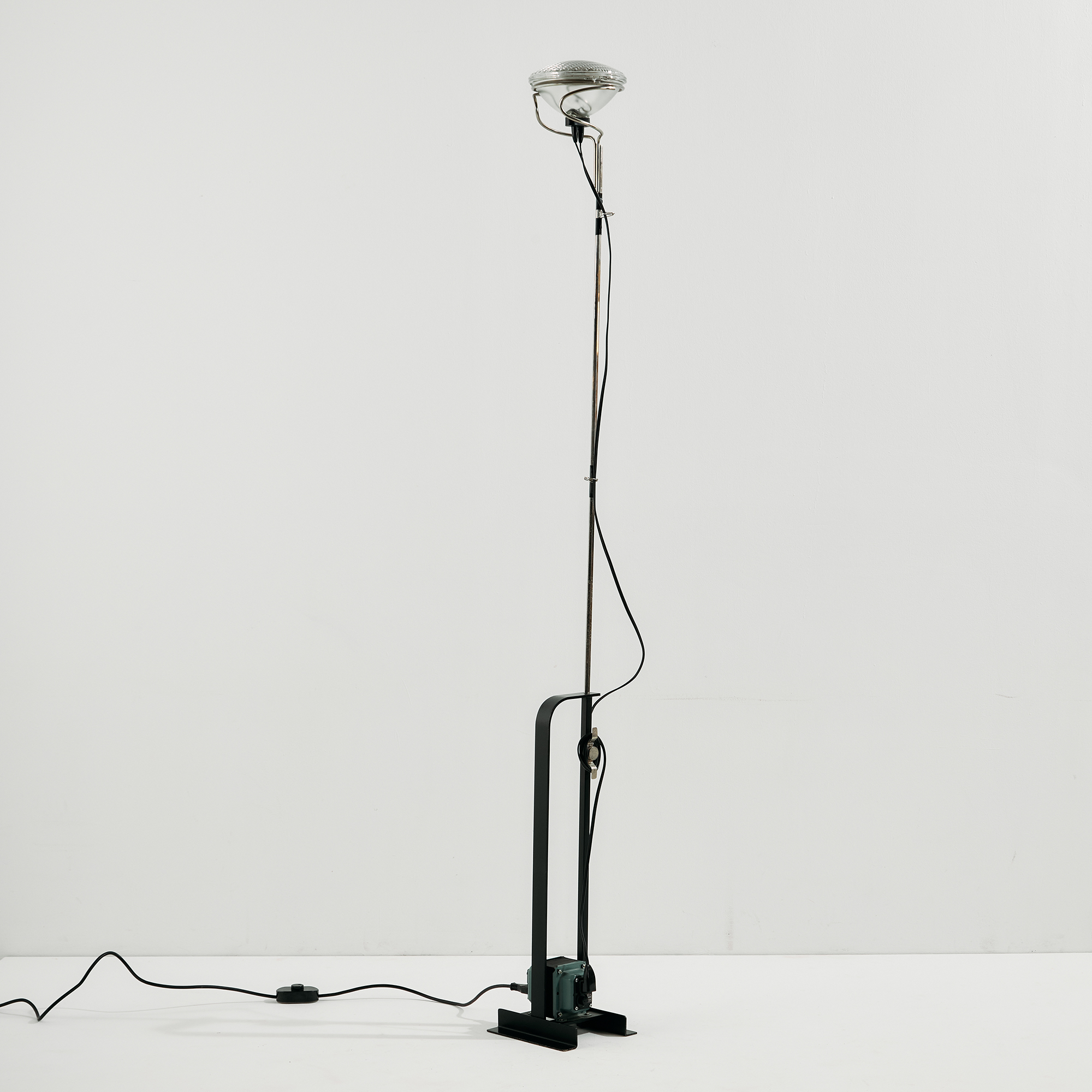 Achille és Pier Giacomo Castiglioni által a Flos számára tervezett ‘Toio’ állólámpa az 1960-as évekből. A lámpa felületén helyenként karcokkal és kopásokkal.