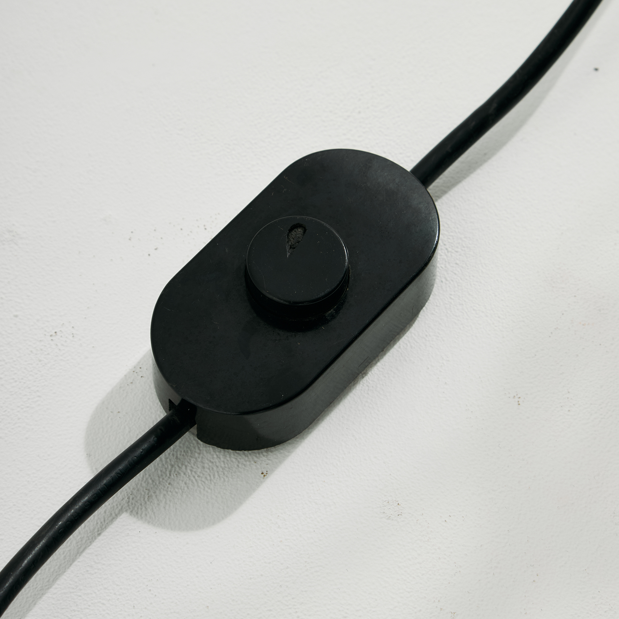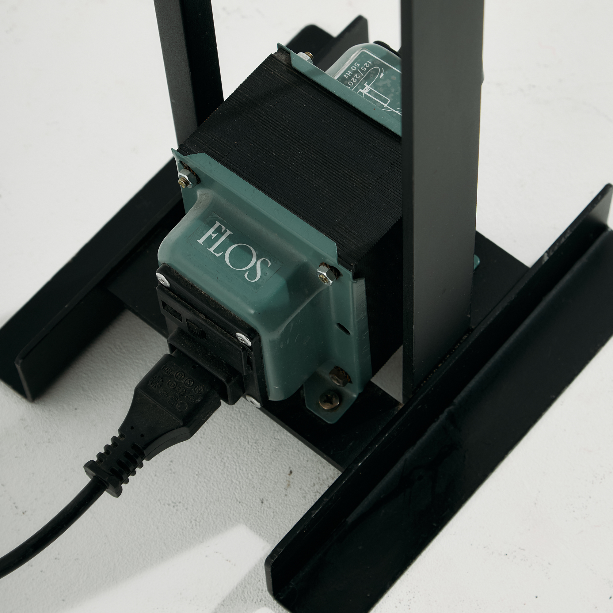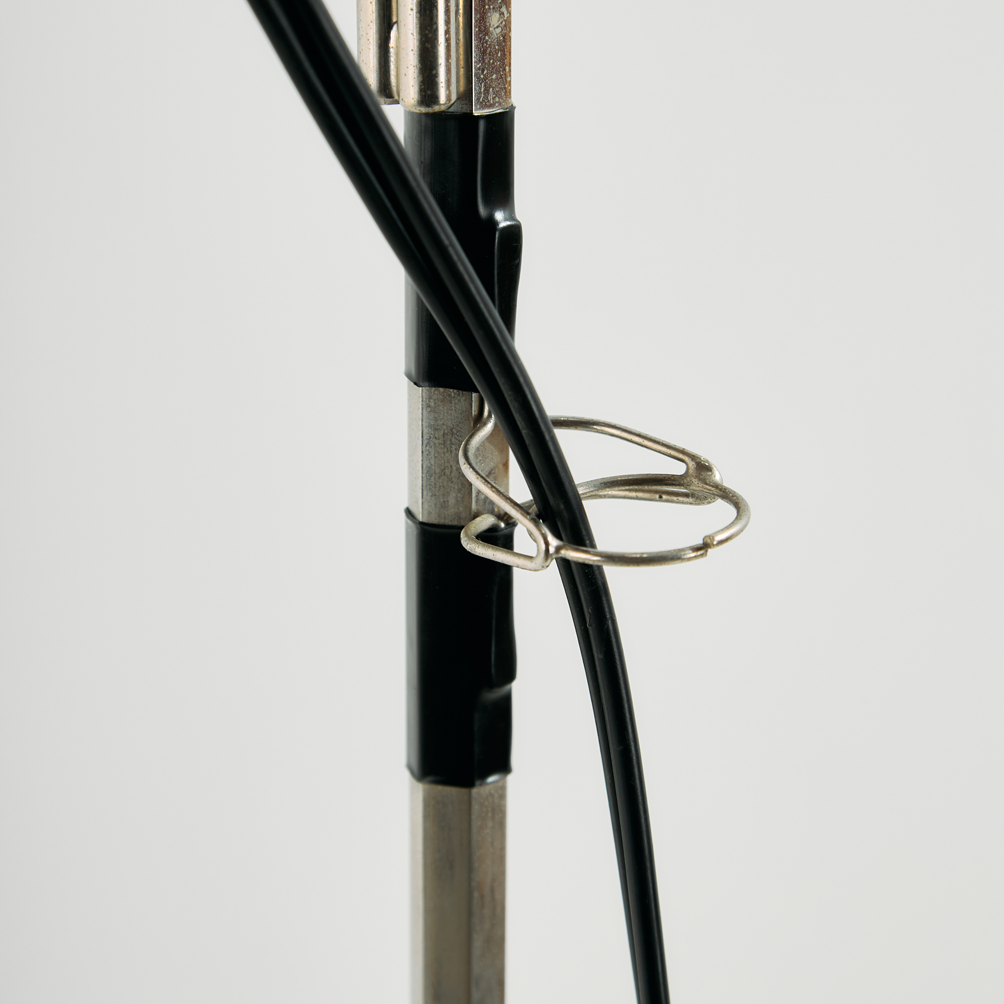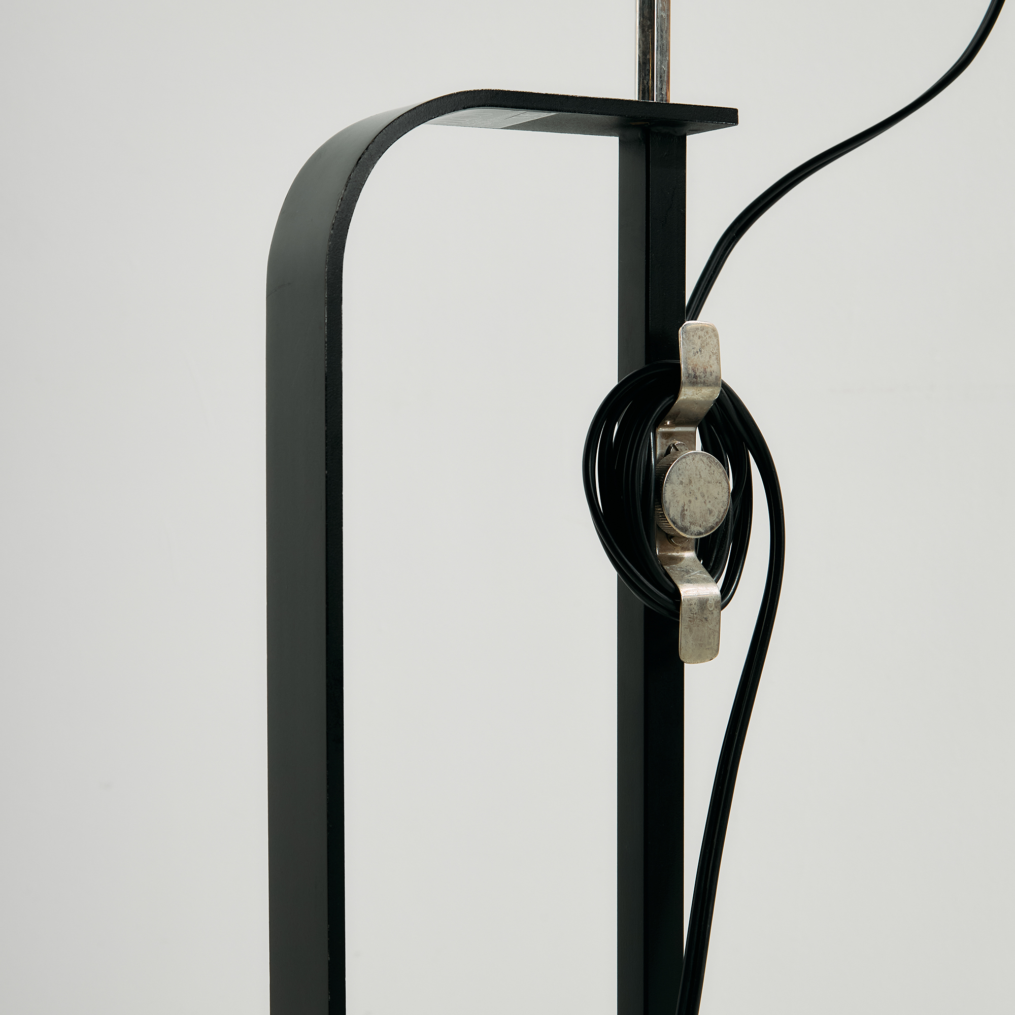 Achille és Pier Giacomo Castiglioni által a Flos számára tervezett ‘Toio’ állólámpa az 1960-as évekből. A lámpa felületén helyenként karcokkal és kopásokkal.