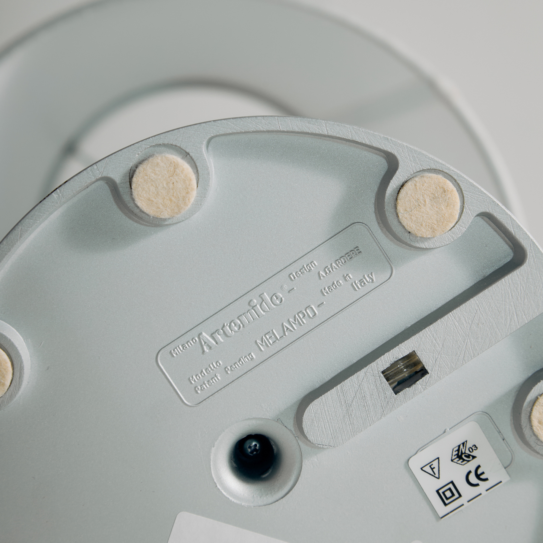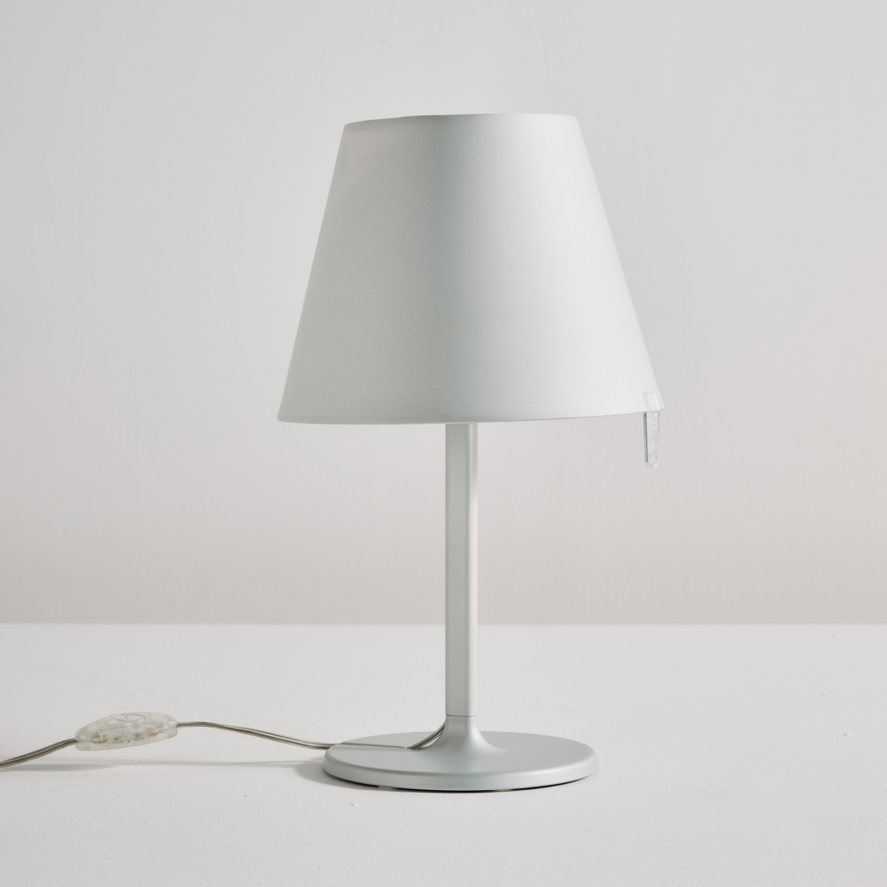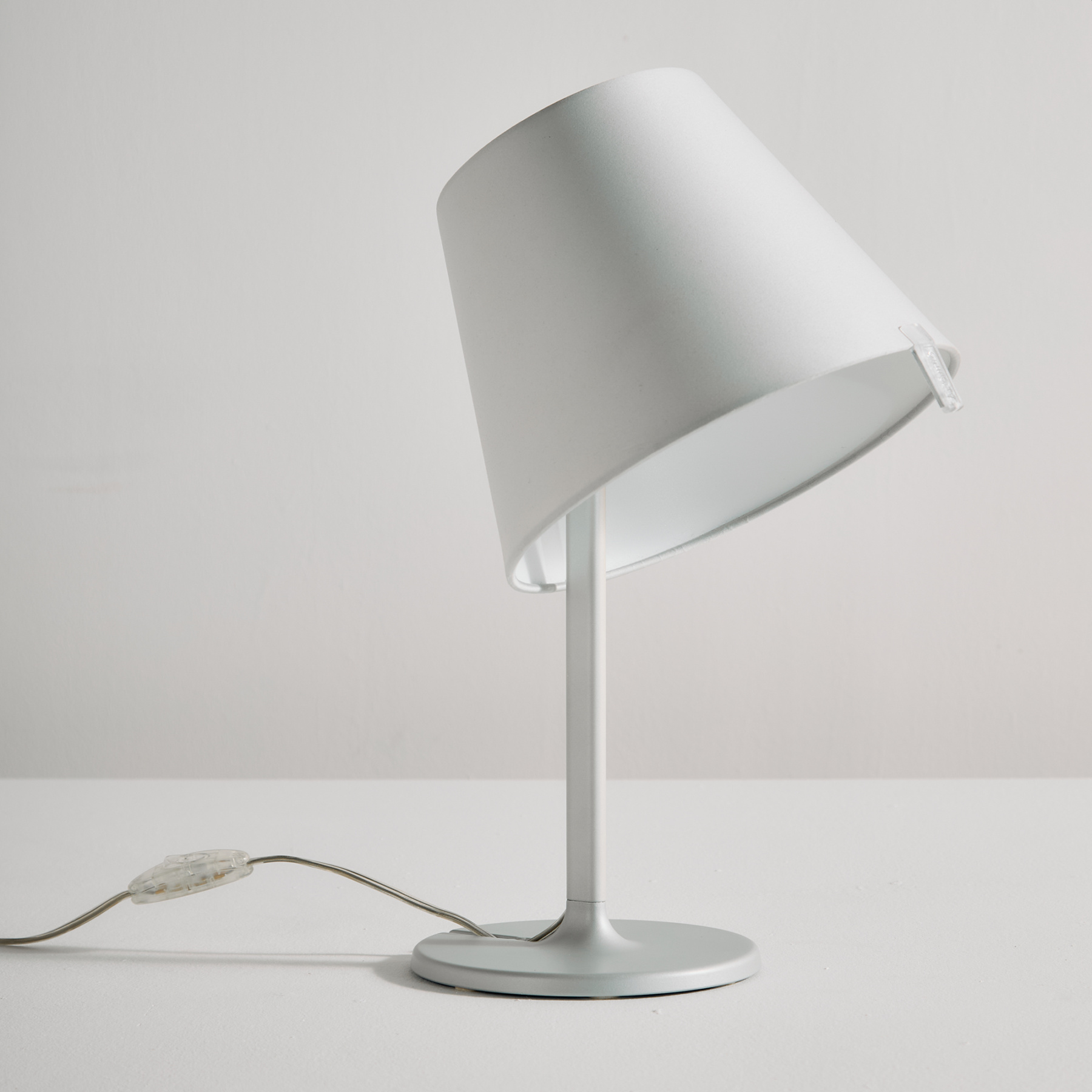 Adrien Gardère által az Artemide számára tervezett ‘Melampo Notte’ asztali lámpa a 2000-es évekből. A lámpa formai kialakításának és anyaghasználatának köszönhetően egyszerre elegáns és időtlen darab, hiszen szerkezete alumíniumból készült és búrája szatén borítással ellátott. Praktikussága a kettő különböző pozícióba állítható lámpabúrában rejlik, így képes a környezet megvilágítására, illetve hangulatvilágításnak is tökéletes. A búra belsejében egy foglalat található, felületén pár folttal.