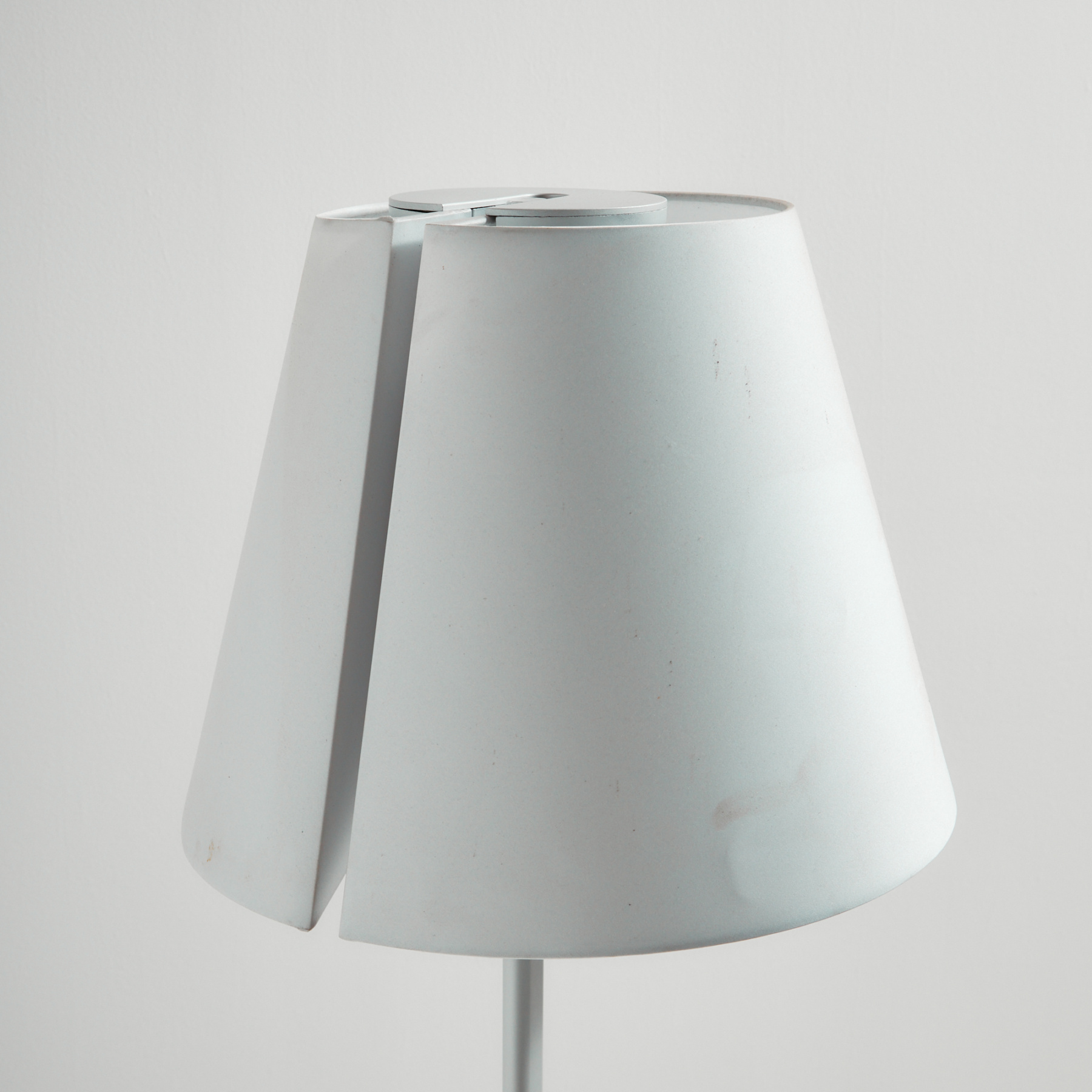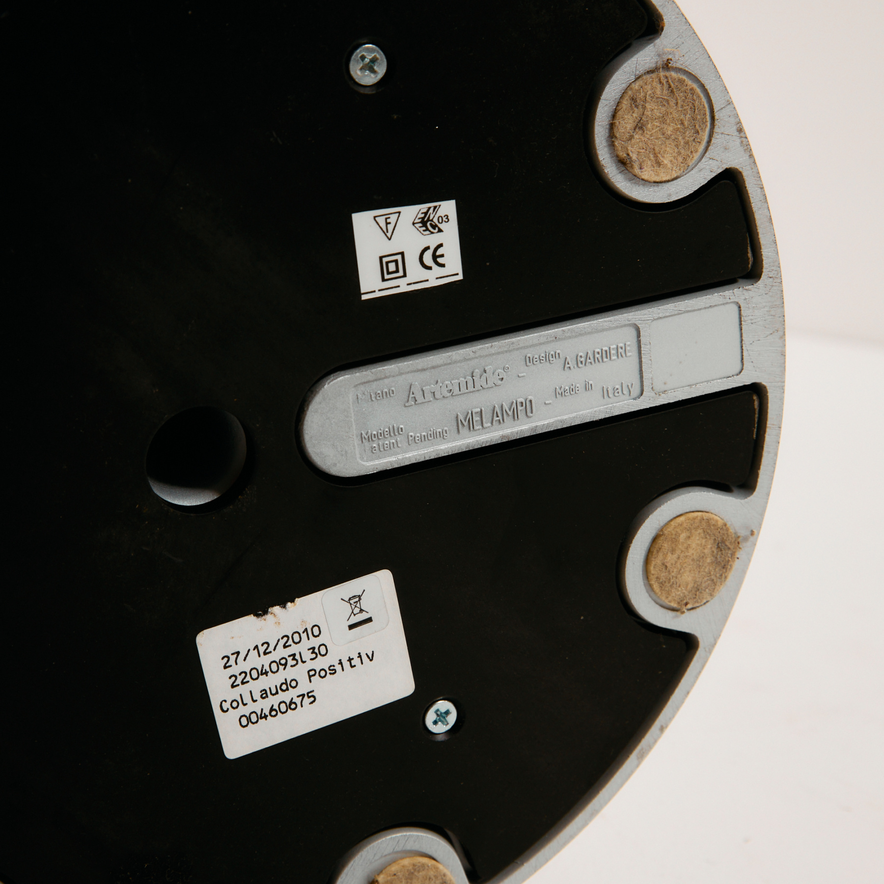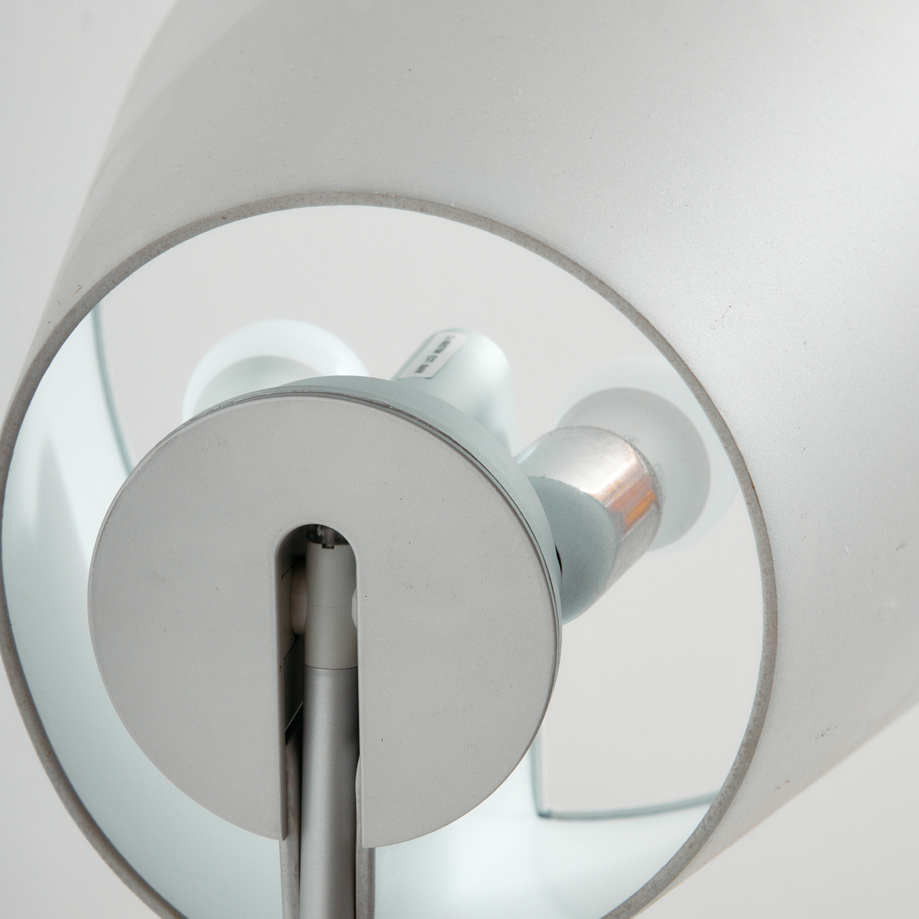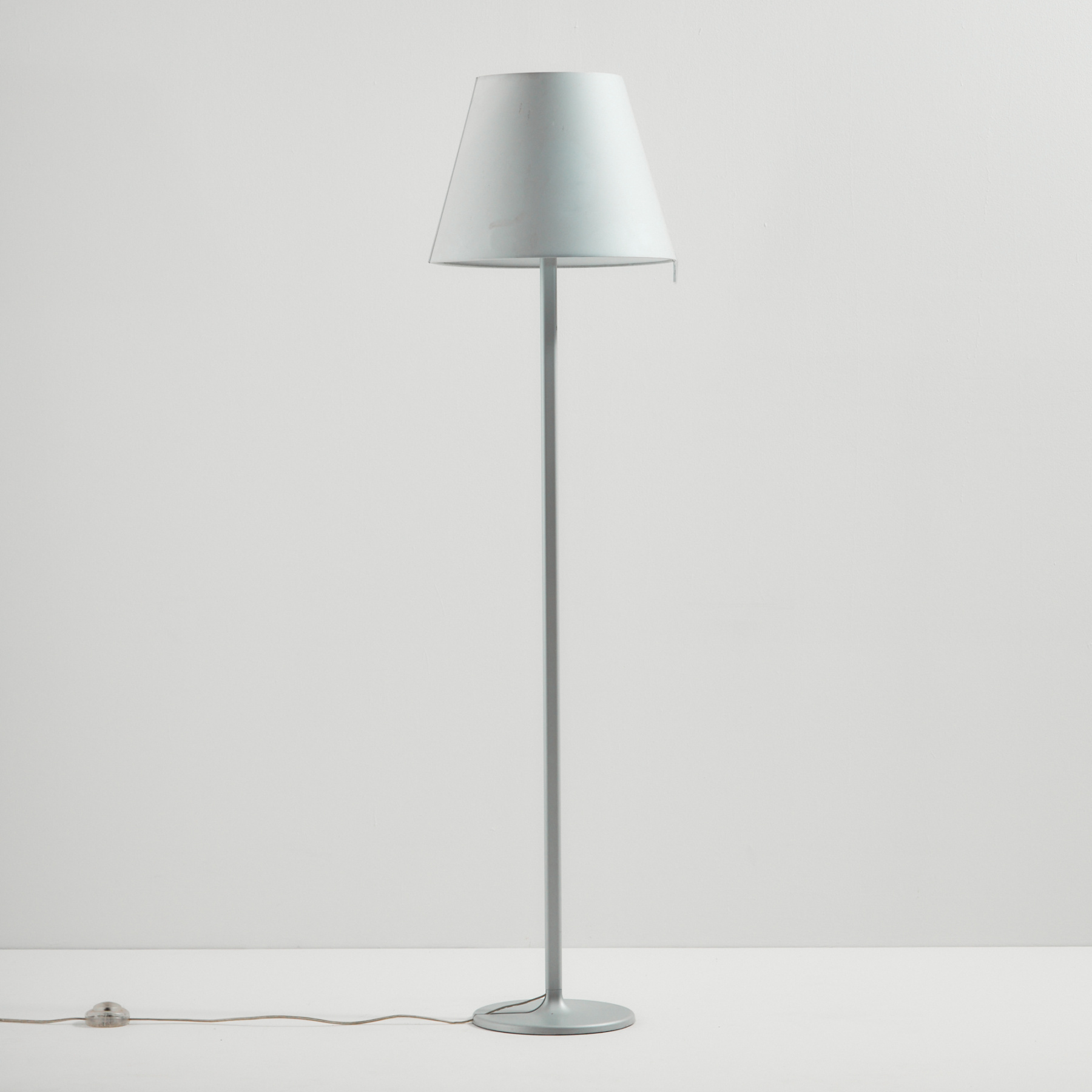 Adrien Gardère által az Artemide számára tervezett ‘Melampo Terra’ állólámpa a 2000-es évekből. A lámpa formai kialakításának és anyaghasználatának köszönhetően egyszerre elegáns és időtlen darab, hiszen szerkezete alumíniumból készült és búrája szatén borítással ellátott. Praktikussága a három különböző pozícióba állítható lámpabúrában rejlik, így képes a környezet megvilágítására, illetve hangulatvilágításnak is tökéletes. A búra belsejében két foglalat található. Felületén helyenként karcokkal, foltokkal és kopásokkal.