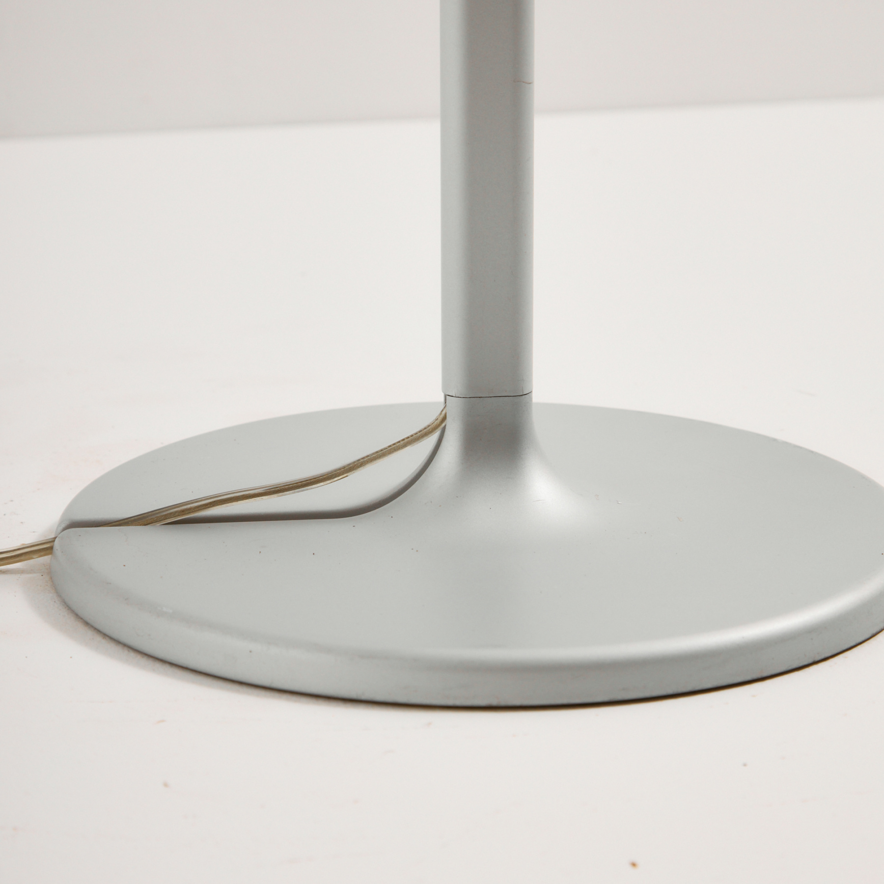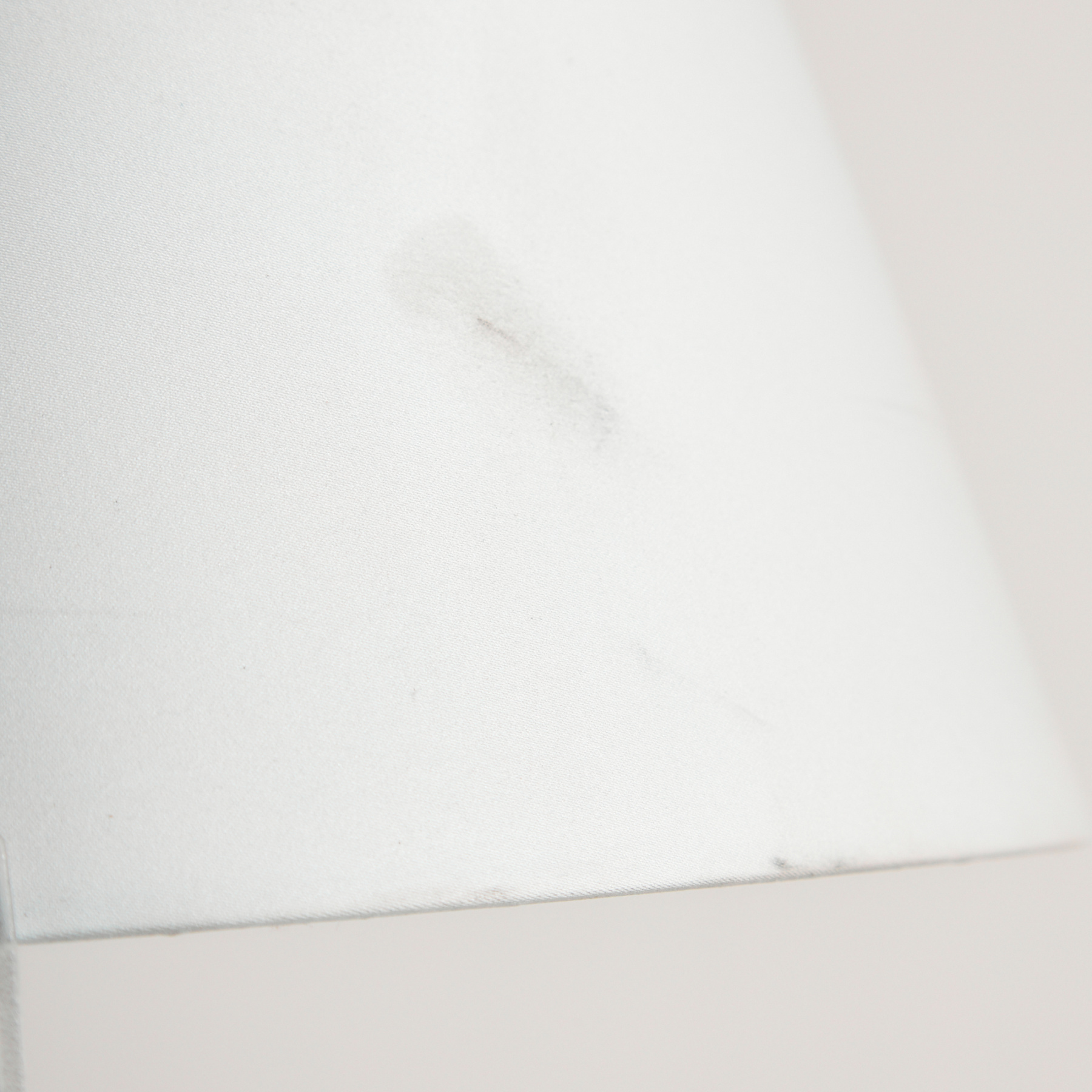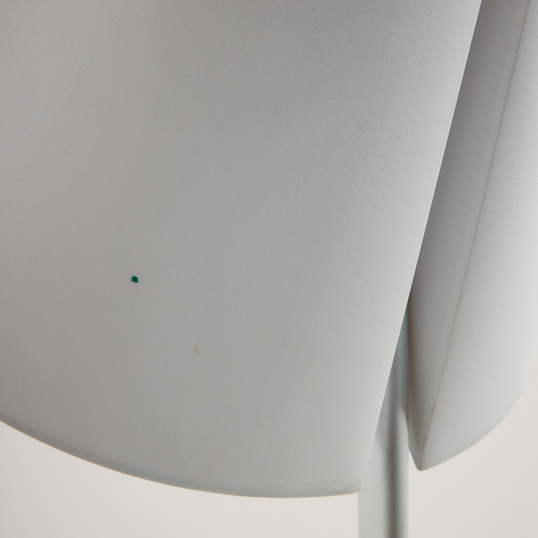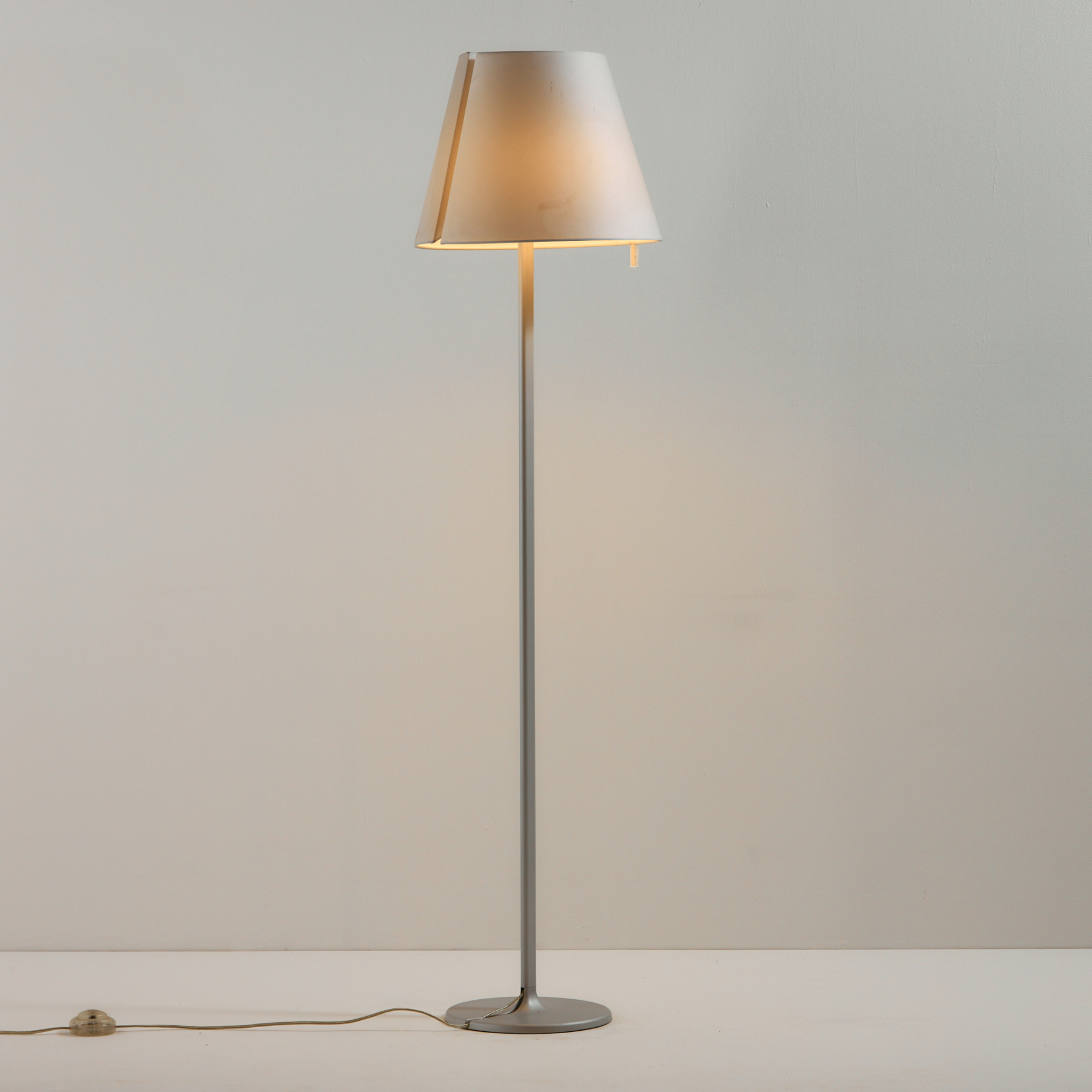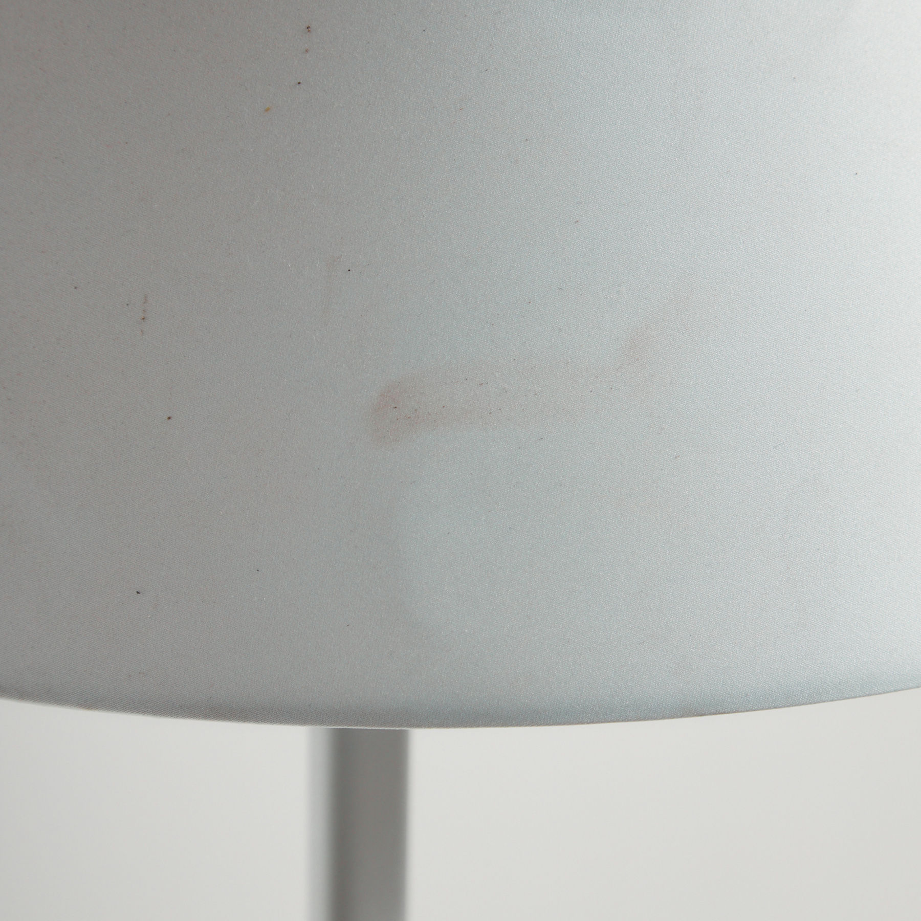 Adrien Gardère által az Artemide számára tervezett ‘Melampo Terra’ állólámpa a 2000-es évekből. A lámpa formai kialakításának és anyaghasználatának köszönhetően egyszerre elegáns és időtlen darab, hiszen szerkezete alumíniumból készült és búrája szatén borítással ellátott. Praktikussága a három különböző pozícióba állítható lámpabúrában rejlik, így képes a környezet megvilágítására, illetve hangulatvilágításnak is tökéletes. A búra belsejében két foglalat található. Felületén helyenként karcokkal, foltokkal és kopásokkal.
