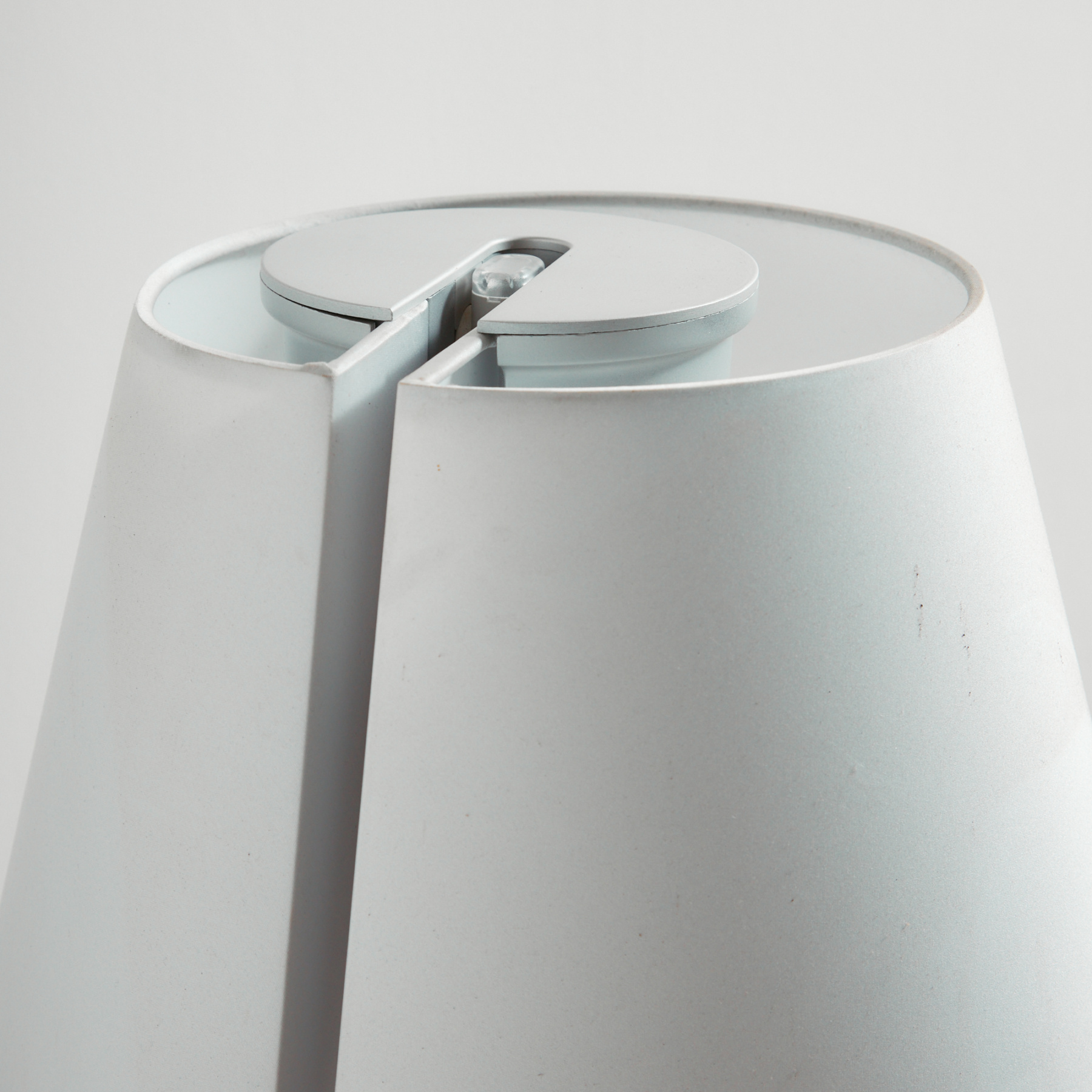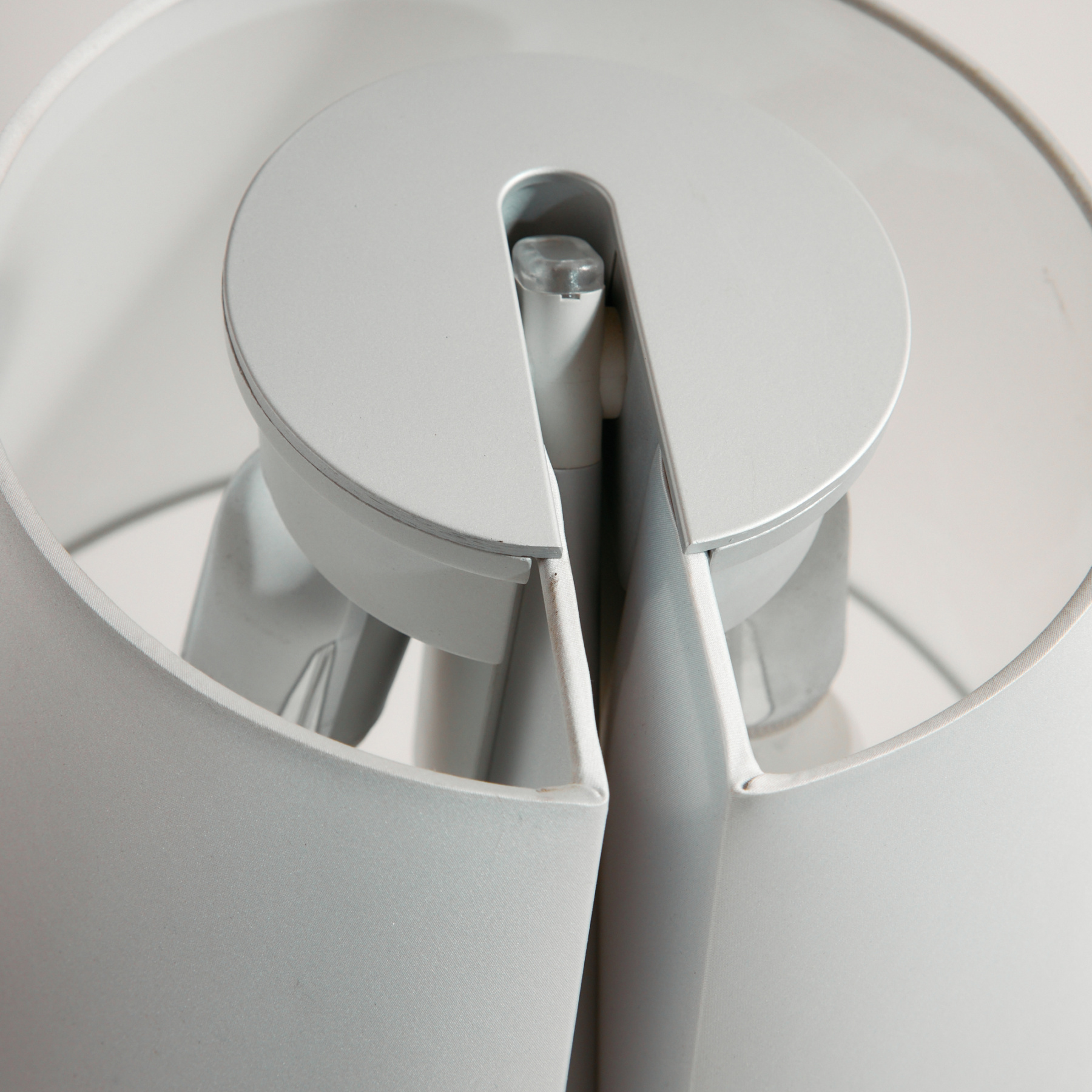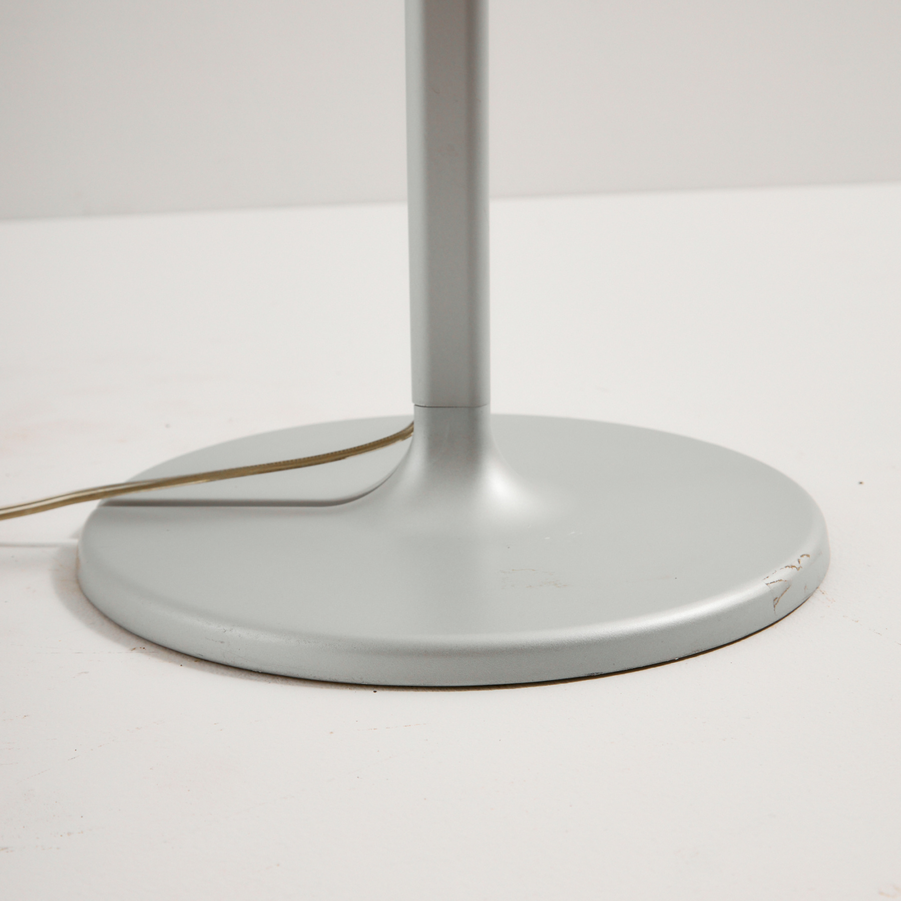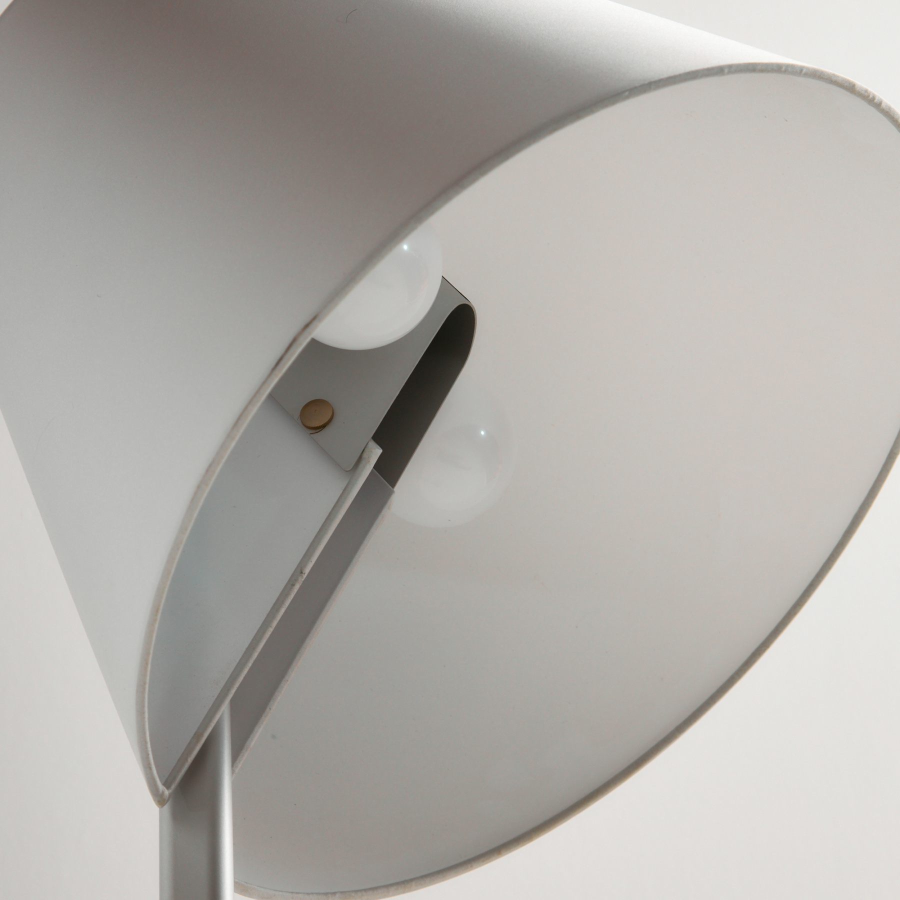 Adrien Gardère által az Artemide számára tervezett ‘Melampo Terra’ állólámpa a 2000-es évekből. A lámpa formai kialakításának és anyaghasználatának köszönhetően egyszerre elegáns és időtlen darab, hiszen szerkezete alumíniumból készült és búrája szatén borítással ellátott. Praktikussága a három különböző pozícióba állítható lámpabúrában rejlik, így képes a környezet megvilágítására, illetve hangulatvilágításnak is tökéletes. A búra belsejében két foglalat található. Felületén helyenként karcokkal, foltokkal és kopásokkal.