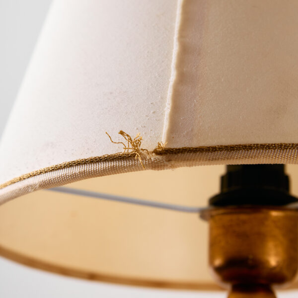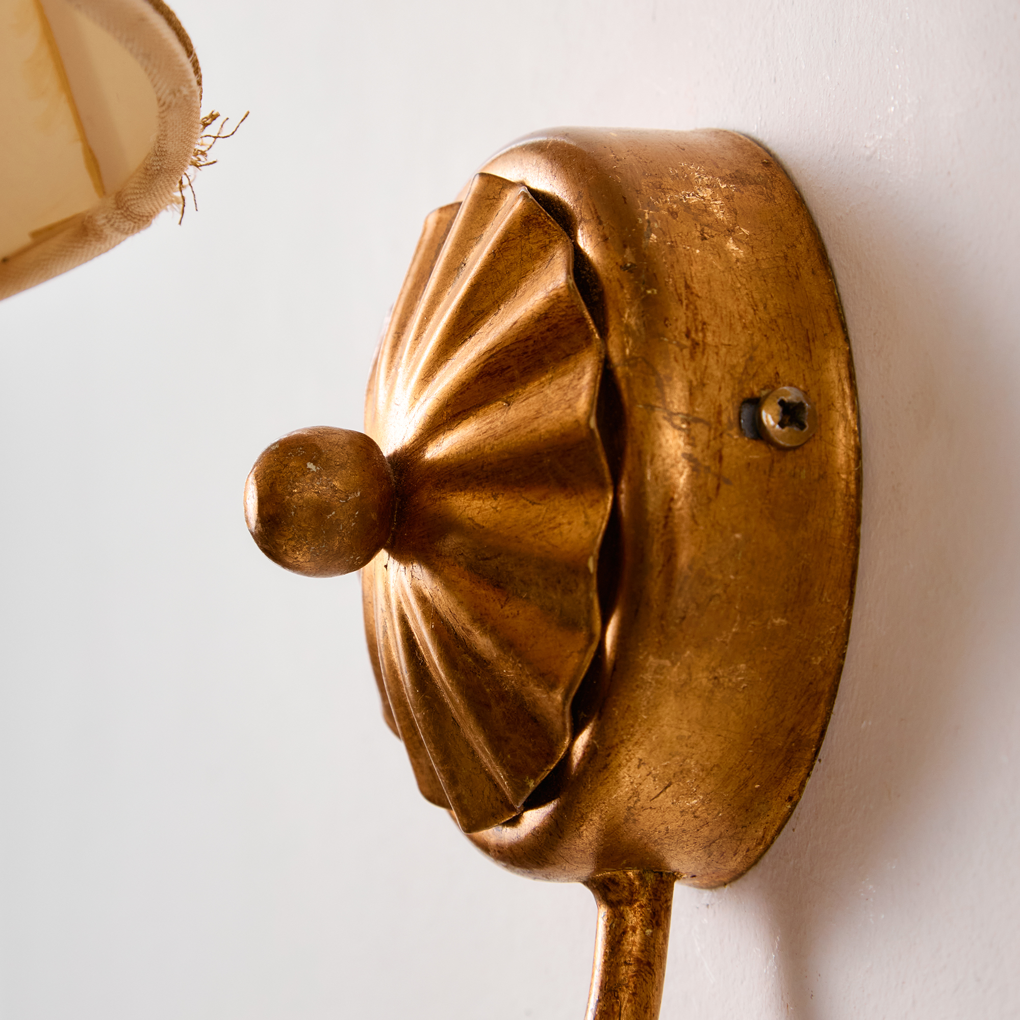 Aranyra festett fali lámpa textil búrával az 1970-es évekből. Az lámpa szára organikus díszítéssel ellátott, melynek mérete változó. A lámpa felületén helyenként karcokkal, foltokkal és kopásokkal, használatból adódó nyomokkal.
