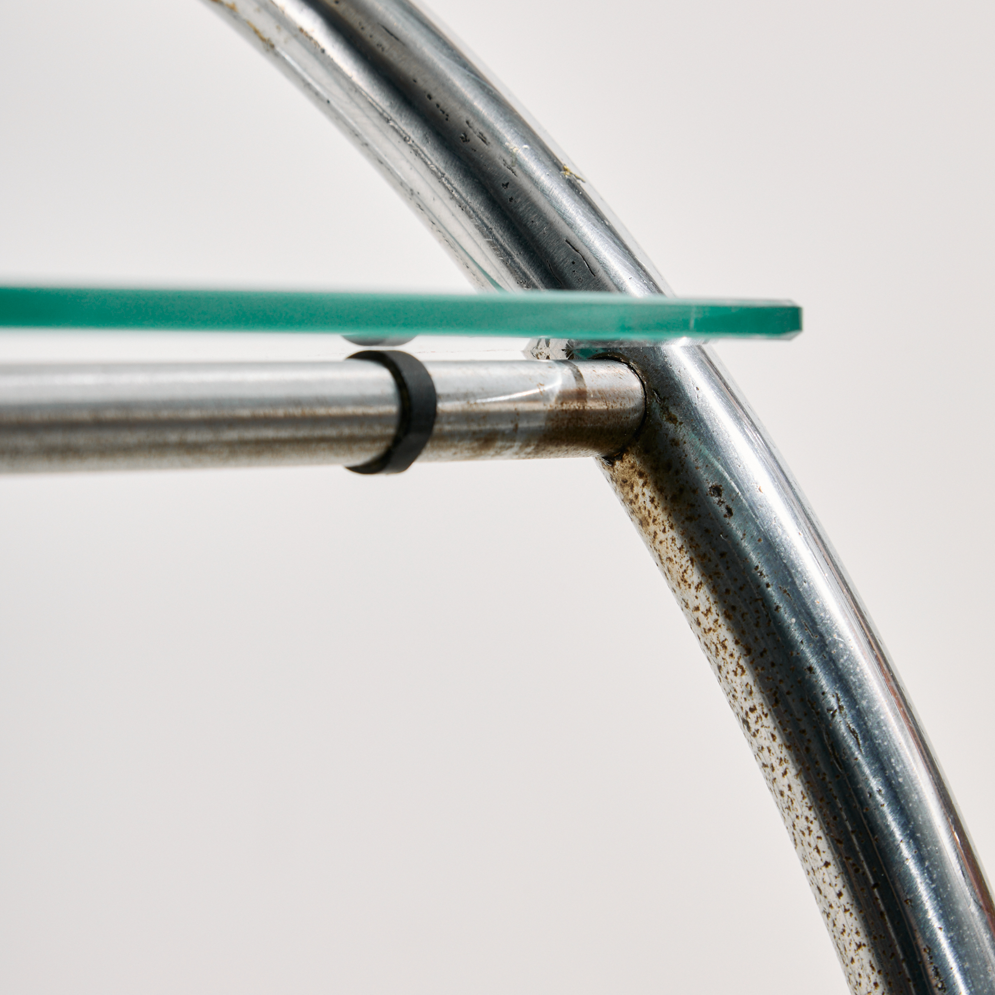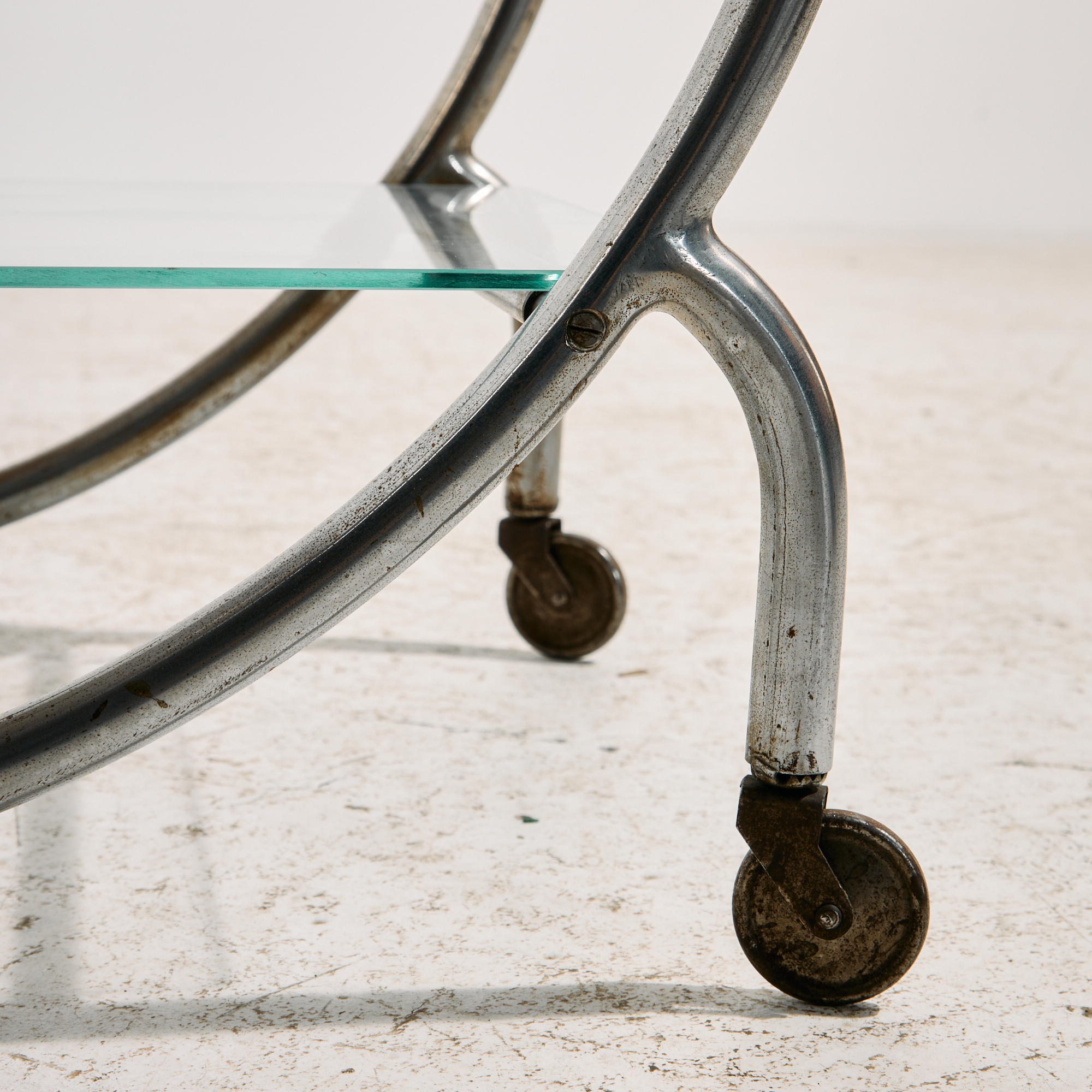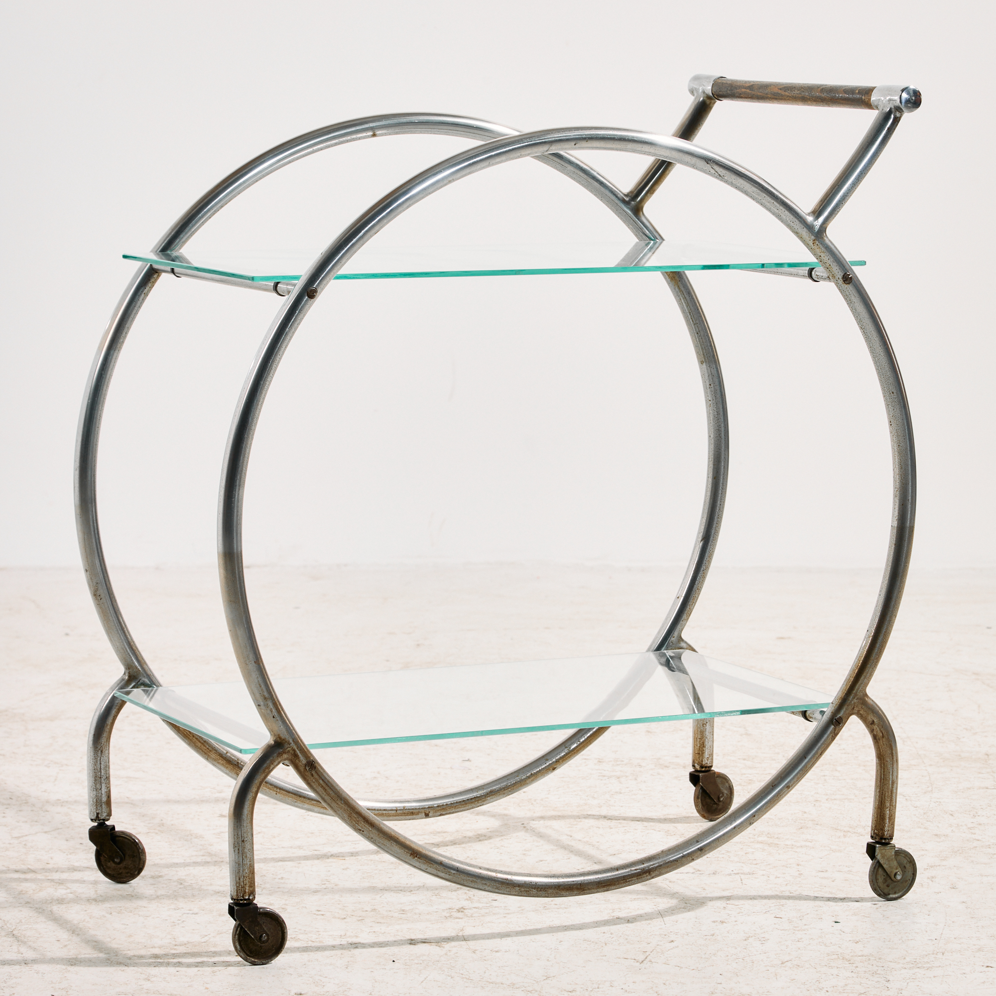 Egy igazán letisztult art deco darab az 1930-as évekből, ami hűen tükrözi a korszak formavilágát és anyaghasználatát. A krómozott zsúrkocsi üvegpolcokkal, fabetétes fogantyúval és négy kerékkel ellátott. Egy igazán sokoldalú darab, ami stílusos megoldást kínál a kedvenc ételeid és italaid tárolására és mozgatására. Felületén helyenként rozsdával, karcokkal és kopásokkal.