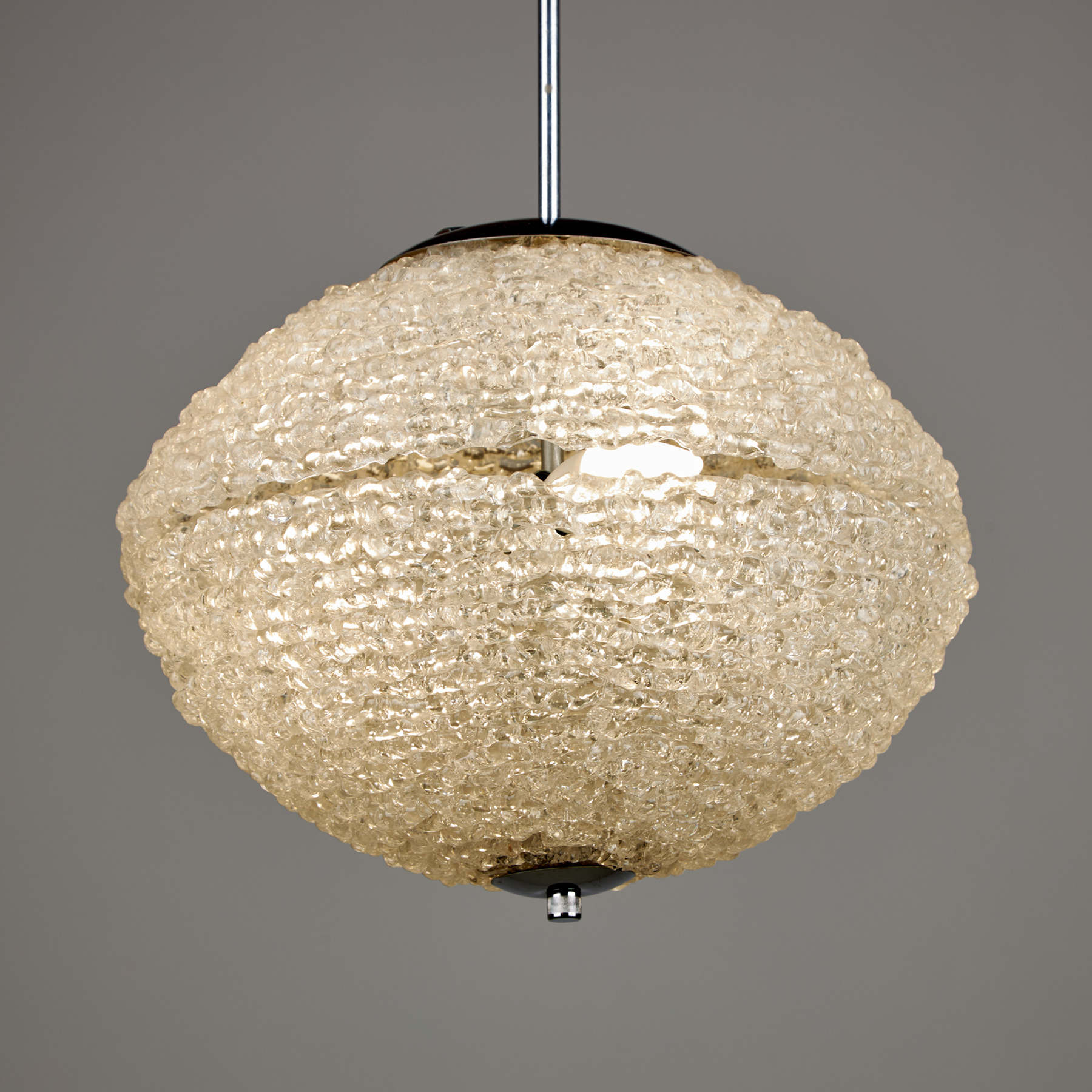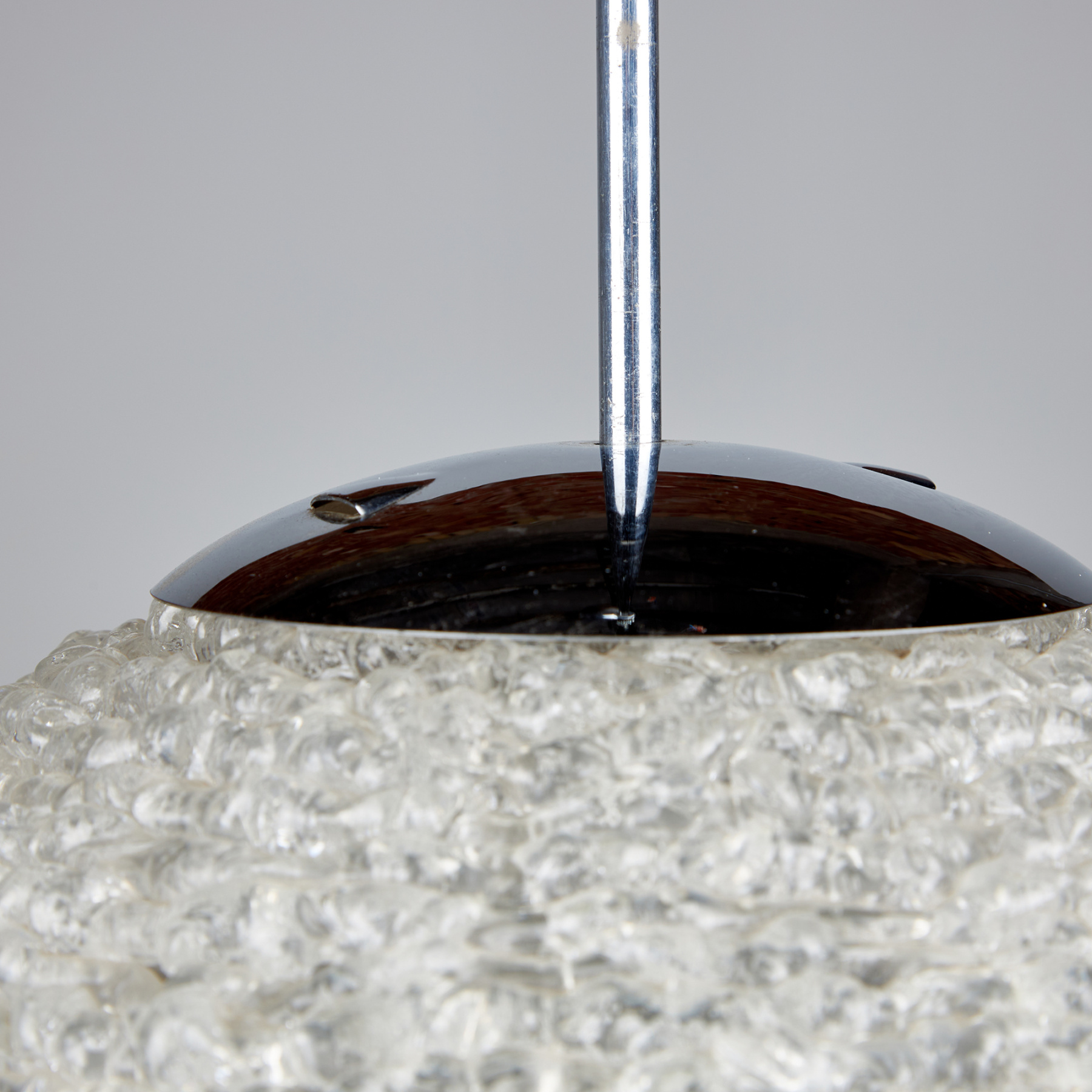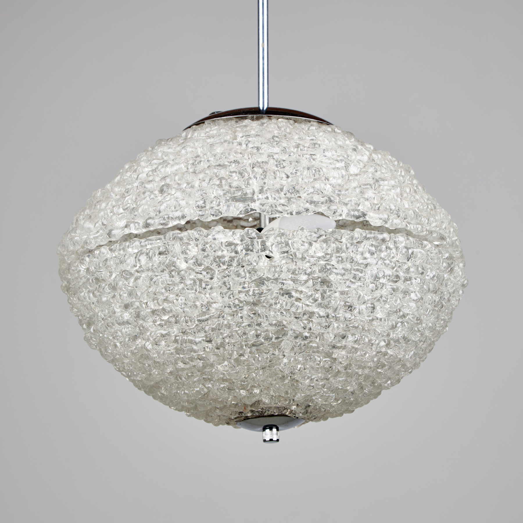 Szépen texturált műanyag gömb búrás Austrolux függeszték krómozott részletekkel az 1960-as évekből. A lámpa felületén helyenként felületi karcokkal és kopásokkal.