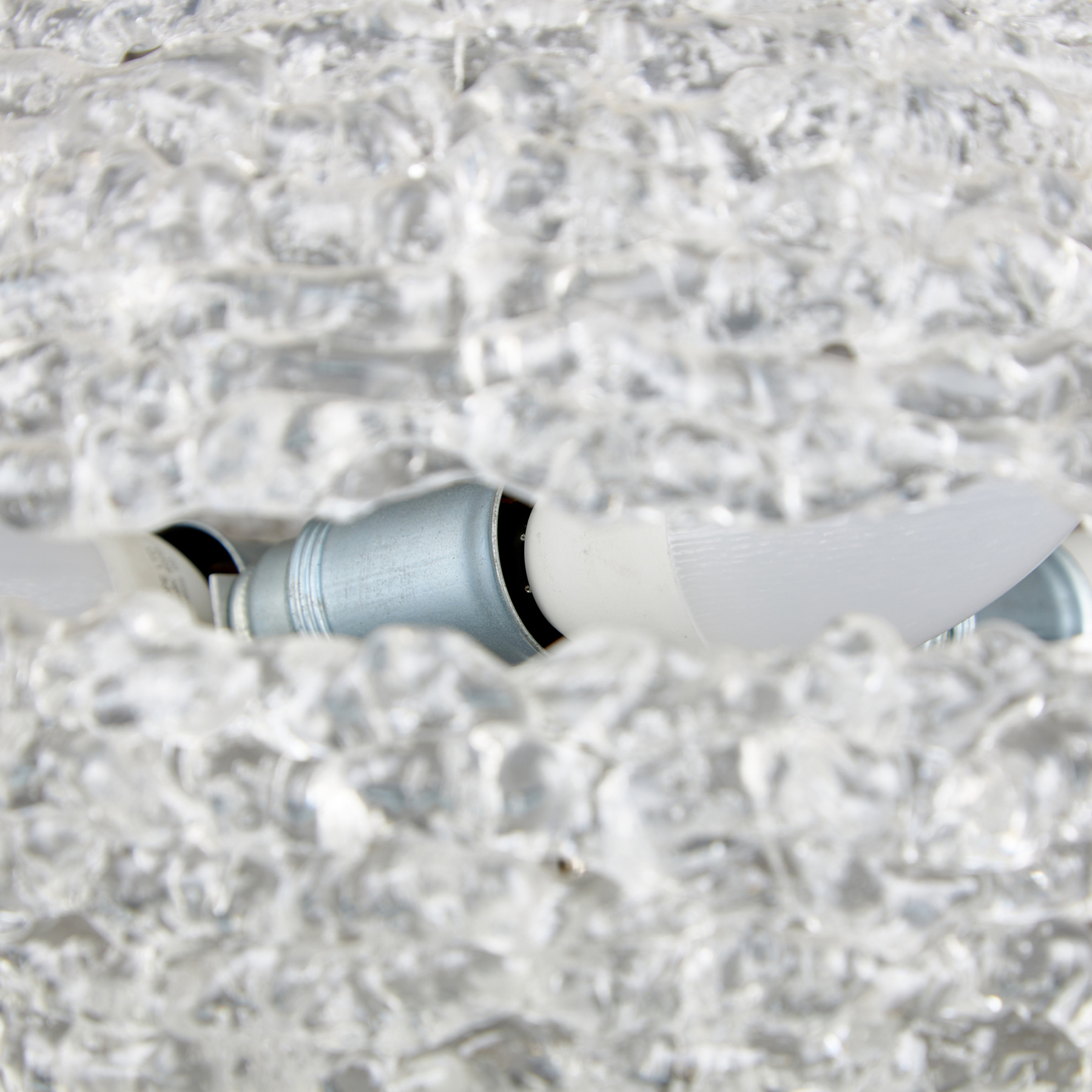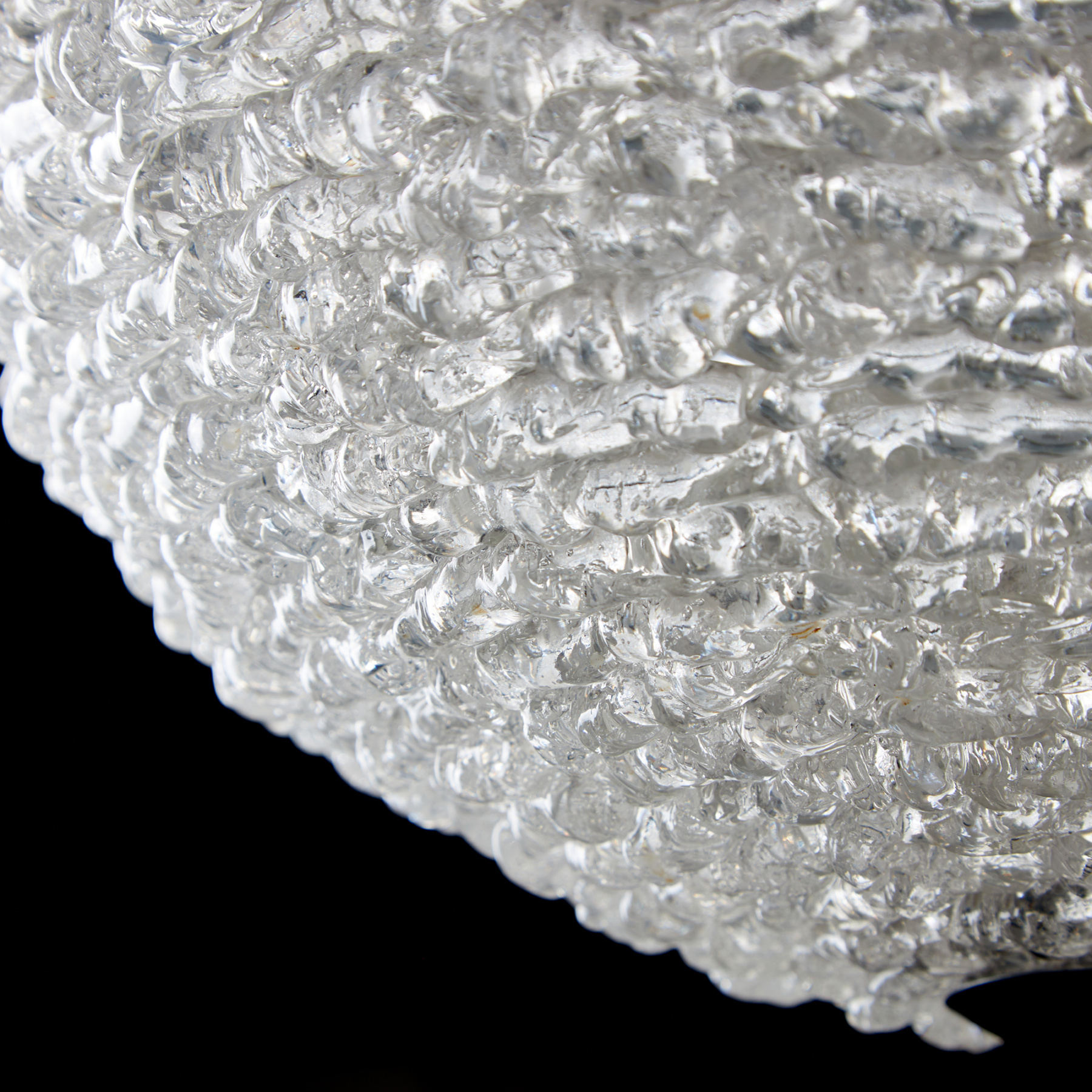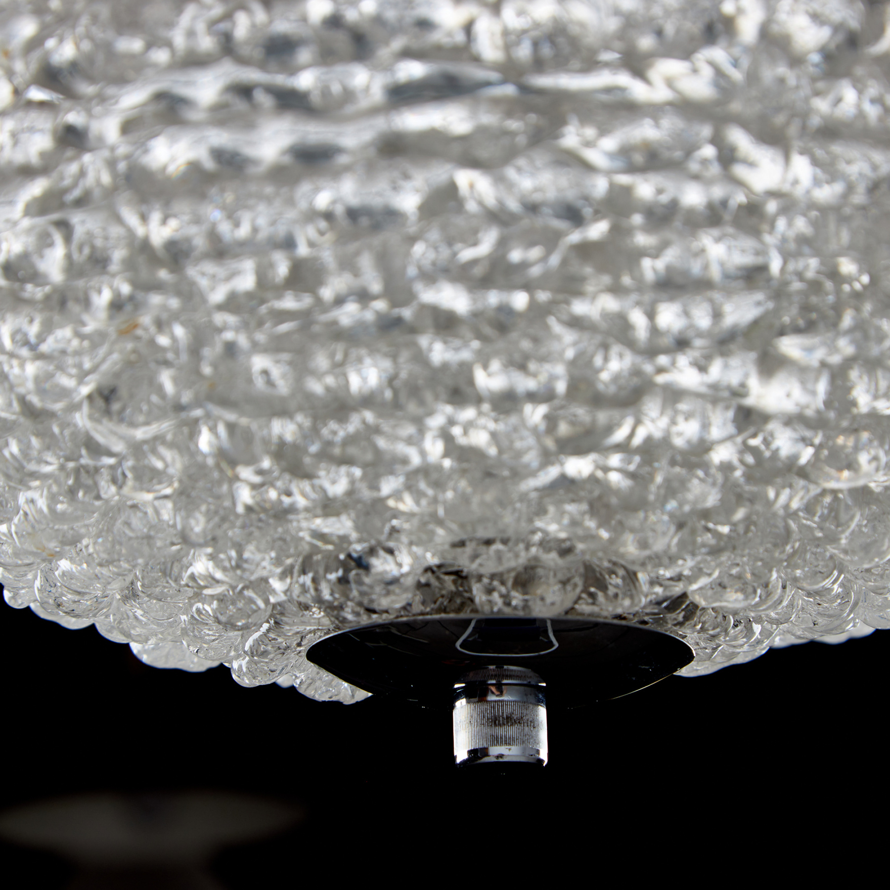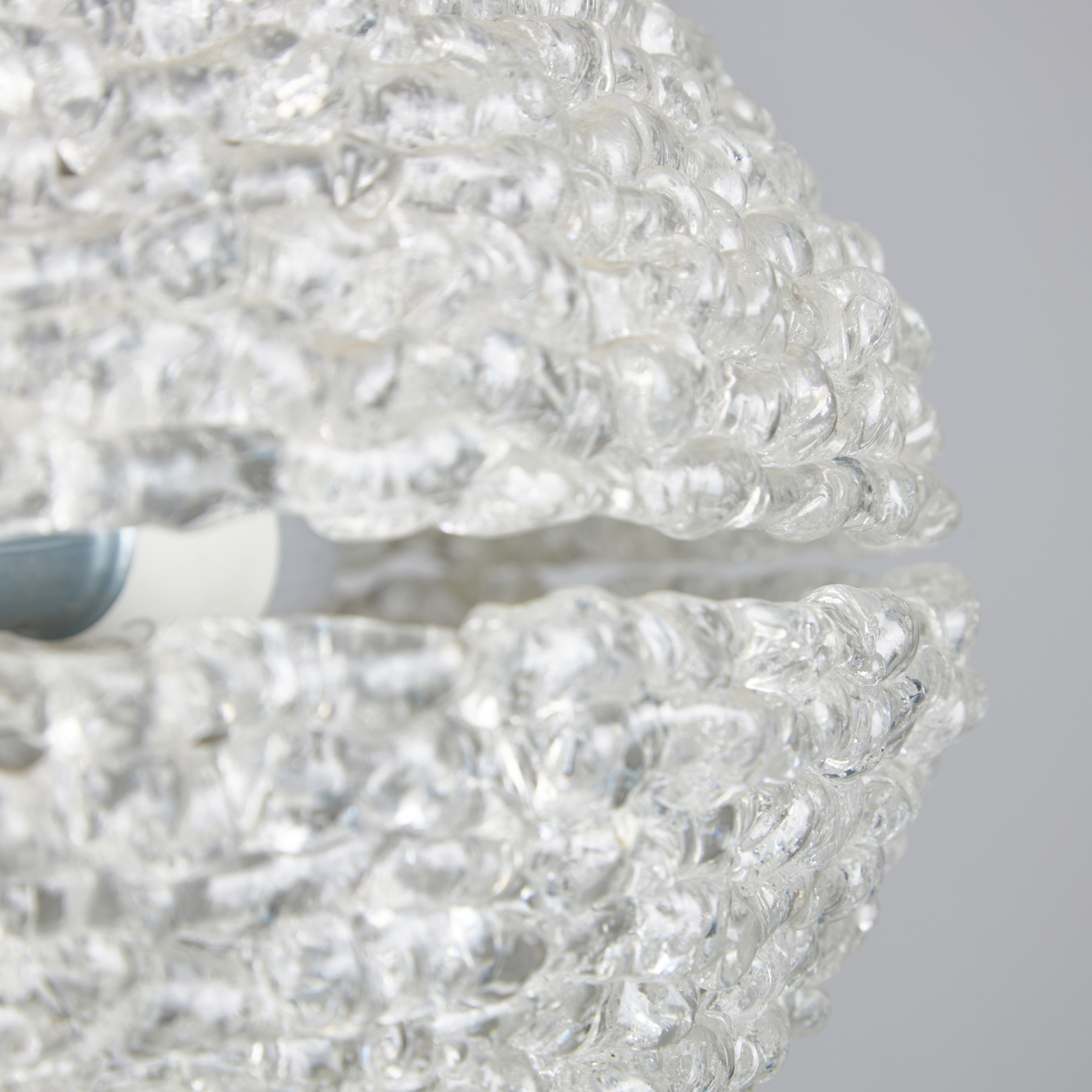 Szépen texturált műanyag gömb búrás Austrolux függeszték krómozott részletekkel az 1960-as évekből. A lámpa felületén helyenként felületi karcokkal és kopásokkal.