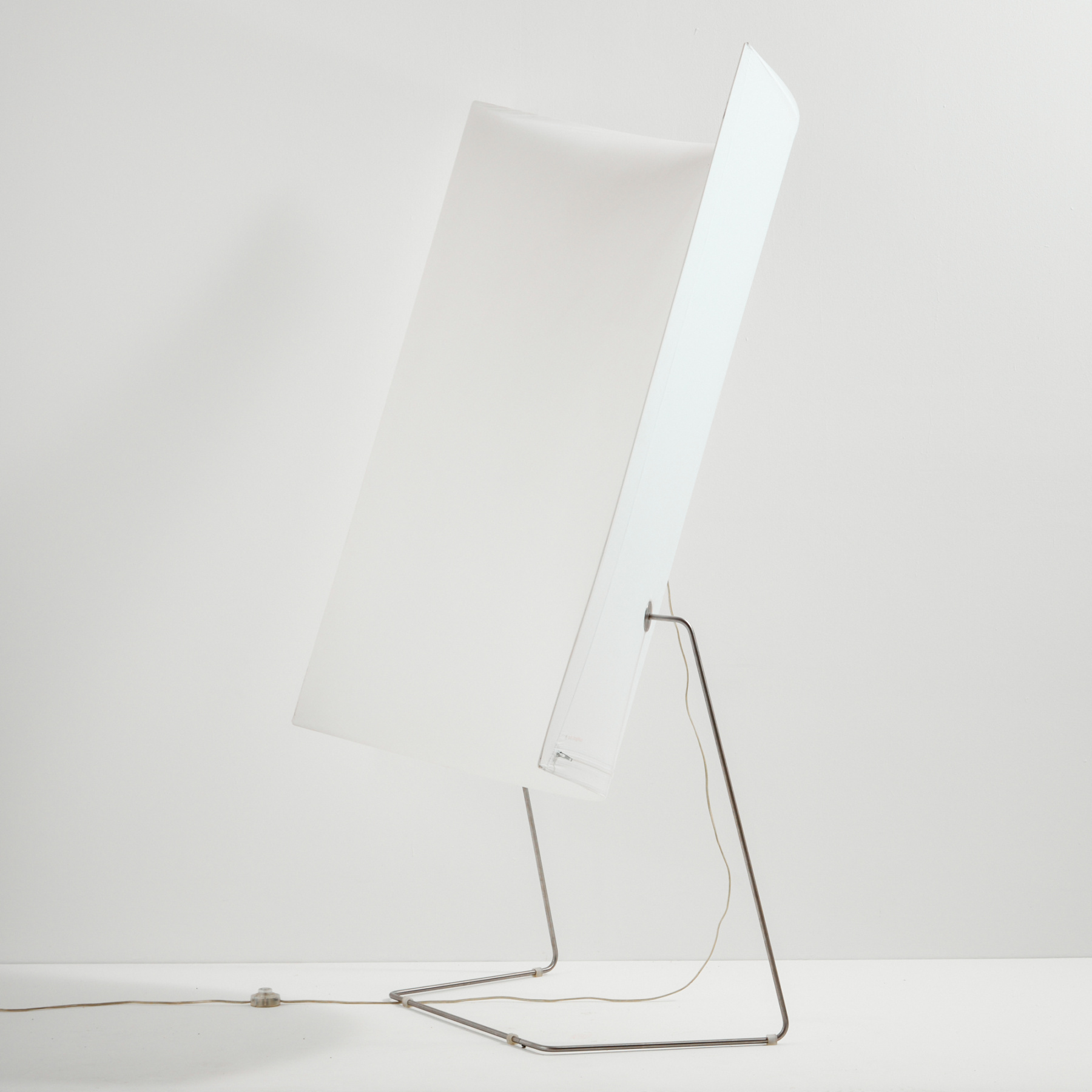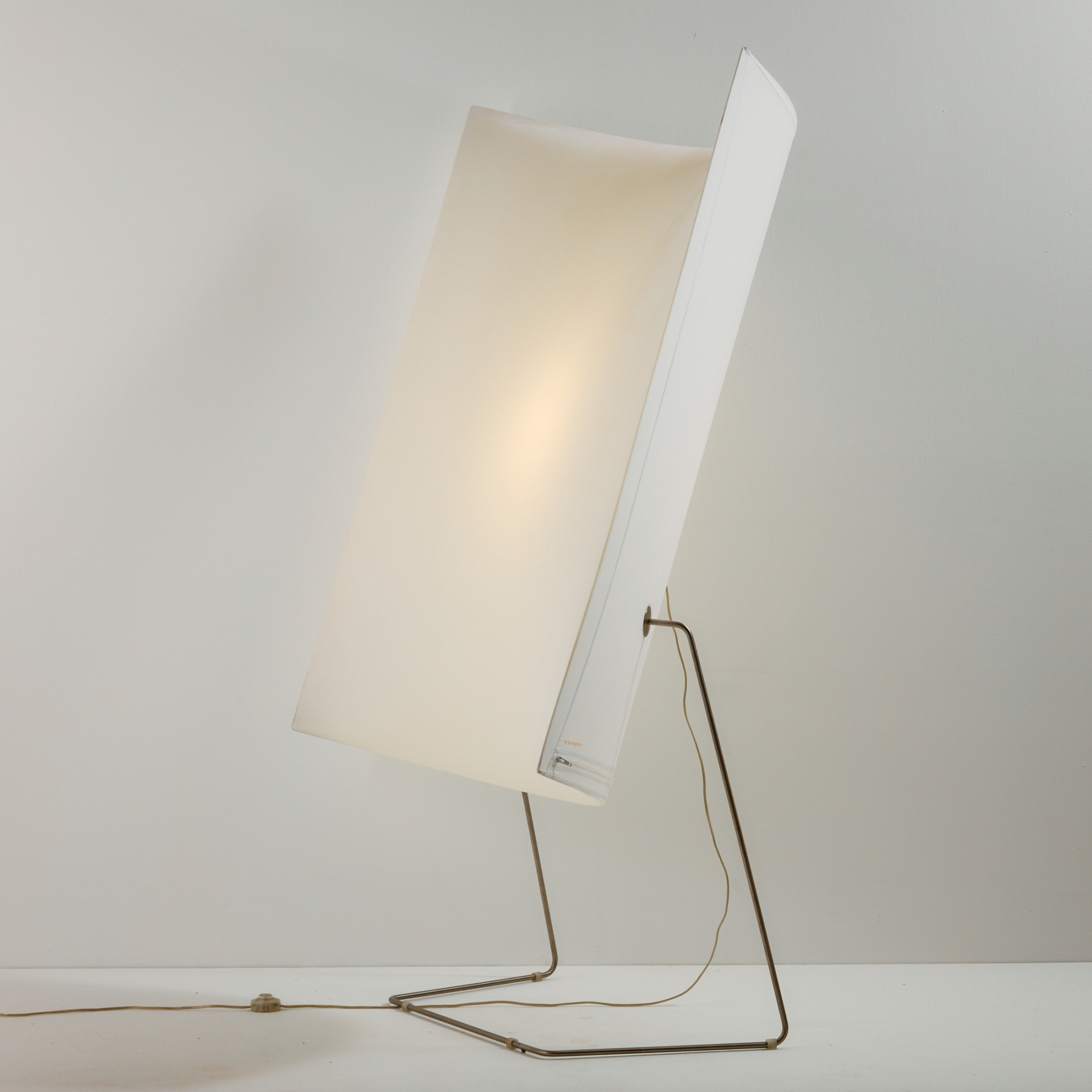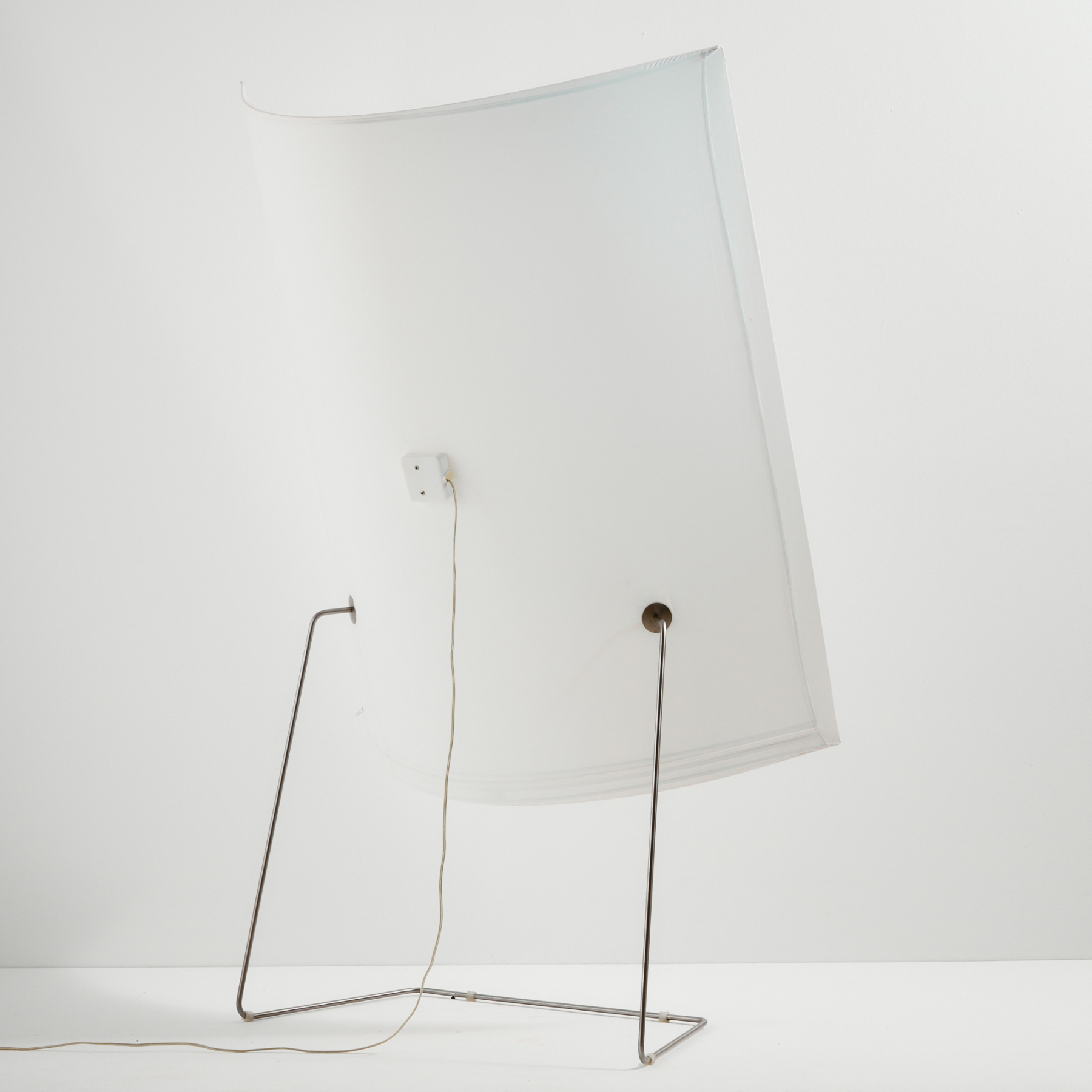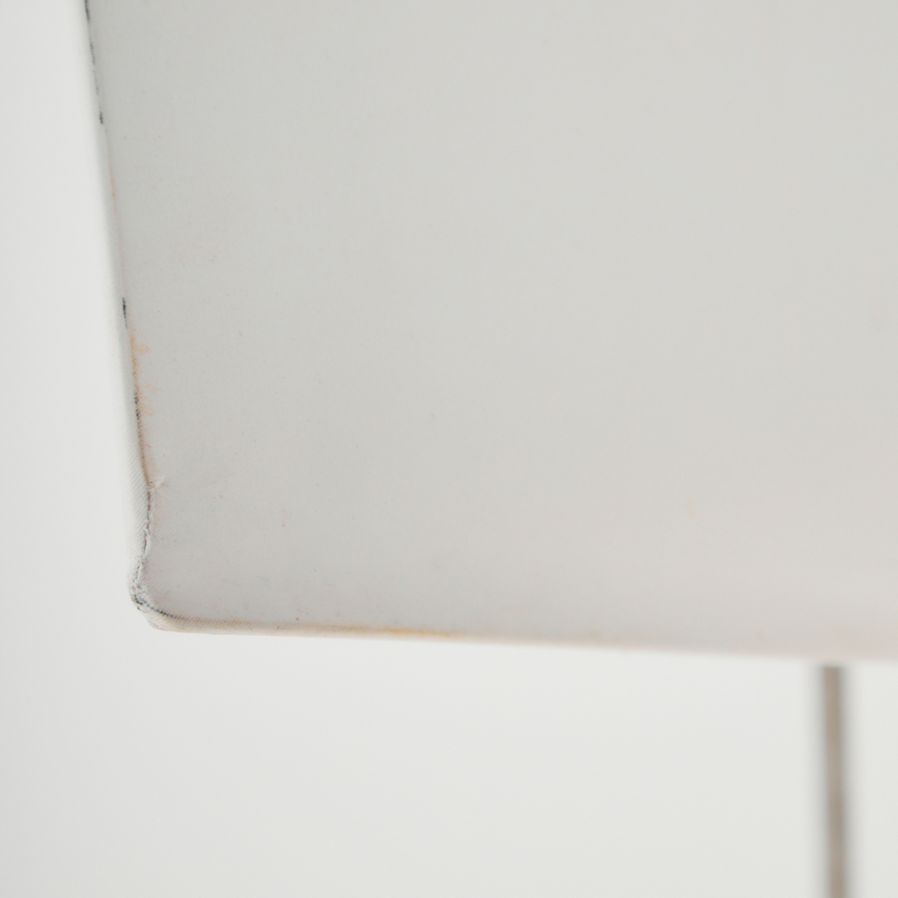 A Bakery Group által a Prandina számára tervezett ‘Model 44F’ állólámpa a 2000-es évekből. A lámpa hatalmas, feszített textil búrával és acél lábazattal ellátott. Felületén helyenként karcokkal, foltokkal és kopásokkal.
