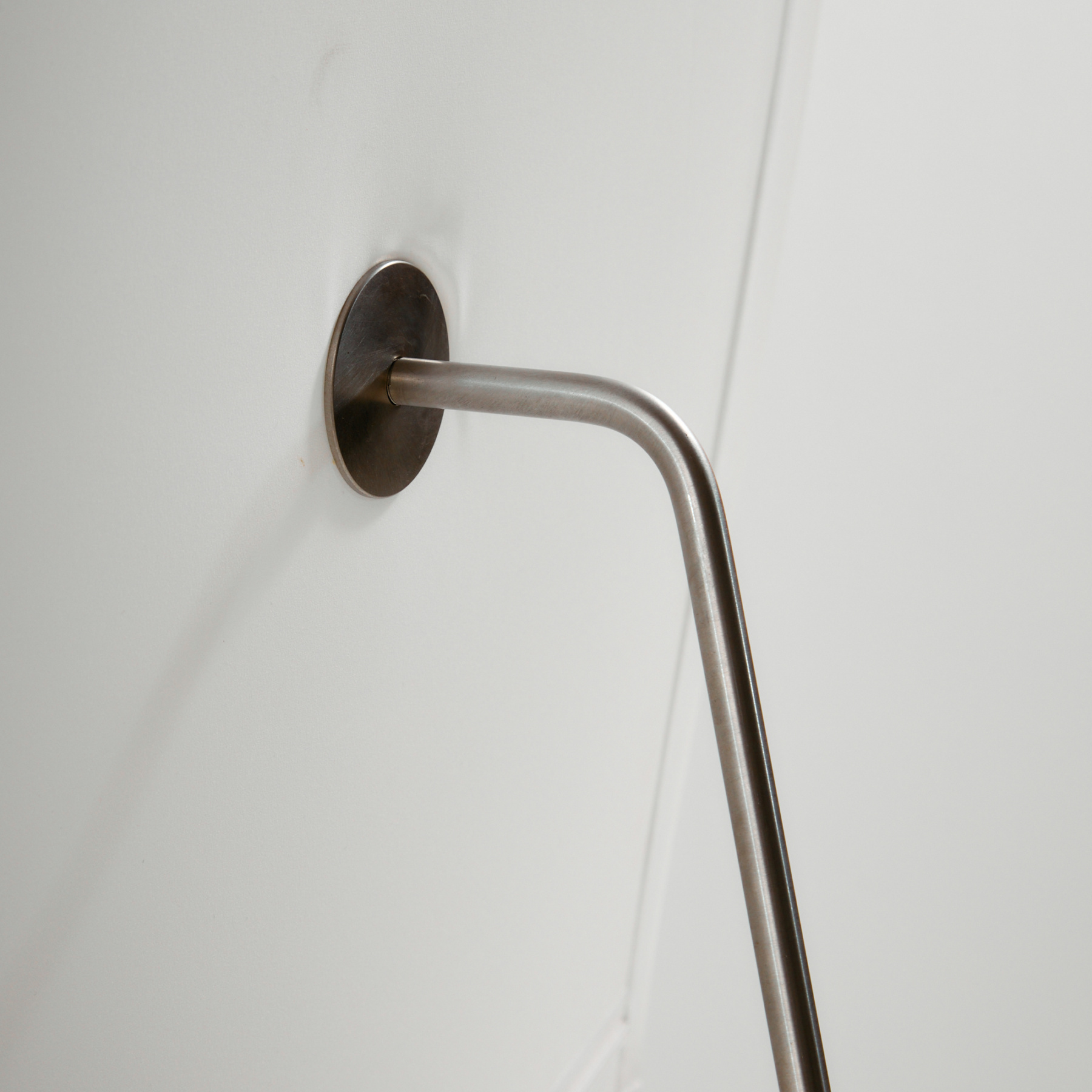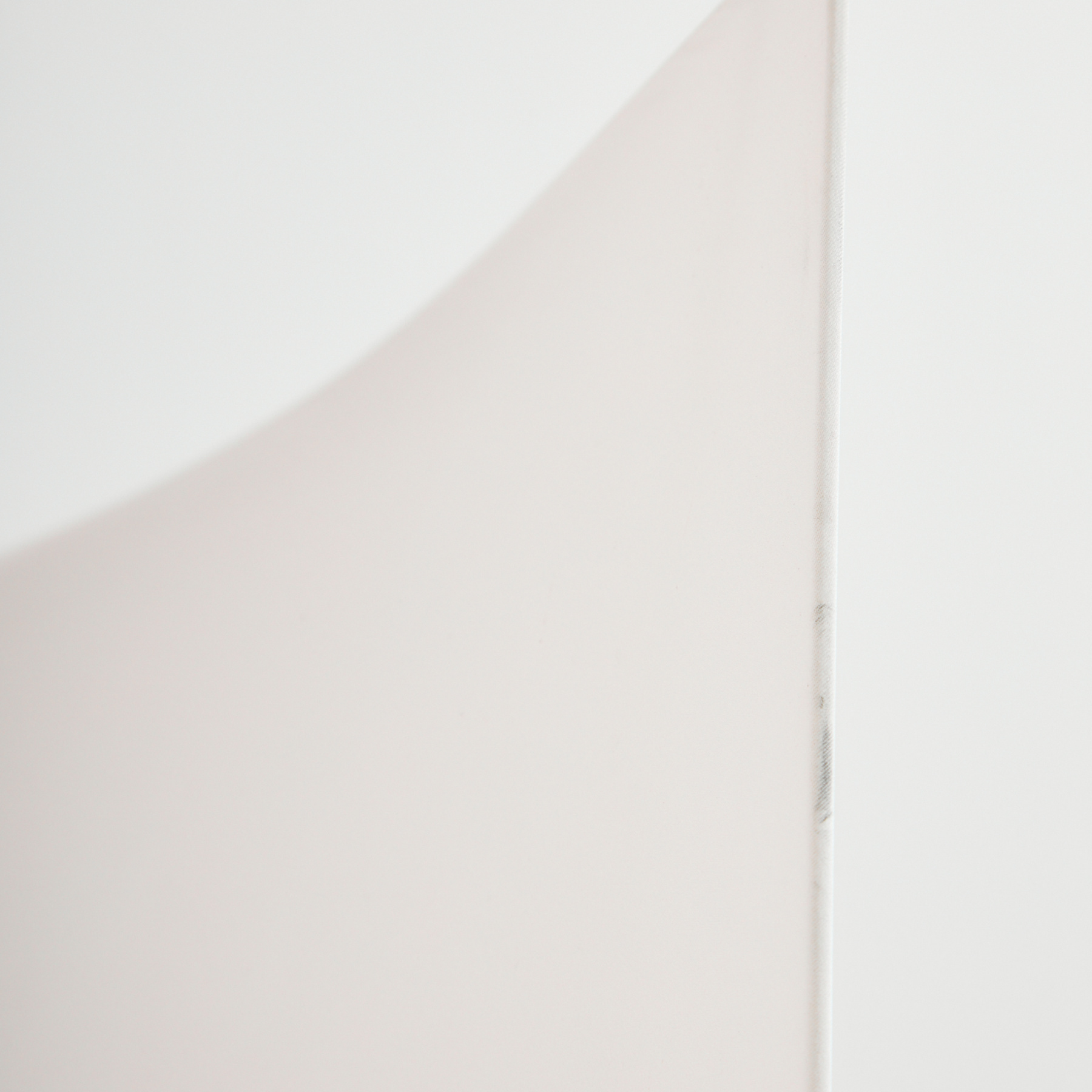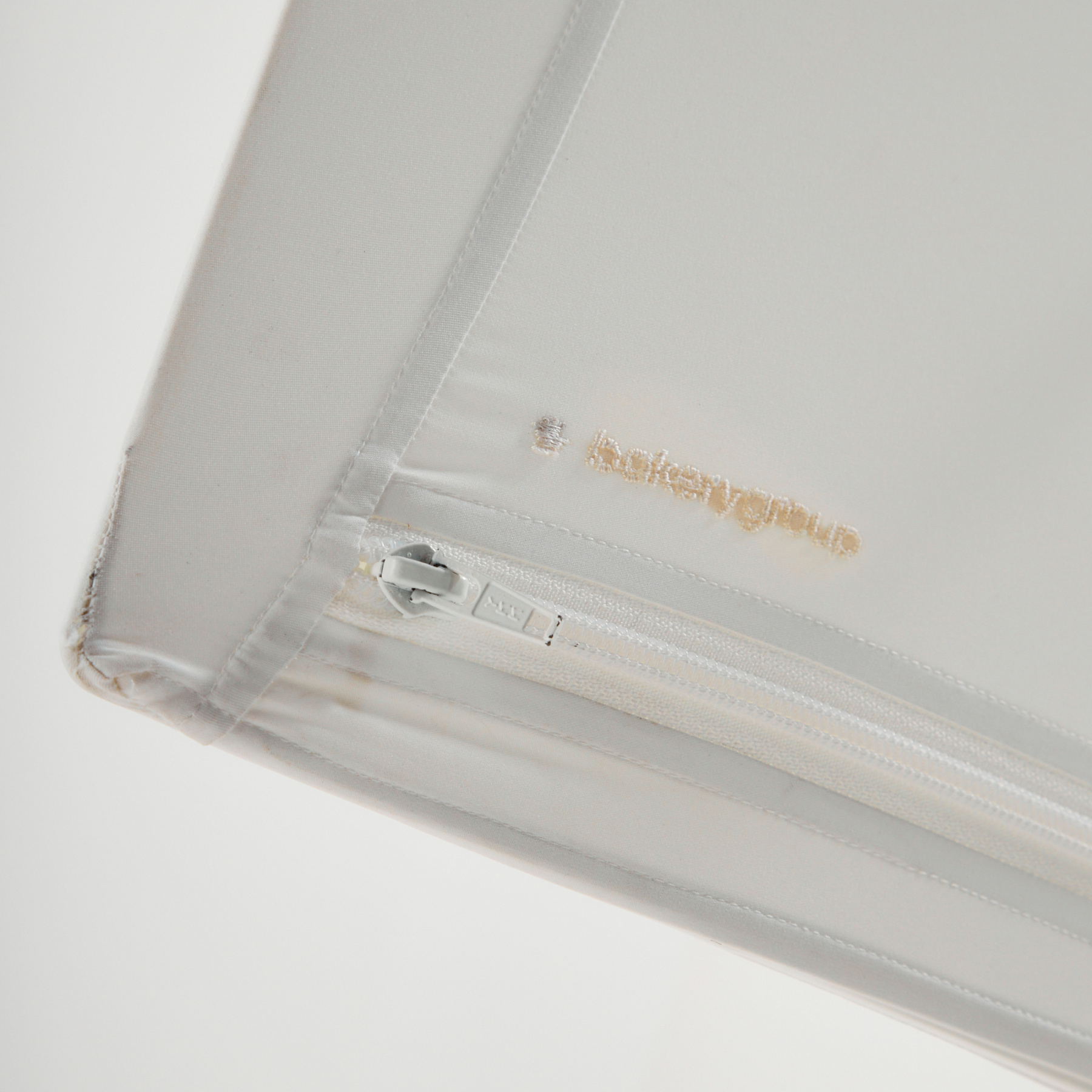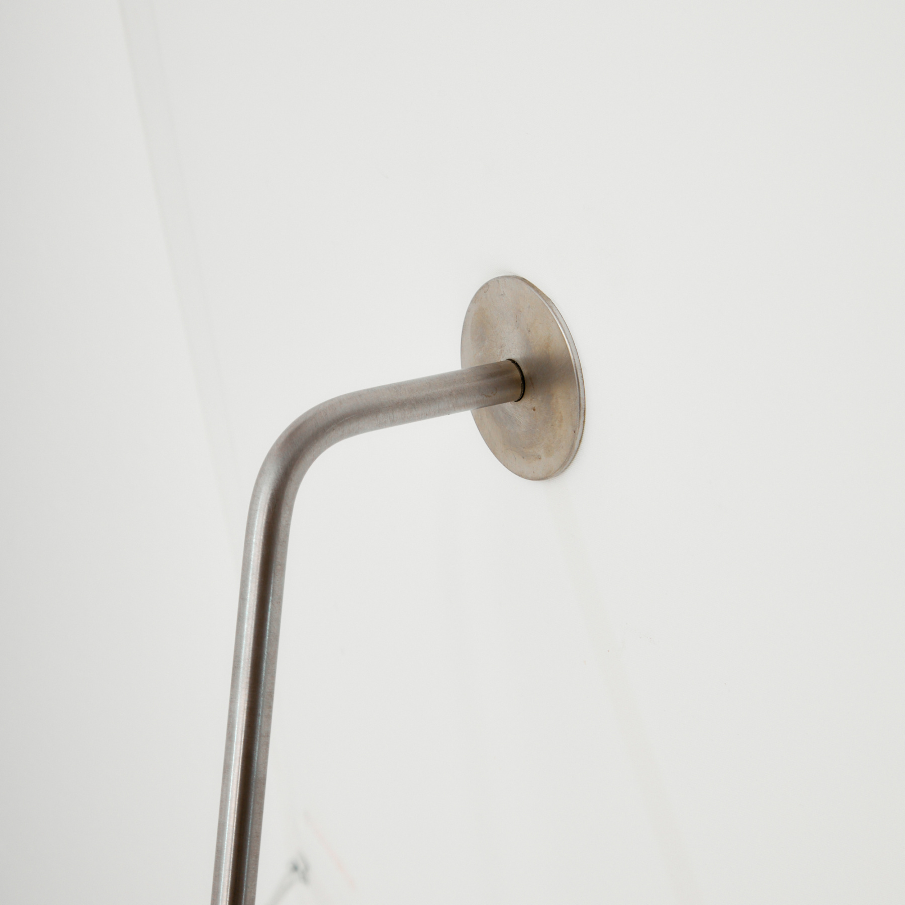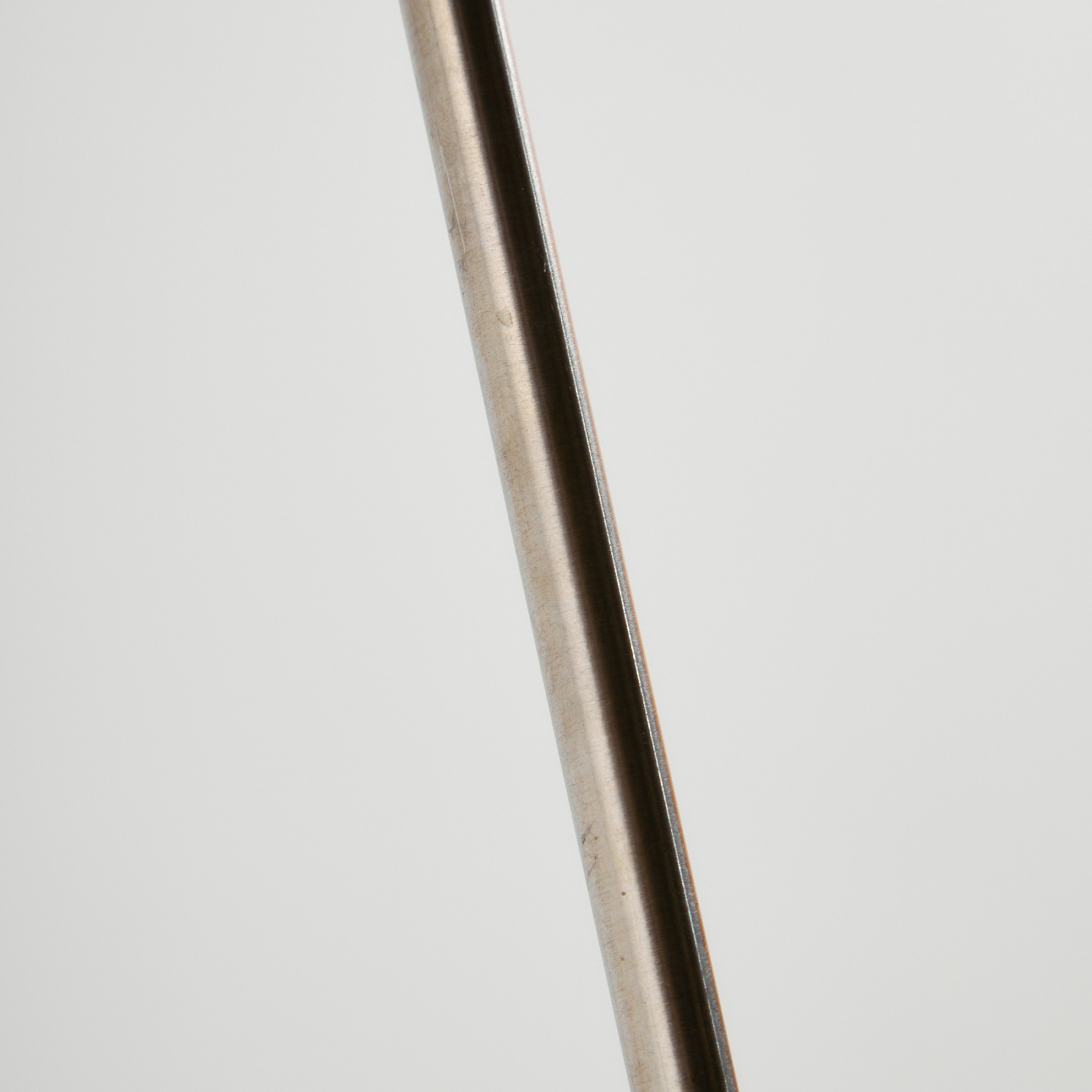 A Bakery Group által a Prandina számára tervezett ‘Model 44F’ állólámpa a 2000-es évekből. A lámpa hatalmas, feszített textil búrával és acél lábazattal ellátott. Felületén helyenként karcokkal, foltokkal és kopásokkal.