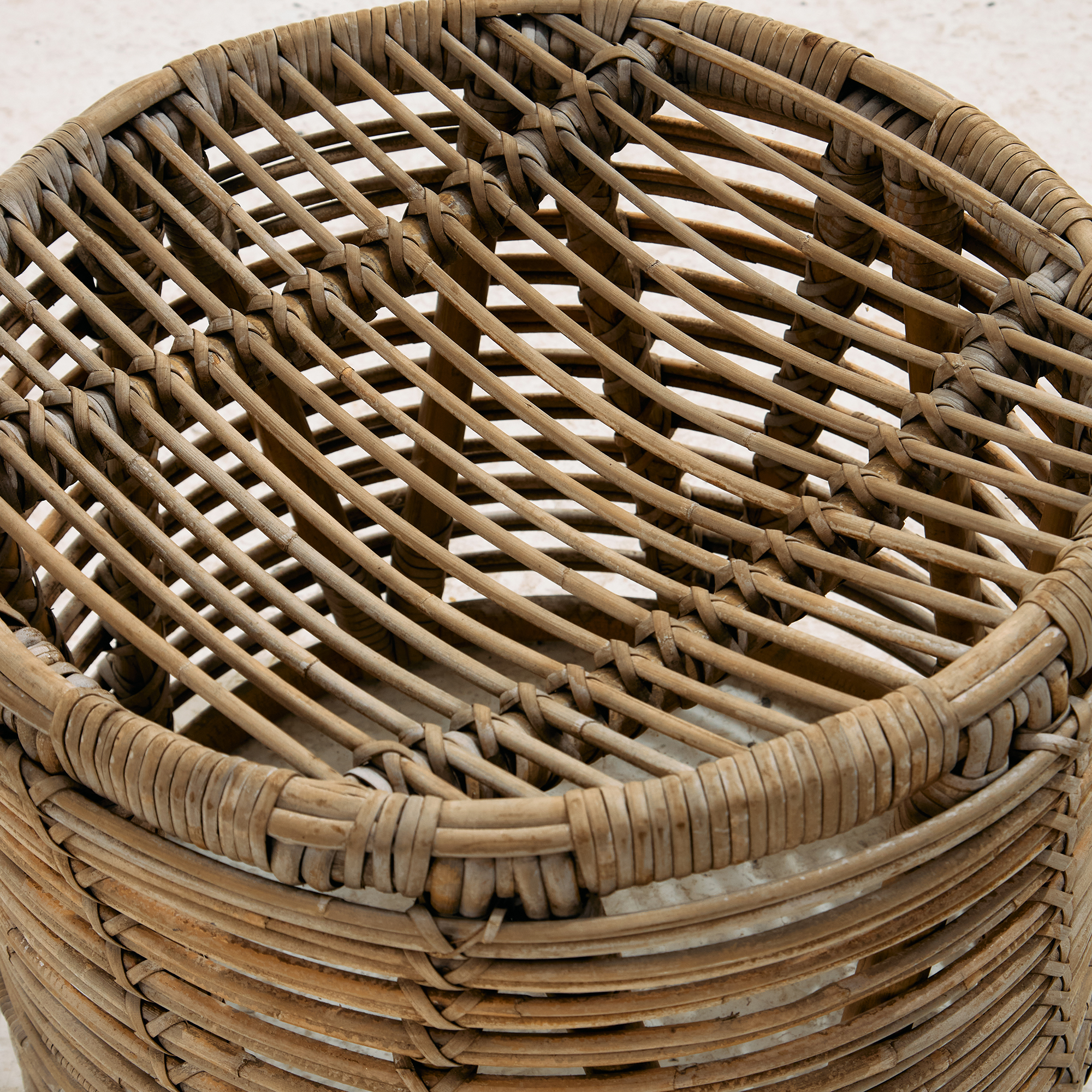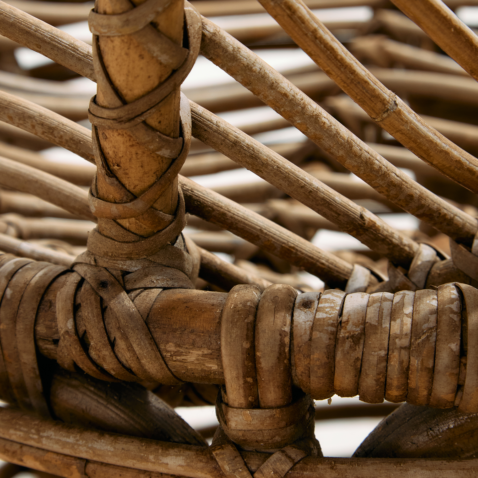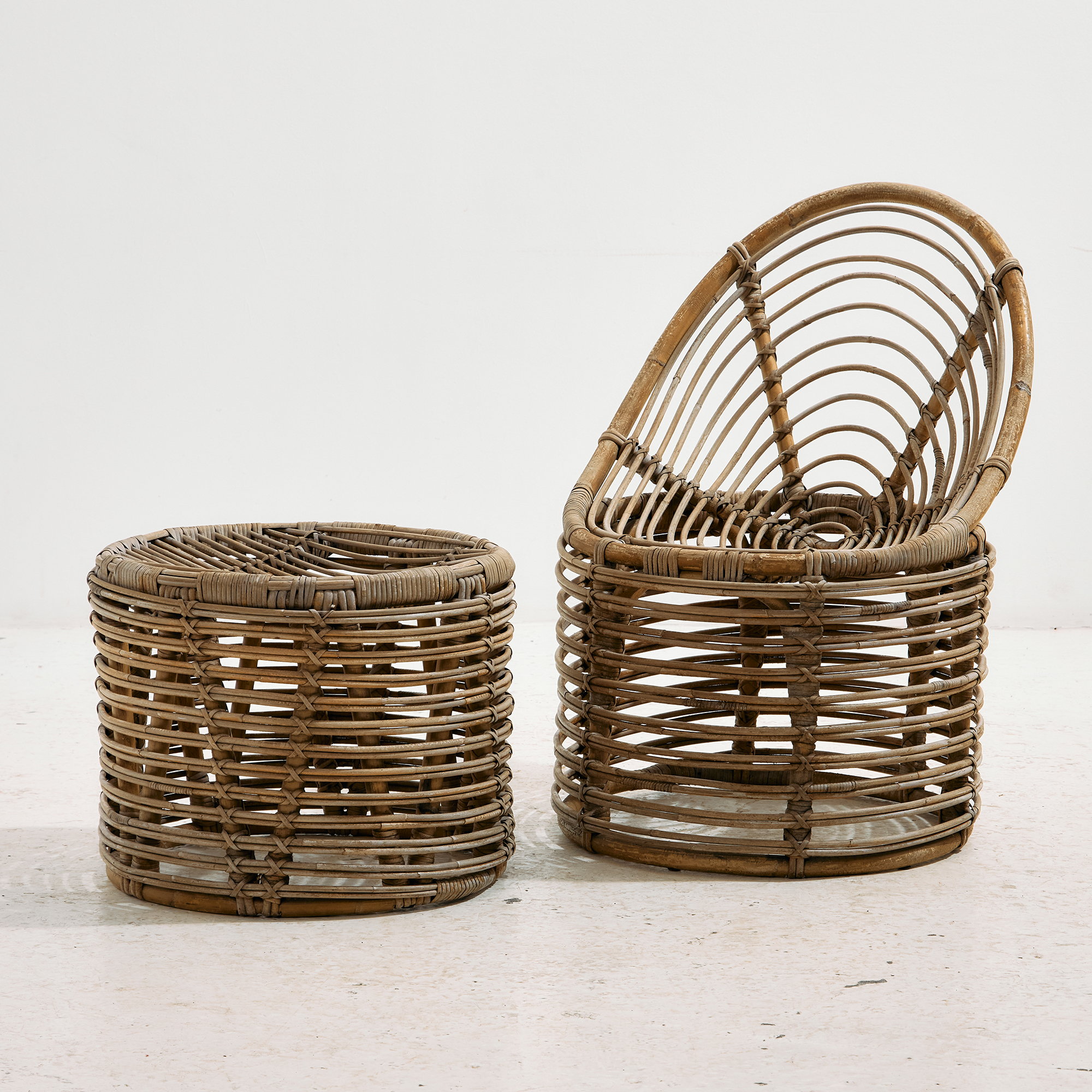 Természetes anyagokból készült rattan szett az 1970-es évekből. A szett egy darab székből és egy darab asztalból áll. Tökéletes választás lehet teraszokra és belső terekbe is egyaránt. Helyenként több felületi karccal, folttal és kopással, az idő nyomot hagyott rajta. Méretek: Szék: 53x75x50 cm, Üm.: 37 cm /// Asztal: 46x40x46 cm