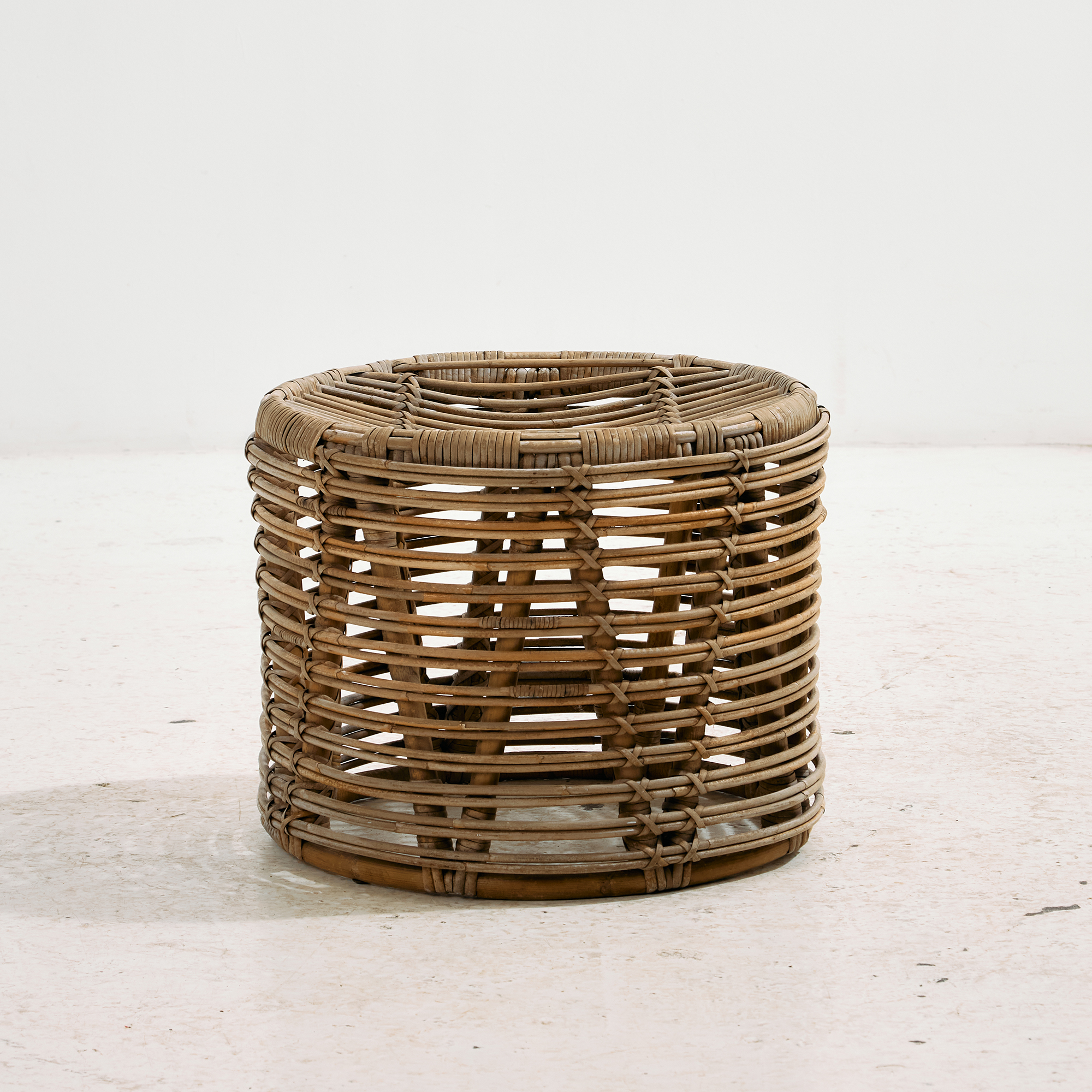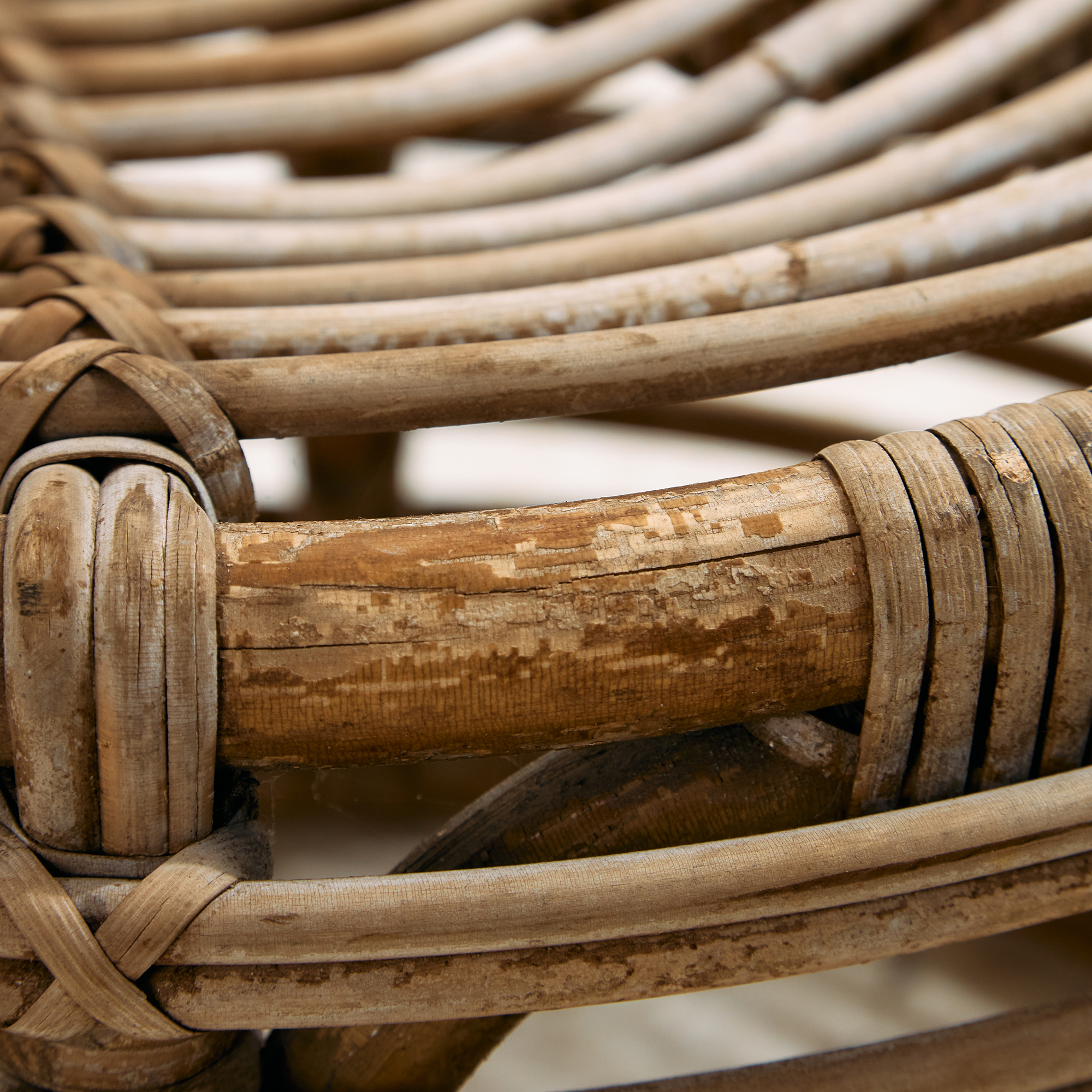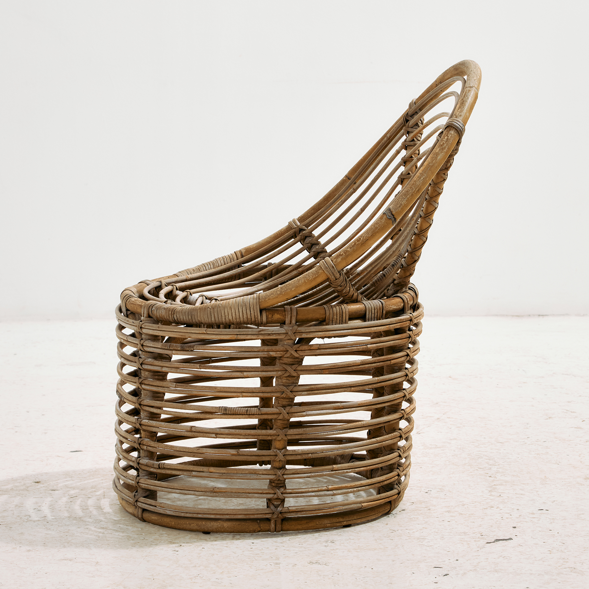 Természetes anyagokból készült rattan szett az 1970-es évekből. A szett egy darab székből és egy darab asztalból áll. Tökéletes választás lehet teraszokra és belső terekbe is egyaránt. Helyenként több felületi karccal, folttal és kopással, az idő nyomot hagyott rajta. Méretek: Szék: 53x75x50 cm, Üm.: 37 cm /// Asztal: 46x40x46 cm