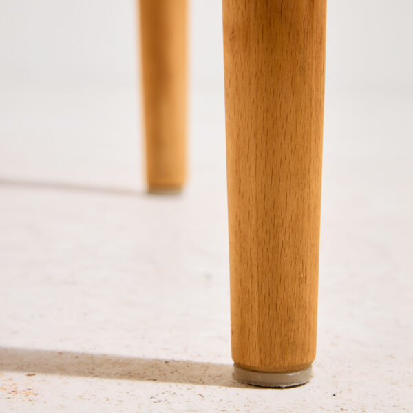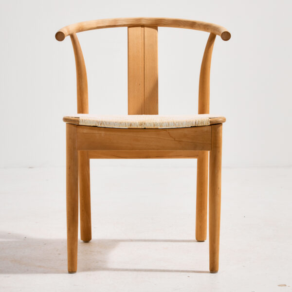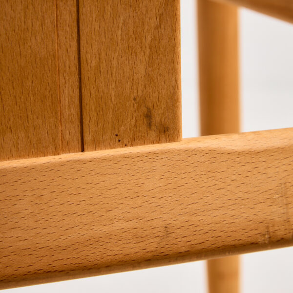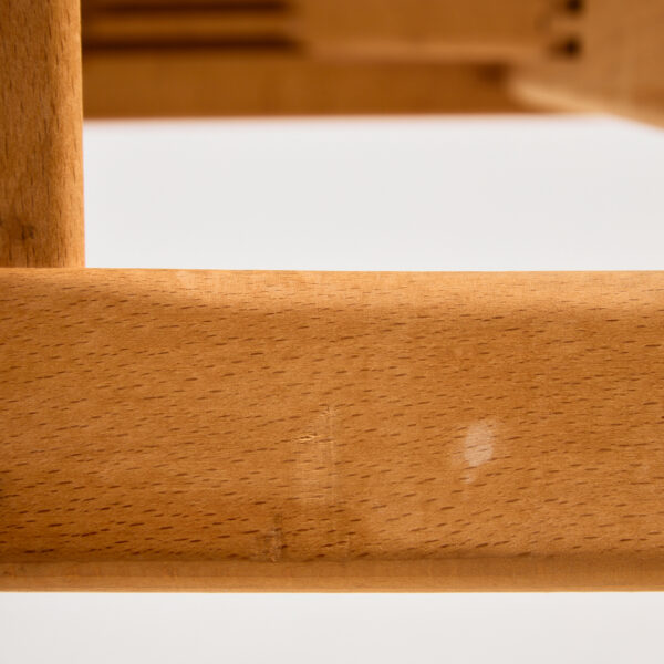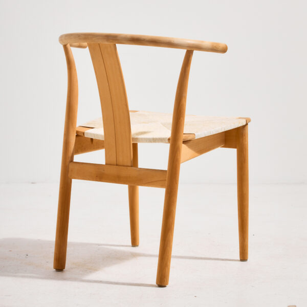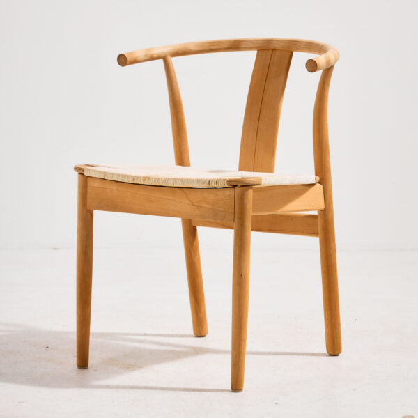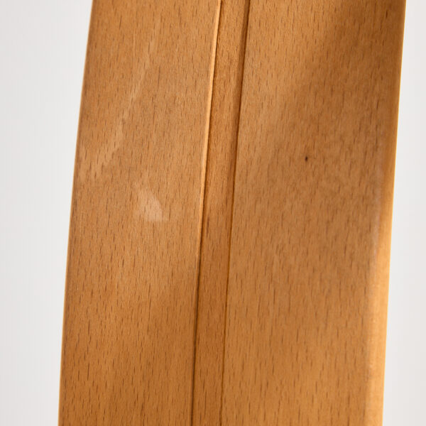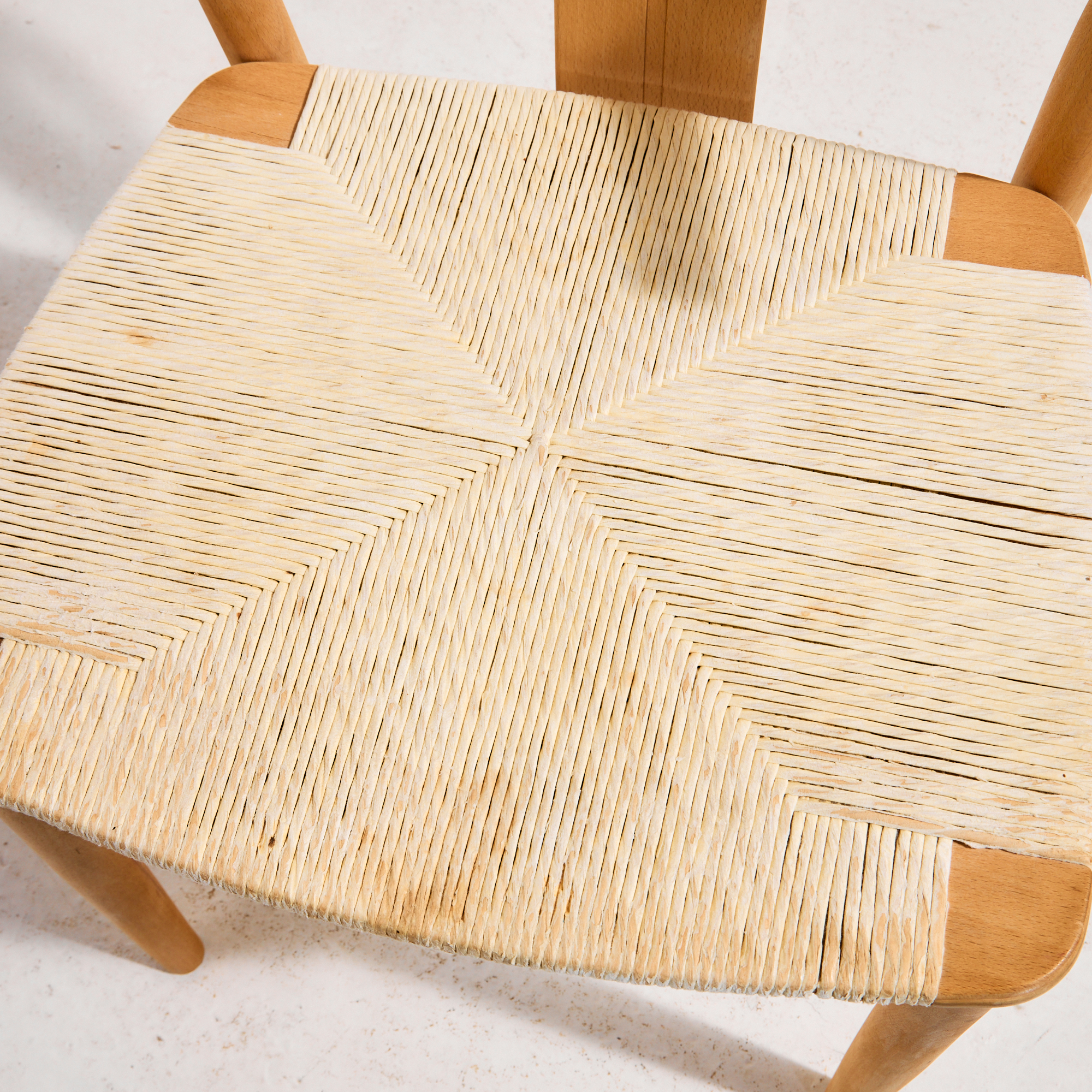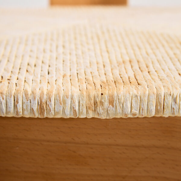 Bükk étkezőszék ívelt háttámlával és kötél borítású ülőrésszel az 1970-es évekből. Felületén helyenként karcok, foltok és kopások találhatóak.