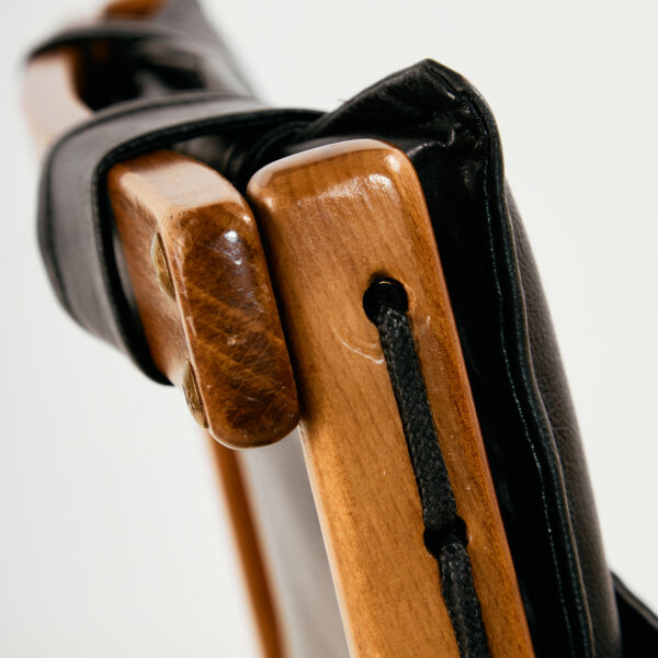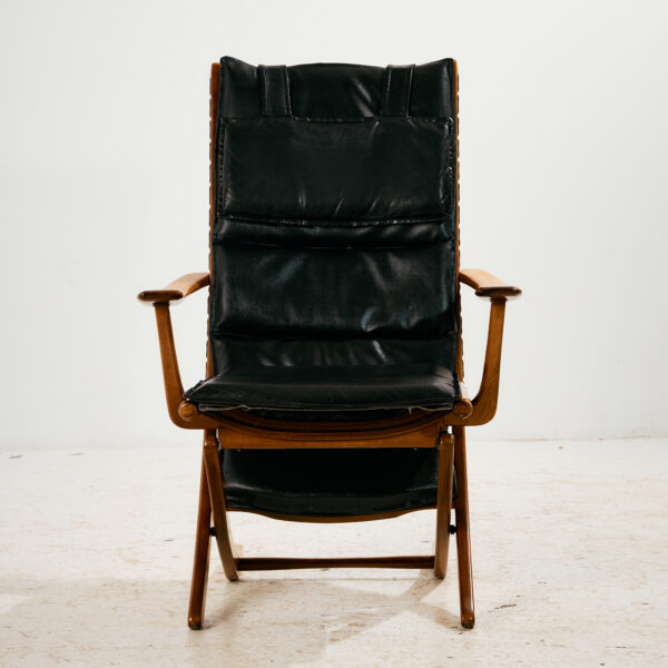 Bükk vázas karosszék kényelmes bőr kárpitozással az 1970-es évekből. A fotel ülésmagassága állítható, így pihenőfotelként is használható. Bőr felületén és bükk szerkezetén helyenként felületi karcokkal és kopásokkal.