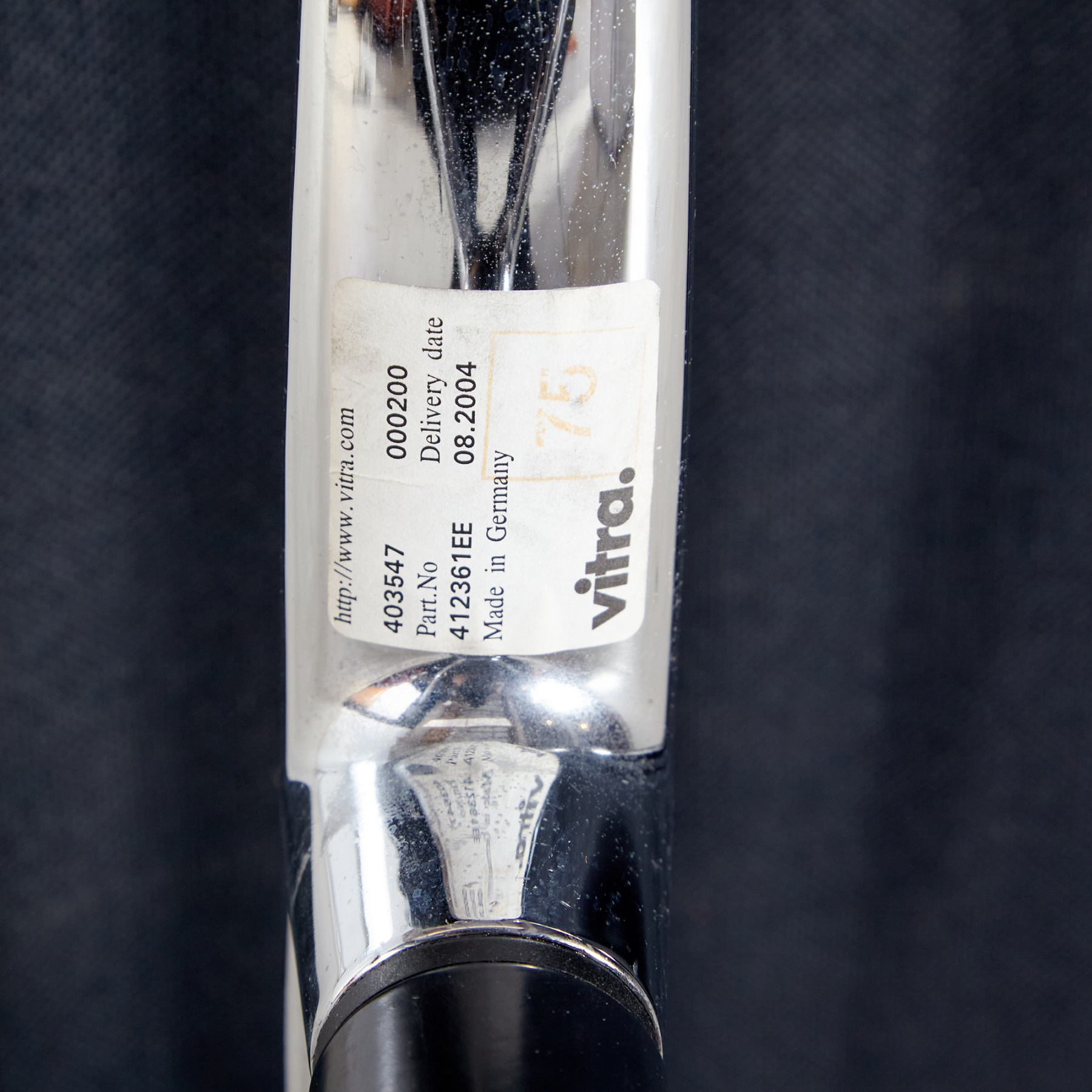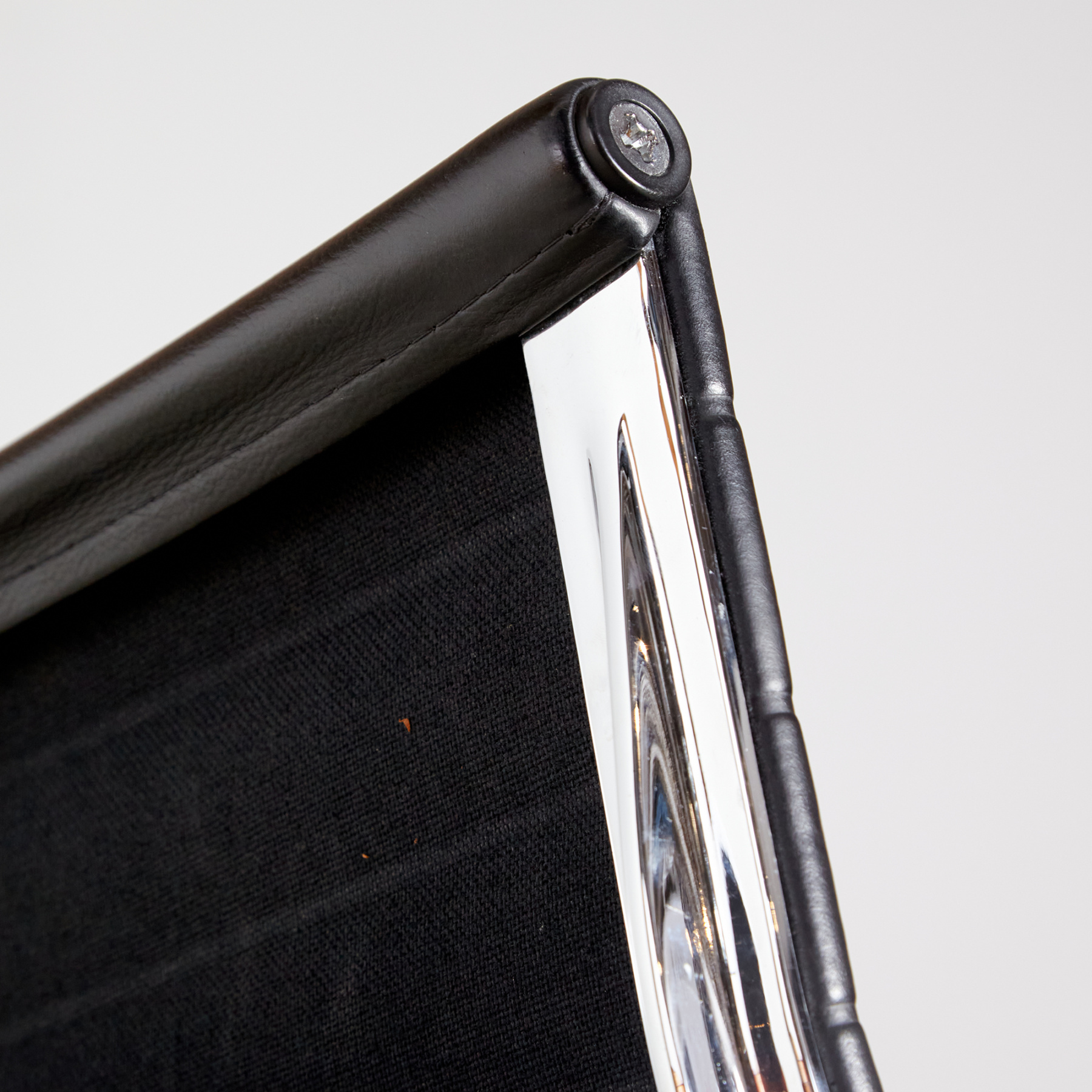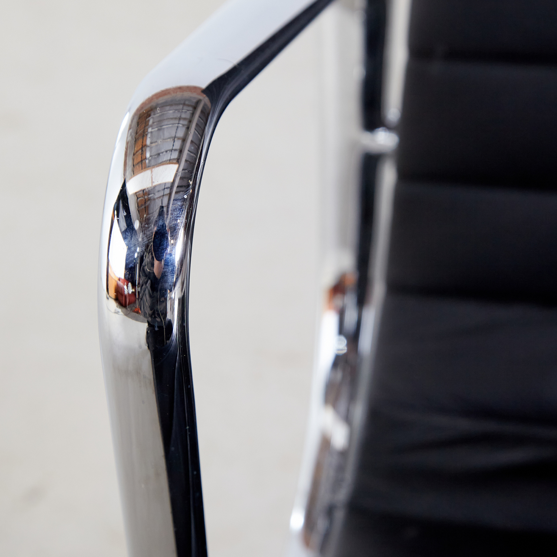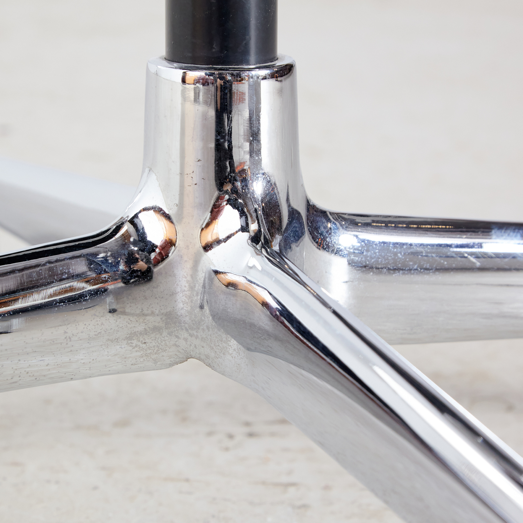 Ikonikus, krómozott acélvázas irodai forgószék, fekete bőr ülő- és háttámla résszel csillag lábon. Ergonomikusan kialakított ülő és háttámla résszel, szép állapotban