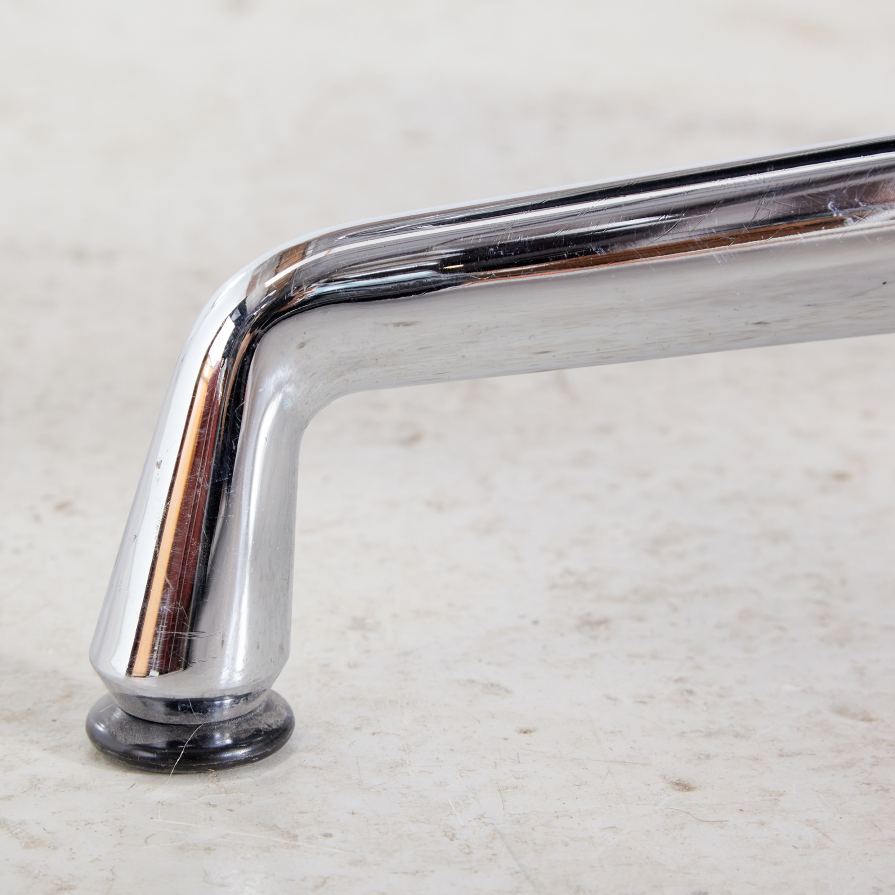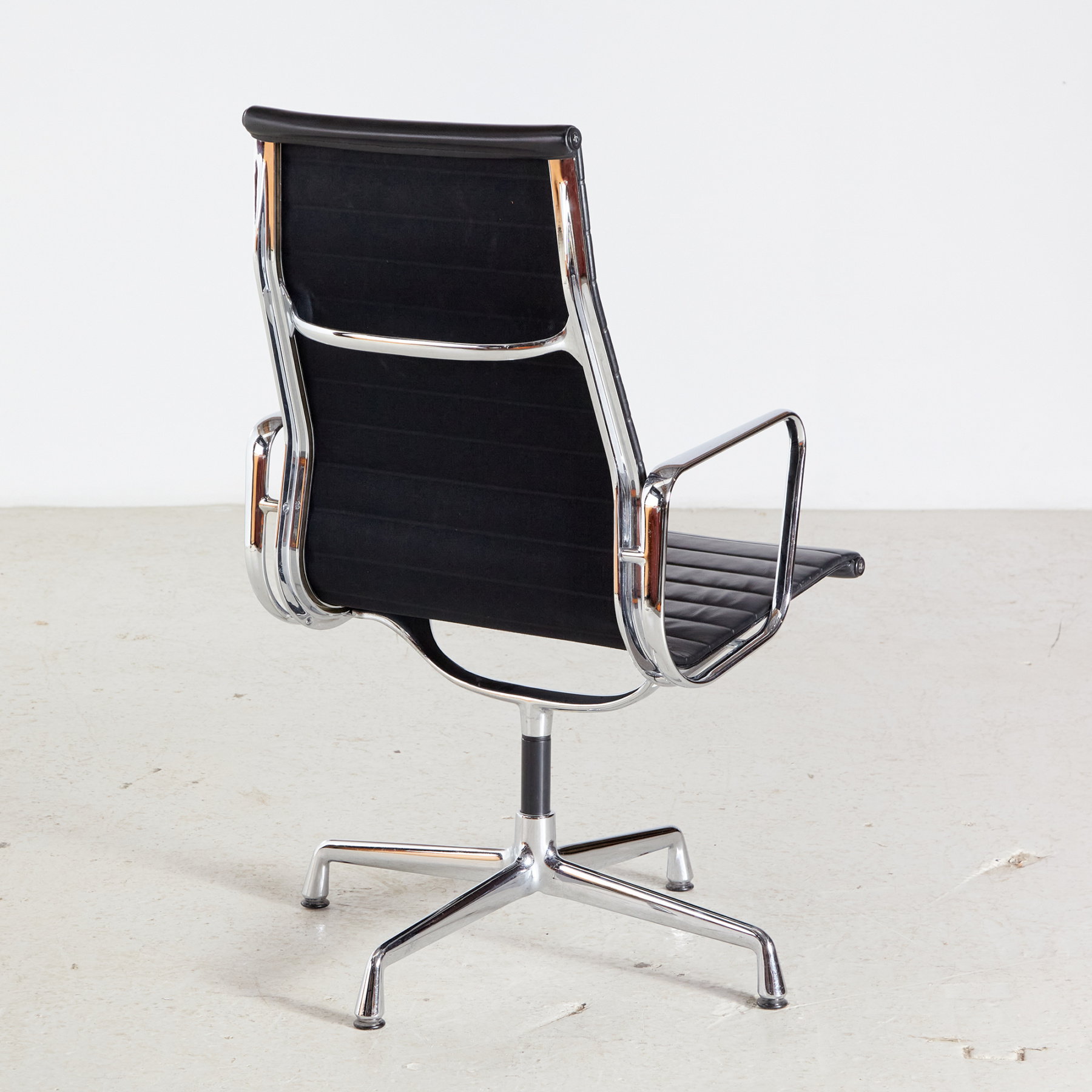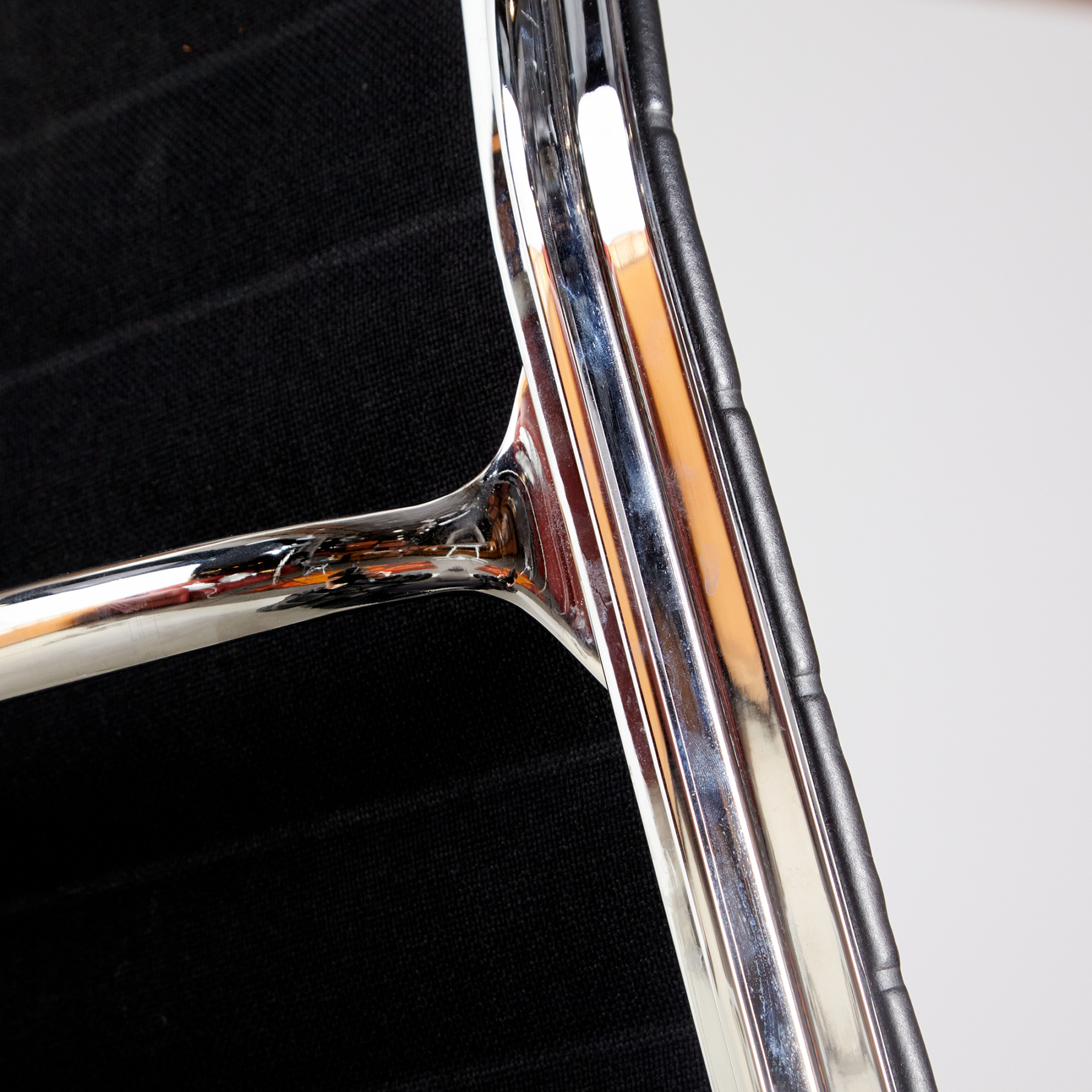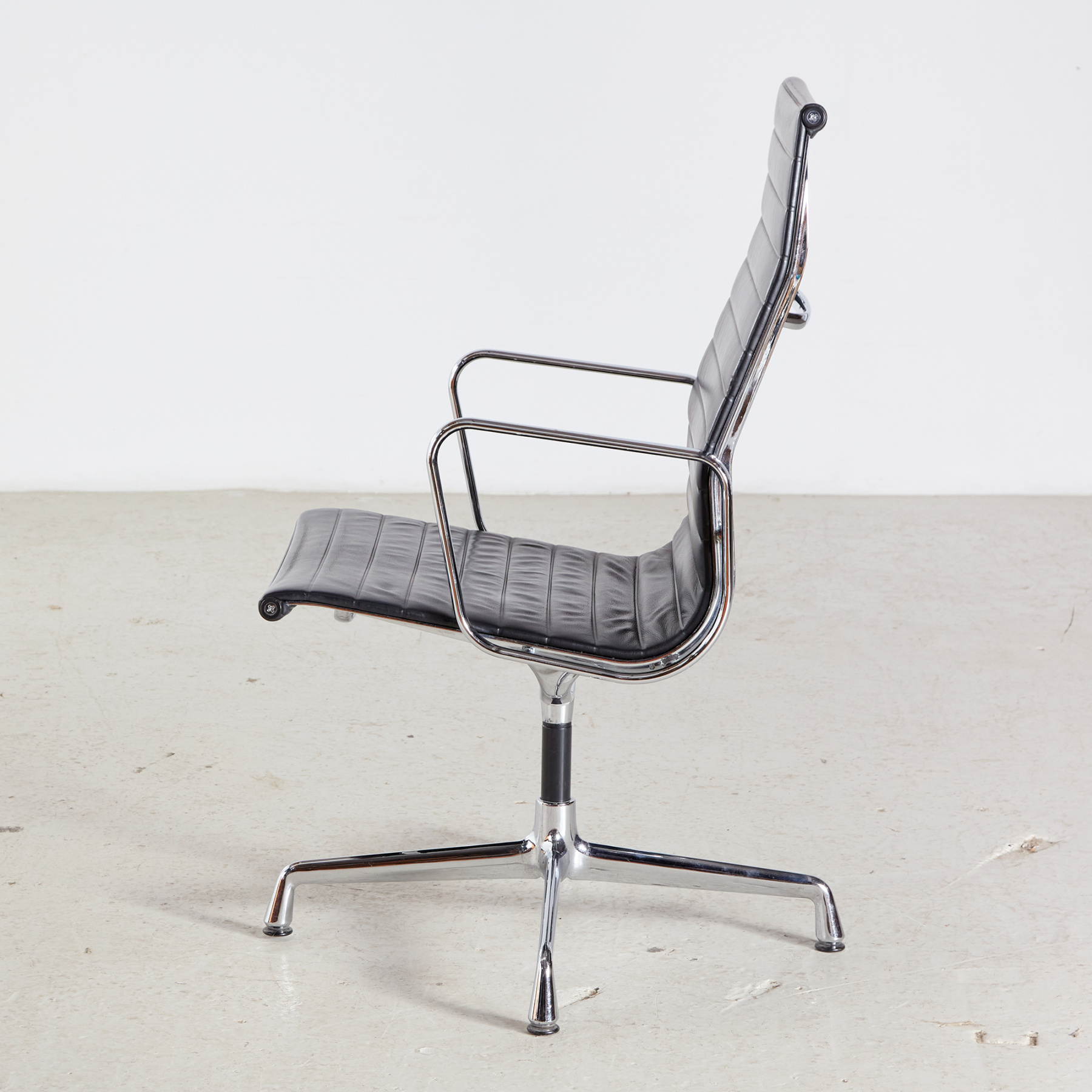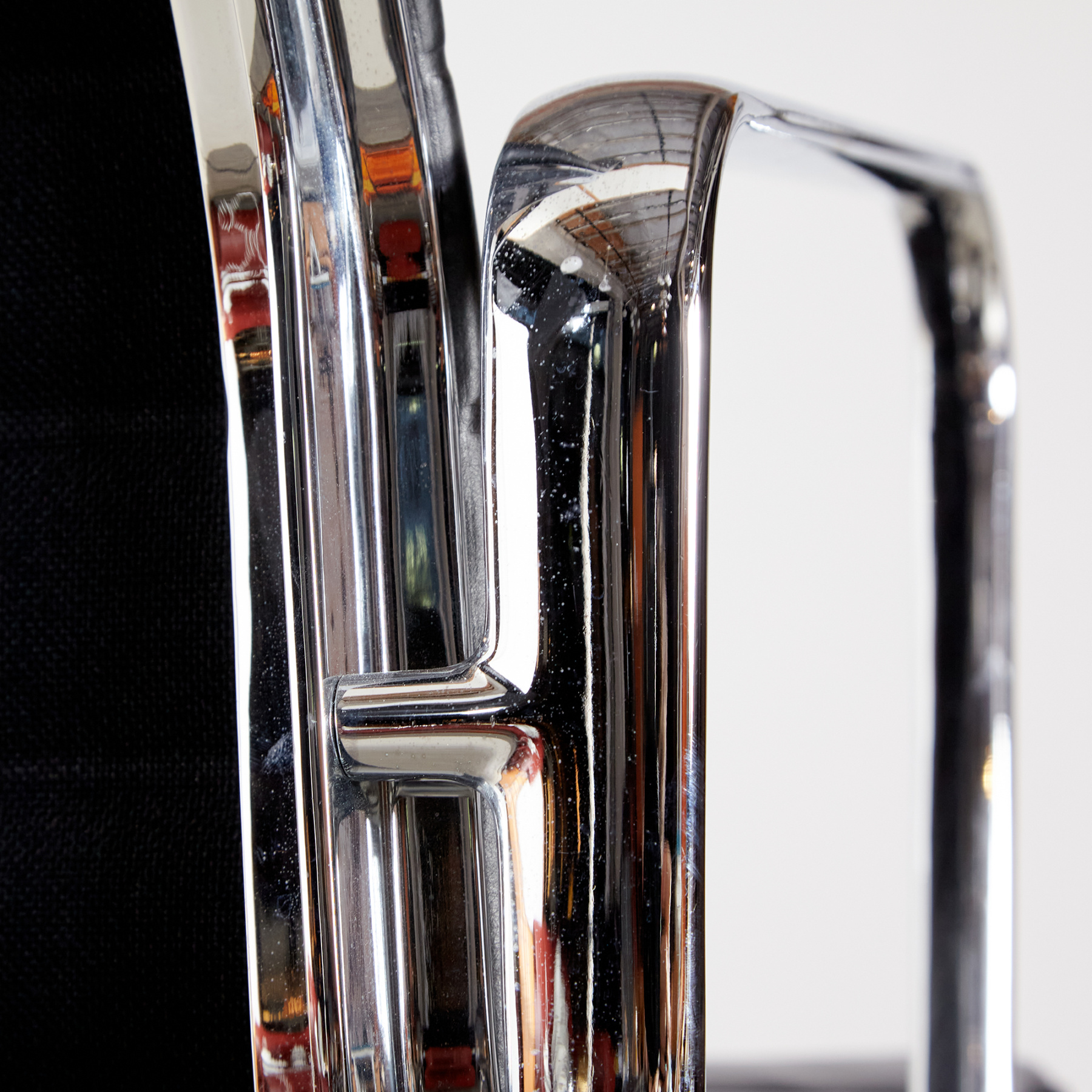 Ikonikus, krómozott acélvázas irodai forgószék, fekete bőr ülő- és háttámla résszel csillag lábon. Ergonomikusan kialakított ülő és háttámla résszel, szép állapotban
