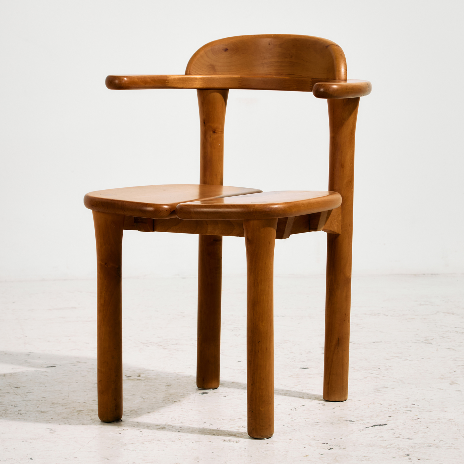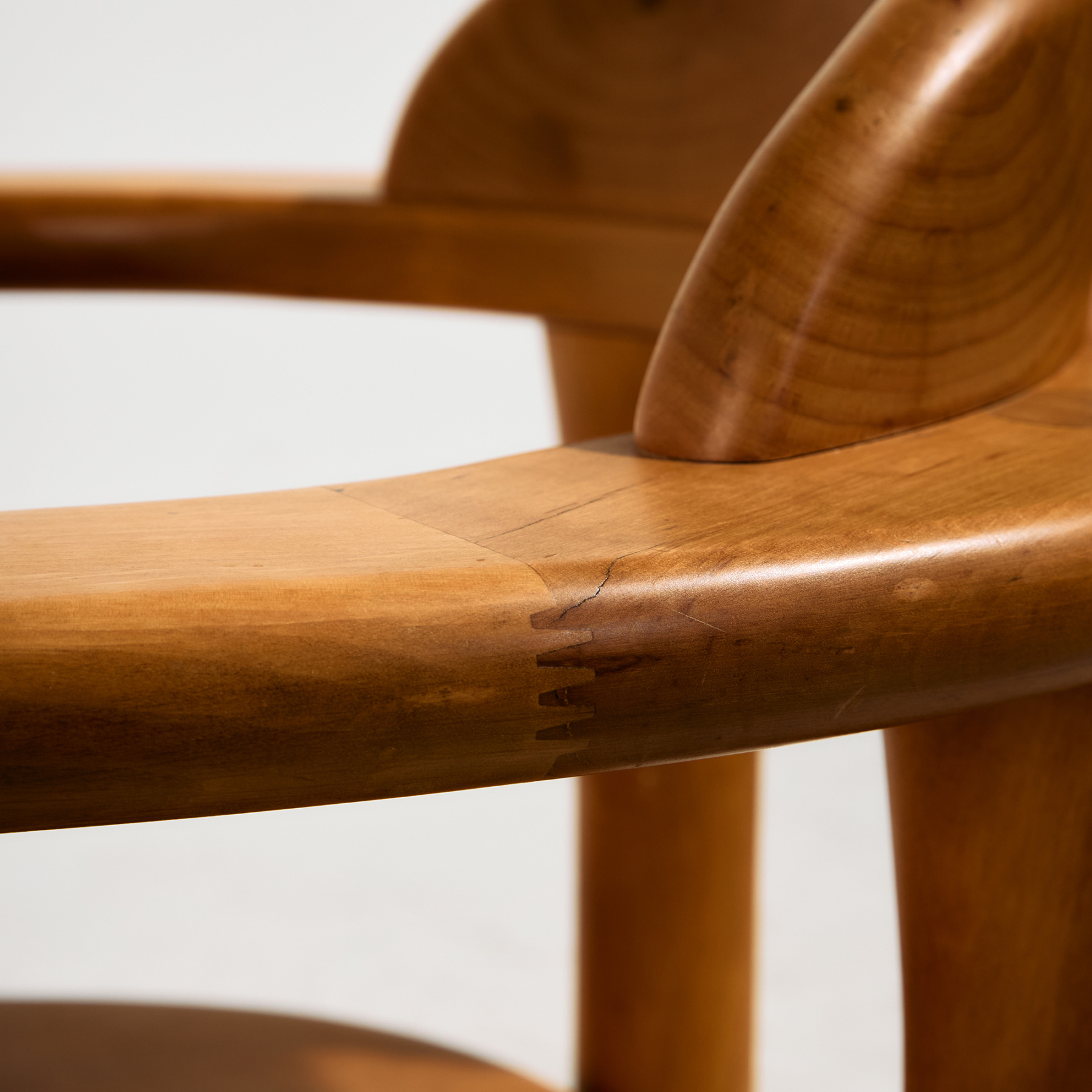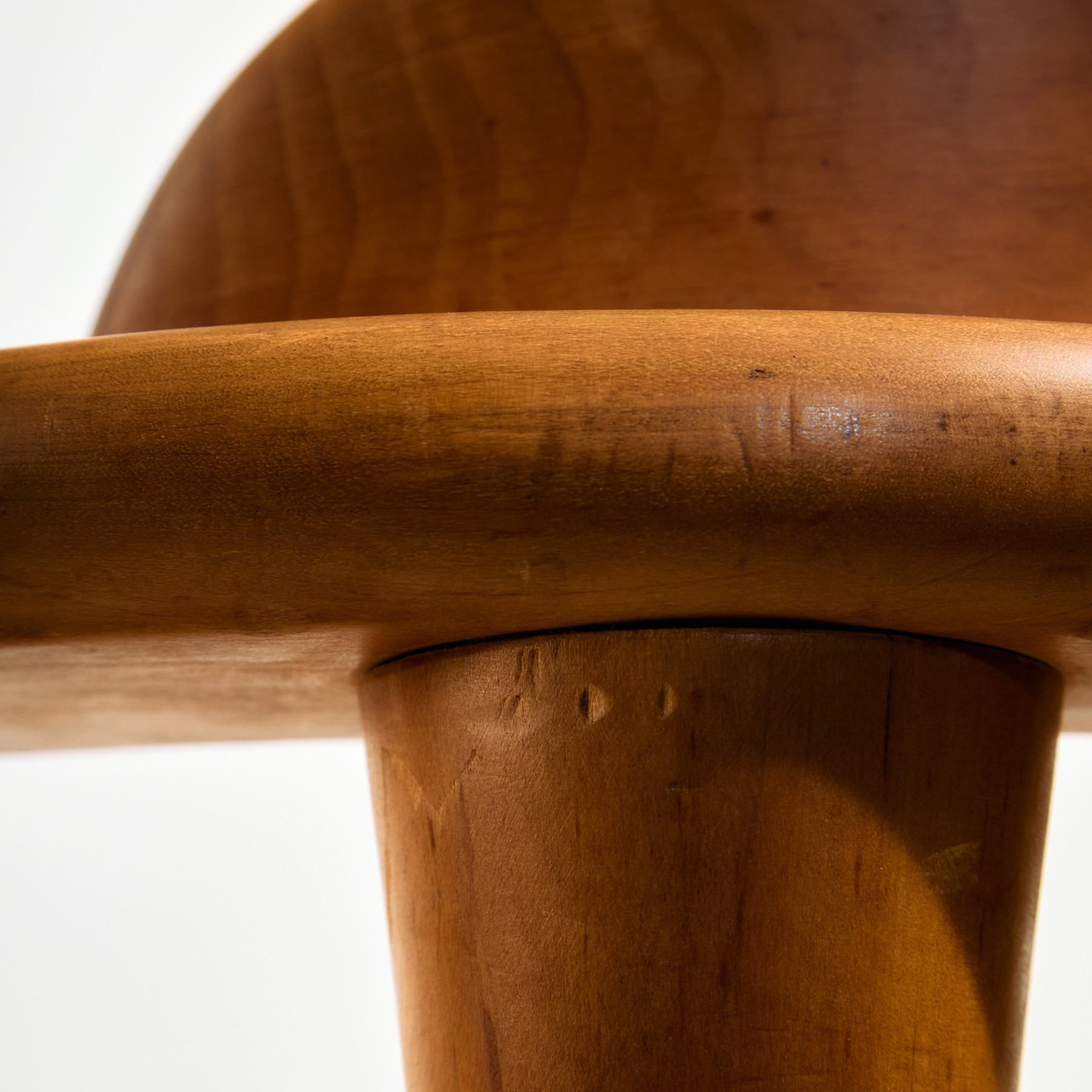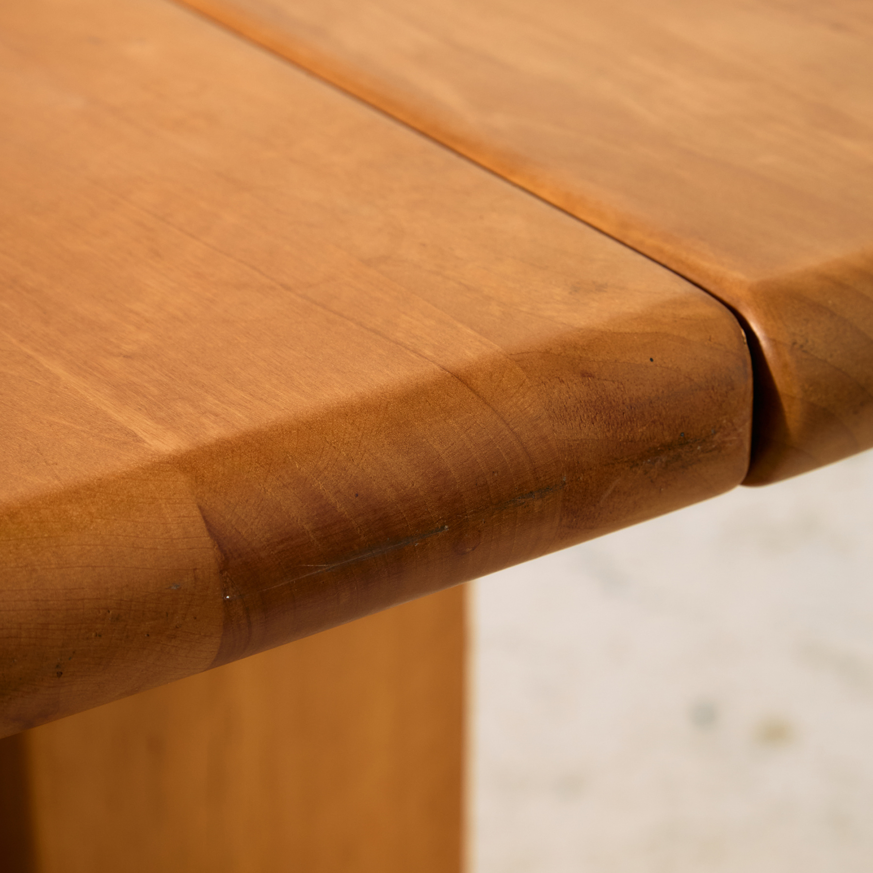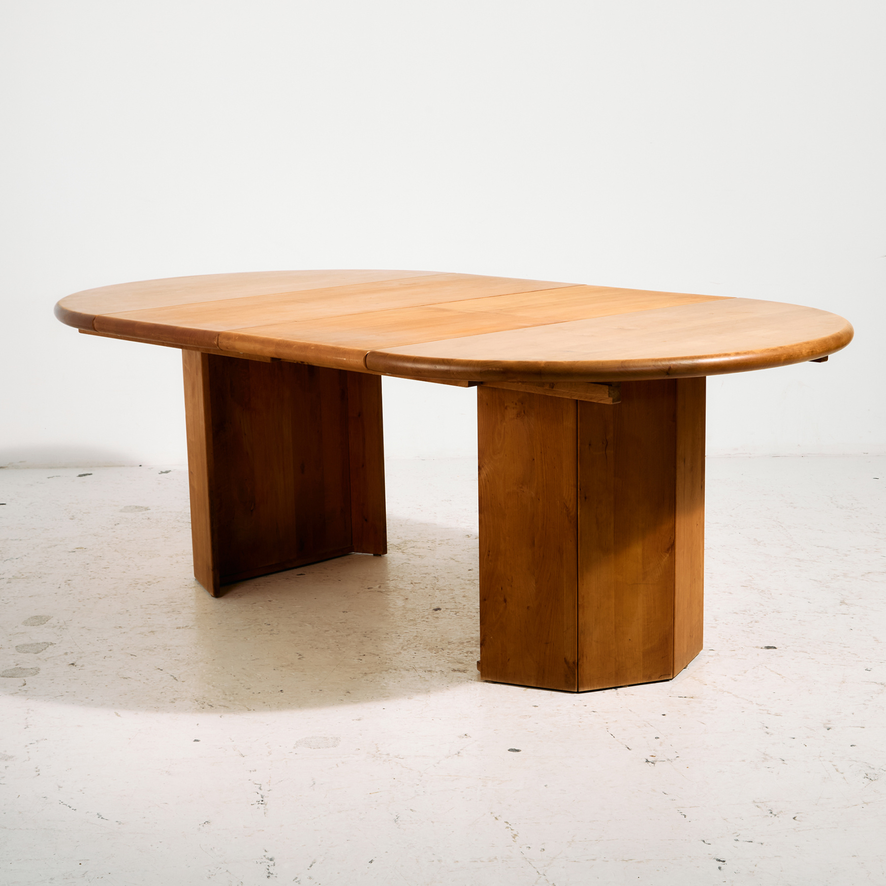 Erwin Berghammer által a Team 7 számára tervezett égerfa étkezőgarnitúra az 1980-as évekből. A szett hat darab ‘Opus’ karosszékből és egy darab étkezőasztalból áll. Az étkezőasztal két vendéglappal nagyobb méretre bővíthető. Az étkezőasztal és székek felületén helyenként karcokkal, foltokkal és kopásokkal, használatból adódó nyomokkal. Méretek: Étkezőasztal: 120 – 216x75x120 cm /// Étkezőszék: 55x78x54 cm, Üm.: 46 cm