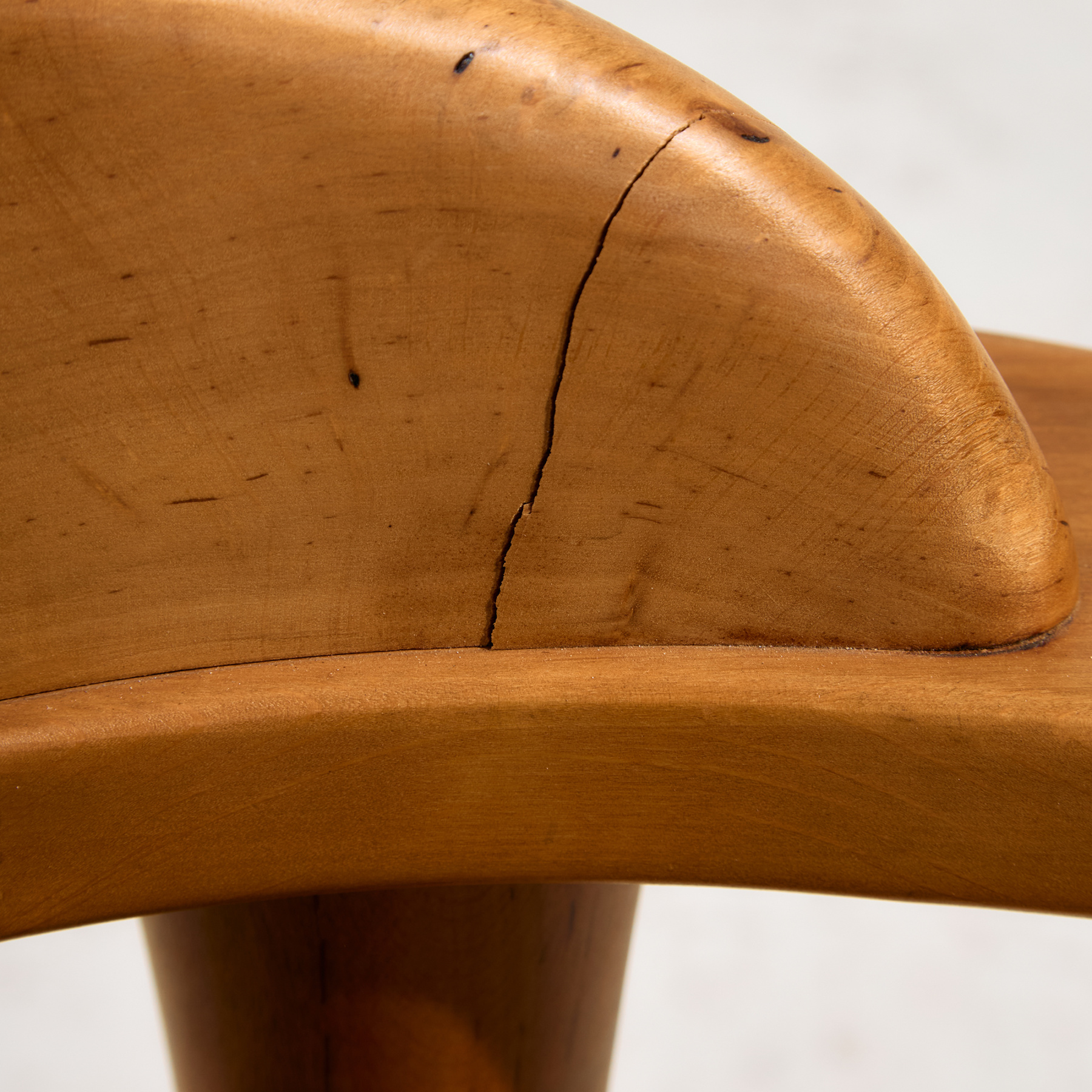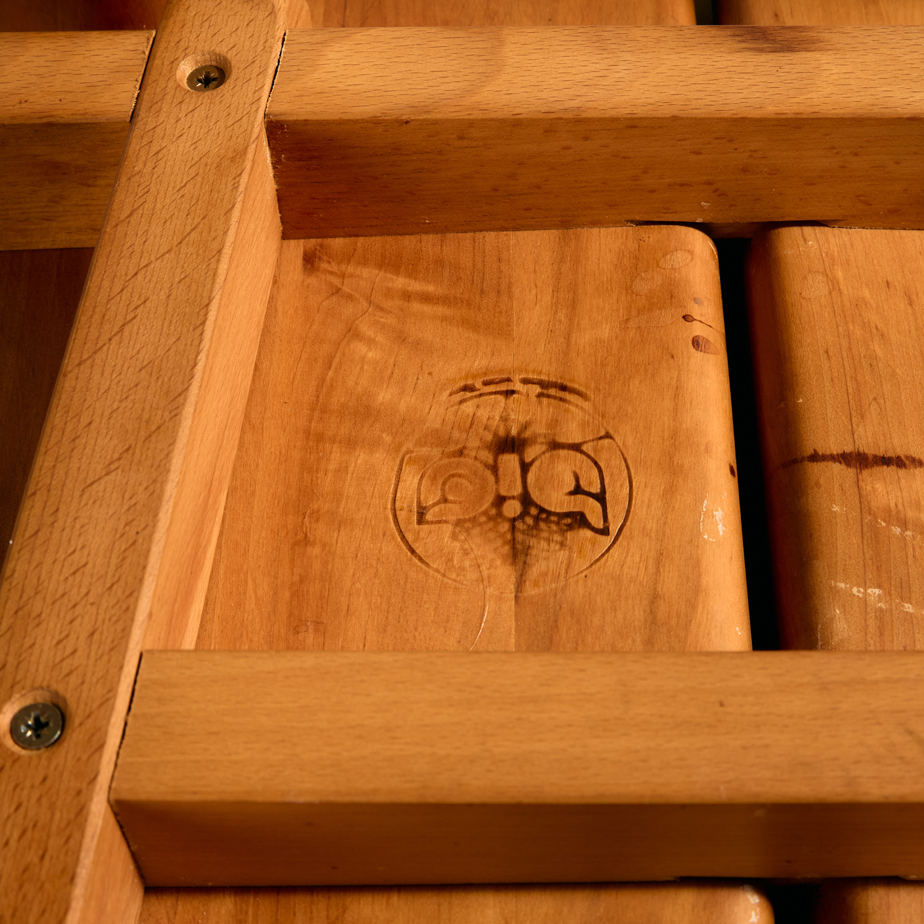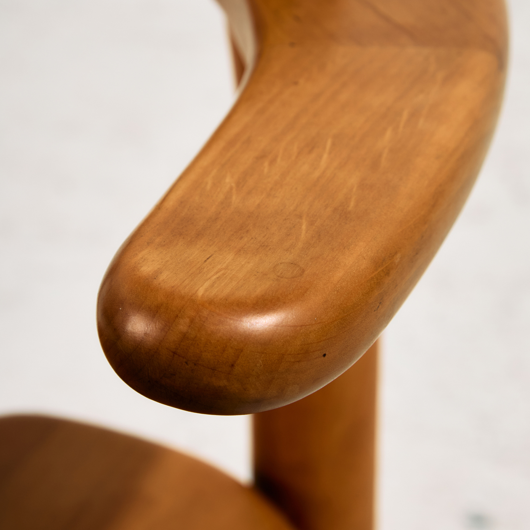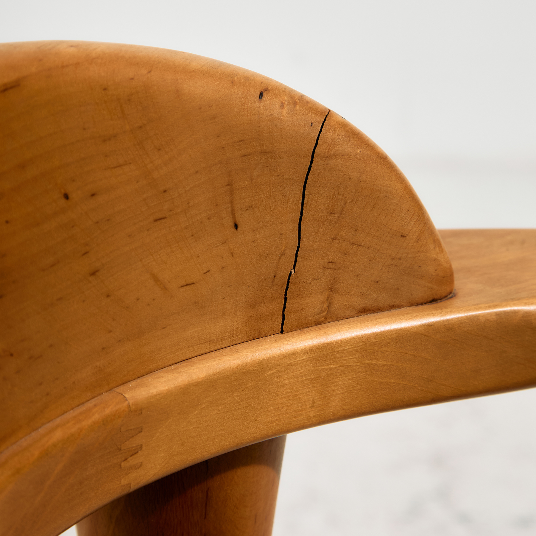 Erwin Berghammer által a Team 7 számára tervezett égerfa étkezőgarnitúra az 1980-as évekből. A szett hat darab ‘Opus’ karosszékből és egy darab étkezőasztalból áll. Az étkezőasztal két vendéglappal nagyobb méretre bővíthető. Az étkezőasztal és székek felületén helyenként karcokkal, foltokkal és kopásokkal, használatból adódó nyomokkal. Méretek: Étkezőasztal: 120 – 216x75x120 cm /// Étkezőszék: 55x78x54 cm, Üm.: 46 cm
