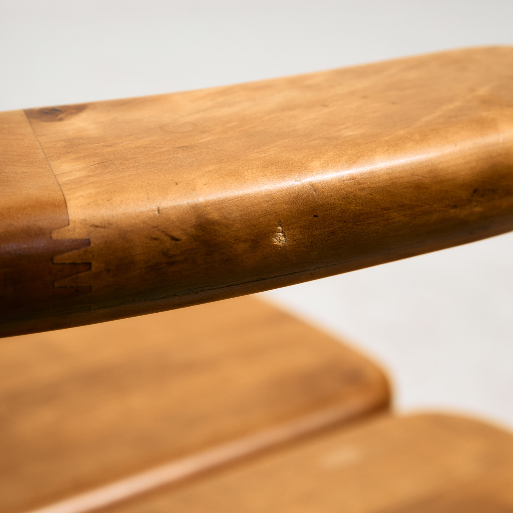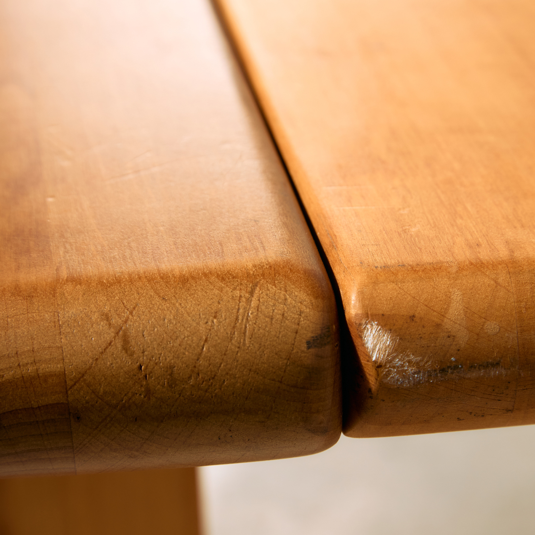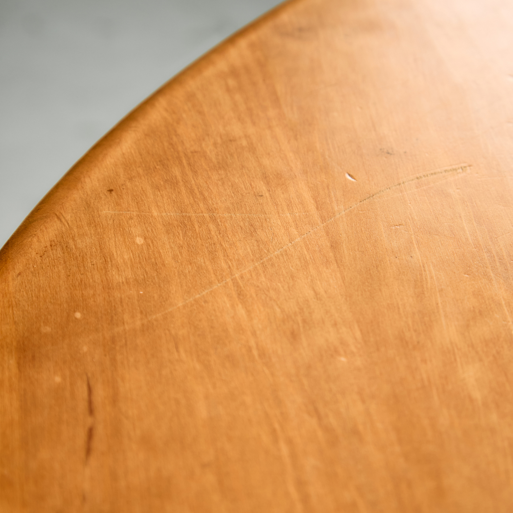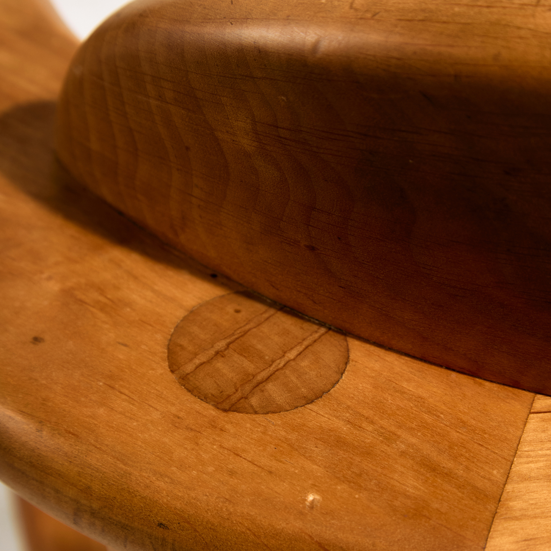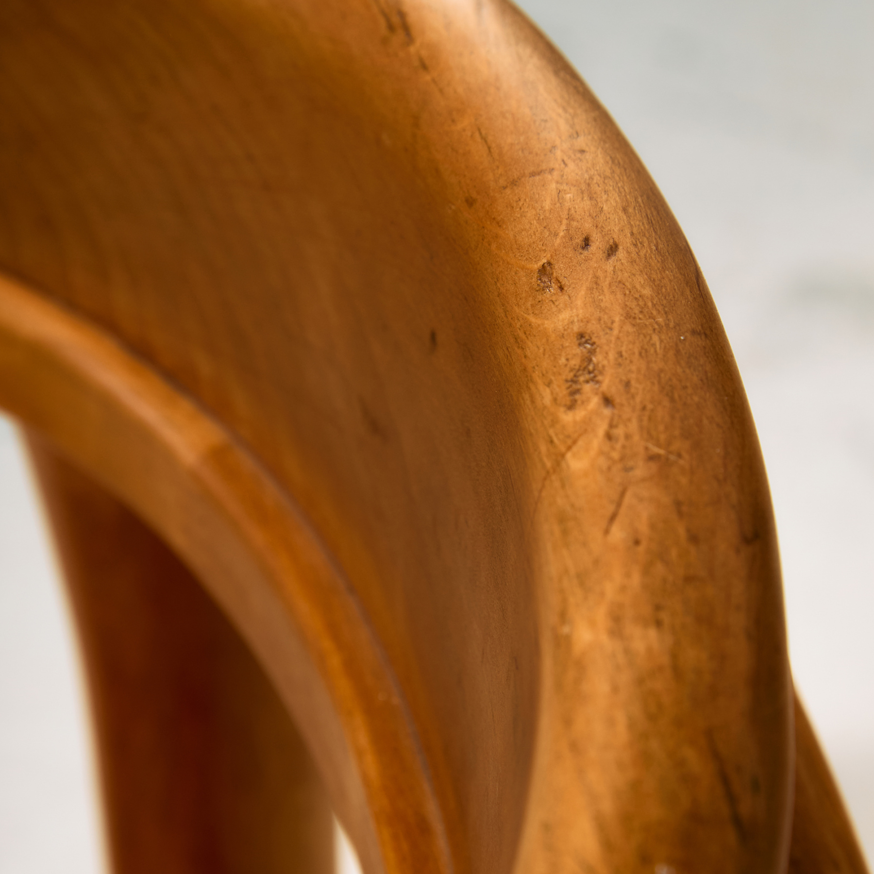 Erwin Berghammer által a Team 7 számára tervezett égerfa étkezőgarnitúra az 1980-as évekből. A szett hat darab ‘Opus’ karosszékből és egy darab étkezőasztalból áll. Az étkezőasztal két vendéglappal nagyobb méretre bővíthető. Az étkezőasztal és székek felületén helyenként karcokkal, foltokkal és kopásokkal, használatból adódó nyomokkal. Méretek: Étkezőasztal: 120 – 216x75x120 cm /// Étkezőszék: 55x78x54 cm, Üm.: 46 cm