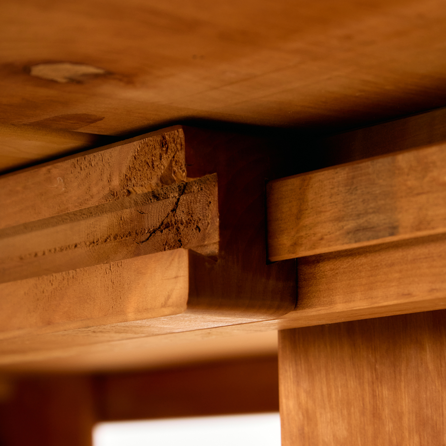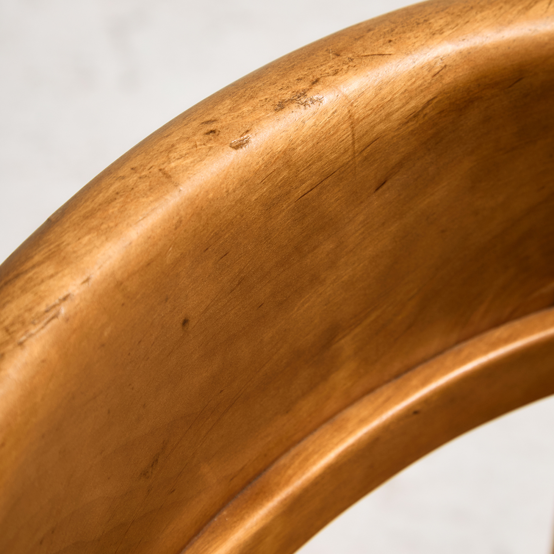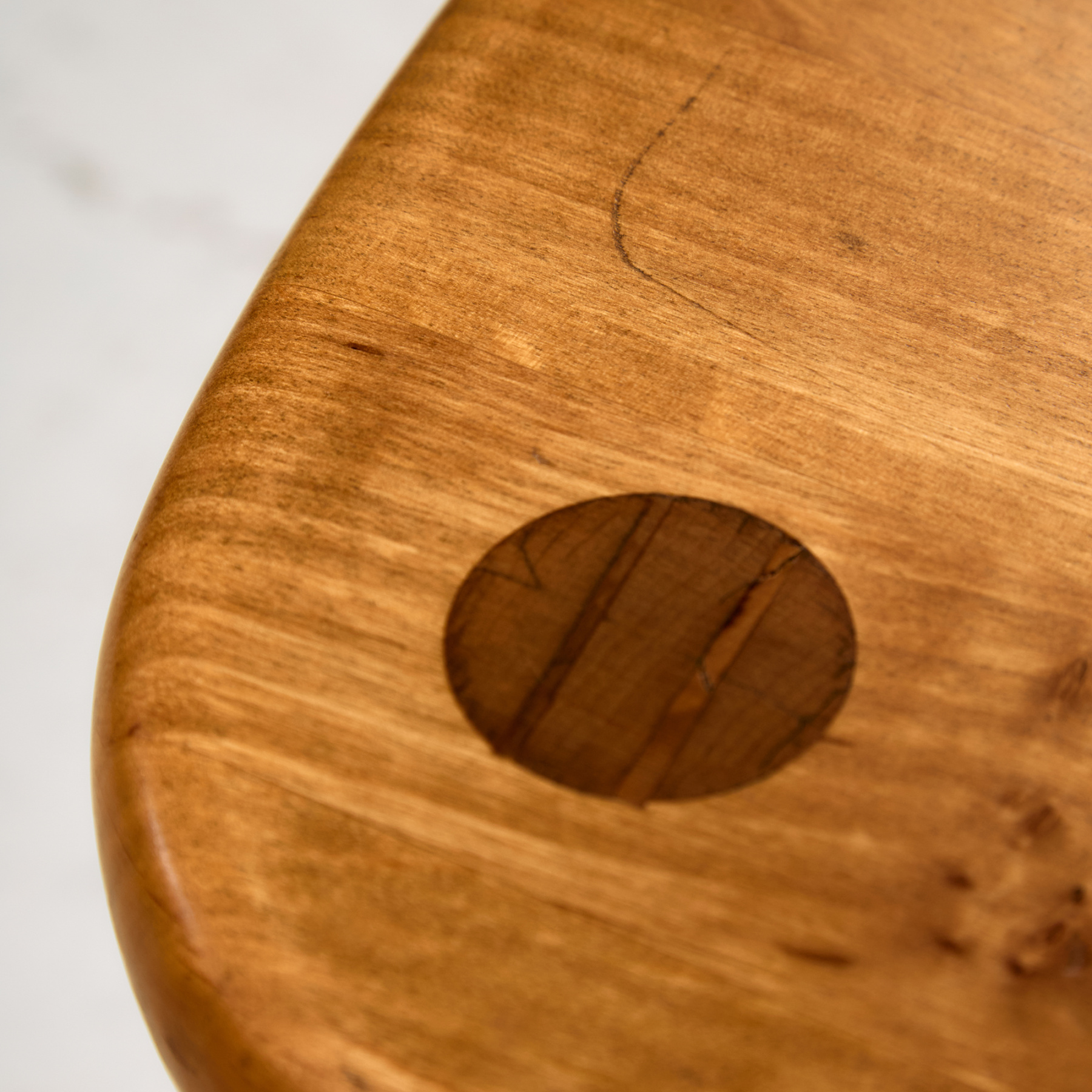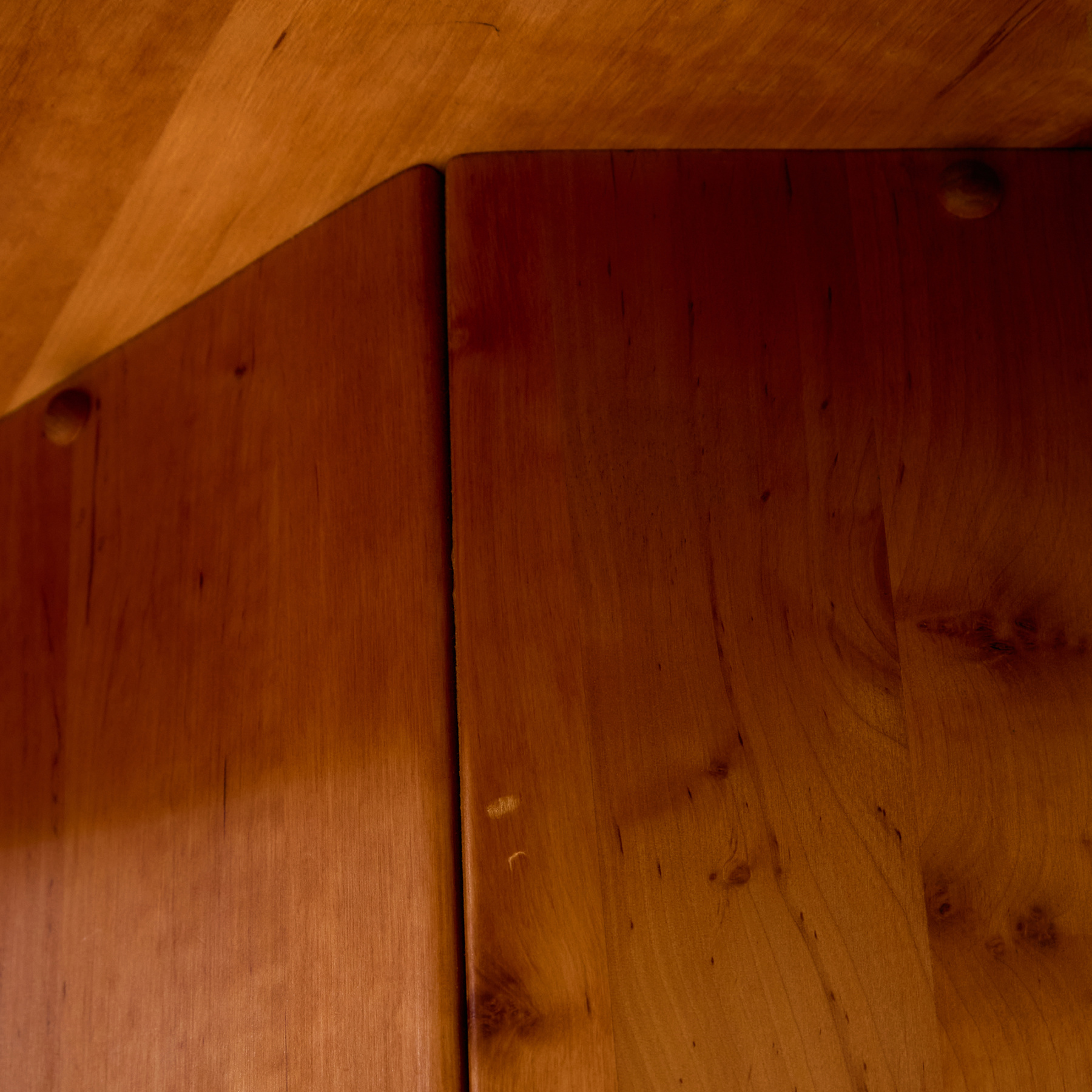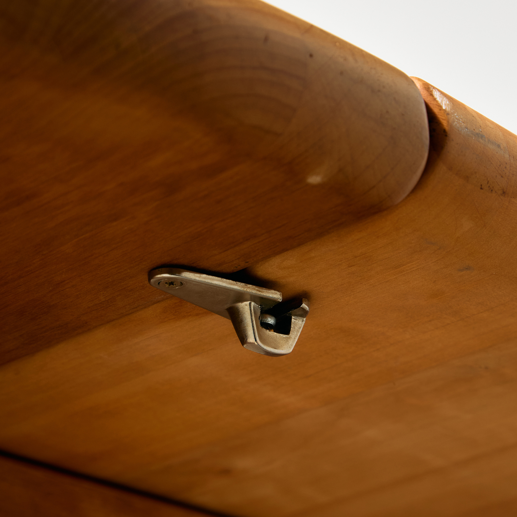 Erwin Berghammer által a Team 7 számára tervezett égerfa étkezőgarnitúra az 1980-as évekből. A szett hat darab ‘Opus’ karosszékből és egy darab étkezőasztalból áll. Az étkezőasztal két vendéglappal nagyobb méretre bővíthető. Az étkezőasztal és székek felületén helyenként karcokkal, foltokkal és kopásokkal, használatból adódó nyomokkal. Méretek: Étkezőasztal: 120 – 216x75x120 cm /// Étkezőszék: 55x78x54 cm, Üm.: 46 cm
