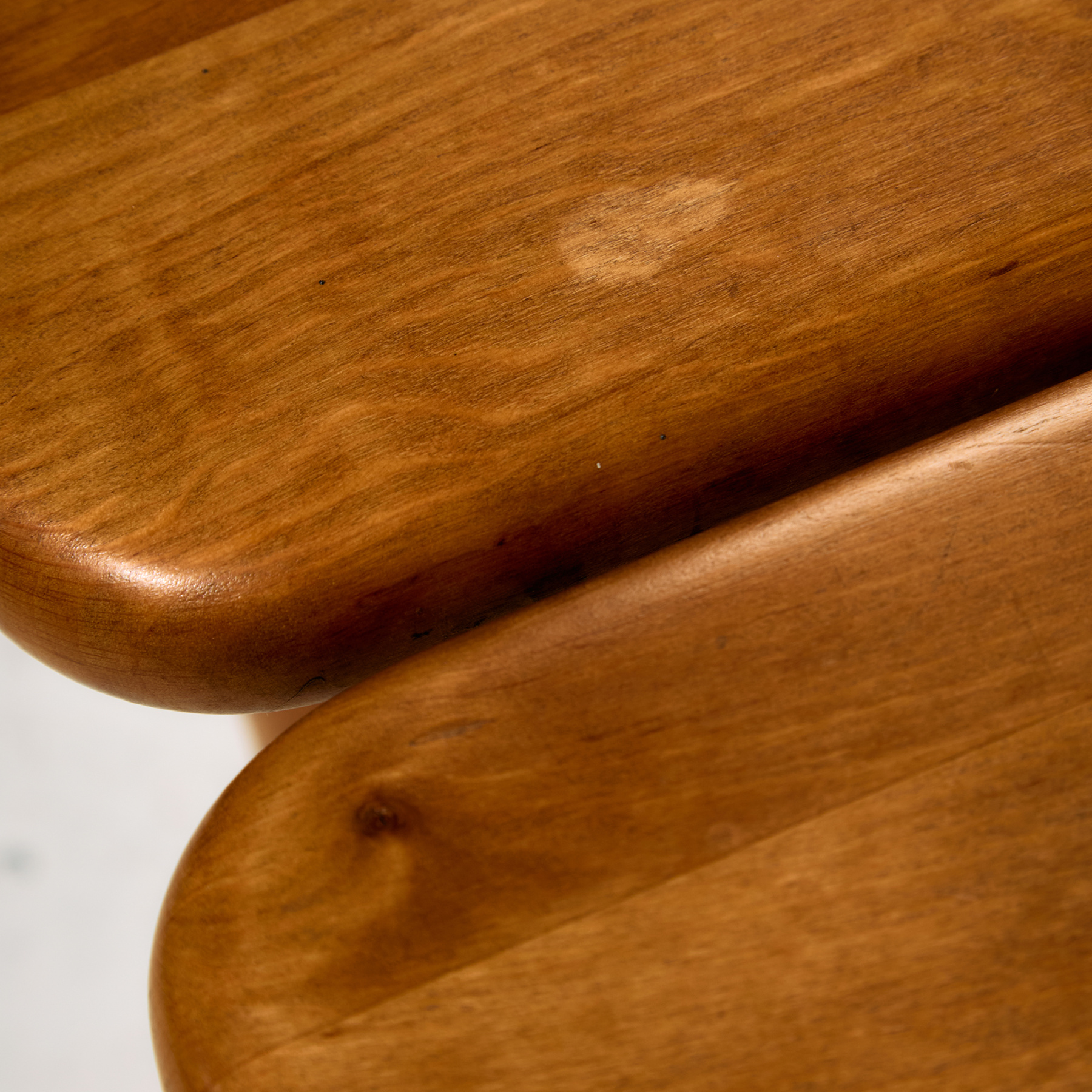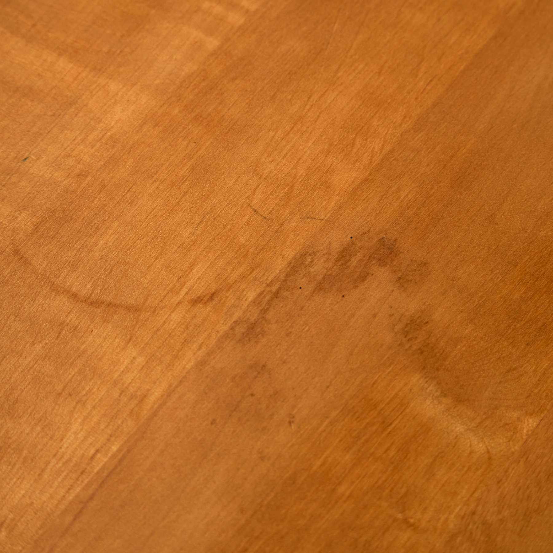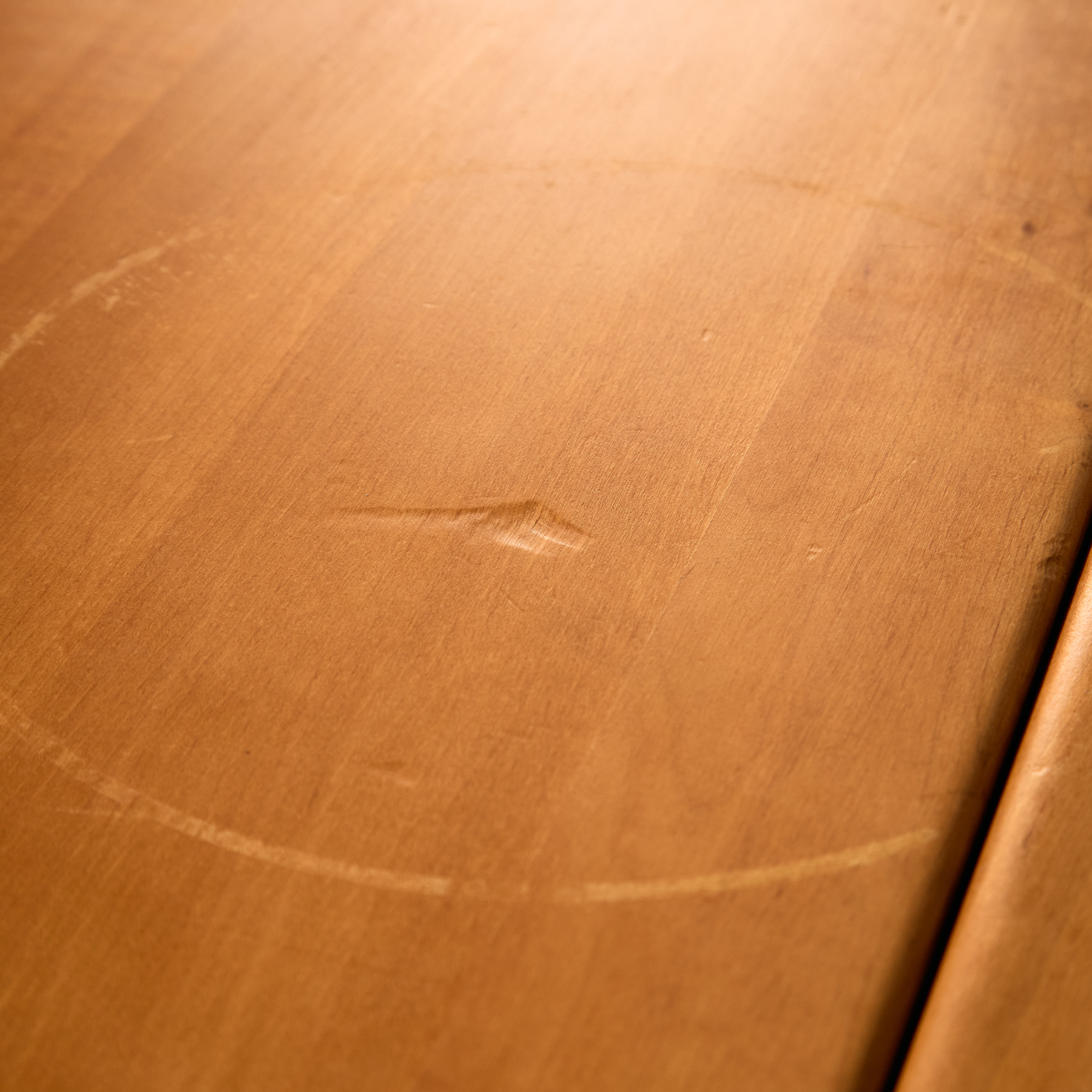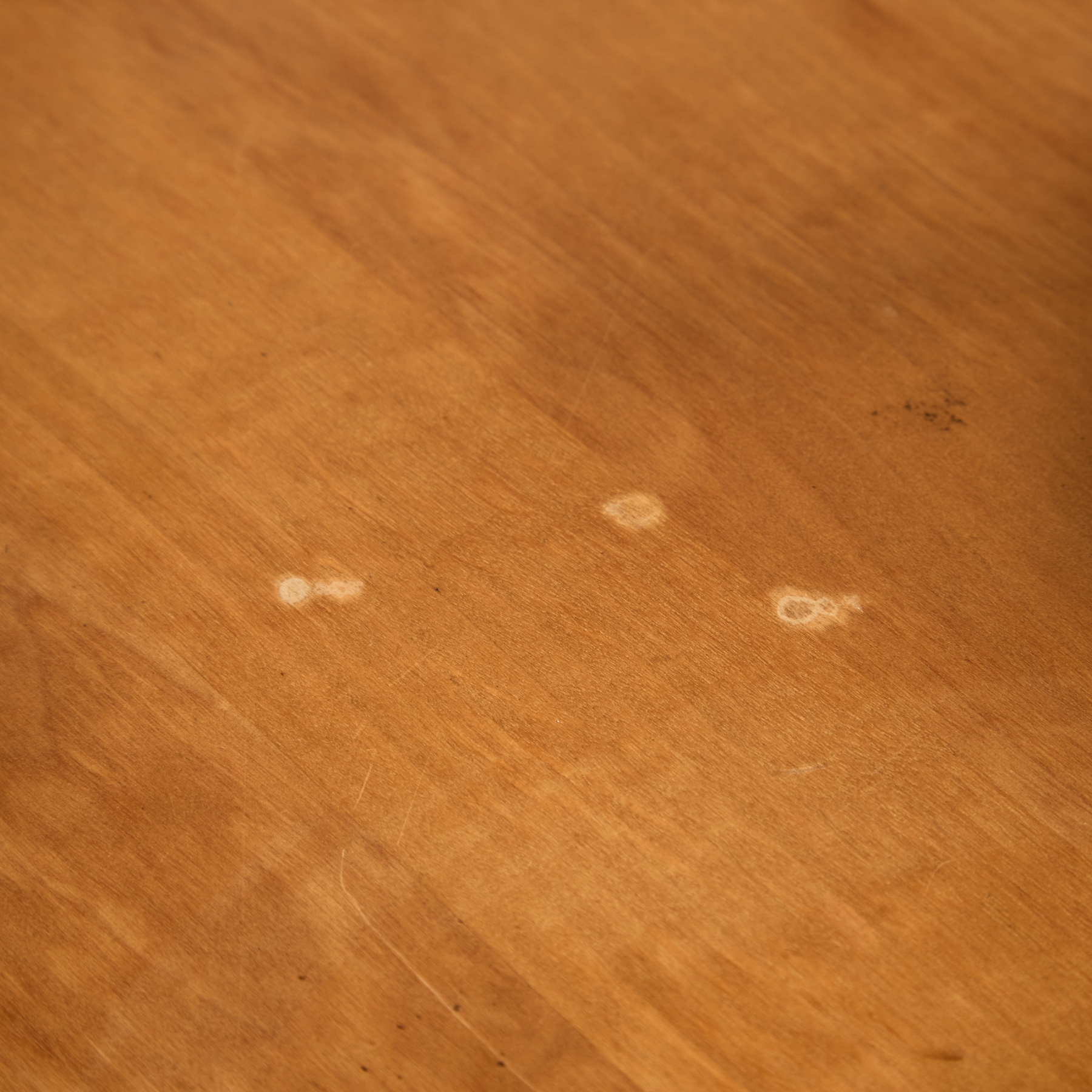 Erwin Berghammer által a Team 7 számára tervezett égerfa étkezőgarnitúra az 1980-as évekből. A szett hat darab ‘Opus’ karosszékből és egy darab étkezőasztalból áll. Az étkezőasztal két vendéglappal nagyobb méretre bővíthető. Az étkezőasztal és székek felületén helyenként karcokkal, foltokkal és kopásokkal, használatból adódó nyomokkal. Méretek: Étkezőasztal: 120 – 216x75x120 cm /// Étkezőszék: 55x78x54 cm, Üm.: 46 cm