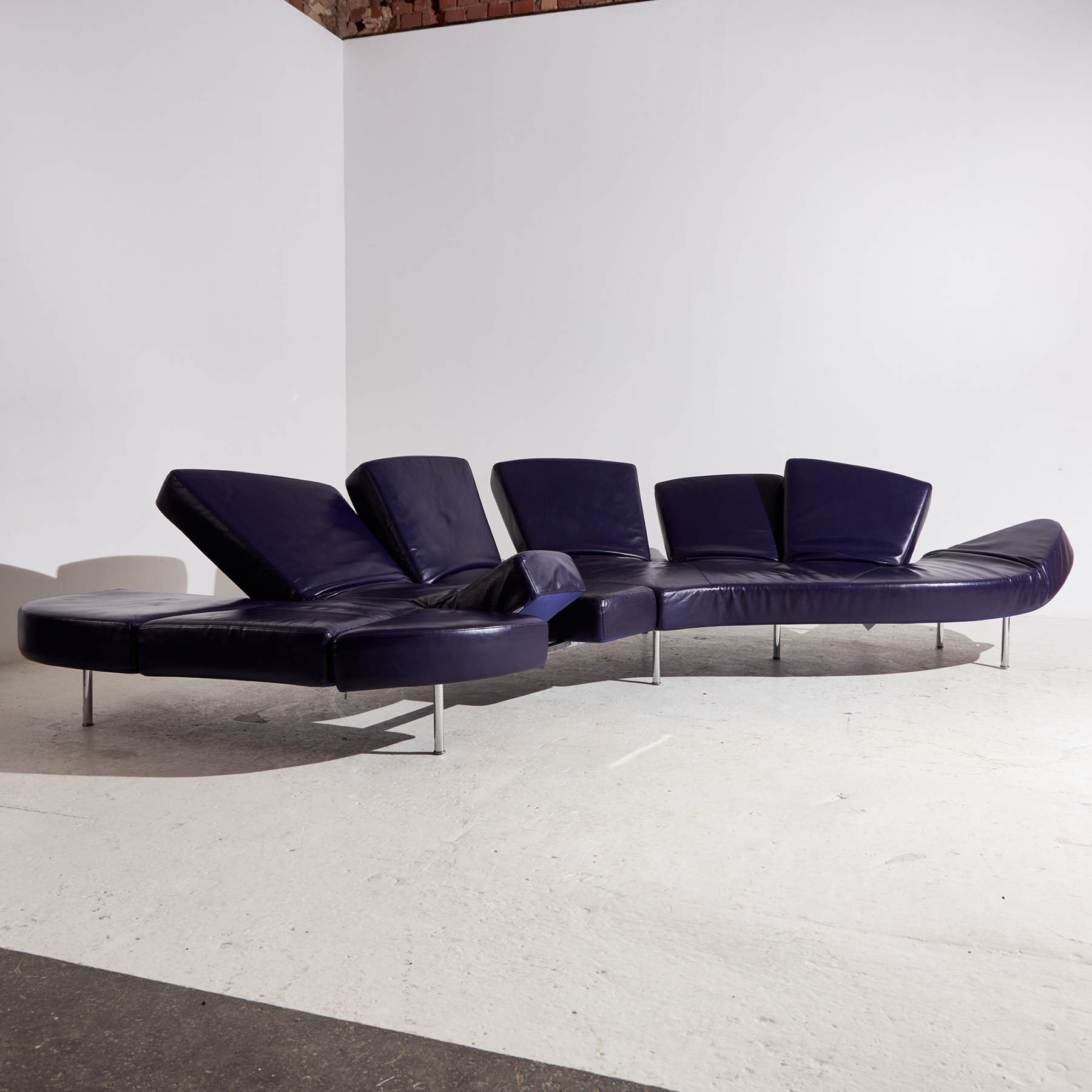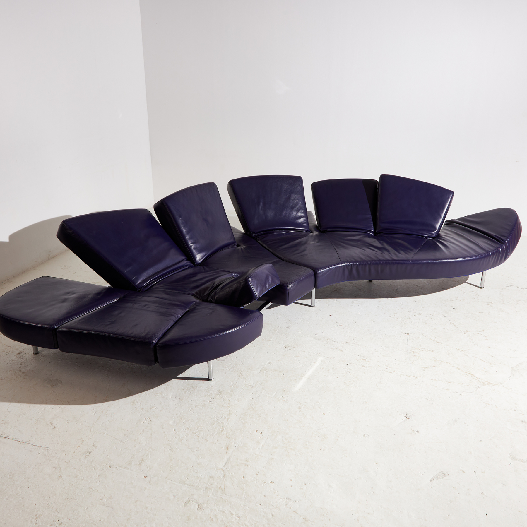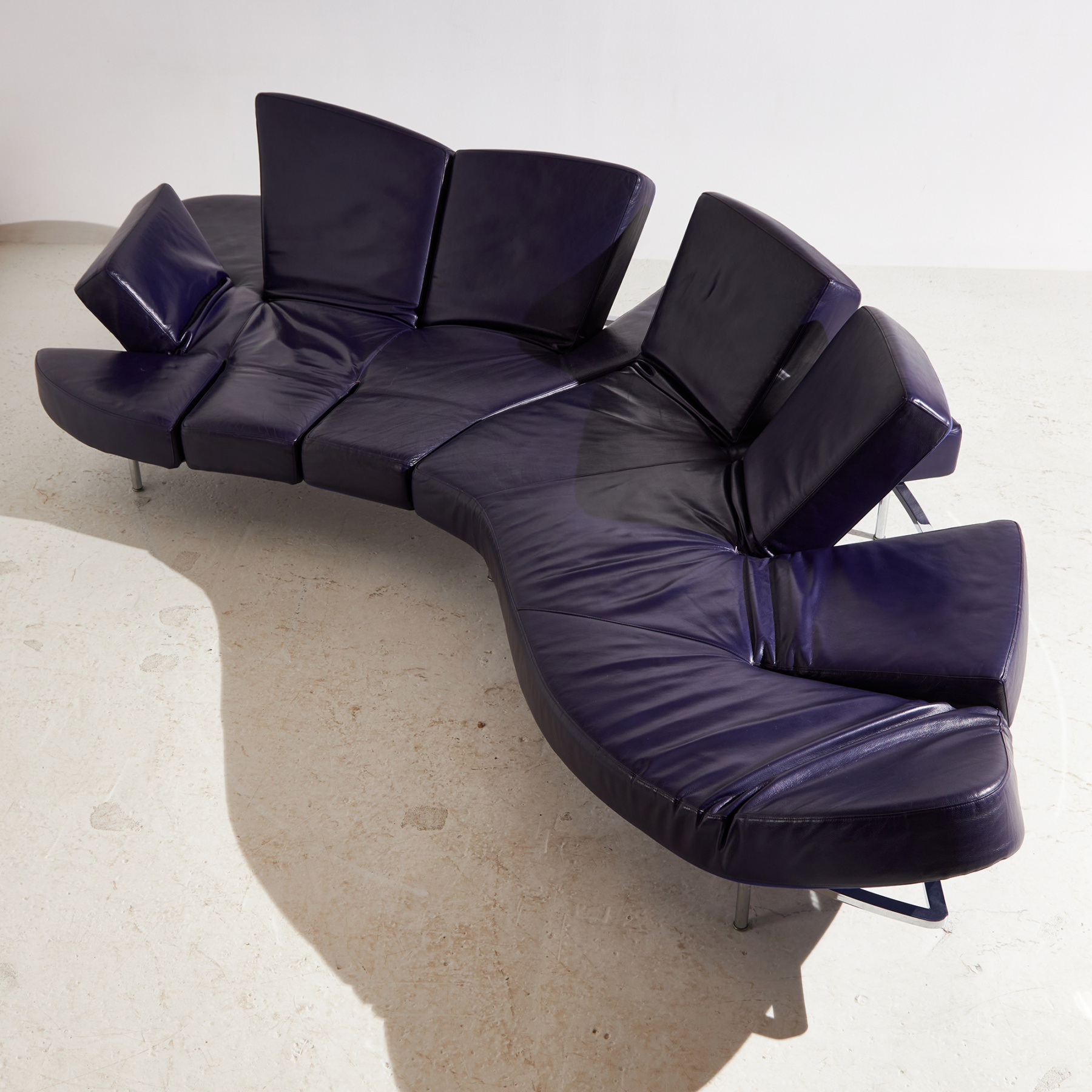 Egy ikonikus darab, ami kiváló példája az olasz formatervezésnek. Francesco Binfaré által az Edra számára tervezett ‘Flap’ nevet viselő kanapé a 2000-es évekből. Az ülőbútor formája szabadon alakítható, hiszen több helyen rugalmas és mozgatható karfa / háttámla résszel ellátott. A kanapé bőr és fém részein helyenként felületi karcokkal és kopásokkal.