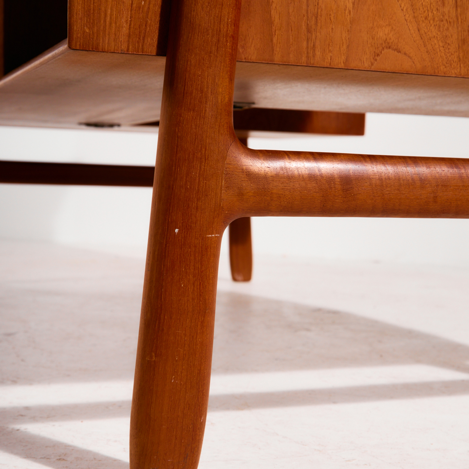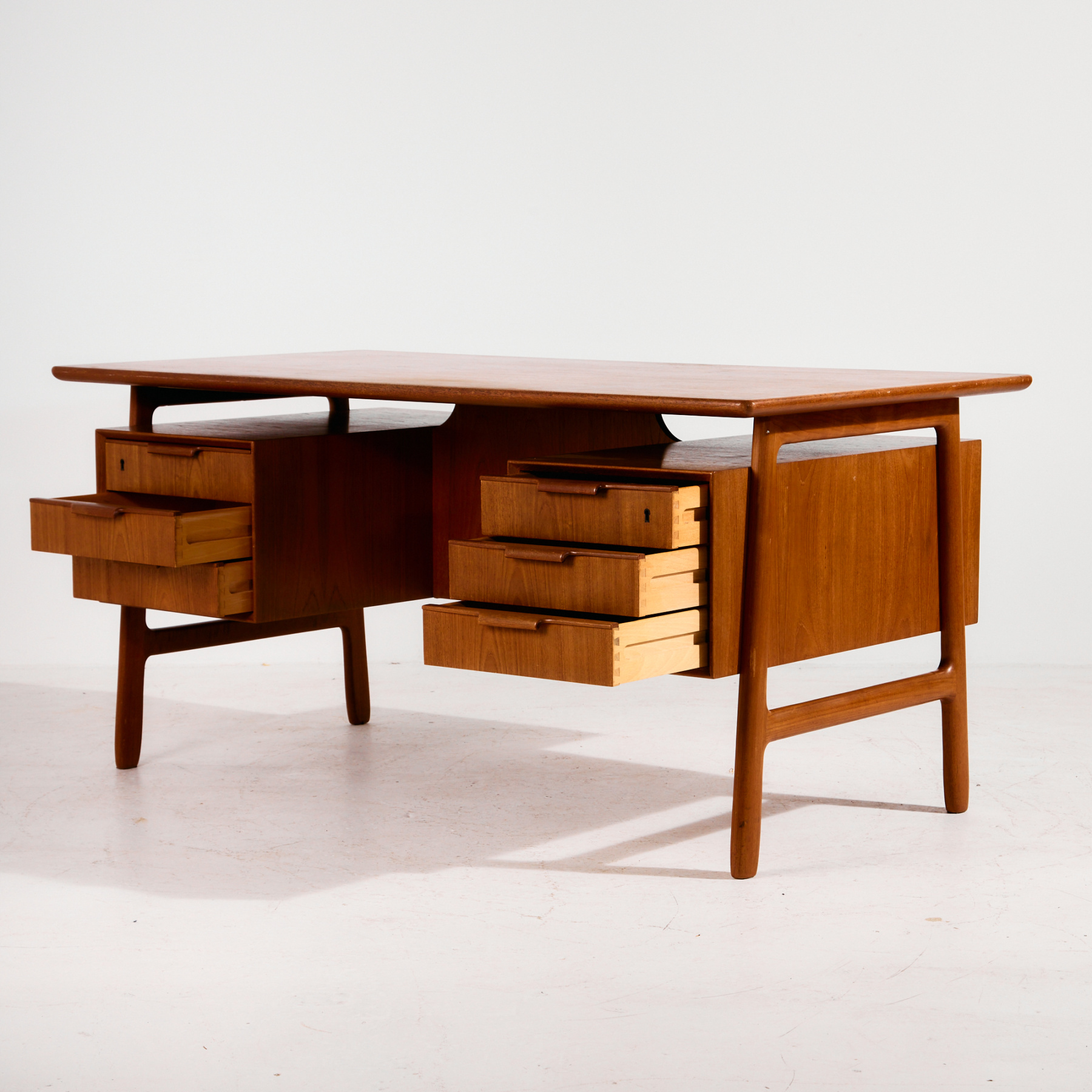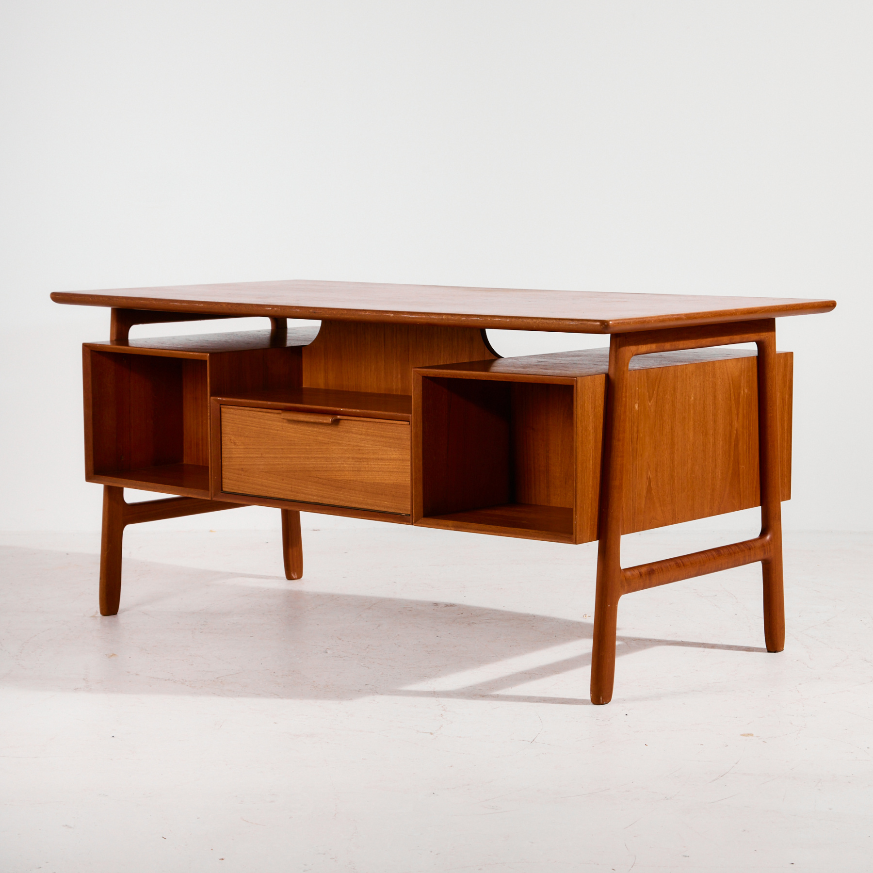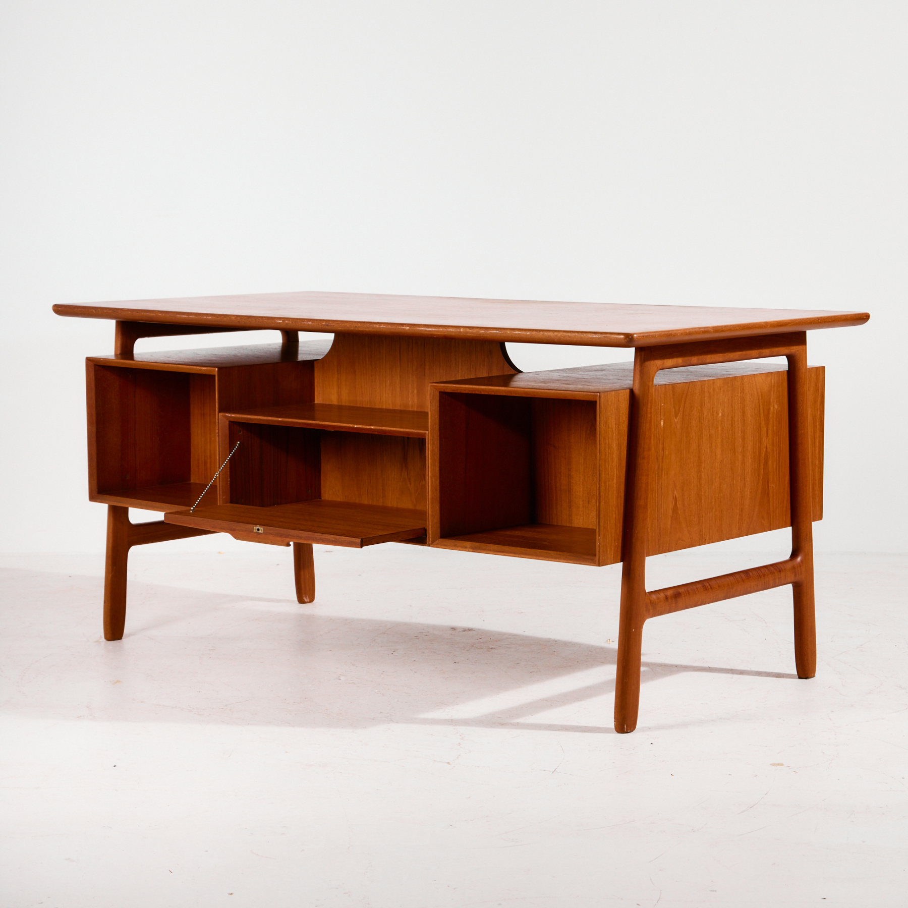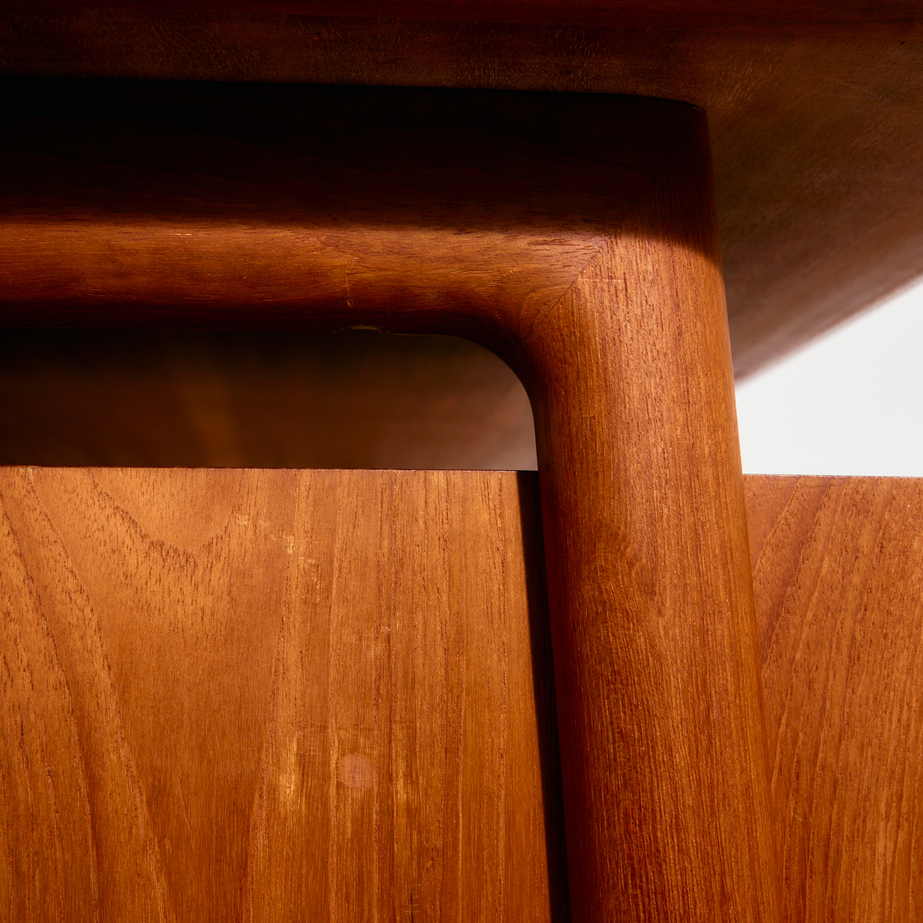 Gunni Omann által az Omann Jun Møbelfabrik számára tervezett ‘Modell 75’ teak íróasztal az 1960-as évekből. Az asztal hat fiókkal, hátán kettő nyitott polccal ellátott. A bútor formai kialakításának és anyaghasználatának köszönhetően egyszerre elegáns és időtlen darab. Felületén helyenként karcokkal, foltokkal és kopásokkal.